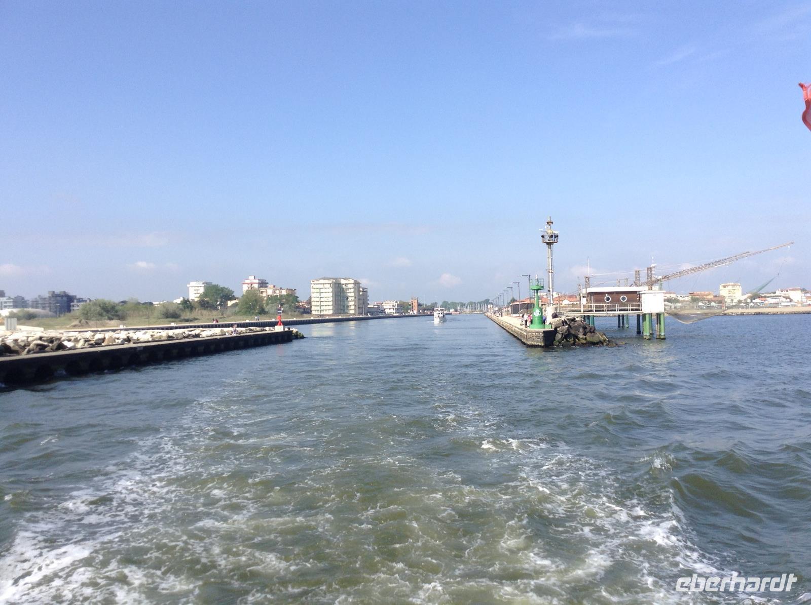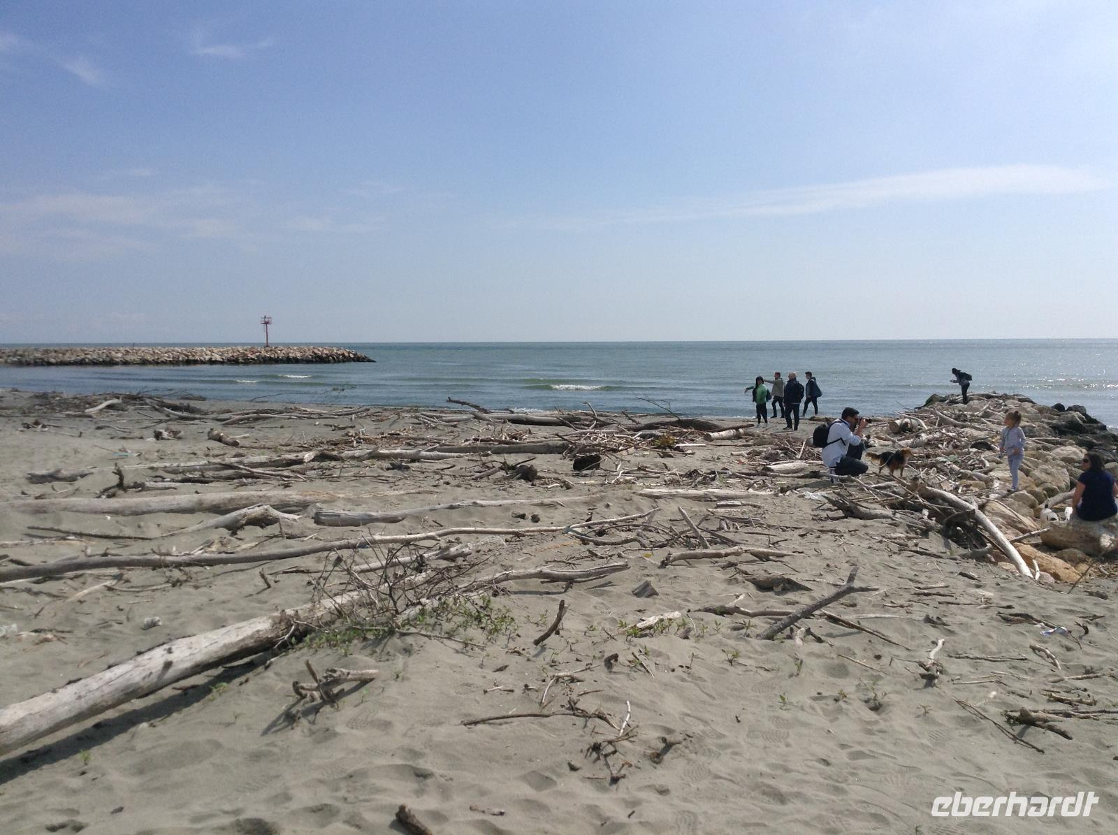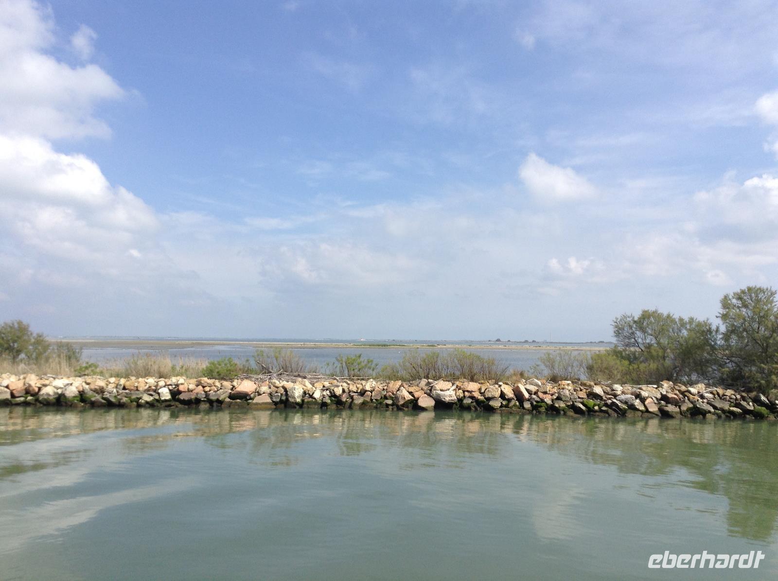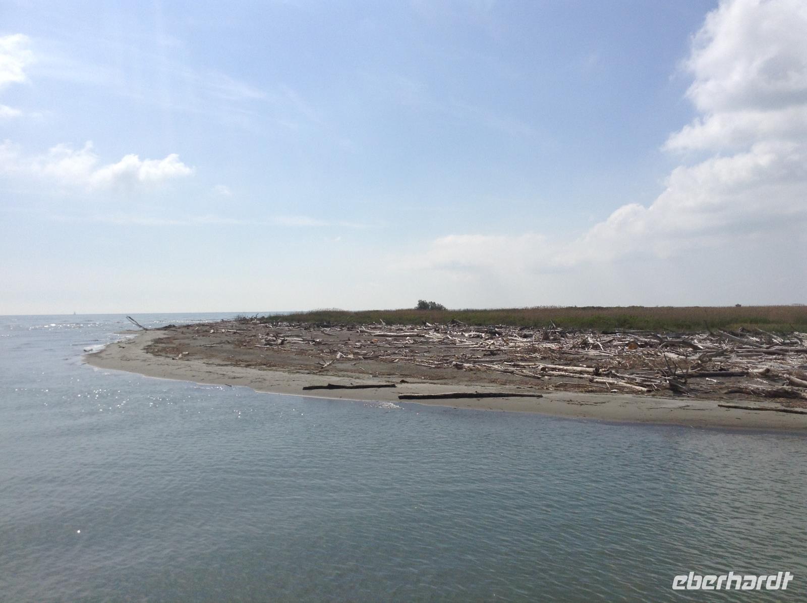 Es hat geregnet in der Nacht und als wir loswollen früh, war alles noch nass. Wir erreichen den Hafen bei Chamaccio und das Wetter entspannt sich. Die Sonne kommt raus und es war wieder ein schöner Tag. Bis auf 2 Personen ist die ganze Gruppe mit zum Ausflug gefahren. Und das hat sich echt gelohnt. Mit dem Schiff ging es hinaus auf das offene Meer bis zum Po-Delta. Wir fahren die Seitenarme entlang, machen Pause auf der Liebesinsel und eleben ein tolles Fisch-Picknick an Bord des Schiffes. Es gibt Wasser und Wein dazu.