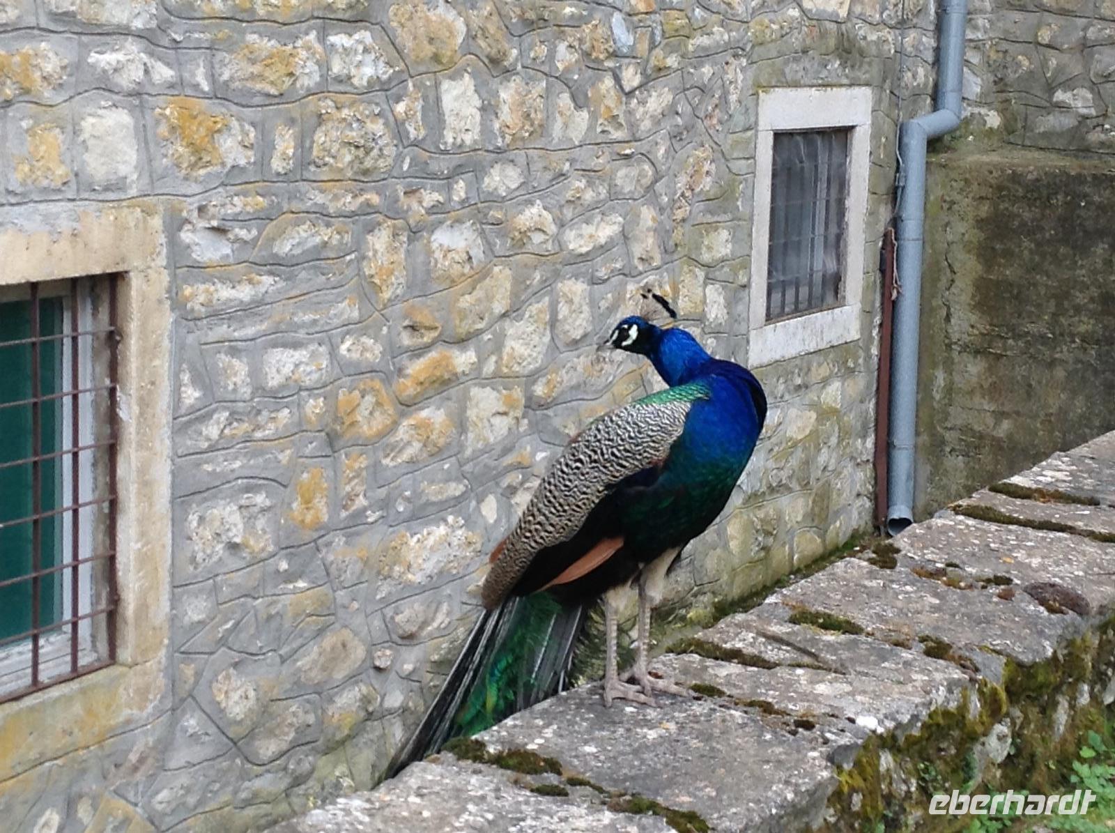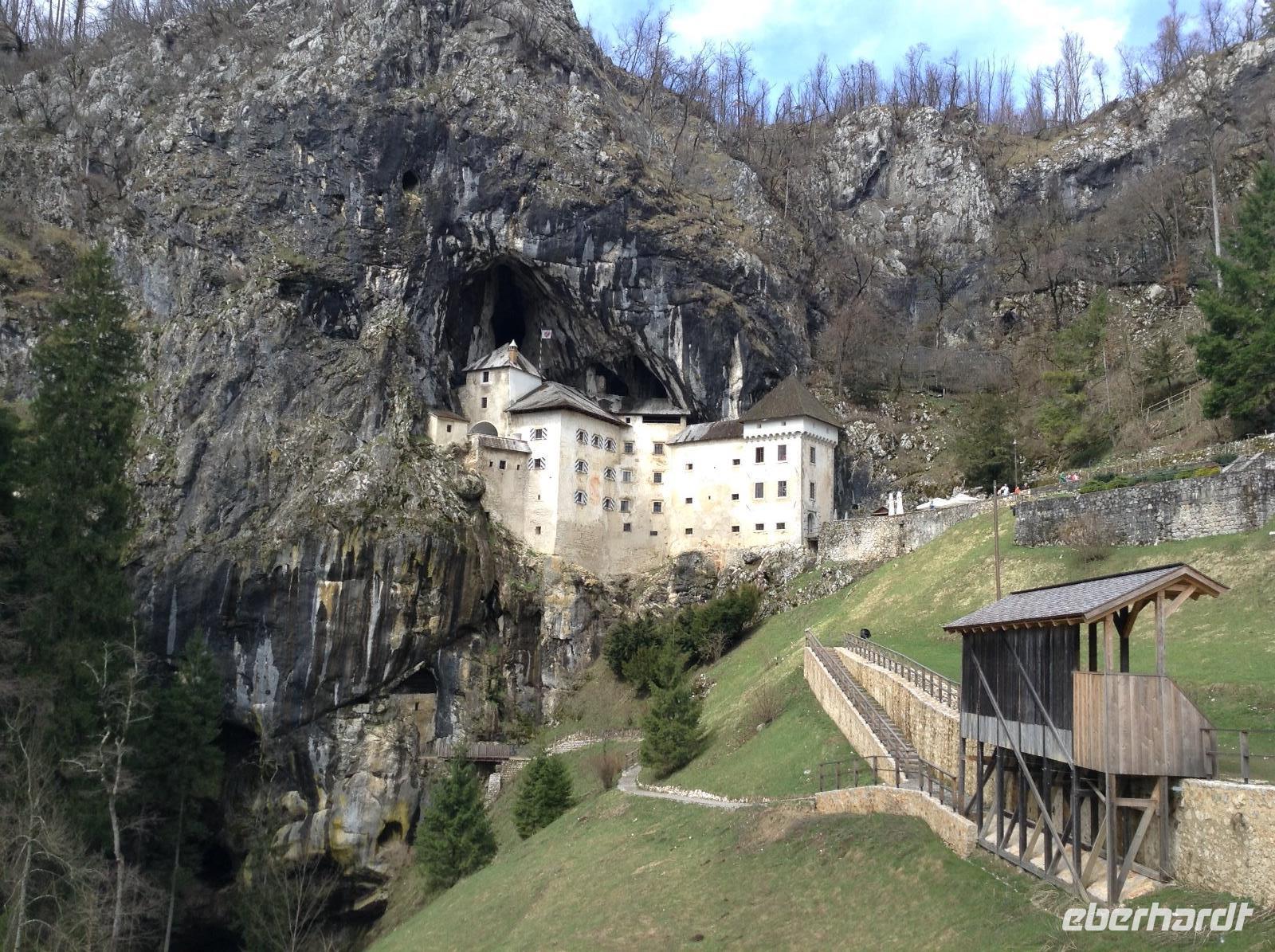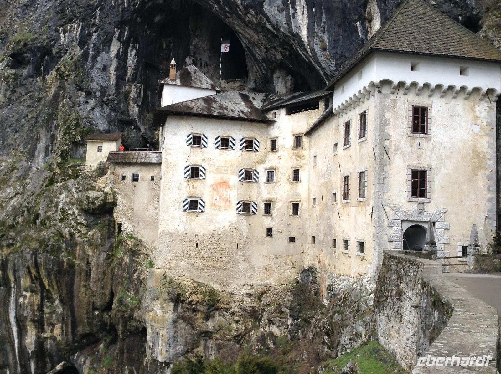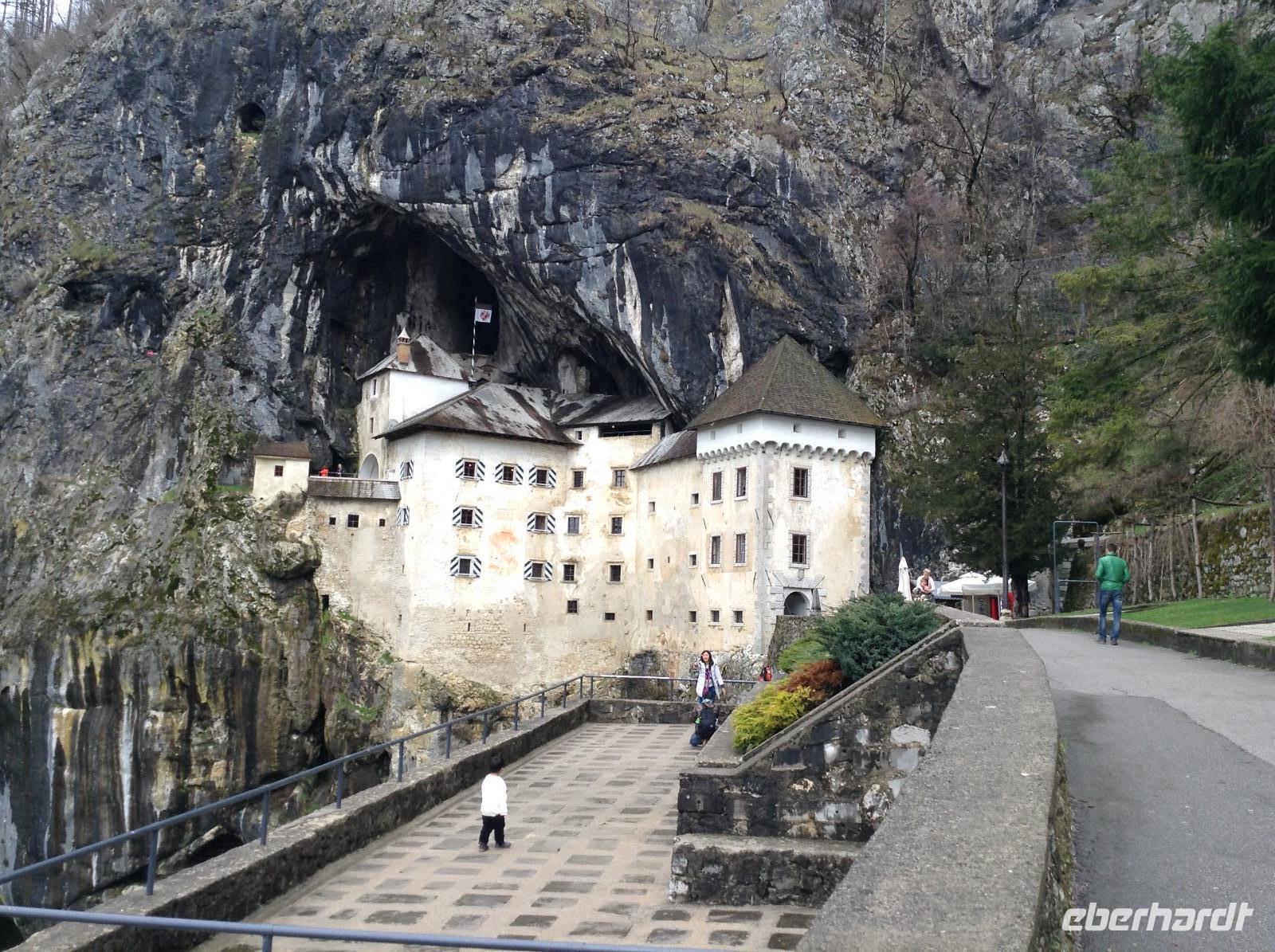 Doch ehe wir uns von Bled wieder verabschieden mussten, gab es gleich am frühen Morgen eine Bootsfahrt mit der Pletna, den typischen Booten auf dem Bleder See. Ein junger Mann empfing uns am Bootsanleger und fuhr uns mit seiner Muskelkraft hinüber zur Insel Blejski otok. Wir genossen die Ruhe auf dem See und die schöne Aussicht auf die umliegende Bergwelt. Auf der Insel besuchten wir die Marienkirche und erfuhren von den bedeutenden Ausgrabungen aus den Früh- und Mittelalter. Von Bled aus starteten wir dann in Richtung Autobahn und fuhren weiter in südlicher Richtung zunächst durch Slowenien. In der Nähe von Postojna verließen wir die Autobahn, um der alten Höhlenburg Predjamski Grad aus dem 12. Jahrhundert einen Besuch abzustatten. Durch ein romantisches Tal und kleine Ortschaften ging es zur alten Burganlage. Der Anblick war faszinierend, das Innenleben sehr interessant.