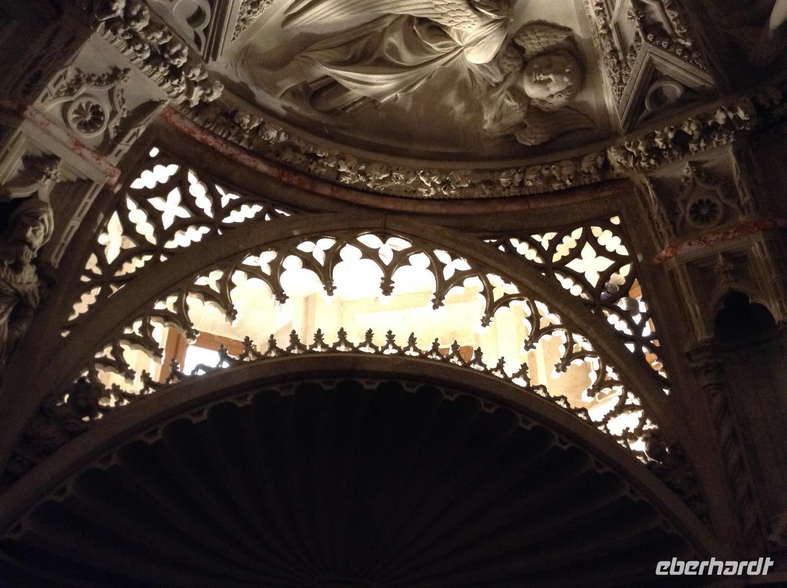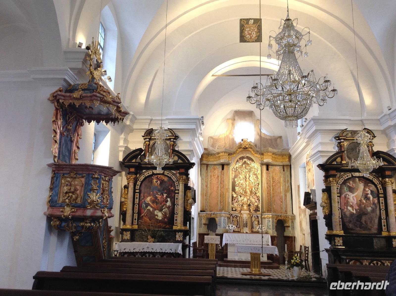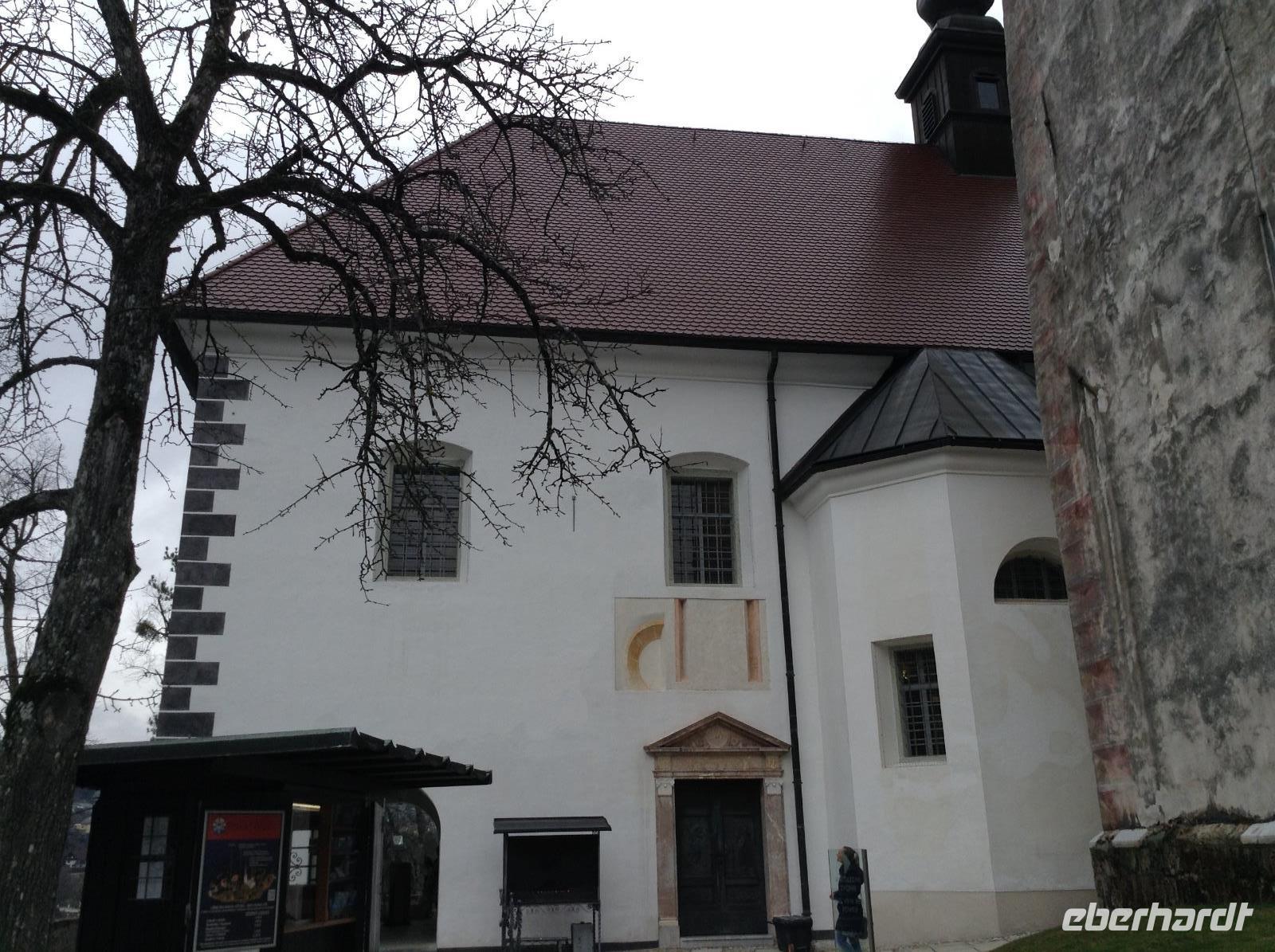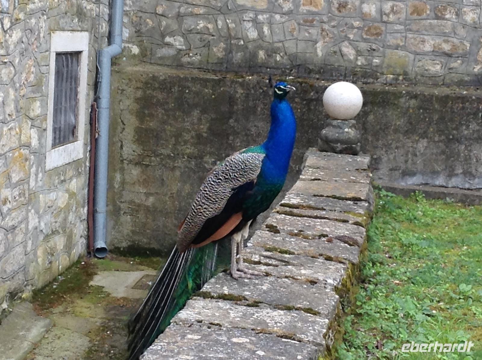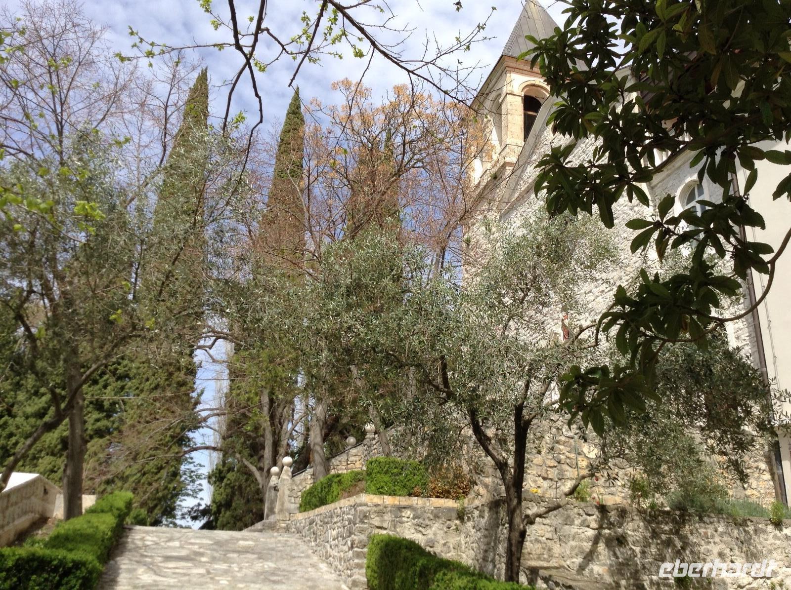 Doch ehe wir uns von Bled wieder verabschieden mussten, gab es gleich am frühen Morgen eine Bootsfahrt mit der Pletna, den typischen Booten auf dem Bleder See. Ein junger Mann empfing uns am Bootsanleger und fuhr uns mit seiner Muskelkraft hinüber zur Insel Blejski otok. Wir genossen die Ruhe auf dem See und die schöne Aussicht auf die umliegende Bergwelt. Auf der Insel besuchten wir die Marienkirche und erfuhren von den bedeutenden Ausgrabungen aus den Früh- und Mittelalter. Von Bled aus starteten wir dann in Richtung Autobahn und fuhren weiter in südlicher Richtung zunächst durch Slowenien. In der Nähe von Postojna verließen wir die Autobahn, um der alten Höhlenburg Predjamski Grad aus dem 12. Jahrhundert einen Besuch abzustatten. Durch ein romantisches Tal und kleine Ortschaften ging es zur alten Burganlage. Der Anblick war faszinierend, das Innenleben sehr interessant.