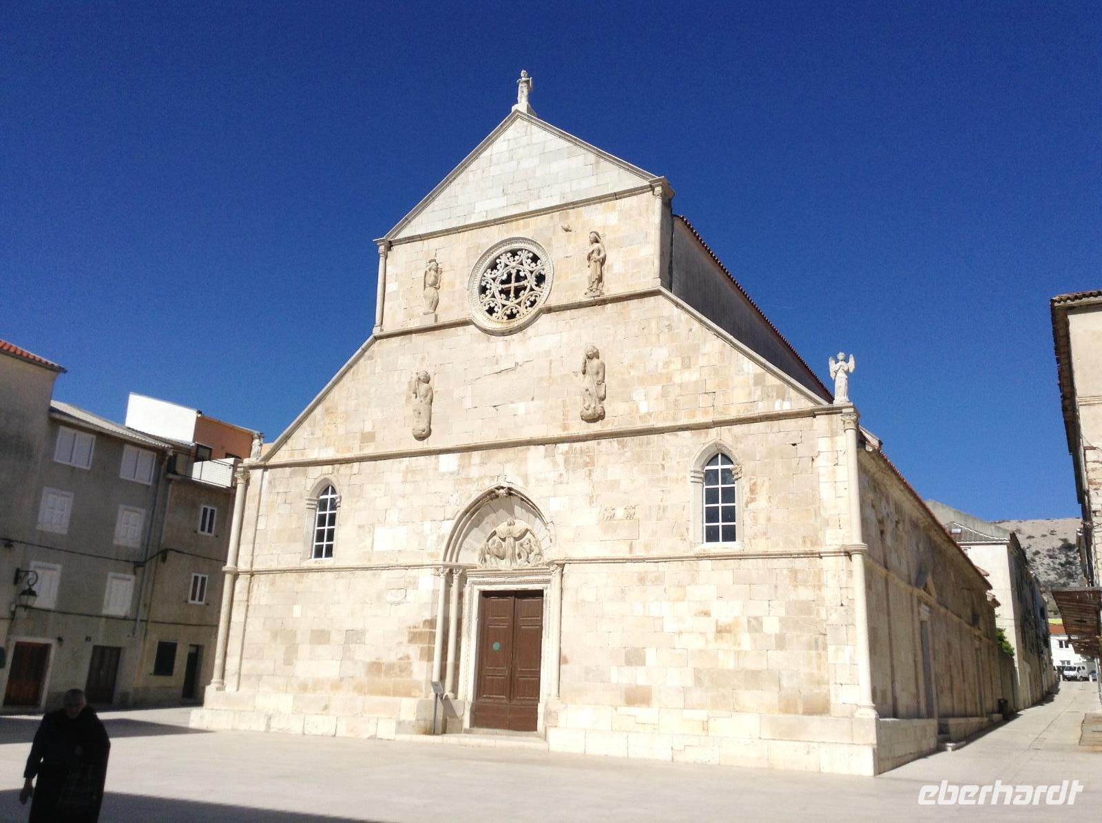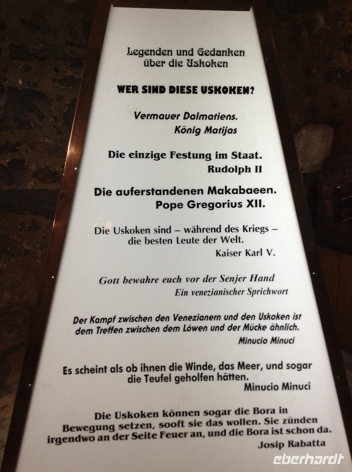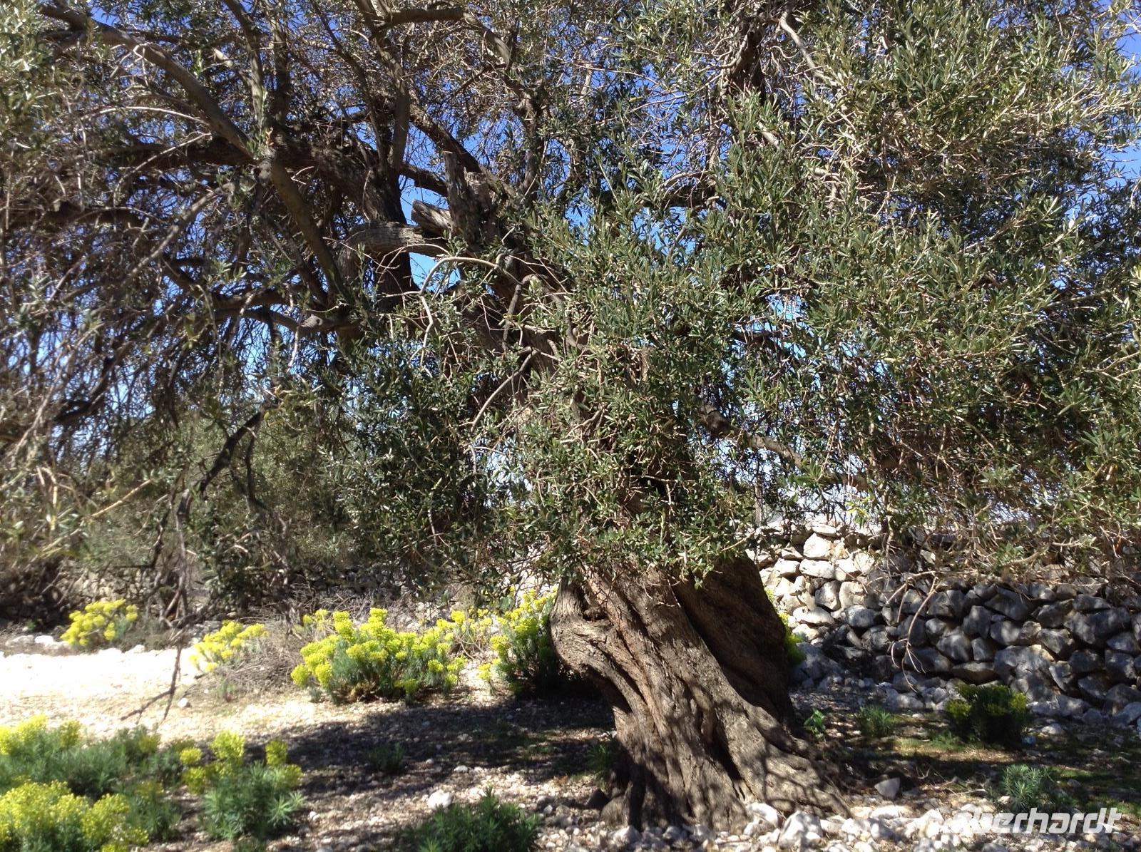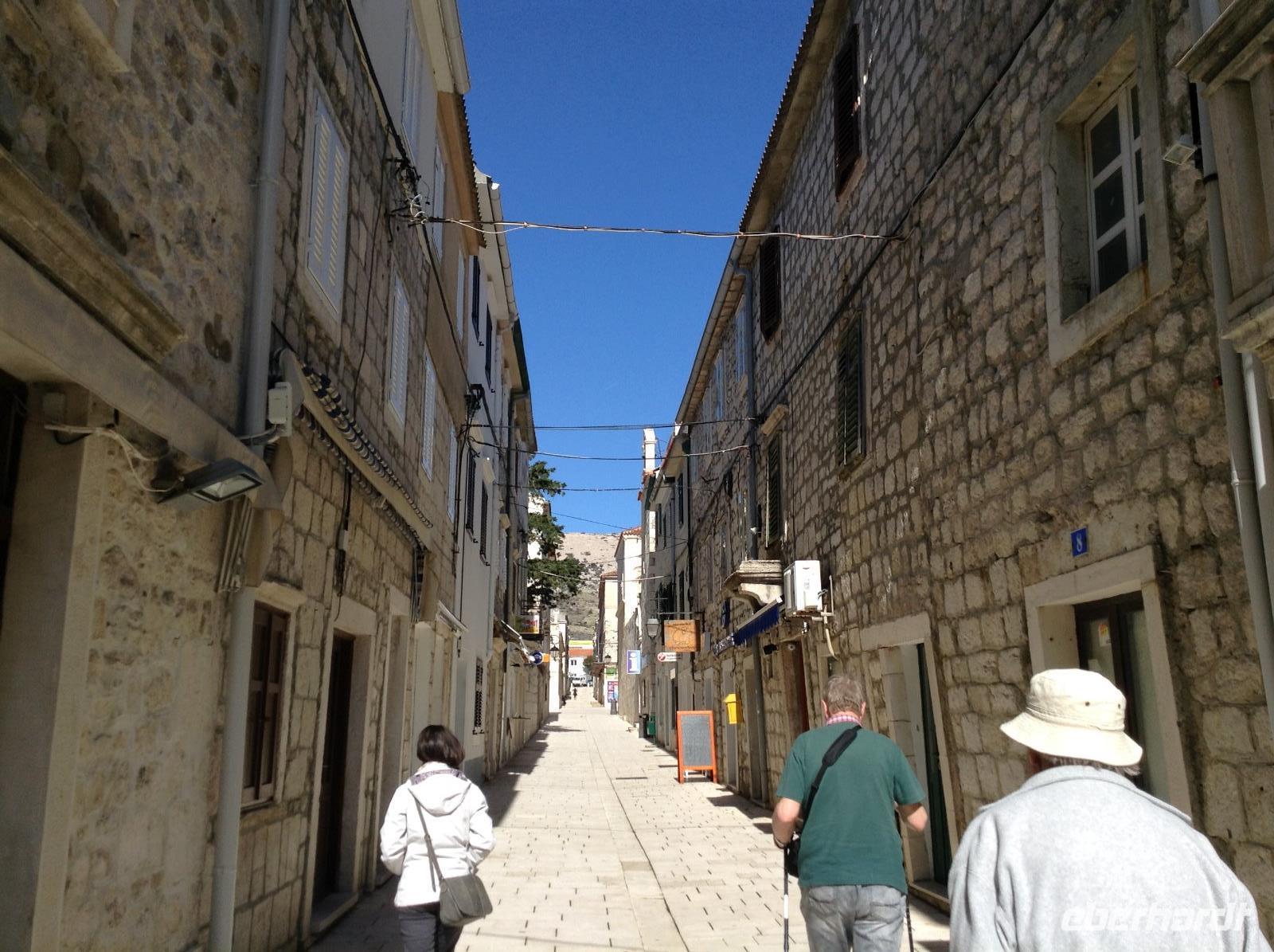 Früh hieß es wieder Koffer laden und Weiterfahrt entlang der kroatischen Küste. Unsere erste Besichtigung heute sollte die Uskokenburg und die Stadt Senj werden. Der örtliche Reiseleiter kam schon früh in unser Hotel und fuhr ab Selce mit uns mit. Auf der Fahrt erfuhren wir schon viel landestypisches, bei klarer Sicht hatten wir einen sehr schönen Blick auf die vielen kleinen Buchten, das türkisblaue Wasser, hübsche Ortschaften und das Velebitgebirge. In Senj angekommen, machten wir auch erste Erfahrung mit den ortsüblichen Winden. Der Bora wehte kräftig. Zuerst ging es hinauf zur Uskokenburg, dann hinunter in den Ort. Bei etwas Freizeit gab es einen Kaffee oder wir sahen den Arbeiten für einen Film über das Leben der Uskoken im Hafen zu. Am späten Vormittag ging es weiter auf der Küstenstrasse zum Fähranleger. Gegen Mittag fuhr unsere Fähre hinüber zur Insel Pag, die Insel, die für ihre uralten Olivenbäume und den guten Pager Käse bekannt ist. Unser Bus fuhr über die Insel mit ihren Steinmauern, Kräutern und Schafsherden bis zum kleinen Ort Lun. Dort bestaunten wir die ältesten Olivenbäume der Insel. Sie sollen wohl bis zu 2000 Jahre alt sein. Auf der Rückfahrt über die Insel machten wir einen Stop in der gleichnamigen Inselhauptstadt. Mirta führte uns durch die Gassen der Stadt bis zum Hauptplatz. Nach etwas Freizeit ging unsere Tagestour dann noch bis nach Tisno, auf die Insel Murter, wo wir am Abend unser Hotel für die nächsten Übernachtungen erreichten.