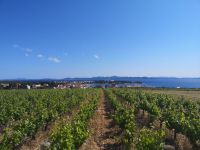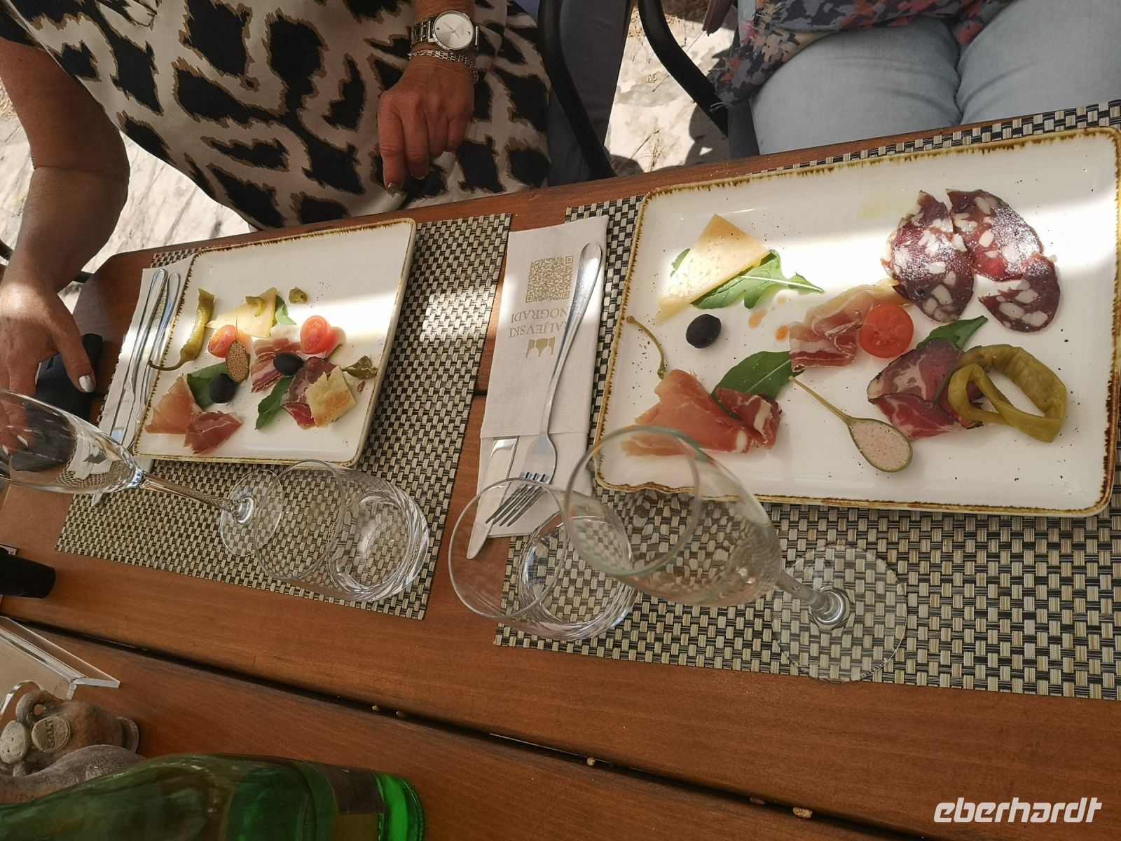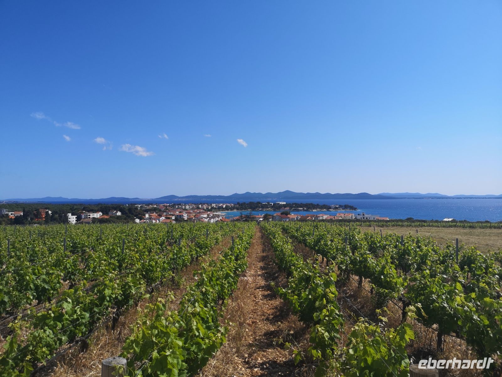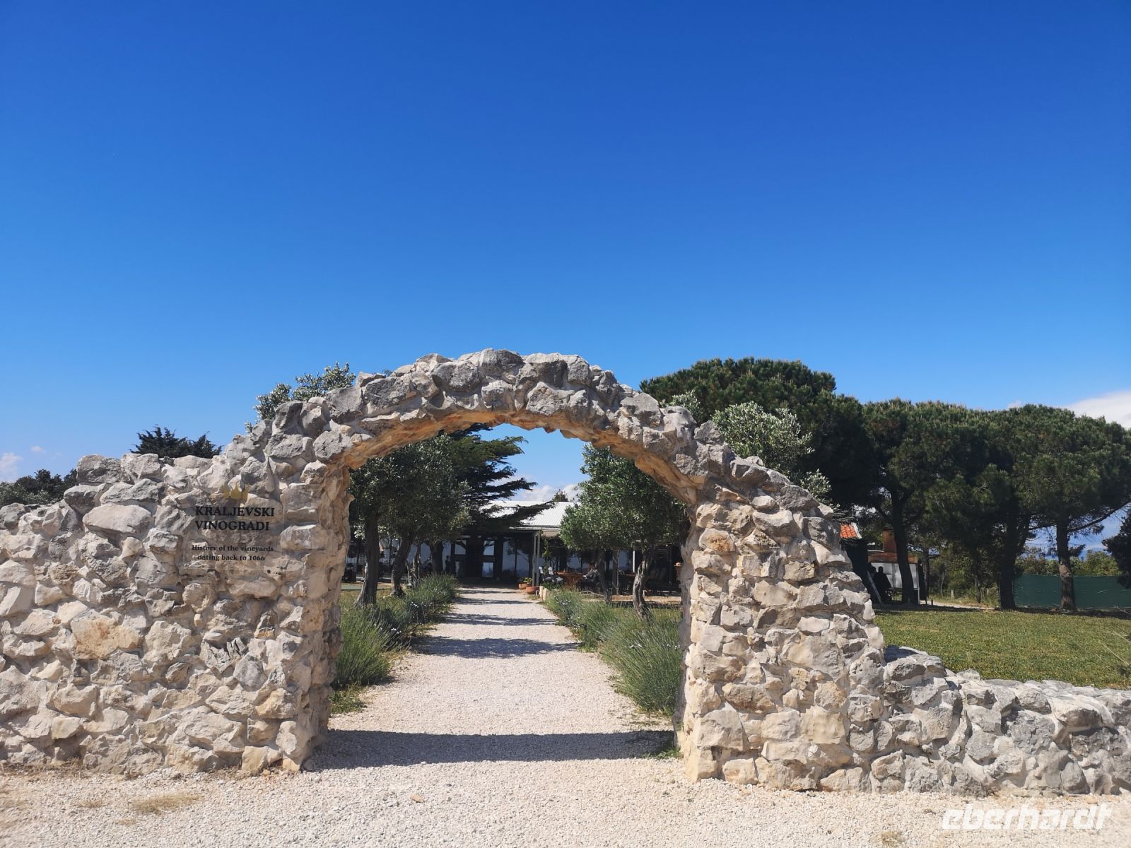 Eine kleine Gruppe von uns ging zu den Familienanwesen Kraljevski vinogradi – eine Weinprobe winkte entgegen. Durch die Weinberge führte uns der Weg auf den Hügel hinter Petrcani – keine halbe Stunde Gehweg vom Ortschaftskern entfernt. Grandiose Blick über die Weinberge hinunter zum Meer, weitaus blickend bis zu Zadar und noch weiter. Eine Potpourri, dass man gern aus allen Perspektiven auf dem Foto verewigen möchte. Schlendernd erreichten wir den steinigen Bogen, der Eingang zu den Gaststätten. Für die nächste zwei Stunden war dies für uns ein kleines Paradies. Einfach da zu sitzen, mit leichter, warmer Brise um den Kopf, die Gaumen mit Wein und kleinen Köstlichkeiten zu verwöhnen, die netten Menschen um sich zu haben – man brauchte wirklich nichts mehr, um selig zu sein.