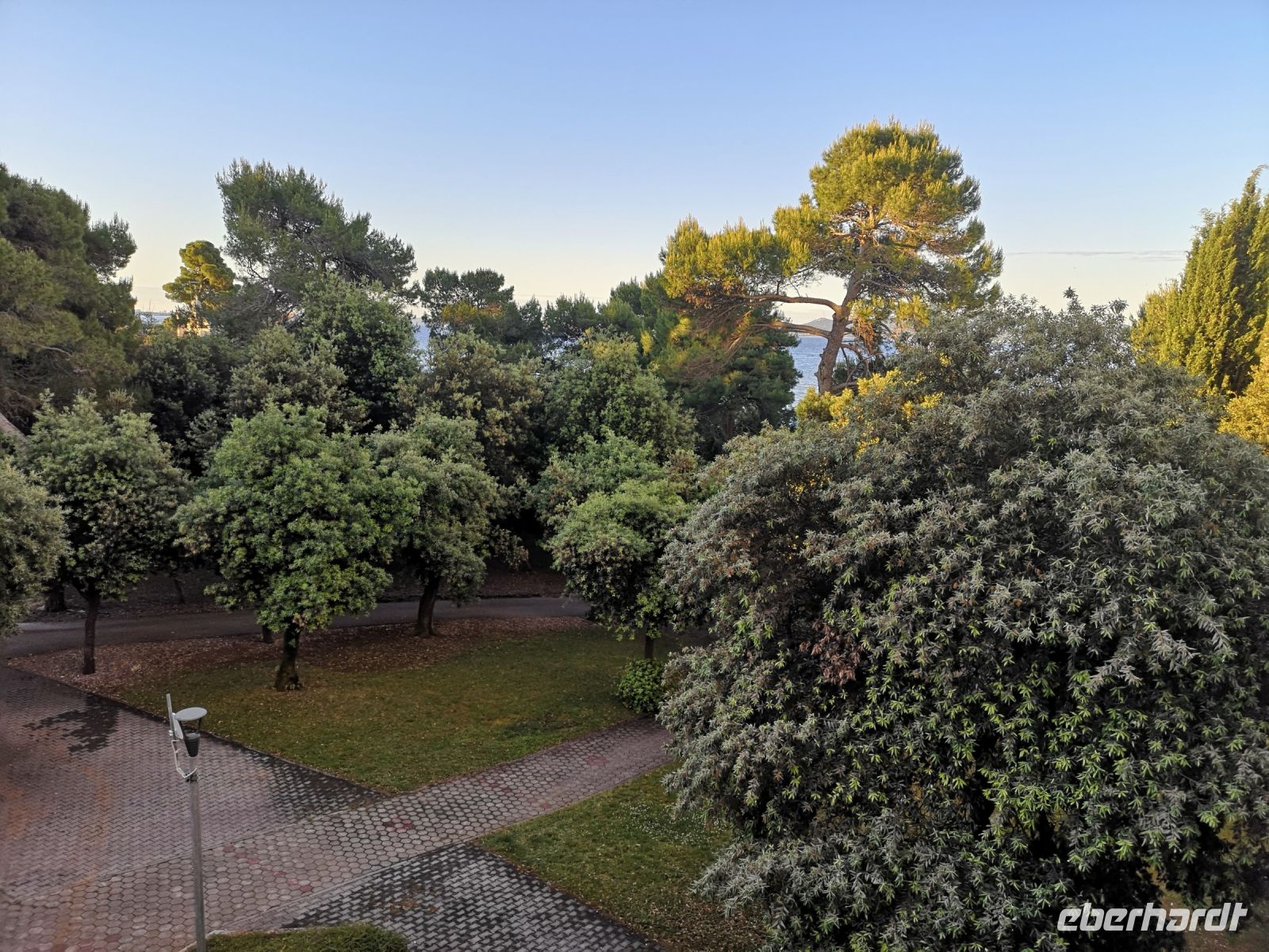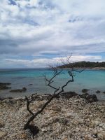 Ich rieb mir den kleinen Rosmarinzweig zwischen den Fingern – das aromatische Geruch stieg in die Nase, mein Blick schweifte über das Meer, blau in allen Schattierungen, das sich lieblich bewegte und mit einem leisen Schschschschsch…….am Ufer endete. Die Luft, die Quantum vom Salz und die Düfte von aberhunderten von Blumen aus der Umgebung in sich trug und man diese Mischung eher subtil vernahm, ist weich wie Samt. Der weiße Strand – eine Kollage aus Kies, Steinen oder Steinplatten, verbindet sich unauffällig mit dem grünen Gras. Unzählige kleine Sträucher, dann Pinien und Zypressen, Kieferbäume…. Und die Häuser, typisch mediterran, die kleinen Gassen dazwischen wie die Äderchen. Es beanspruchte alle meine Sinne und ich verspürte das unheimliche Glück, da zu sein, ein Teil von all dem zu sein.