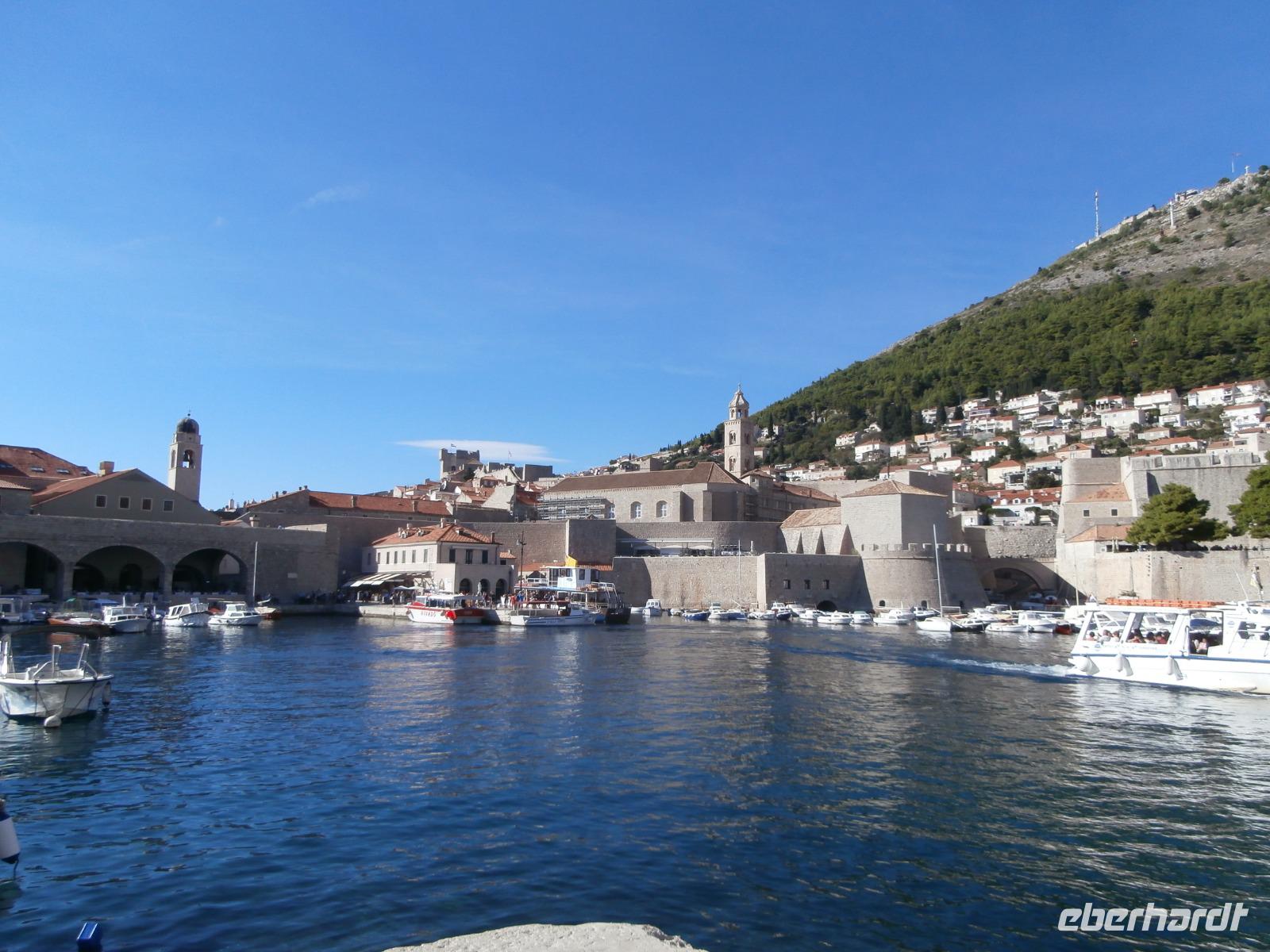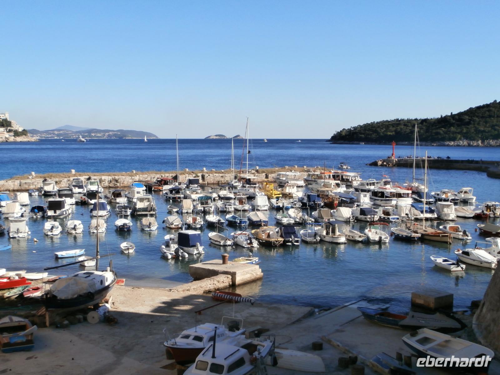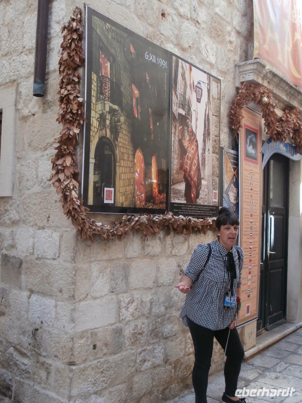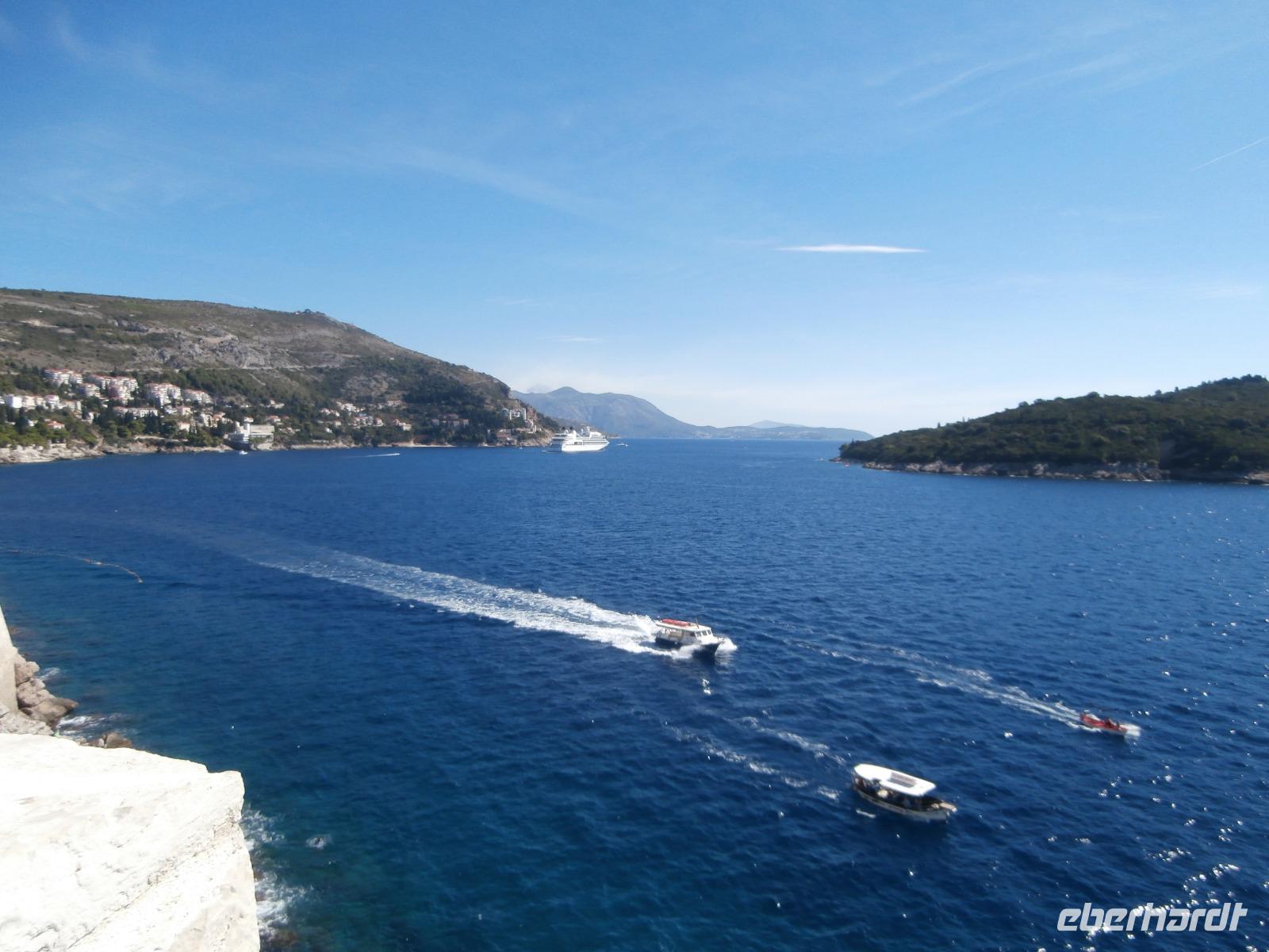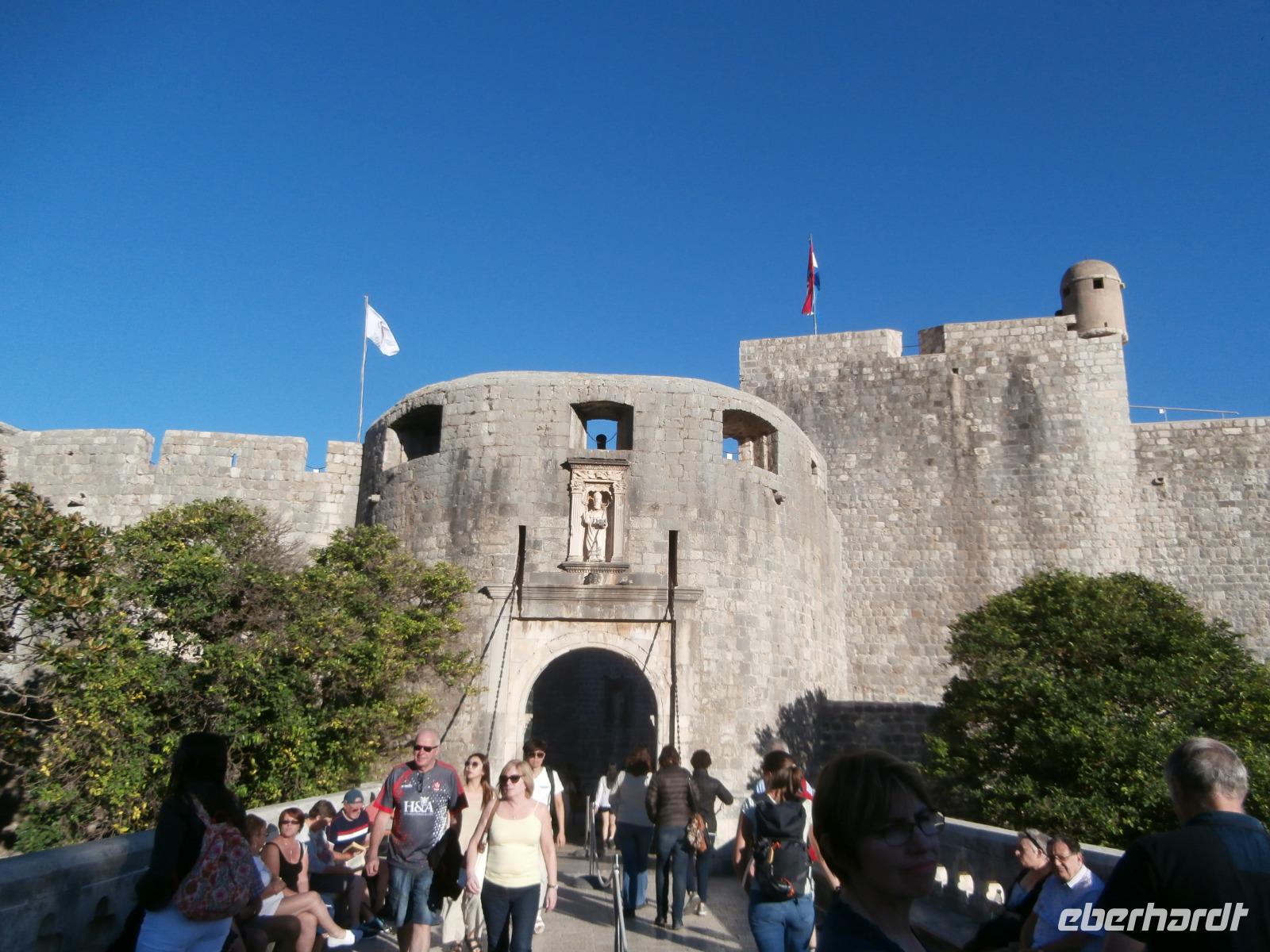 Wir treffen uns an diesem Mittwoch sehr zeitig auf dem Flughafenterminal in Dresden. Die Begrüßung durch Mitarbeiter von Eberhardt Travel GmbH ist herzlich, jeder Reisegast bekommt einen Beutel mit verschiedenen Süßigkeiten und Italien Reisewerbung. Der Check Inn bei Germania läuft schleppend an, unser Sonderflug wird leider nicht separat abgefertigt. Ohne Pause nach dem Sicherheitscheck geht es in den Flieger. Leicht verspätet heben wir in Dresden ab. Der Landeanflug auf Dubrovnik gestaltet sich äußerst schwierig, die Bora bläst wahnsinnig in der Bucht, unser Pilot muss schließlich kurz vor Landung wieder durchstarten, zu gefährlich wäre es für uns alle gewesen. Nach 25 Minuten Flug landen wir mit viel Seitenwind in Brindisi in Italien. Lange Zeit bleiben wir im Flieger sitzen, im Cockpit muss nun entschieden werden, wie weiter. Zum Betanken steigen wir später in Busse um und warten dort ab, bis wir wieder in das Flugzeug zurück dürfen. Der Wind soll um die Mittagszeit etwas weniger sein und so starten wir erneut mit Ziel Dubrovnik. Punkt zwölf setzen wir auf der Landebahn auf, eine großartige Leistung vom Piloten, denn stark war der Wind zu spüren, viele Reisegäste verspürten große Angst, das Wackeln und Absacken war sehr unangenehm. Sehr erleichtert steigen wir aus und geben zuvor noch einen großen Applaus an den Piloten unseres Fluges. Bei Sonnenschein und 25ºC steigen wir zu Matteo in den Bus, mit ihm erreichen wir nach einer halben Stunde unser Hotel Vis im Stadtteil Lapad in Dubrovnik. Wir beziehen die Zimmer und verabreden uns für 15:00 Uhr zur ersten gemeinsamen Fahrt nach Dubrovnik, der ehemaligen Hauptstadt der Adriarepublik Ragusa - der heutigen pulsierenden Metropole Süddalmatiens und einer der sehenswertesten Städte Kroatiens. Hier unternehmen wir einen ersten gemeinsamen Spaziergang - vom Pile-Tor in die Stadt und auf dem Stradun, der Hauptstraße durch die Altstadt, bis zum zweiten Stadttor. Mit dem Stadtbus der Linie 4 geht es wieder zurück zum Hotel. Ob Baden oder ein Drink auf der Hotelterrasse, die Zeit bis zum Abendessen wird erholsam genutzt. Sehr zeitig fallen wir heute in unsere Betten, der Tag war lang und aufregend.