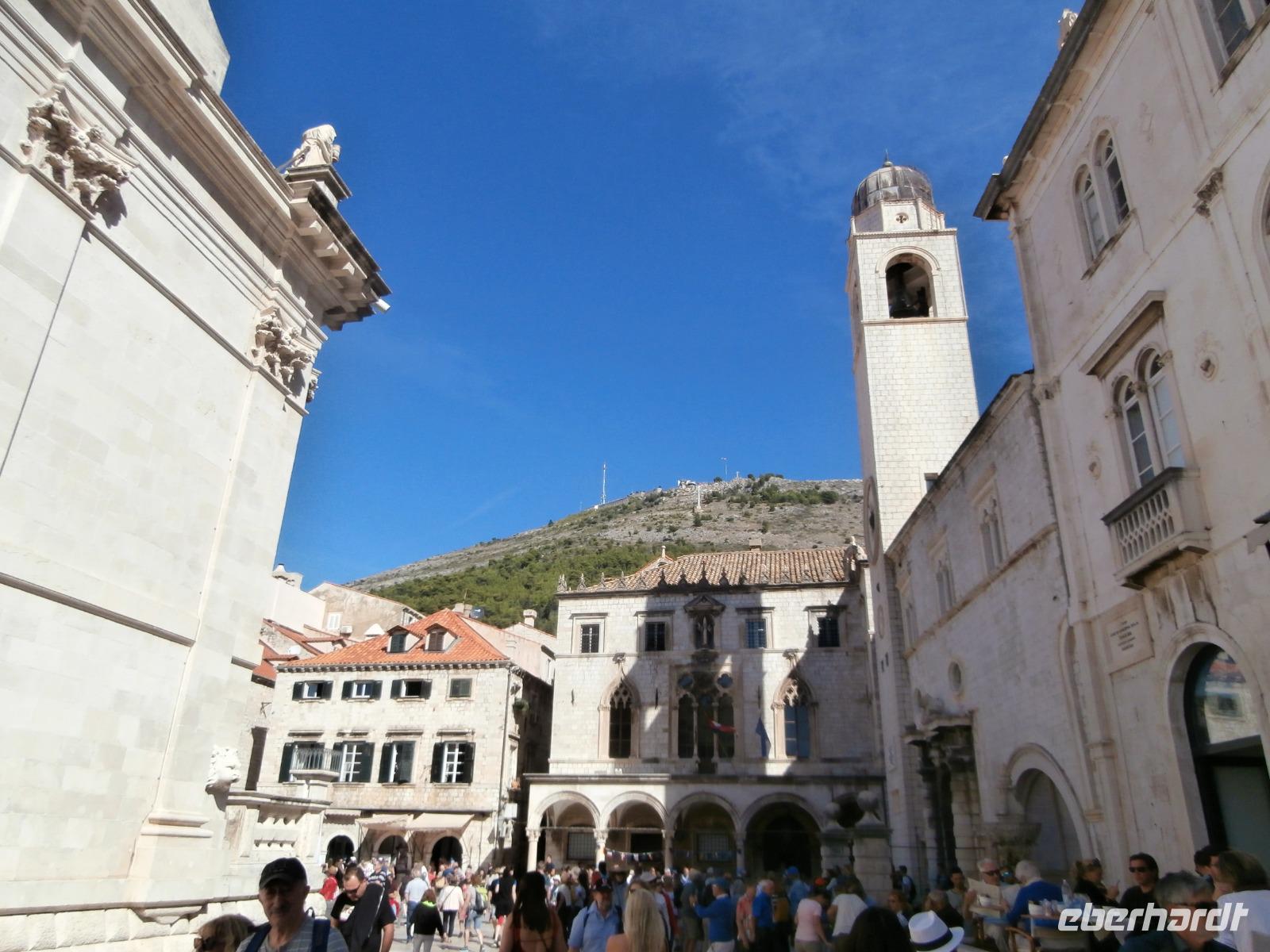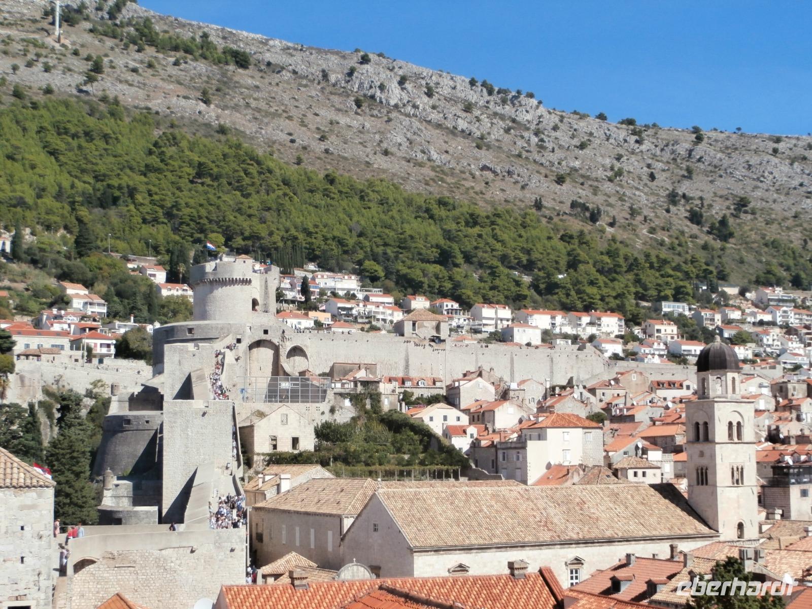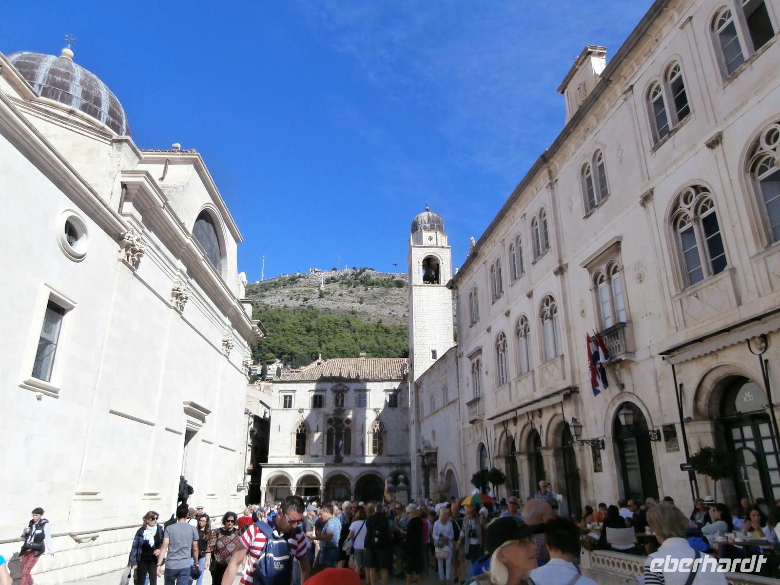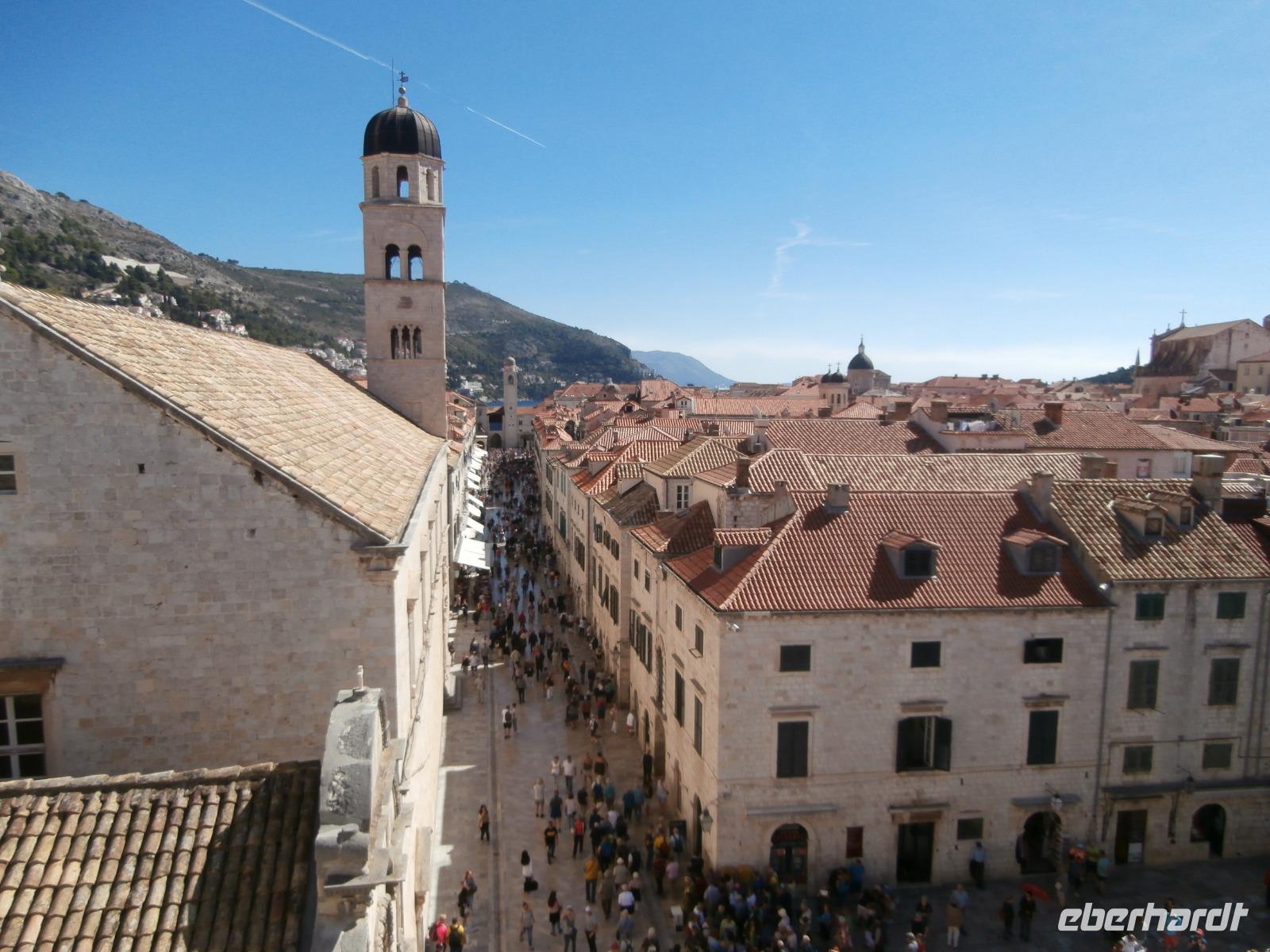 Wir treffen uns an diesem Mittwoch sehr zeitig auf dem Flughafenterminal in Dresden. Die Begrüßung durch Mitarbeiter von Eberhardt Travel GmbH ist herzlich, jeder Reisegast bekommt einen Beutel mit verschiedenen Süßigkeiten und Italien Reisewerbung. Der Check Inn bei Germania läuft schleppend an, unser Sonderflug wird leider nicht separat abgefertigt. Ohne Pause nach dem Sicherheitscheck geht es in den Flieger. Leicht verspätet heben wir in Dresden ab. Der Landeanflug auf Dubrovnik gestaltet sich äußerst schwierig, die Bora bläst wahnsinnig in der Bucht, unser Pilot muss schließlich kurz vor Landung wieder durchstarten, zu gefährlich wäre es für uns alle gewesen. Nach 25 Minuten Flug landen wir mit viel Seitenwind in Brindisi in Italien. Lange Zeit bleiben wir im Flieger sitzen, im Cockpit muss nun entschieden werden, wie weiter. Zum Betanken steigen wir später in Busse um und warten dort ab, bis wir wieder in das Flugzeug zurück dürfen. Der Wind soll um die Mittagszeit etwas weniger sein und so starten wir erneut mit Ziel Dubrovnik. Punkt zwölf setzen wir auf der Landebahn auf, eine großartige Leistung vom Piloten, denn stark war der Wind zu spüren, viele Reisegäste verspürten große Angst, das Wackeln und Absacken war sehr unangenehm. Sehr erleichtert steigen wir aus und geben zuvor noch einen großen Applaus an den Piloten unseres Fluges. Bei Sonnenschein und 25ºC steigen wir zu Matteo in den Bus, mit ihm erreichen wir nach einer halben Stunde unser Hotel Vis im Stadtteil Lapad in Dubrovnik. Wir beziehen die Zimmer und verabreden uns für 15:00 Uhr zur ersten gemeinsamen Fahrt nach Dubrovnik, der ehemaligen Hauptstadt der Adriarepublik Ragusa - der heutigen pulsierenden Metropole Süddalmatiens und einer der sehenswertesten Städte Kroatiens. Hier unternehmen wir einen ersten gemeinsamen Spaziergang - vom Pile-Tor in die Stadt und auf dem Stradun, der Hauptstraße durch die Altstadt, bis zum zweiten Stadttor. Mit dem Stadtbus der Linie 4 geht es wieder zurück zum Hotel. Ob Baden oder ein Drink auf der Hotelterrasse, die Zeit bis zum Abendessen wird erholsam genutzt. Sehr zeitig fallen wir heute in unsere Betten, der Tag war lang und aufregend.