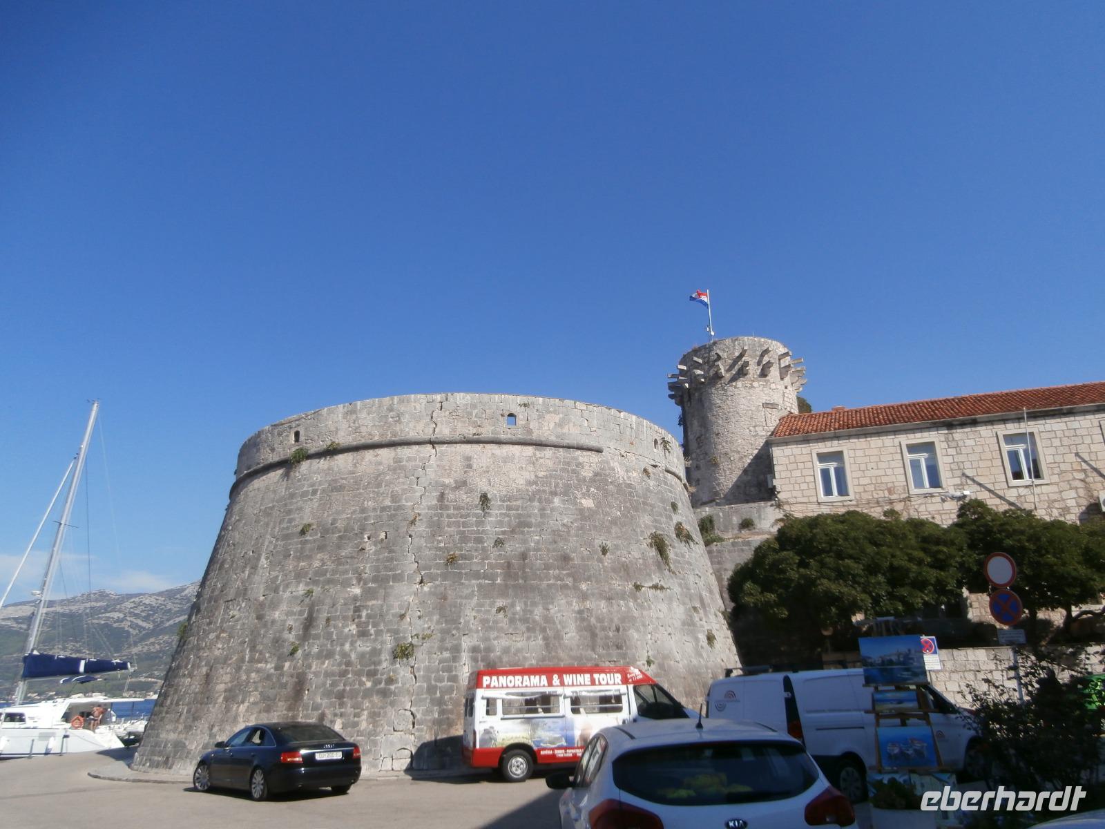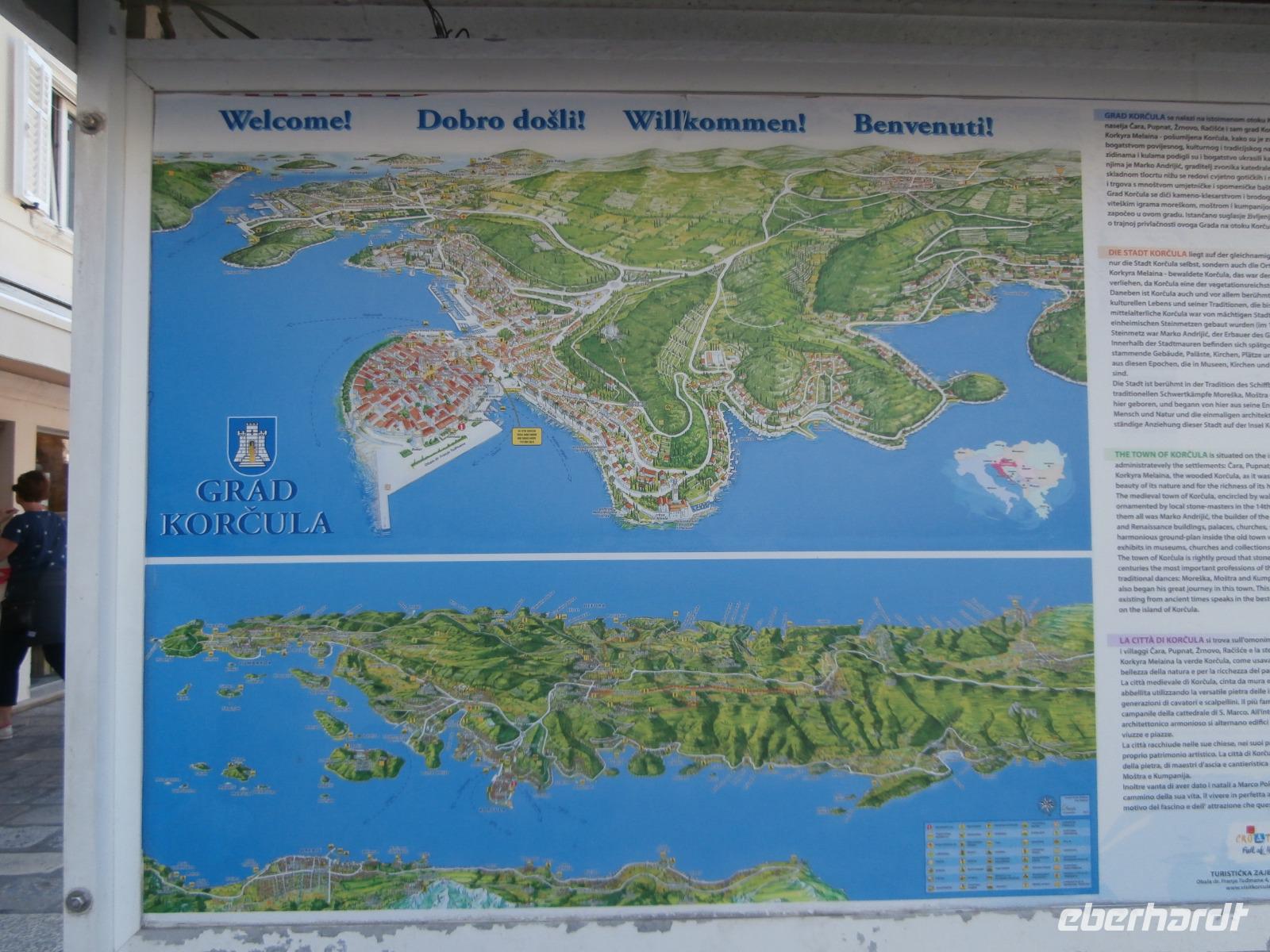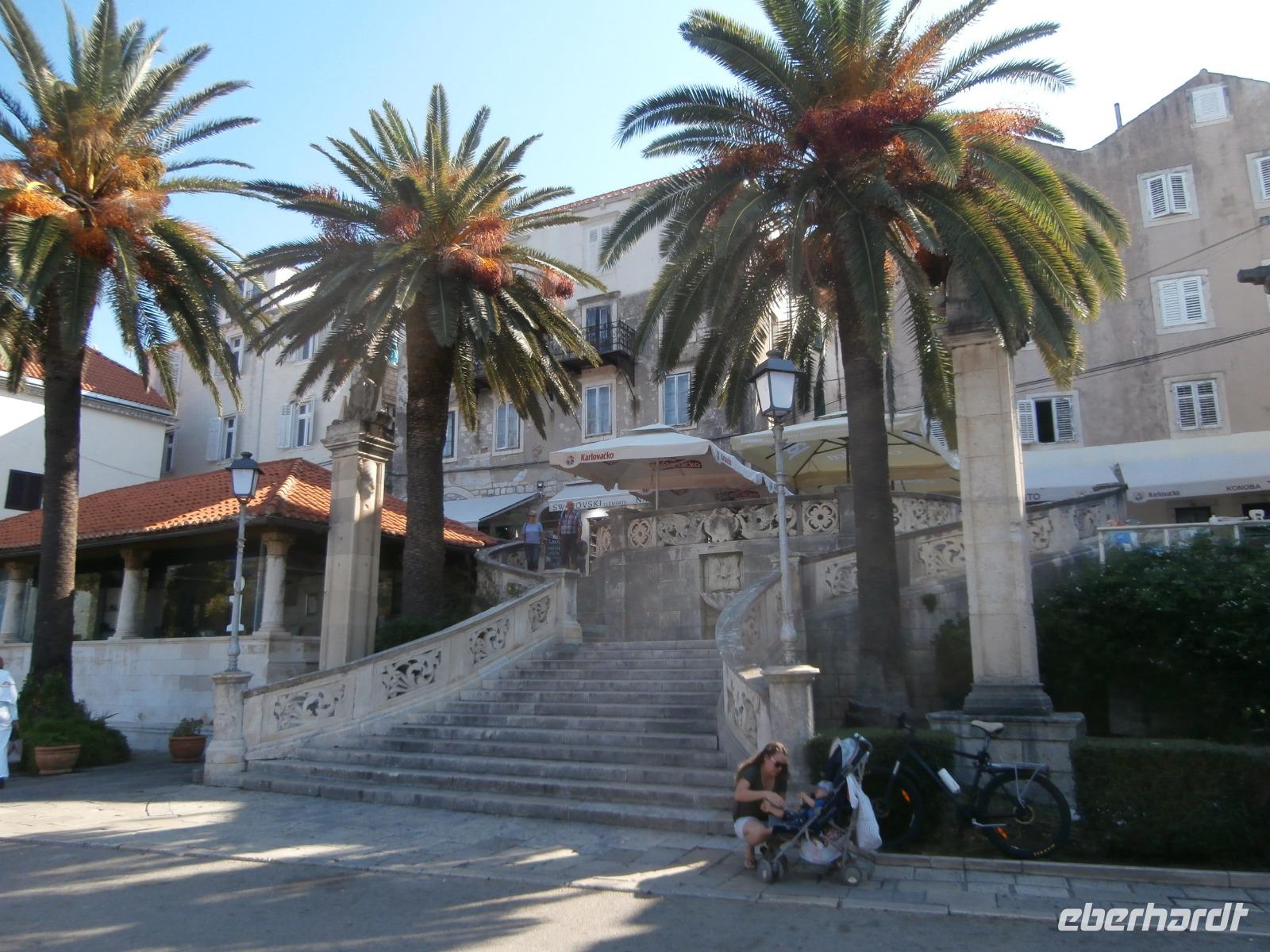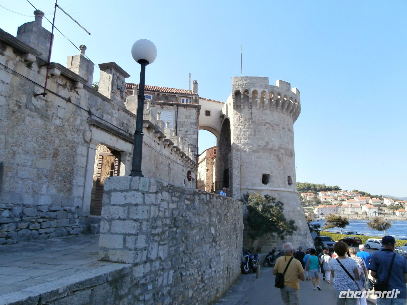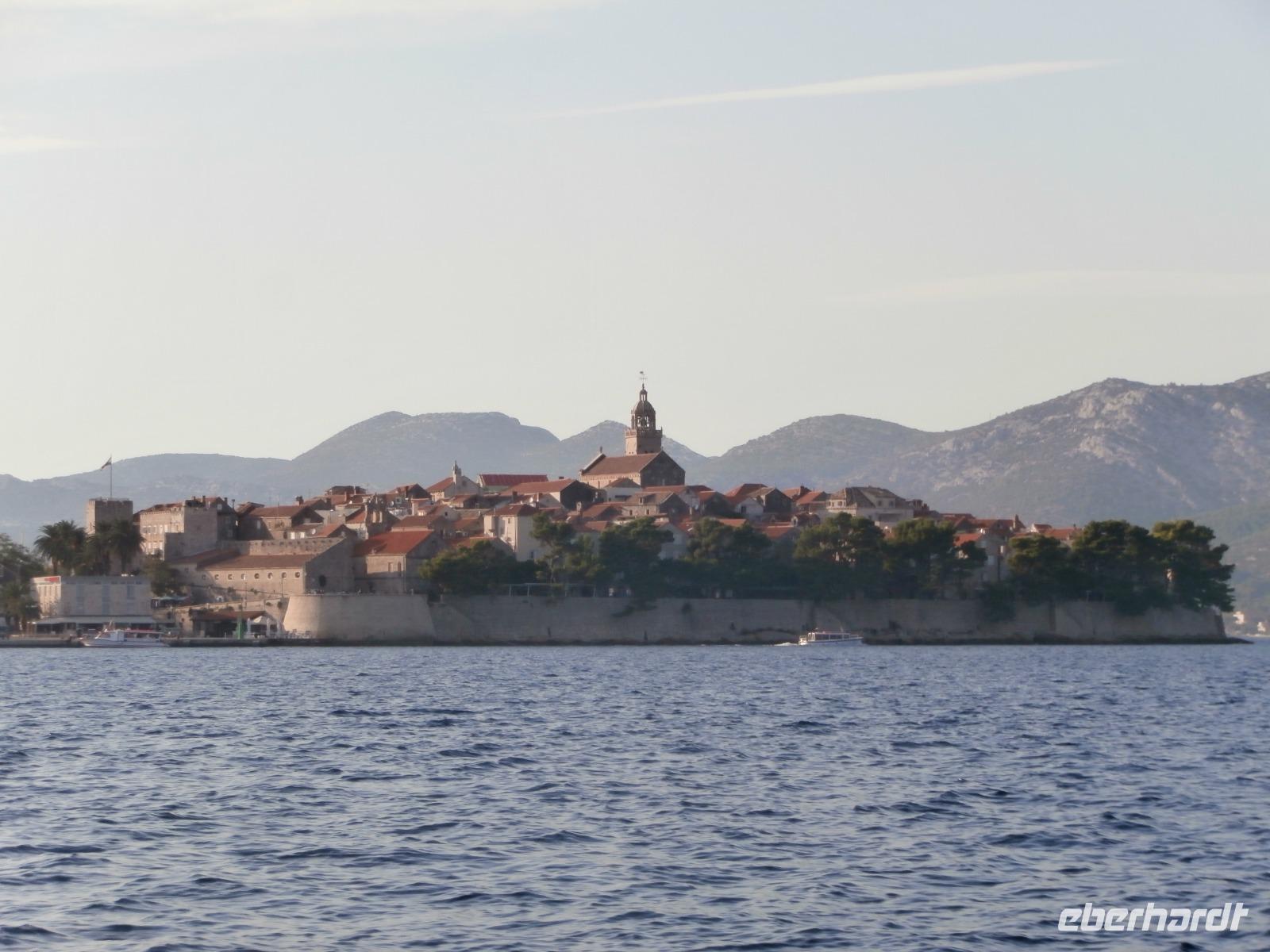 Gemeinsam spazieren wir hinein nach Korcula, wo wir uns an der Freitreppe vor dem Stadttor mit Neda Farac zum Stadtrundgang treffen. Die wunderbare Silhouette der Halbinsel kommt näher und man erkennt mächtige Türme und Befestigungen, die einen schönen Kontrast zum Meer ergeben. Mit Feda besichtigen wir die Altstadt und folgen den Erklärungen zur örtlichen Bebauung und der Geschichte von Korcula. Im Gewirr alter Gassen findet sich auch das Geburtshaus von Marco Polo, den wohl berühmtesten Inselbewohner. Die Kathedrale des Heiligen Markus entstand im 15.Jahrhundert, daher ist der Baustil ein Mix von spätgotischen Elementen und Teilen aus der Frührenaissance. Zwei Löwen zu beiden Seiten des Portals begleiten in das Innere der dreischiffigen Kathedrale, deren reiche Ausstattung beeindruckt. Wir beenden unseren Rundgang wieder am Ausgangspunkt des Stadtrundganges, dem mächtigen Landtor mit seinem majestätischen Aufgang ins Stadtinnere. Wir erfahren, dass die Insel eine Ausdehnung von 276 qkm hat und von ca. 19000 Einwohnern bewohnt wird. Korcula Stadt hat 3800 Einwohner und ist eine Ansiedlung aus dem 12. Jahrhundert. Verschiedenste Bäume und Gehölze sind hier anzutreffen, z B. Steineichen, Lorbeerbäume,