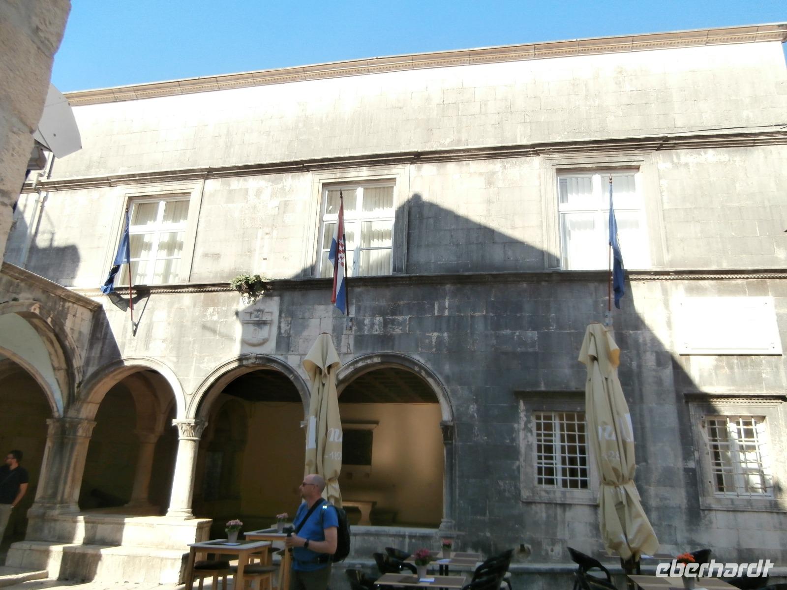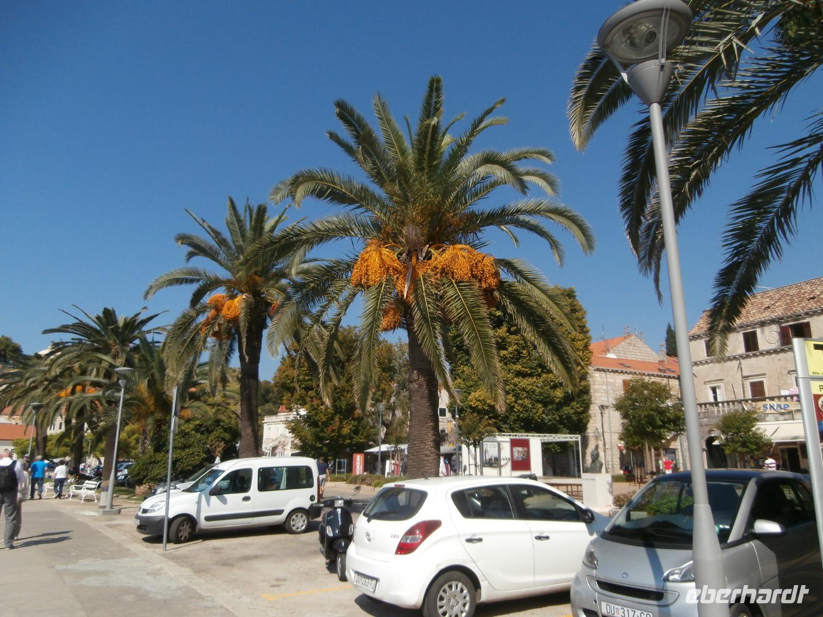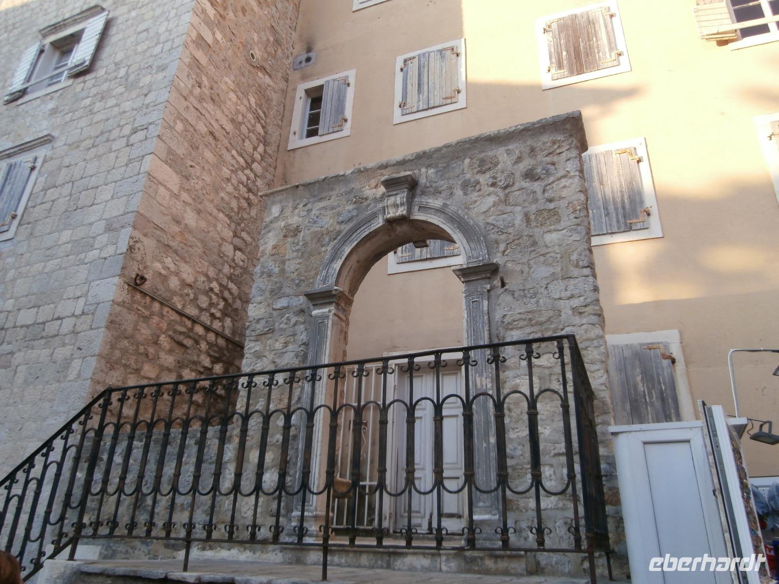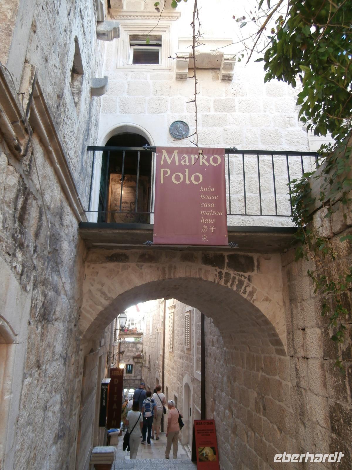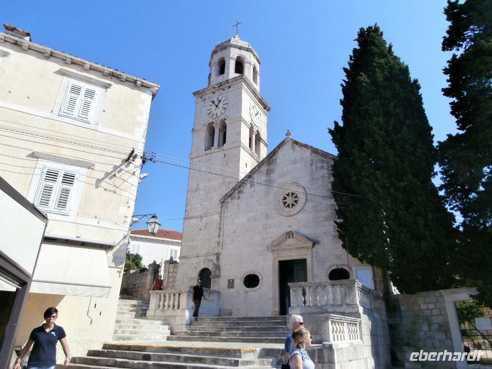 Gemeinsam spazieren wir hinein nach Korcula, wo wir uns an der Freitreppe vor dem Stadttor mit Neda Farac zum Stadtrundgang treffen. Die wunderbare Silhouette der Halbinsel kommt näher und man erkennt mächtige Türme und Befestigungen, die einen schönen Kontrast zum Meer ergeben. Mit Feda besichtigen wir die Altstadt und folgen den Erklärungen zur örtlichen Bebauung und der Geschichte von Korcula. Im Gewirr alter Gassen findet sich auch das Geburtshaus von Marco Polo, den wohl berühmtesten Inselbewohner. Die Kathedrale des Heiligen Markus entstand im 15.Jahrhundert, daher ist der Baustil ein Mix von spätgotischen Elementen und Teilen aus der Frührenaissance. Zwei Löwen zu beiden Seiten des Portals begleiten in das Innere der dreischiffigen Kathedrale, deren reiche Ausstattung beeindruckt. Wir beenden unseren Rundgang wieder am Ausgangspunkt des Stadtrundganges, dem mächtigen Landtor mit seinem majestätischen Aufgang ins Stadtinnere. Wir erfahren, dass die Insel eine Ausdehnung von 276 qkm hat und von ca. 19000 Einwohnern bewohnt wird. Korcula Stadt hat 3800 Einwohner und ist eine Ansiedlung aus dem 12. Jahrhundert. Verschiedenste Bäume und Gehölze sind hier anzutreffen, z B. Steineichen, Lorbeerbäume,