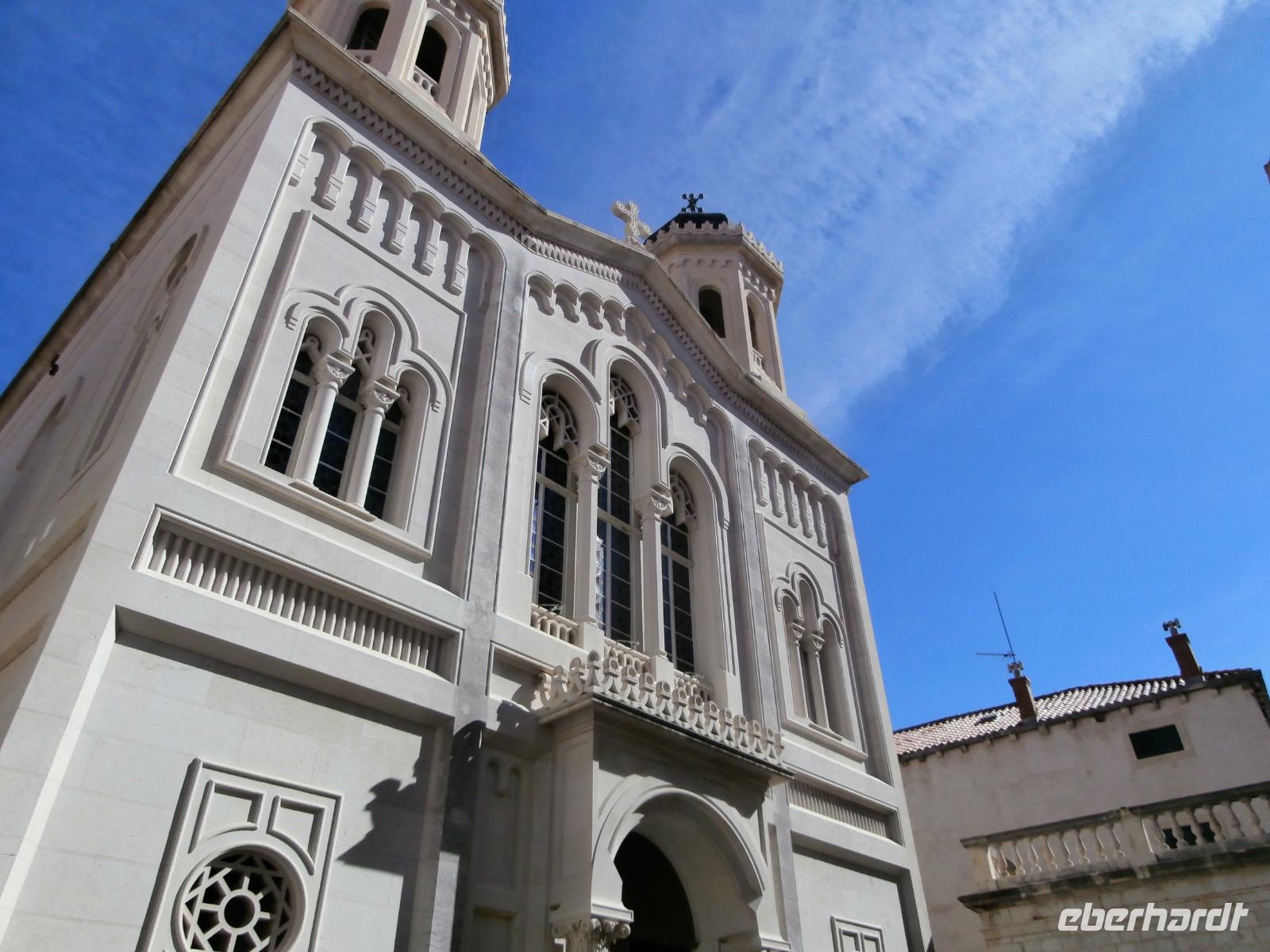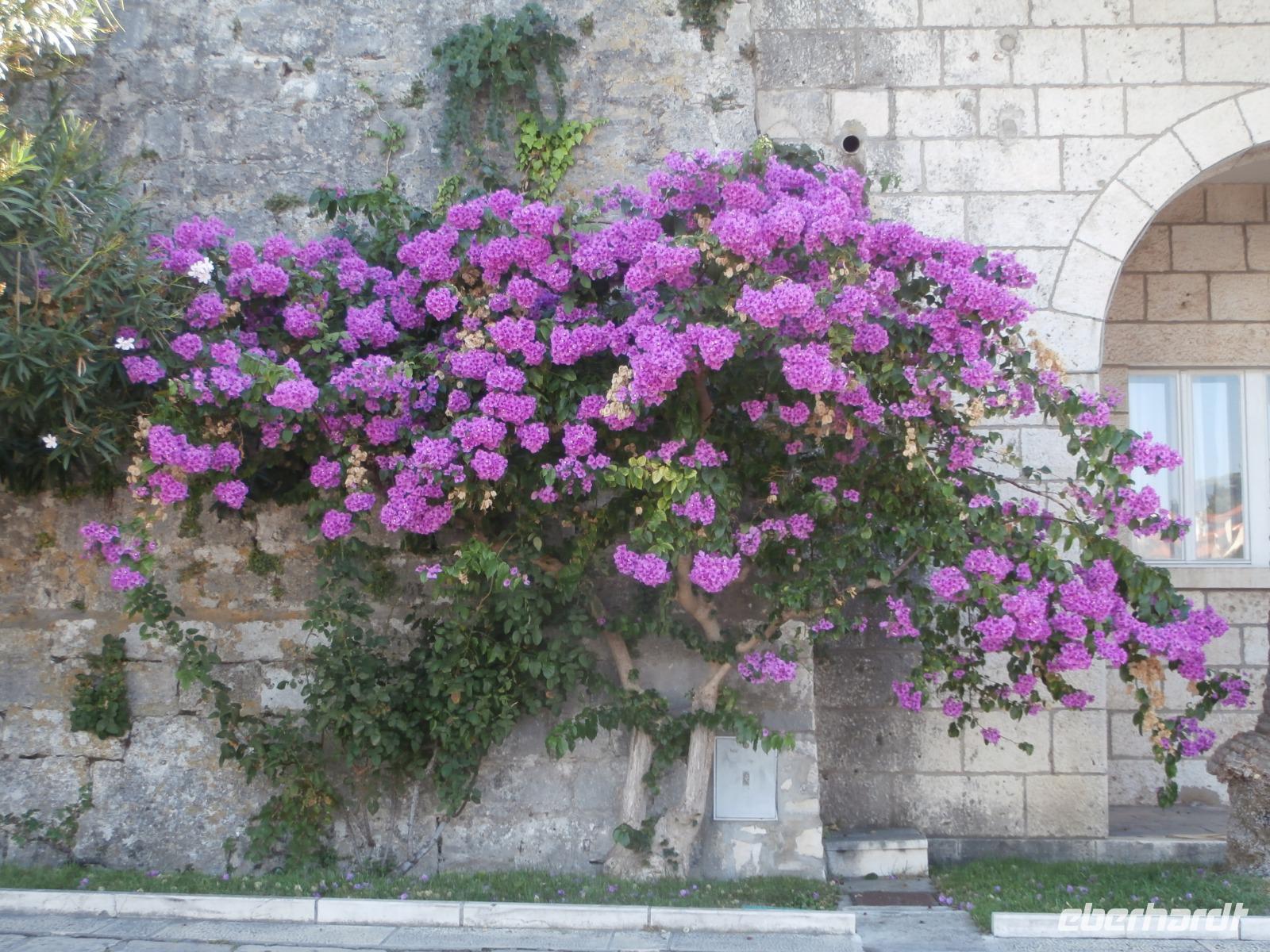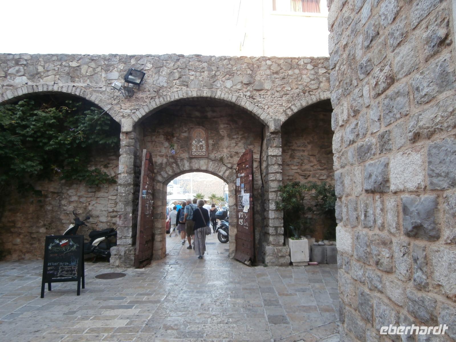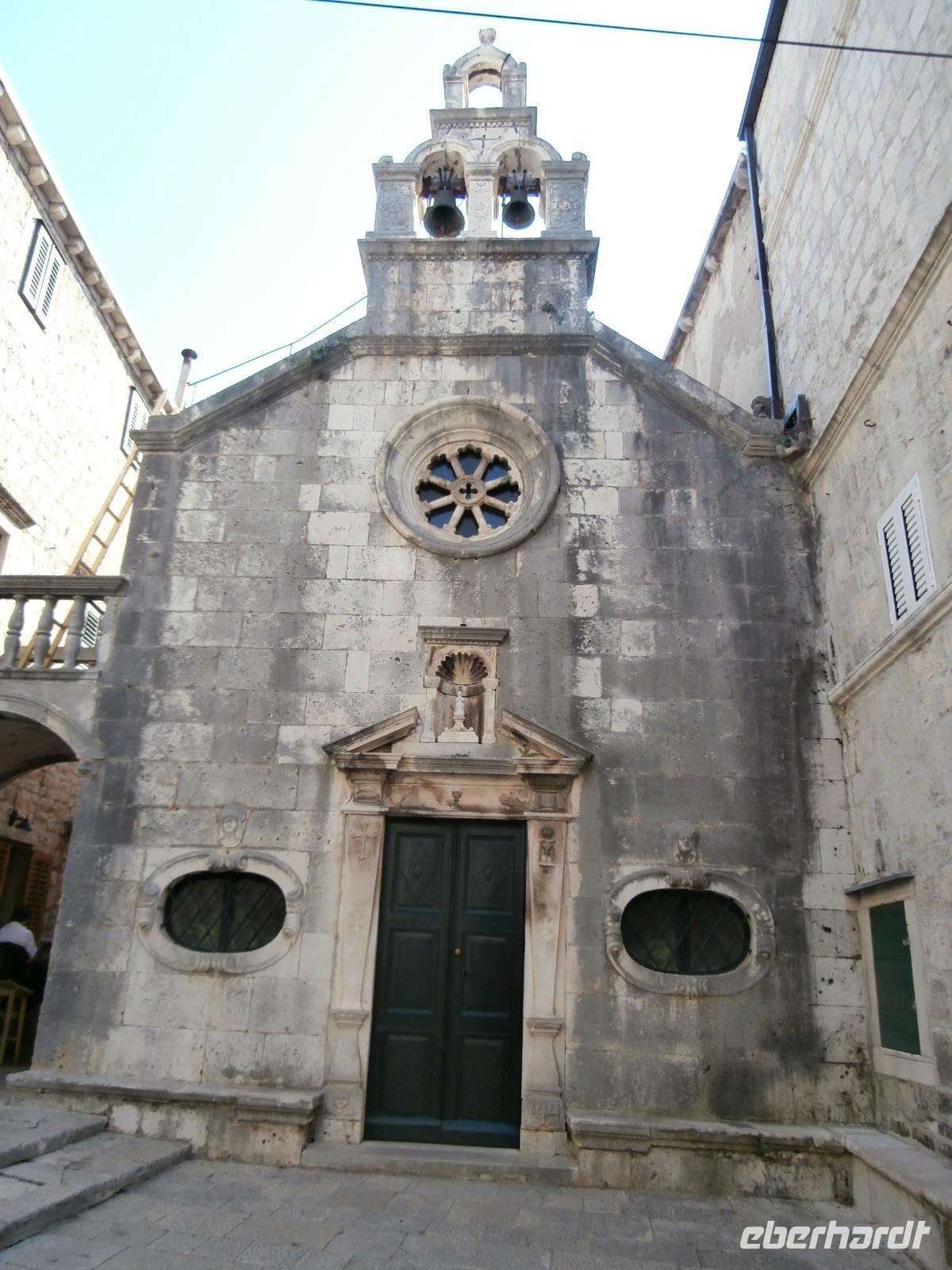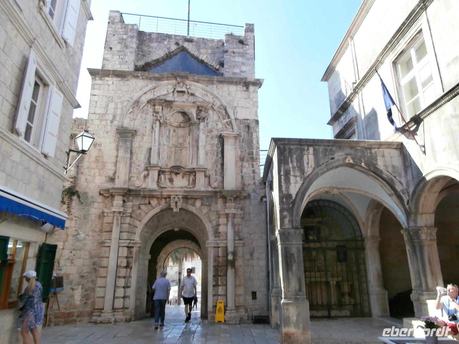 Gemeinsam spazieren wir hinein nach Korcula, wo wir uns an der Freitreppe vor dem Stadttor mit Neda Farac zum Stadtrundgang treffen. Die wunderbare Silhouette der Halbinsel kommt näher und man erkennt mächtige Türme und Befestigungen, die einen schönen Kontrast zum Meer ergeben. Mit Feda besichtigen wir die Altstadt und folgen den Erklärungen zur örtlichen Bebauung und der Geschichte von Korcula. Im Gewirr alter Gassen findet sich auch das Geburtshaus von Marco Polo, den wohl berühmtesten Inselbewohner. Die Kathedrale des Heiligen Markus entstand im 15.Jahrhundert, daher ist der Baustil ein Mix von spätgotischen Elementen und Teilen aus der Frührenaissance. Zwei Löwen zu beiden Seiten des Portals begleiten in das Innere der dreischiffigen Kathedrale, deren reiche Ausstattung beeindruckt. Wir beenden unseren Rundgang wieder am Ausgangspunkt des Stadtrundganges, dem mächtigen Landtor mit seinem majestätischen Aufgang ins Stadtinnere. Wir erfahren, dass die Insel eine Ausdehnung von 276 qkm hat und von ca. 19000 Einwohnern bewohnt wird. Korcula Stadt hat 3800 Einwohner und ist eine Ansiedlung aus dem 12. Jahrhundert. Verschiedenste Bäume und Gehölze sind hier anzutreffen, z B. Steineichen, Lorbeerbäume,