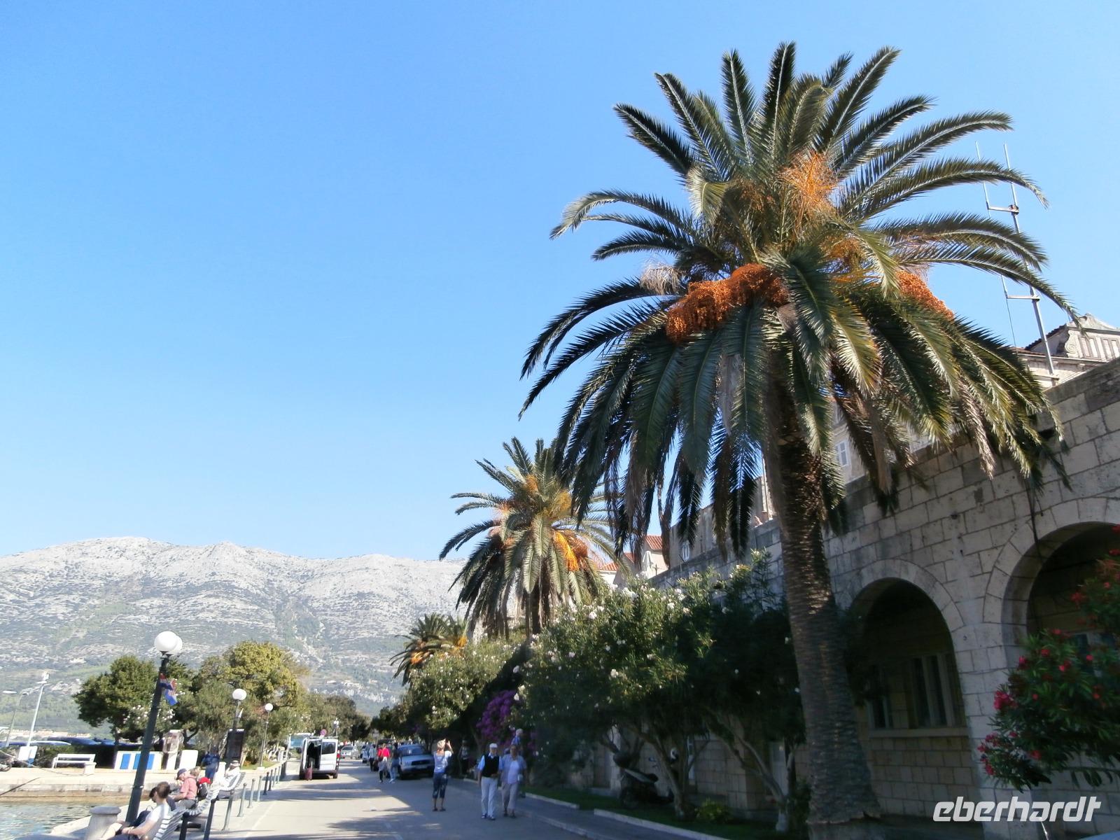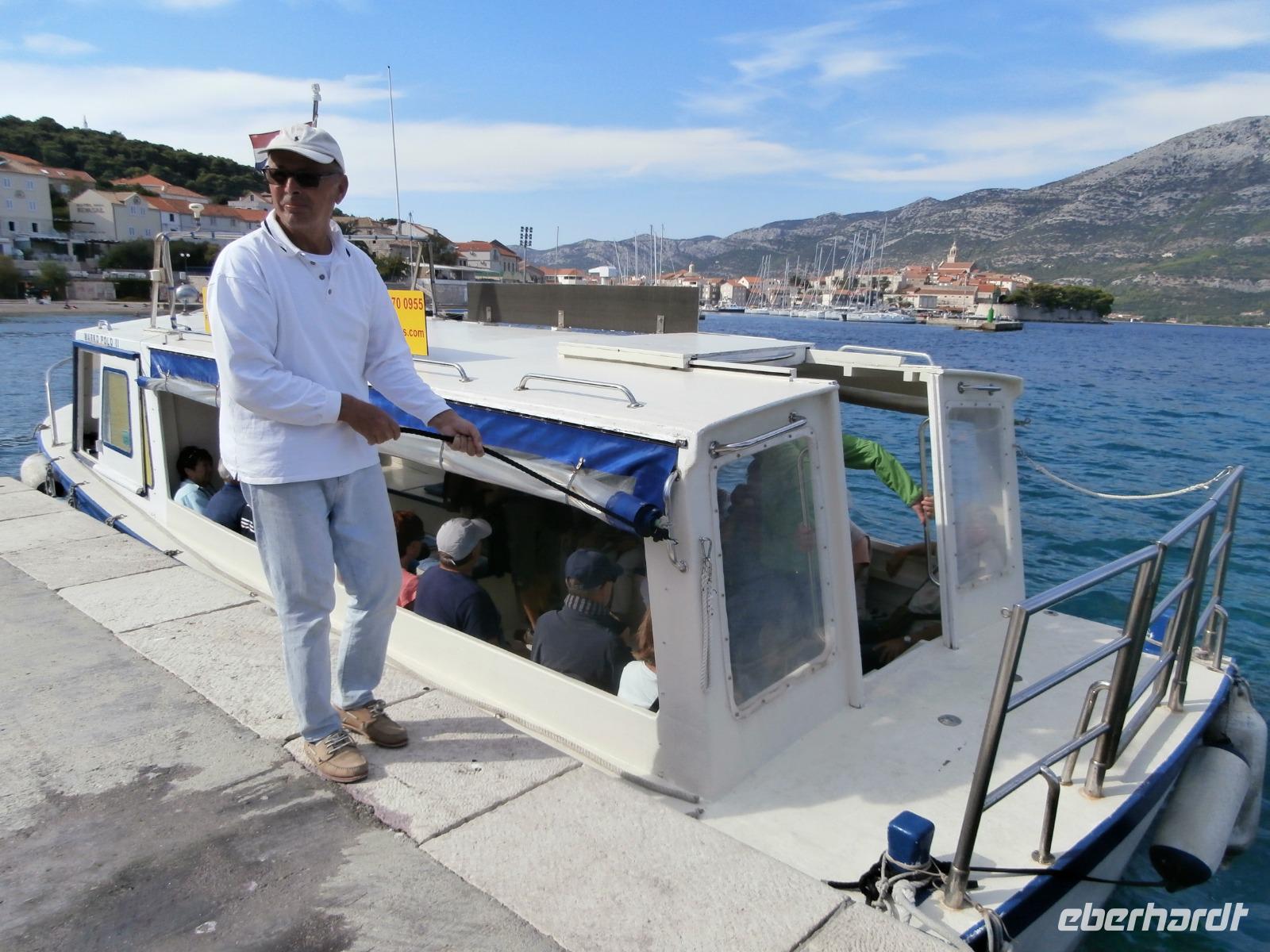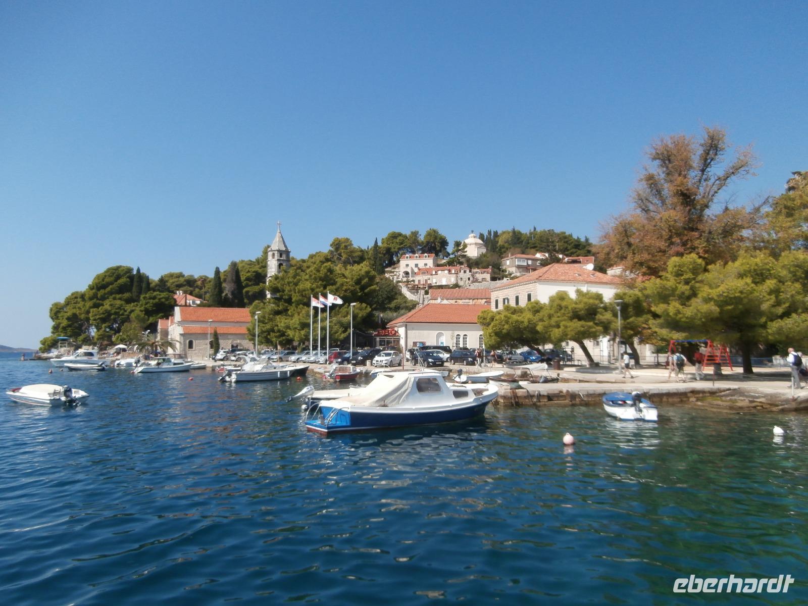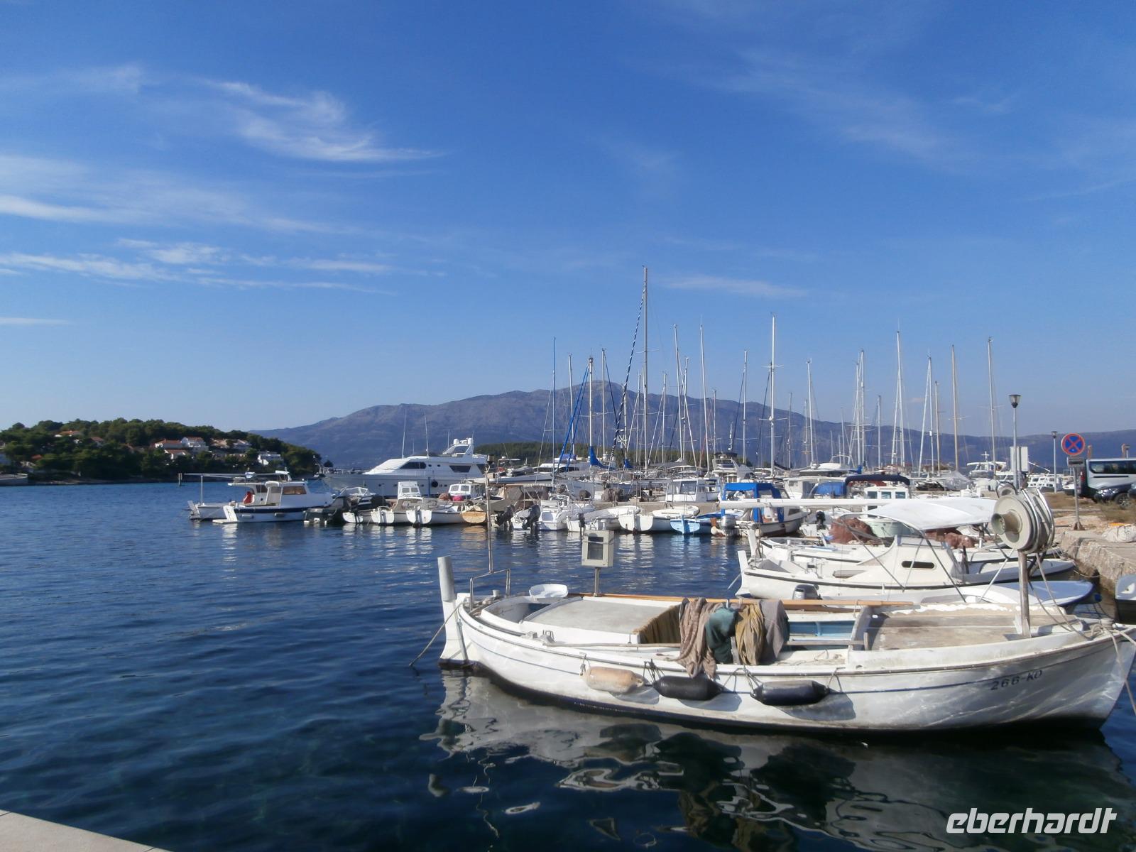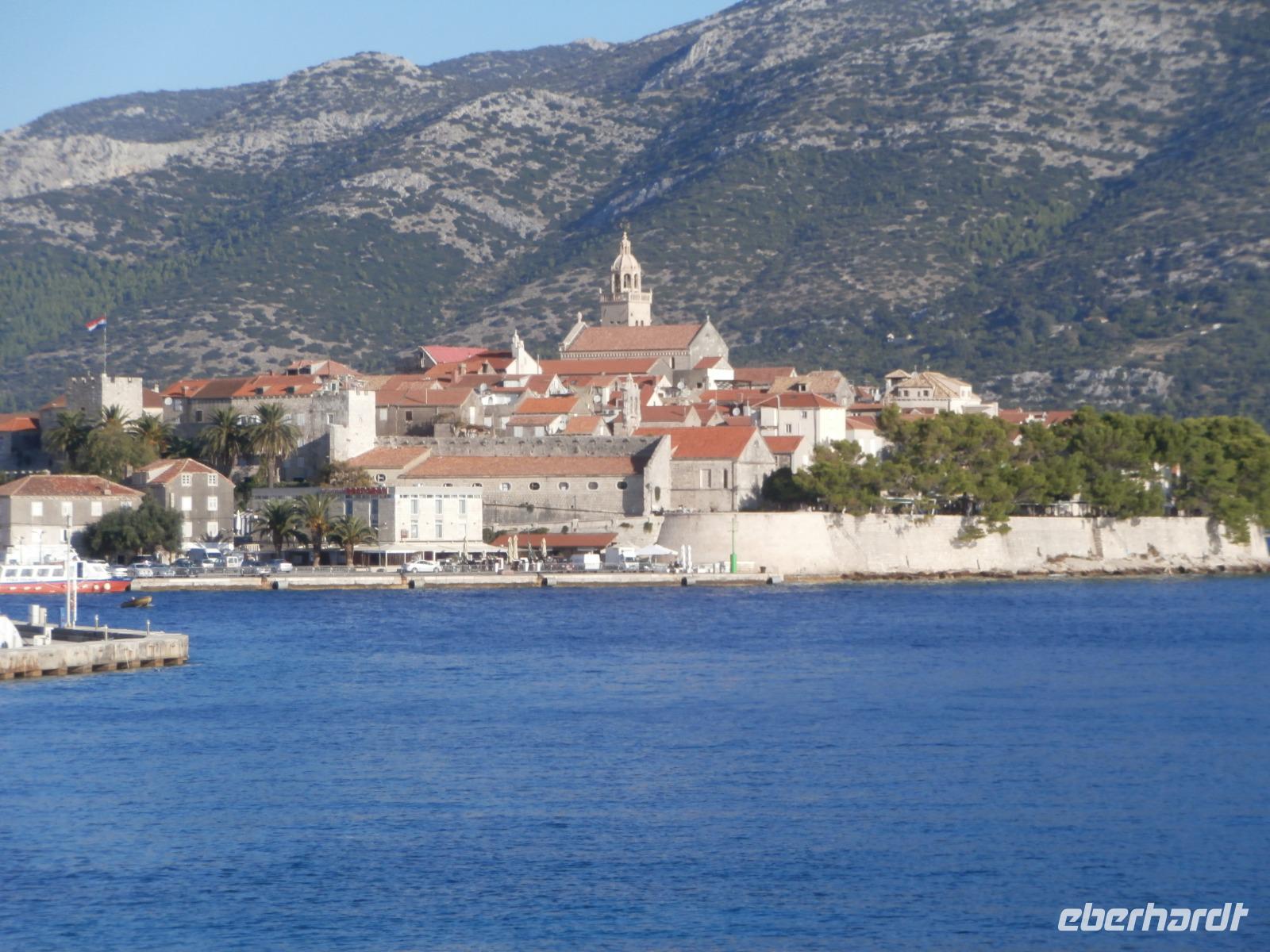Pistazien, Schwarzkiefern, Baumheide, Wacholder, Olivenbäume. Am Nachmittag unternehmen wir mit dem Boot gemeinsam eine Schifffahrt entlang kleiner Inseln bis hin nach Lumbarda. Zum Eis essen und Kaffeetrinken stoppen wir hier und genießen das schöne Wetter. Die Menschen auf der Insel leben vom Tourismus, der Herstellung von Olivenöl, Naturprodukten für Medizin und Kosmetik. Auch der Weinanbau und die Herstellung von Schiffsausrüstungen sind Erwerbsquellen. Gegen fünf sind wir am Hotel Liburna zurück, das Boot legt unterhalb vom Hotel an. Pünktlich 19 Uhr treffen wir uns zum reichhaltigen Abendbüfett. Mit herrlichen Ausblicken hinüber zur Altstadt klingt der Abend aus. Morgen früh verlassen wir die Insel Korcula.