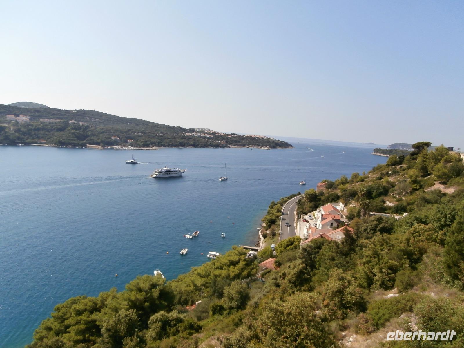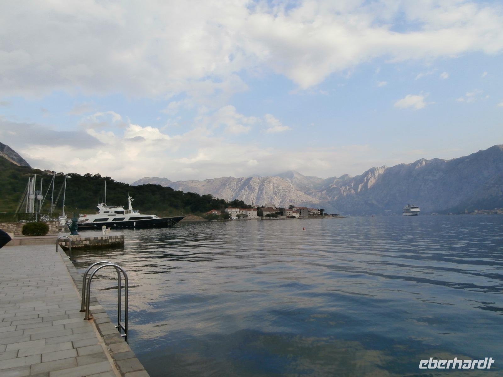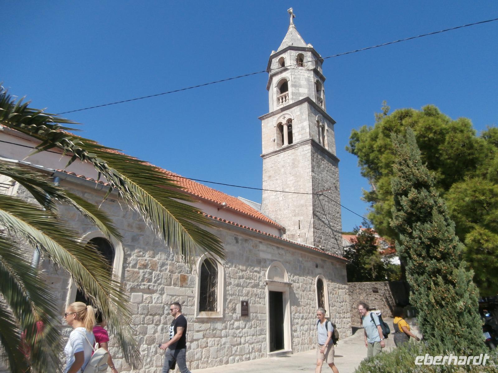 Abschied von Korcula und nochmals eine wunderbare Sicht auf die Bucht, Berge und Uferzone. 08:30 Uhr geht es mit unserem Bus vom Hotel Richtung Fähranlegestelle Domince und 09:00 Uhr ist die Überfahrt von Domince (Korcula) nach Orebic. Wir setzen unsere Reise fort, es geht ca. 120 km nach Süden, zur Stadt Cavtat. Ein Fotostopp vor der Brücke in Dubrovnik gehört natürlich dazu. 12:30 Uhr erreichen wir die Stadt Cavtat und nehmen uns Zeit für Mittag, einen Spaziergang zur Nikolauskirche und dem Franziskaner Kloster und zum Mausoleum werfen wir einen Blick hinauf. 14:00 Uhr verlassen wir Cavtat und fahren weiter in Richtung Montenegro. Die Formalitäten an der Grenze dauern alle weile, aber Darijo unser Fahrer kennt die Möglichkeiten, Wege zu verkürzen. Wir fahren weiter zur Fähre in Lepetane und setzen über nach Kamenari. Bis Budva sind es noch gut eine halbe Stunde Fahrt und hier werden wir von Katharina, unserer örtlichen Führerin, am Parkplatz erwartet. Mit ihr haben wir einen fantastischen Rundgang. Budvar hat ca. 40 000 Einwohner und ist wunderschön an einer Bucht gelegen. Die historische Altstadt ist sehr sehenswert. Auf einem der antiken Plätze, dem Palmenplatz, stehen eine Kathedrale, eine Moschee und eine orthodoxe Kirche in malerischer Einheit dicht beieinander und bilden ein herrliches Ensemble. Wir folgen der Wegeführung und stehen plötzlich vor einer massiven Brüstungsmauer, die unmittelbar dem Meer zugewandt ist. Dort ist ein sehr schöner Küstenausblick möglich. Anschließend wenden wir uns nochmal der malerischen Innenstadt zu mit ihren vielen bunten Gassen voller kleiner Kaffees und Minigeschäfte. Nach intensiver Besichtigung des Ortes verlassen wir Budvar. In Kotor biegen wir ab und fahren an dem Ufer des Fjordes bis zum Hotel Splendido in Prcanj. Wunderschön ist es hier direkt am Ufer in der Bucht und zum Abendessen treffen wir uns alle im Restaurant. Leckere Speisen werden uns serviert und am Ufer lassen wir bei herrlicher Beleuchtung den Abend ausklingen.