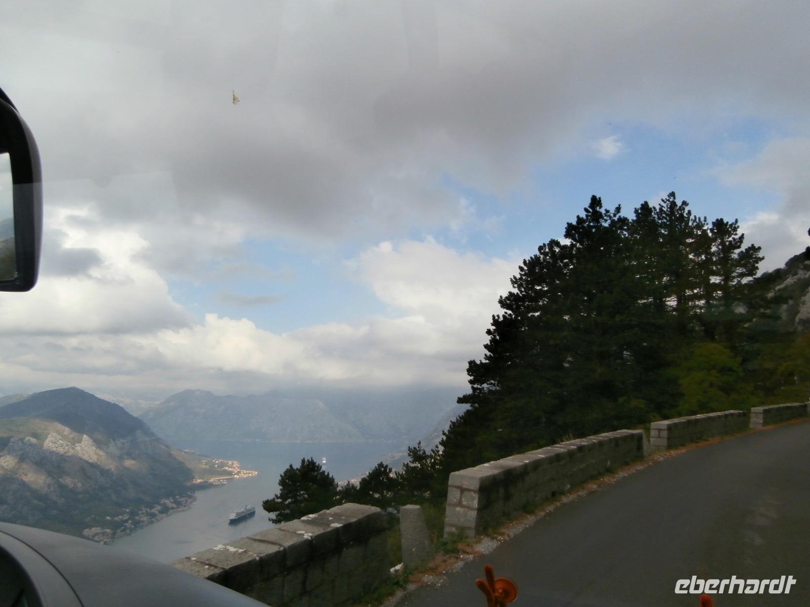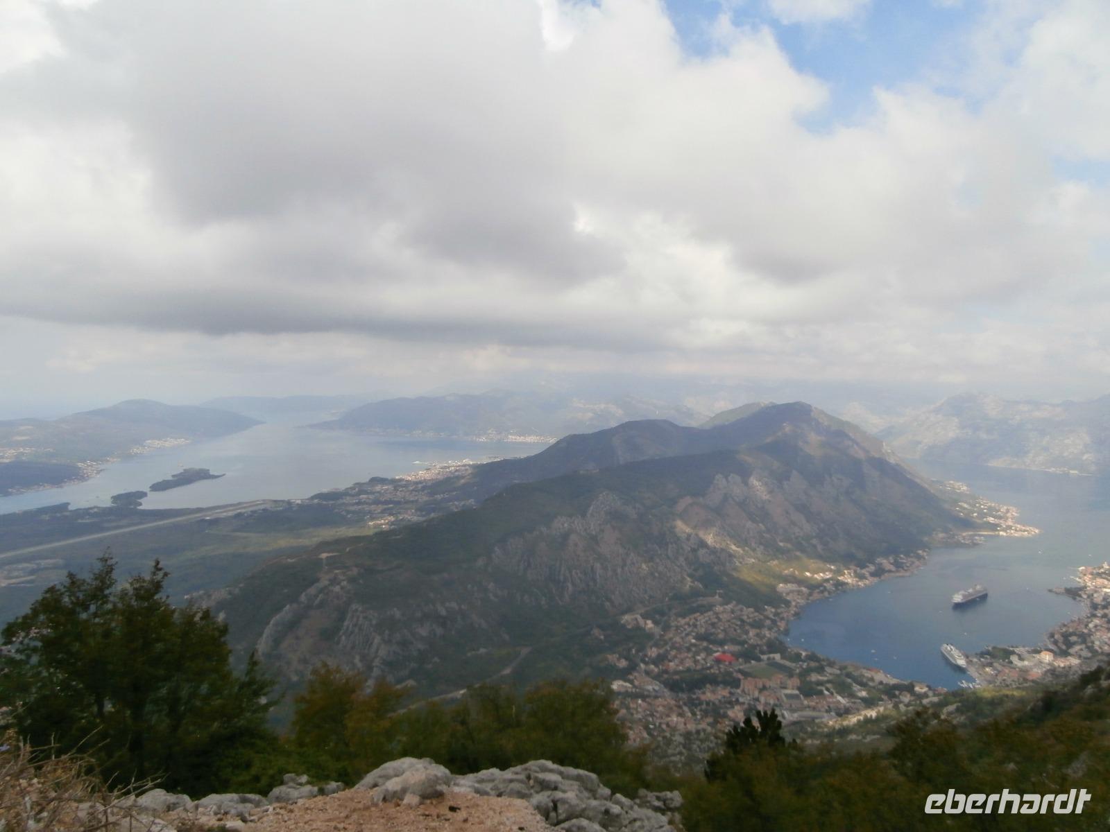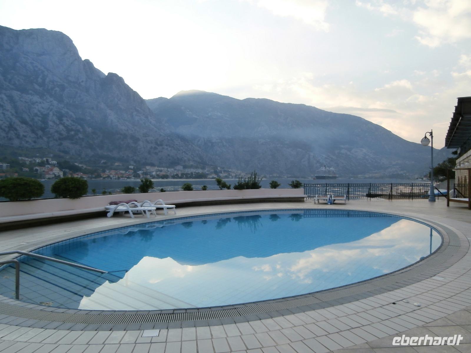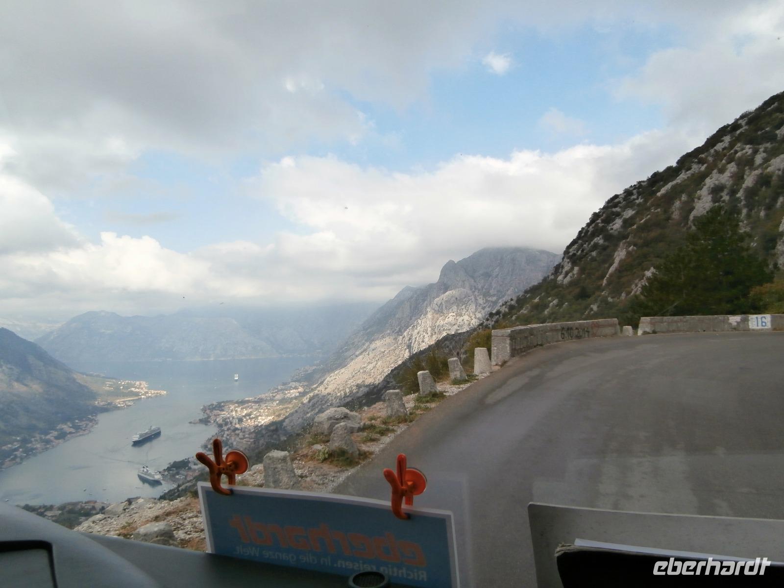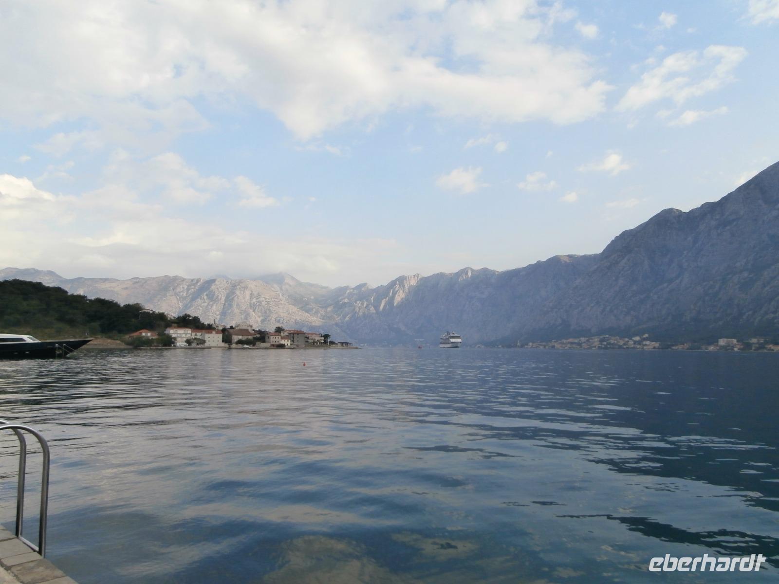 Wir können ab 07.30 Uhr frühstücken - lecker und reichlich ist es. 3 Kreuzfahrtschiffe fahren am Morgen in die Bucht von Kotor ein. 08:30 Uhr ist Start zum Tagesausflug mit Besuch von Kotor, Njegusi und Cetinje. Wir fahren am Morgen zuerst hinein nach Kotor und treffen uns am Eingang zur Stadt mit Rosanda zur Führung. Kotor, der Haupthafen des serbischen Königreichs, ist ein touristisches Highlight und gehört zum Weltkulturerbe. Der Ort war zwischen 1483 und 1687 osmanisch und gehörte ab 1918 zur Donaumo-narchie.1979 zerstörte ein großes Erdbeben die Stadt. Der Wiederaufbau gelang durch finanzielle Mittel der UNESCO. Durch ein mächtiges Tor in der Stadtmauer, das Löwentor, gelangen wir auf den zentralen Platz der Altstadt. Die historischen Gebäude zeugen von mittelalterlicher Architektur und handwerklicher Kunstfertigkeit. Unsere Führung endet am Hauptplatz, mit Blick auf den alten Hafen und die dazugehörige Festung spazieren wir zum Bus zurück. Dario fährt mit seinem Mercedes Bus sicher über einen Haarnadelpass mit 25 Spitzkehren hinauf nach Njegusi. Wir sind begeistert, er ist ein begnadeter Buschauffeur, mit großer Hochachtung sitzen wir hinter ihm auf dieser Fahrt hinauf auf fast 1000m ü Ms. Der Blick auf die Bucht von Kotor bei unserem Fotostopp ist atemberaubend. Der Regen, den wir kurz in Kotor hatten, ist auch weggezogen. Im traditionellen Gasthaus auf 960 m Höhe im kleinen Ort Njegusi erwartet uns ein landestypischer Imbiss. Der berühmte, selbstgemachte Schinken, Käse und Rotwein wird mit Brot serviert. Eine Gaststätte darf den Namen "traditionell" führen, wenn landestypische, selbstgefertigte Erzeugnisse und Speisen angeboten werden, die mittels traditioneller Hilfsmittel hergestellt sind. Der Imbiss ist lecker, das Angebot, Schinken und Käse einzukaufen, wird rege genutzt. Nach einem kurzen Spaziergang im Ort, setzen wir unsere Fahrt auf neugebauter Straße im Gebirge fort. Nach ca. einer halben Stunde bergab erreichen wir Cetinje, die ehemalige Hauptstadt des Königreiches Montenegro. Gemeinsam spazieren wir zum Nikola-Palast, wo wir in deutscher Sprache eine wunderbare Führung erleben. Eine sehr sehenswerte und wertvolle Sammlung - wir sind beeindruckt - ein Erlebnis! Im Ort sehen wir uns auch im Kloster, mit der Ikone Mutter Gottes aus Philamos, um und am Nationalmuseum kommen wir auch vorbei. 16:00 Uhr haben wir dann die Rückfahrt übers Gebirge vorbei an Budva, zuvor noch mit Fotostopp oberhalb von Budva. Bis zum Abendessen bleibt noch Zeit für den angenehmen Aufenthalt in der Hotelanlage, einige Reisegäste gehen schwimmen.