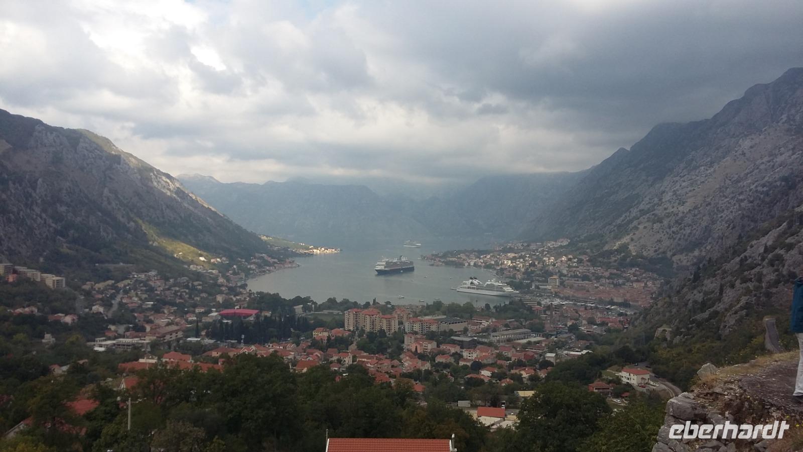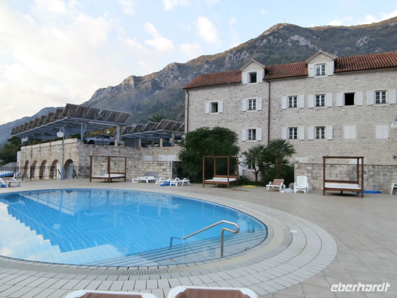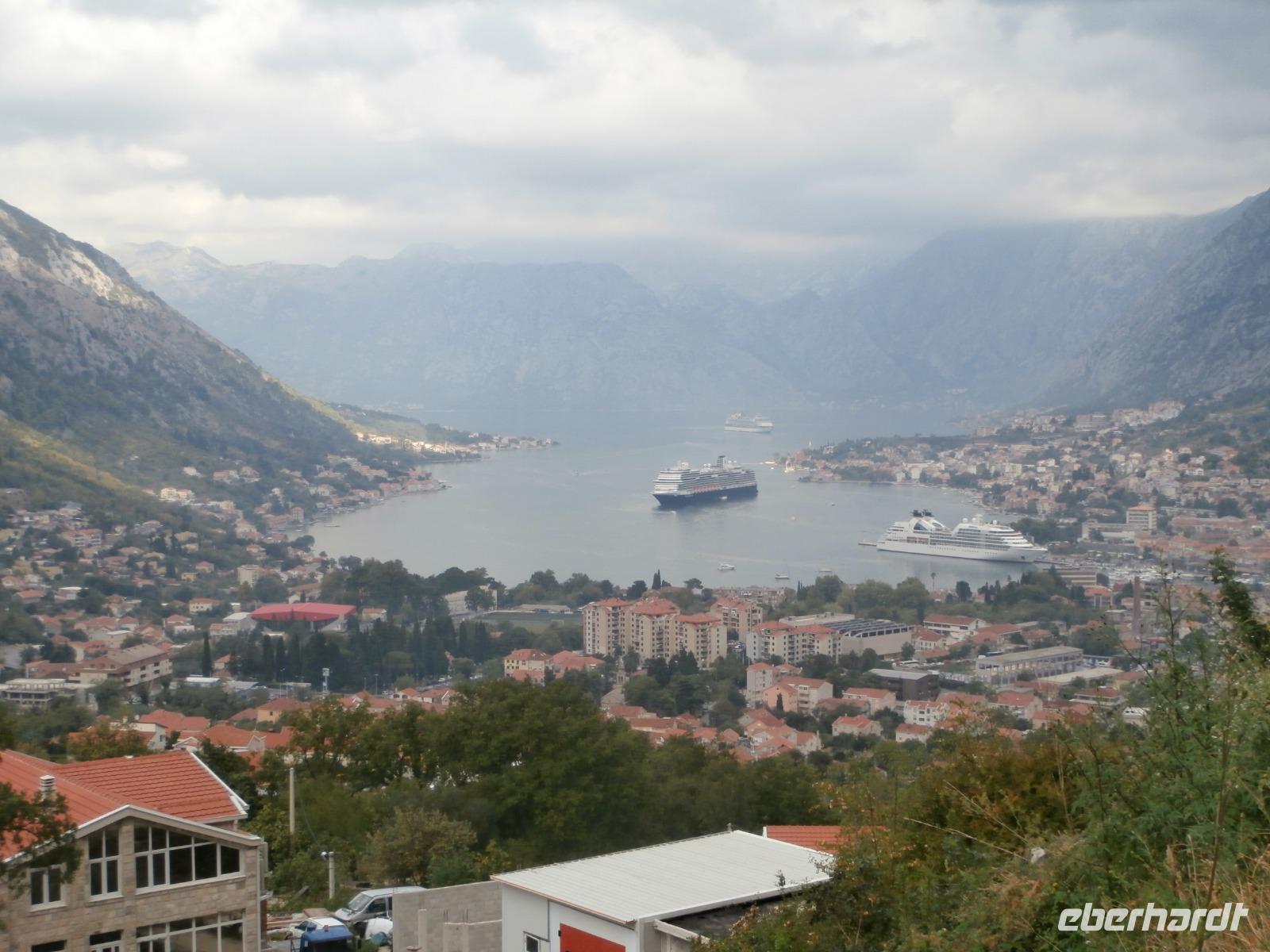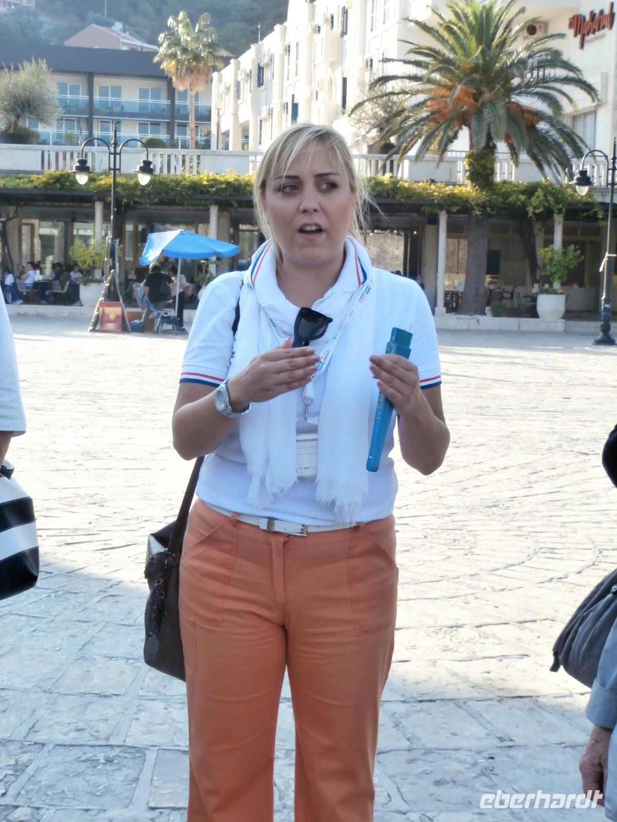 Wir können ab 07.30 Uhr frühstücken - lecker und reichlich ist es. 3 Kreuzfahrtschiffe fahren am Morgen in die Bucht von Kotor ein. 08:30 Uhr ist Start zum Tagesausflug mit Besuch von Kotor, Njegusi und Cetinje. Wir fahren am Morgen zuerst hinein nach Kotor und treffen uns am Eingang zur Stadt mit Rosanda zur Führung. Kotor, der Haupthafen des serbischen Königreichs, ist ein touristisches Highlight und gehört zum Weltkulturerbe. Der Ort war zwischen 1483 und 1687 osmanisch und gehörte ab 1918 zur Donaumo-narchie.1979 zerstörte ein großes Erdbeben die Stadt. Der Wiederaufbau gelang durch finanzielle Mittel der UNESCO. Durch ein mächtiges Tor in der Stadtmauer, das Löwentor, gelangen wir auf den zentralen Platz der Altstadt. Die historischen Gebäude zeugen von mittelalterlicher Architektur und handwerklicher Kunstfertigkeit. Unsere Führung endet am Hauptplatz, mit Blick auf den alten Hafen und die dazugehörige Festung spazieren wir zum Bus zurück. Dario fährt mit seinem Mercedes Bus sicher über einen Haarnadelpass mit 25 Spitzkehren hinauf nach Njegusi. Wir sind begeistert, er ist ein begnadeter Buschauffeur, mit großer Hochachtung sitzen wir hinter ihm auf dieser Fahrt hinauf auf fast 1000m ü Ms. Der Blick auf die Bucht von Kotor bei unserem Fotostopp ist atemberaubend. Der Regen, den wir kurz in Kotor hatten, ist auch weggezogen. Im traditionellen Gasthaus auf 960 m Höhe im kleinen Ort Njegusi erwartet uns ein landestypischer Imbiss. Der berühmte, selbstgemachte Schinken, Käse und Rotwein wird mit Brot serviert. Eine Gaststätte darf den Namen "traditionell" führen, wenn landestypische, selbstgefertigte Erzeugnisse und Speisen angeboten werden, die mittels traditioneller Hilfsmittel hergestellt sind. Der Imbiss ist lecker, das Angebot, Schinken und Käse einzukaufen, wird rege genutzt. Nach einem kurzen Spaziergang im Ort, setzen wir unsere Fahrt auf neugebauter Straße im Gebirge fort. Nach ca. einer halben Stunde bergab erreichen wir Cetinje, die ehemalige Hauptstadt des Königreiches Montenegro. Gemeinsam spazieren wir zum Nikola-Palast, wo wir in deutscher Sprache eine wunderbare Führung erleben. Eine sehr sehenswerte und wertvolle Sammlung - wir sind beeindruckt - ein Erlebnis! Im Ort sehen wir uns auch im Kloster, mit der Ikone Mutter Gottes aus Philamos, um und am Nationalmuseum kommen wir auch vorbei. 16:00 Uhr haben wir dann die Rückfahrt übers Gebirge vorbei an Budva, zuvor noch mit Fotostopp oberhalb von Budva. Bis zum Abendessen bleibt noch Zeit für den angenehmen Aufenthalt in der Hotelanlage, einige Reisegäste gehen schwimmen.