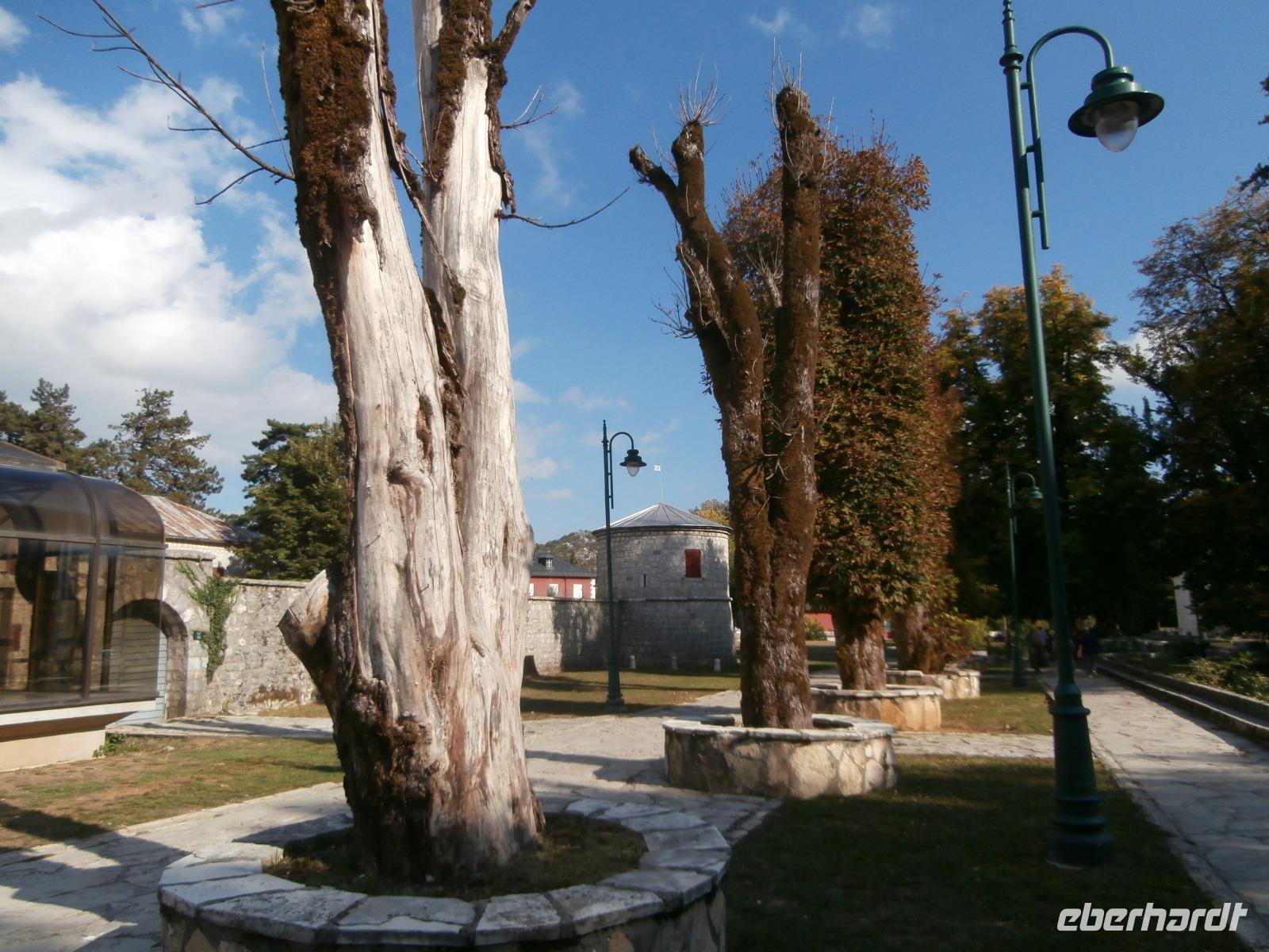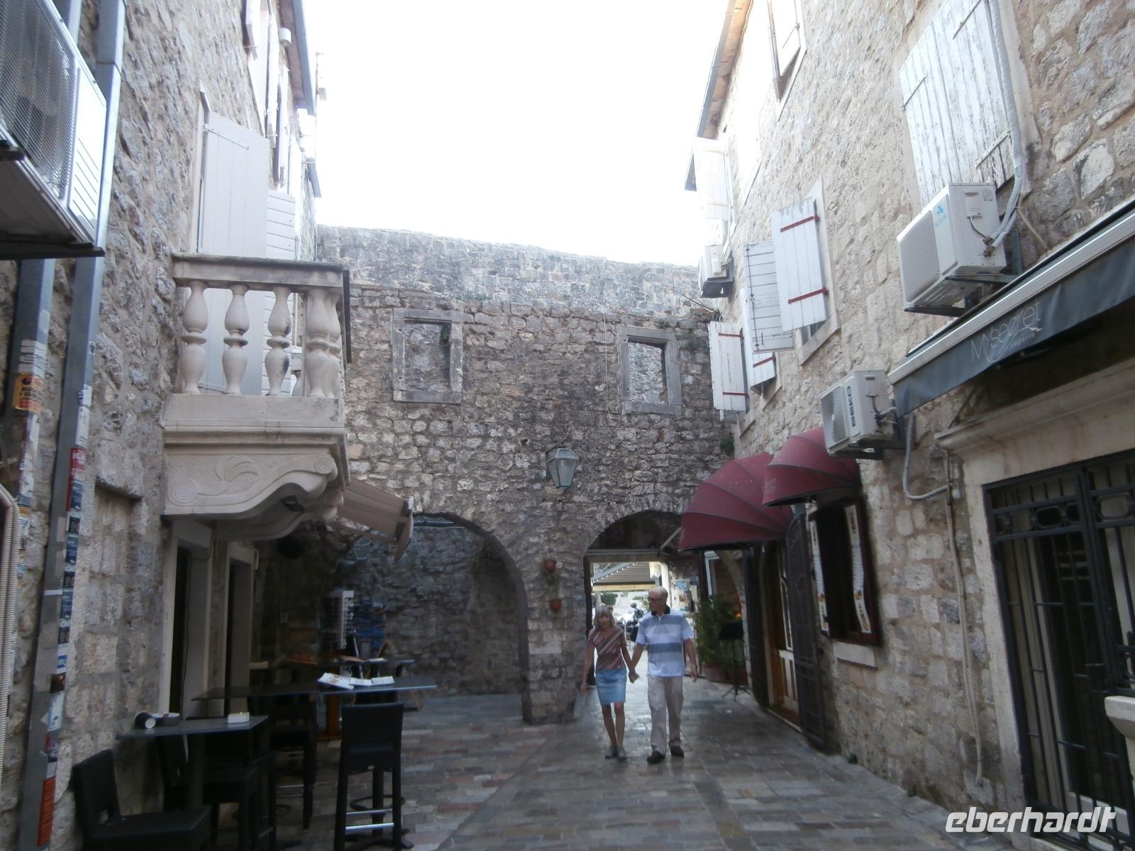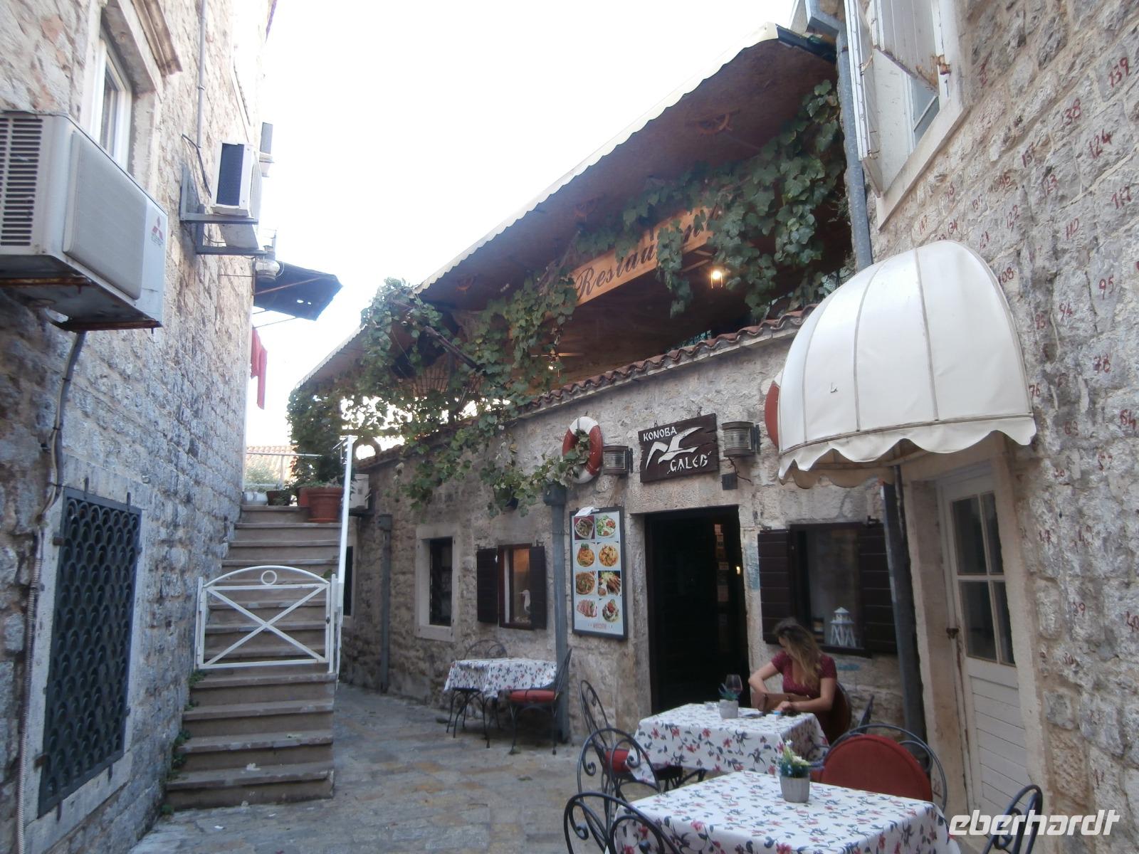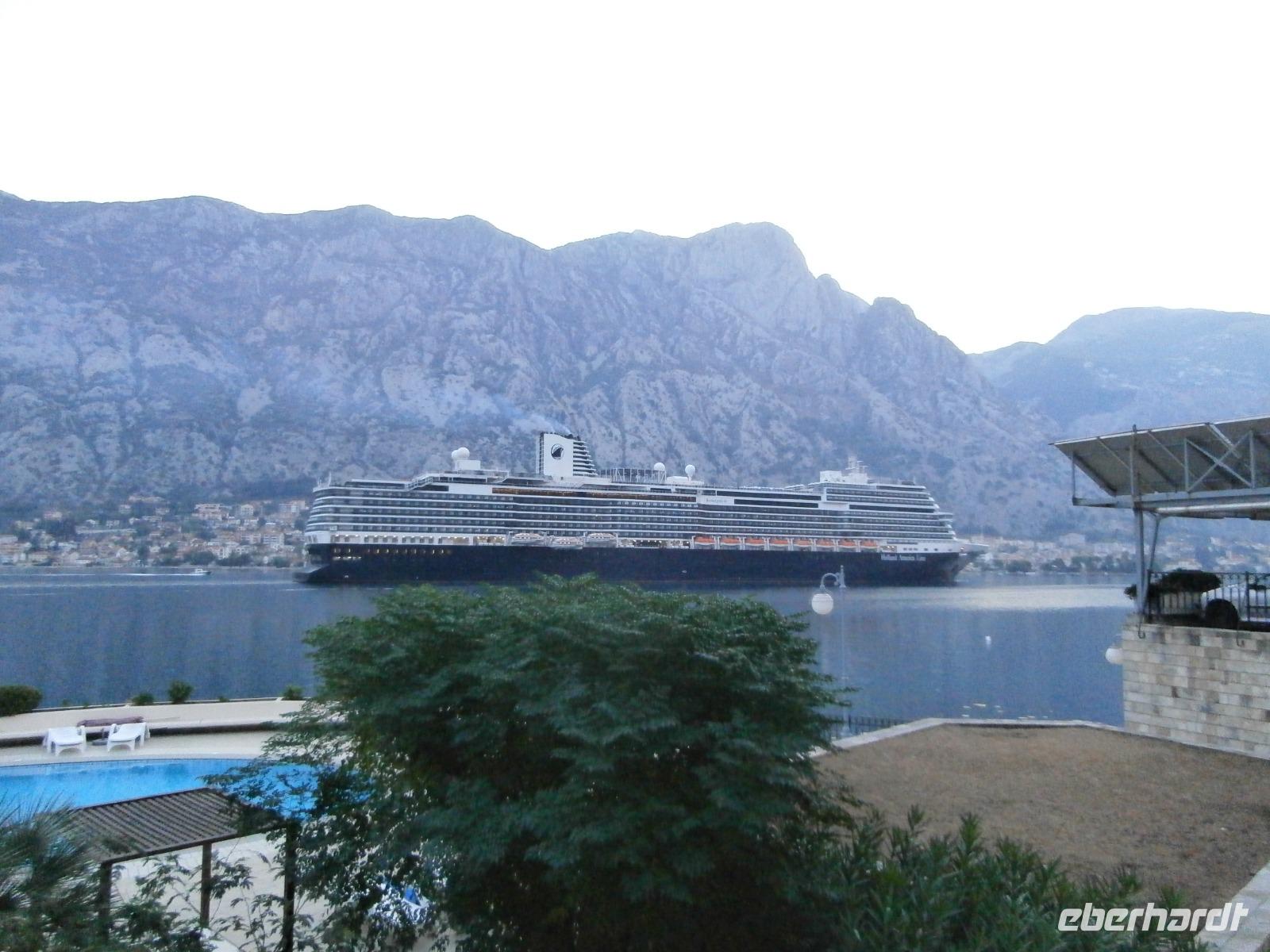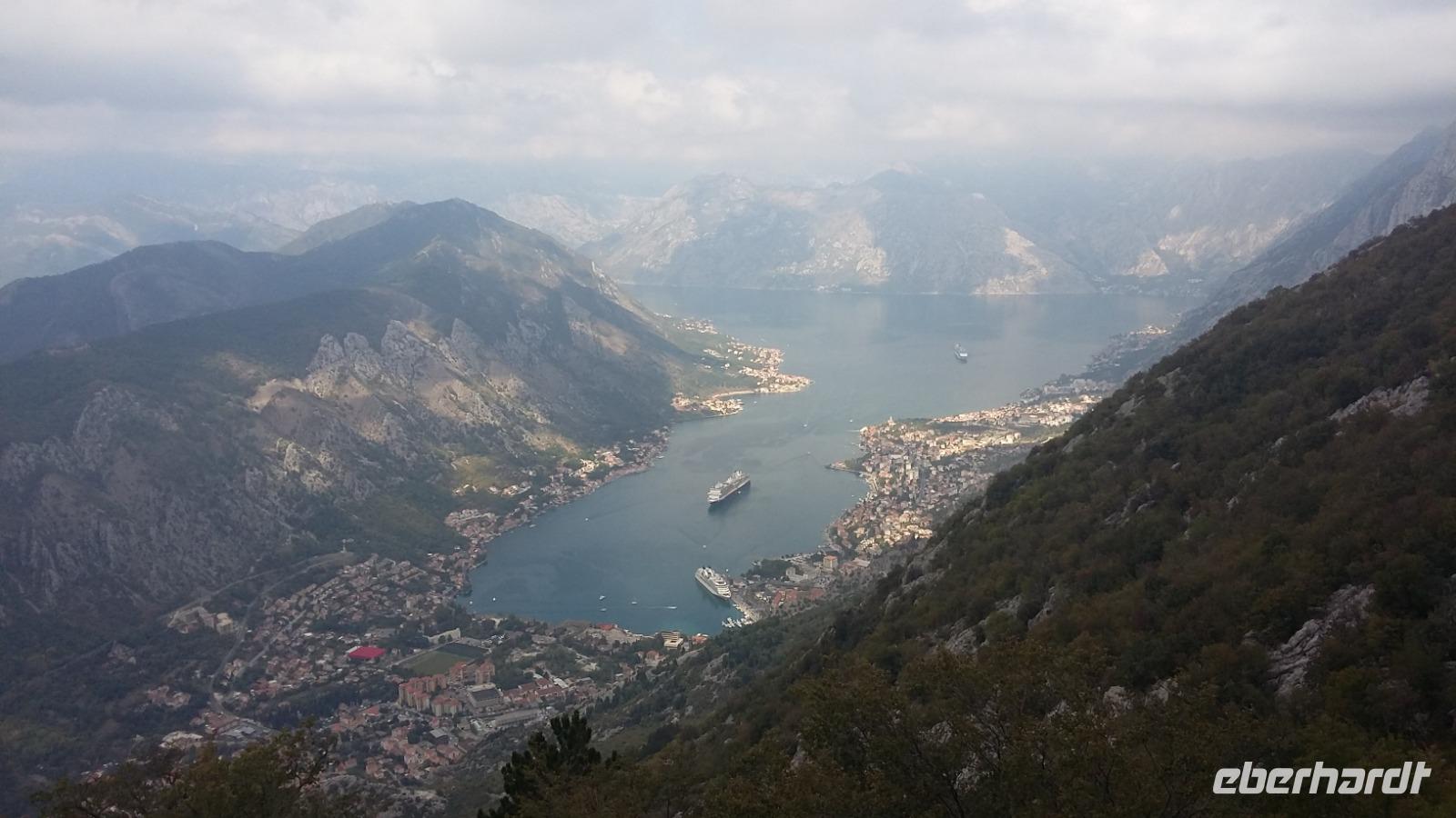 Wir können ab 07.30 Uhr frühstücken - lecker und reichlich ist es. 3 Kreuzfahrtschiffe fahren am Morgen in die Bucht von Kotor ein. 08:30 Uhr ist Start zum Tagesausflug mit Besuch von Kotor, Njegusi und Cetinje. Wir fahren am Morgen zuerst hinein nach Kotor und treffen uns am Eingang zur Stadt mit Rosanda zur Führung. Kotor, der Haupthafen des serbischen Königreichs, ist ein touristisches Highlight und gehört zum Weltkulturerbe. Der Ort war zwischen 1483 und 1687 osmanisch und gehörte ab 1918 zur Donaumo-narchie.1979 zerstörte ein großes Erdbeben die Stadt. Der Wiederaufbau gelang durch finanzielle Mittel der UNESCO. Durch ein mächtiges Tor in der Stadtmauer, das Löwentor, gelangen wir auf den zentralen Platz der Altstadt. Die historischen Gebäude zeugen von mittelalterlicher Architektur und handwerklicher Kunstfertigkeit. Unsere Führung endet am Hauptplatz, mit Blick auf den alten Hafen und die dazugehörige Festung spazieren wir zum Bus zurück. Dario fährt mit seinem Mercedes Bus sicher über einen Haarnadelpass mit 25 Spitzkehren hinauf nach Njegusi. Wir sind begeistert, er ist ein begnadeter Buschauffeur, mit großer Hochachtung sitzen wir hinter ihm auf dieser Fahrt hinauf auf fast 1000m ü Ms. Der Blick auf die Bucht von Kotor bei unserem Fotostopp ist atemberaubend. Der Regen, den wir kurz in Kotor hatten, ist auch weggezogen. Im traditionellen Gasthaus auf 960 m Höhe im kleinen Ort Njegusi erwartet uns ein landestypischer Imbiss. Der berühmte, selbstgemachte Schinken, Käse und Rotwein wird mit Brot serviert. Eine Gaststätte darf den Namen "traditionell" führen, wenn landestypische, selbstgefertigte Erzeugnisse und Speisen angeboten werden, die mittels traditioneller Hilfsmittel hergestellt sind. Der Imbiss ist lecker, das Angebot, Schinken und Käse einzukaufen, wird rege genutzt. Nach einem kurzen Spaziergang im Ort, setzen wir unsere Fahrt auf neugebauter Straße im Gebirge fort. Nach ca. einer halben Stunde bergab erreichen wir Cetinje, die ehemalige Hauptstadt des Königreiches Montenegro. Gemeinsam spazieren wir zum Nikola-Palast, wo wir in deutscher Sprache eine wunderbare Führung erleben. Eine sehr sehenswerte und wertvolle Sammlung - wir sind beeindruckt - ein Erlebnis! Im Ort sehen wir uns auch im Kloster, mit der Ikone Mutter Gottes aus Philamos, um und am Nationalmuseum kommen wir auch vorbei. 16:00 Uhr haben wir dann die Rückfahrt übers Gebirge vorbei an Budva, zuvor noch mit Fotostopp oberhalb von Budva. Bis zum Abendessen bleibt noch Zeit für den angenehmen Aufenthalt in der Hotelanlage, einige Reisegäste gehen schwimmen.