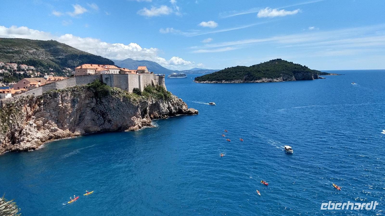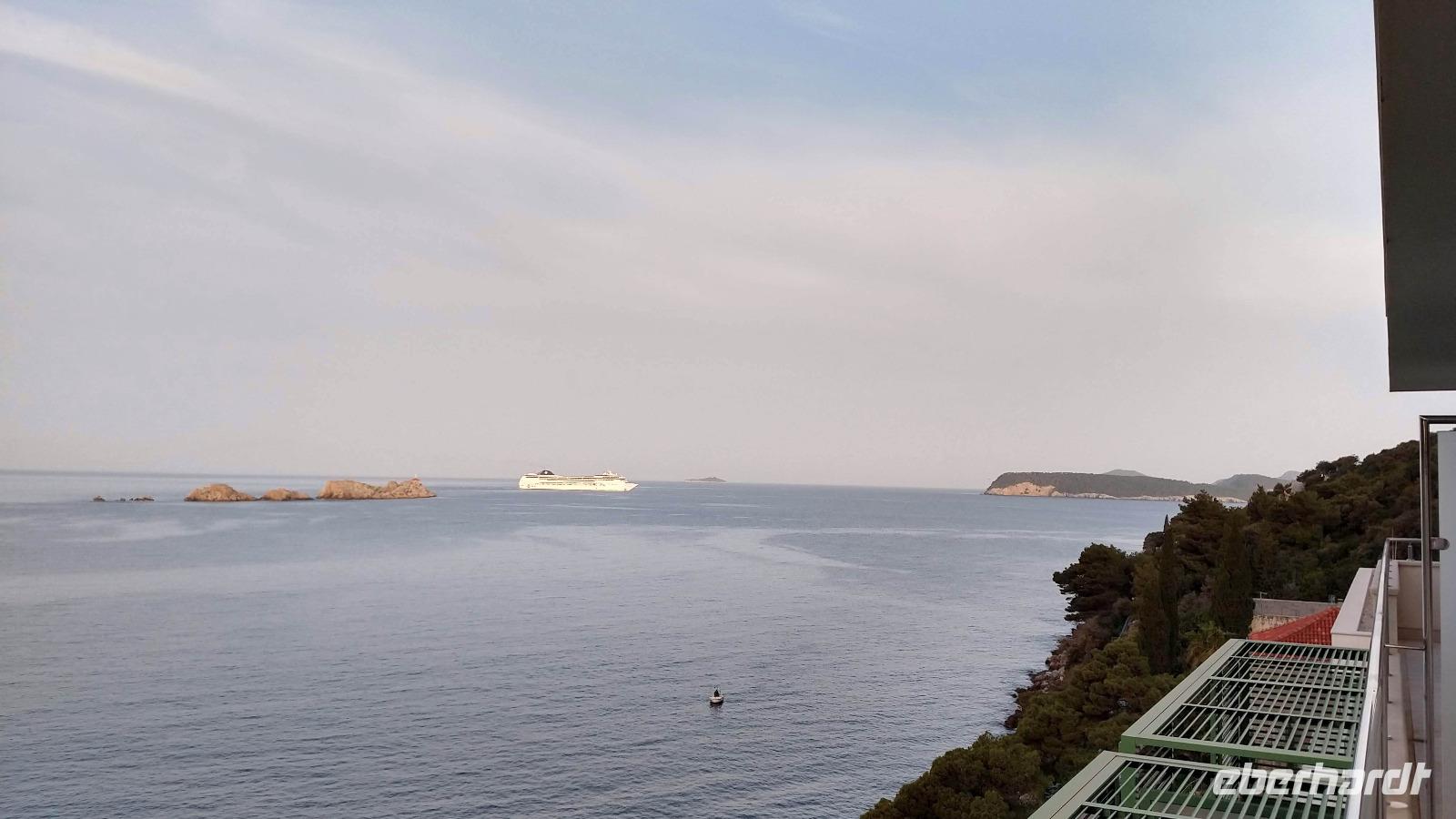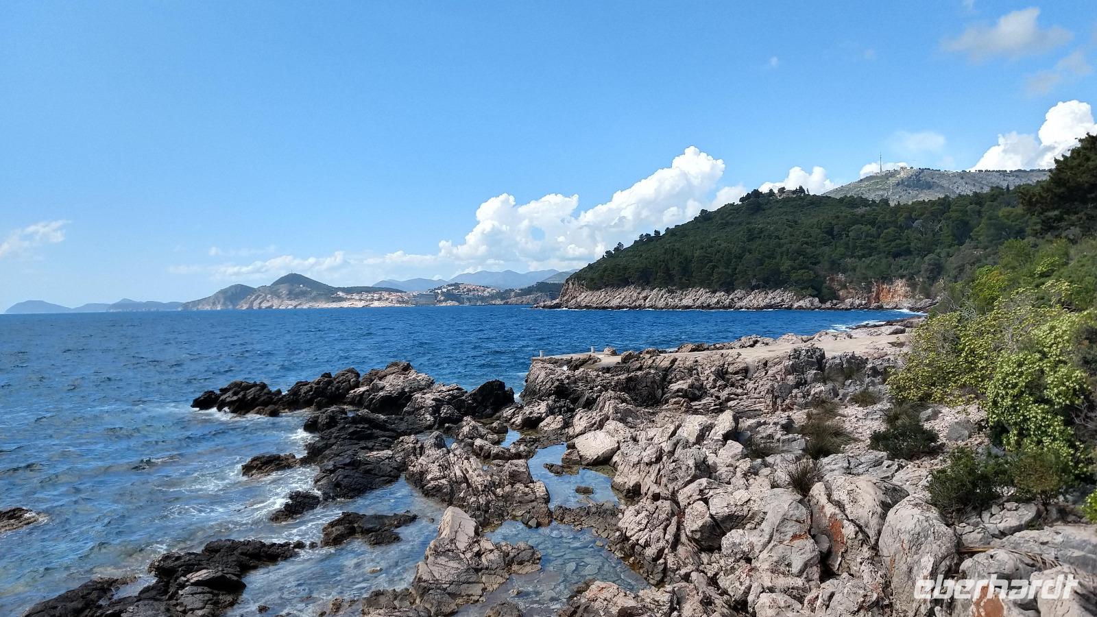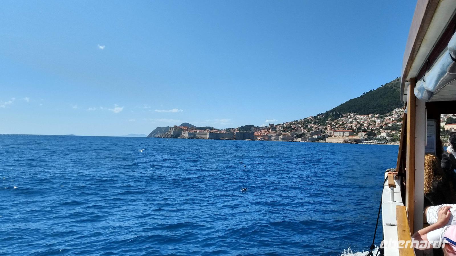 14:15 Uhr erfolgt die Abholung durch den Transferbus. Von der Küstenstraße sehen wir nochmals die Altstadt, die Insel Lokrum und die Landschaft von Kornavle.