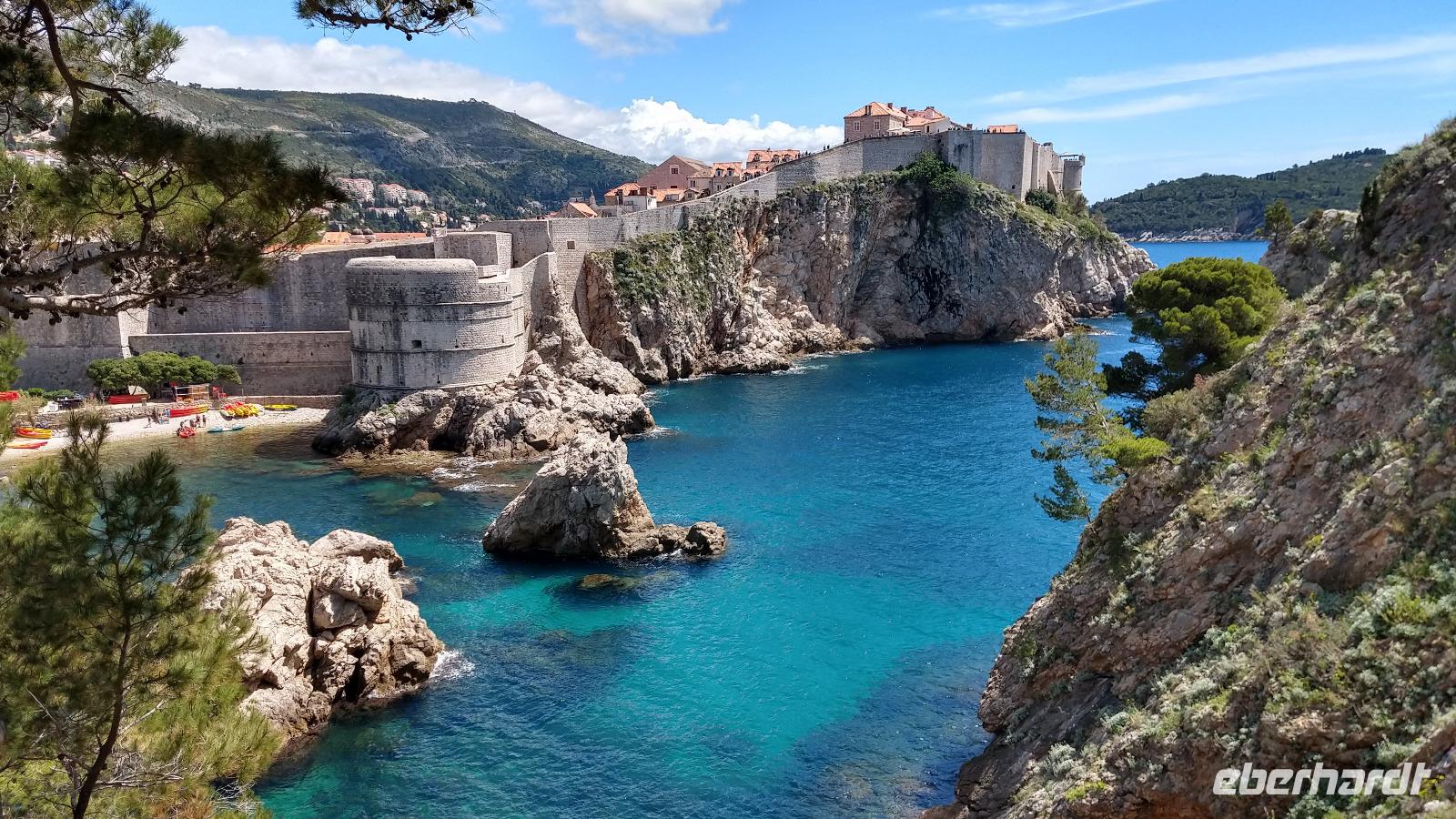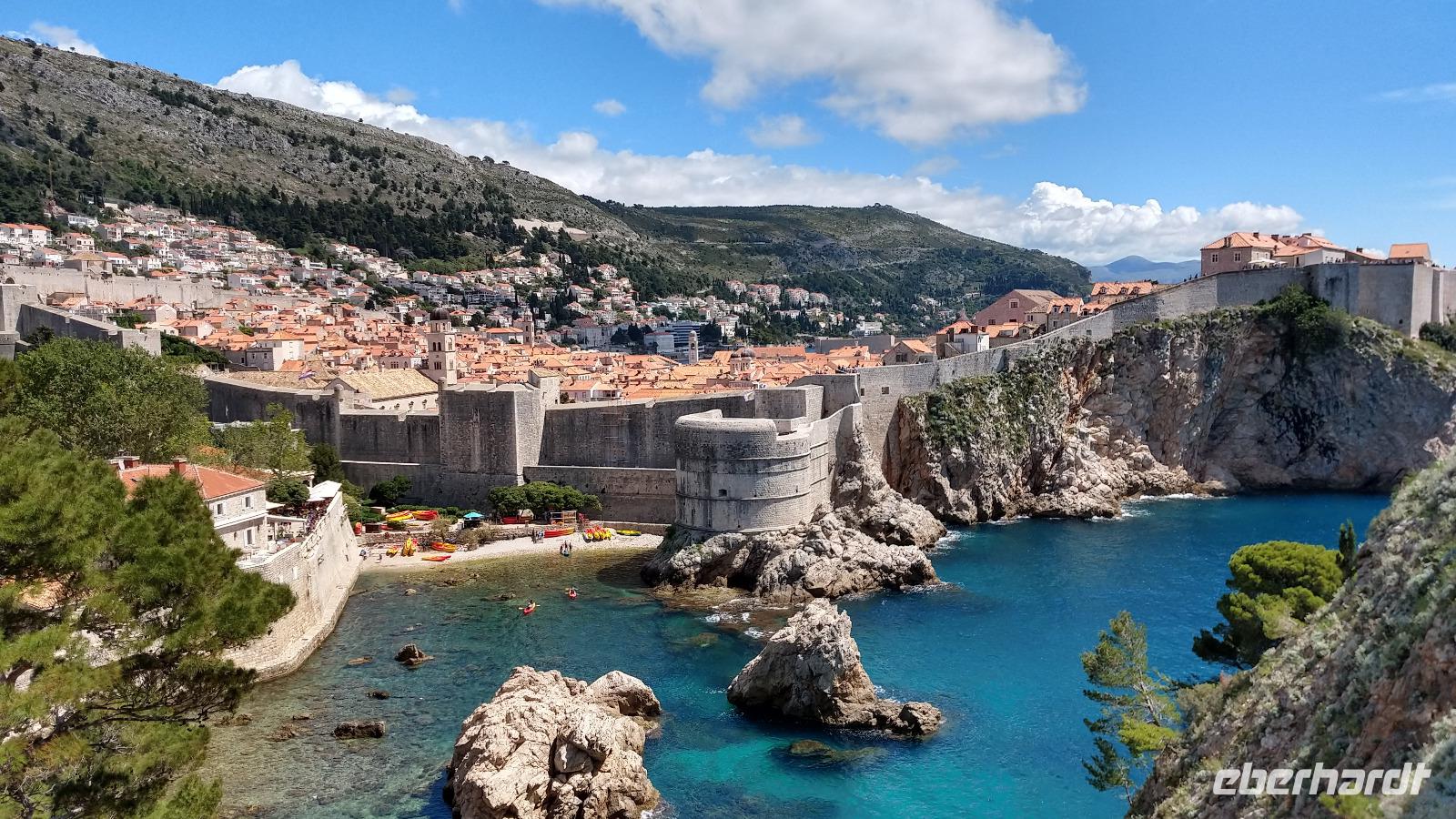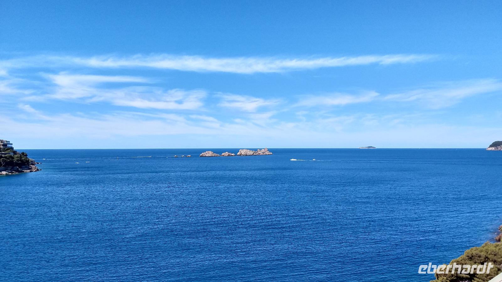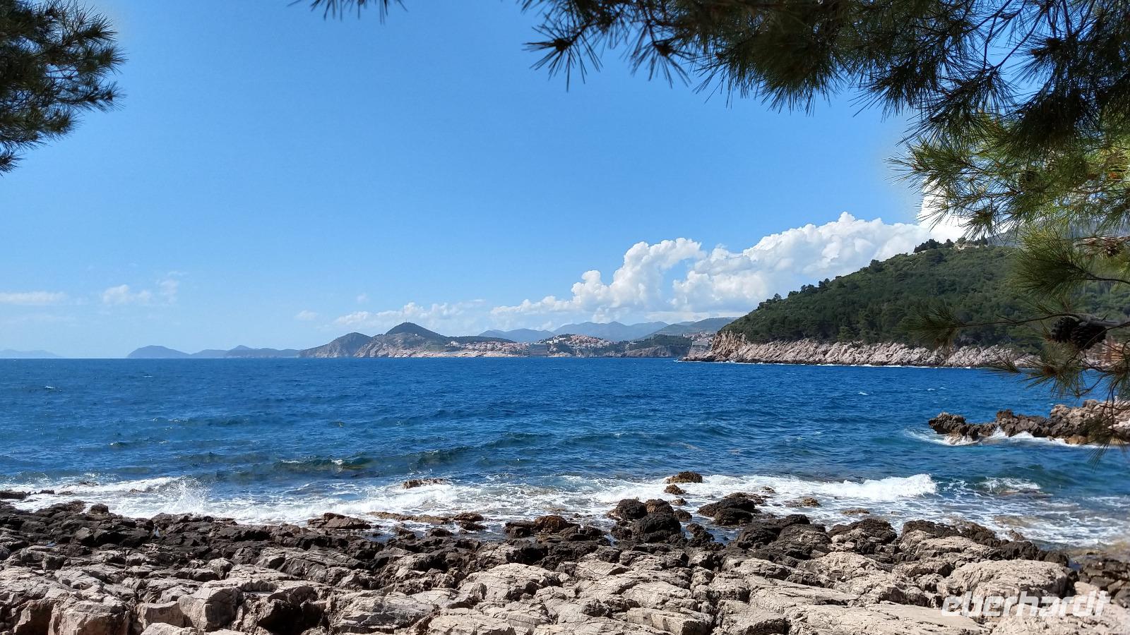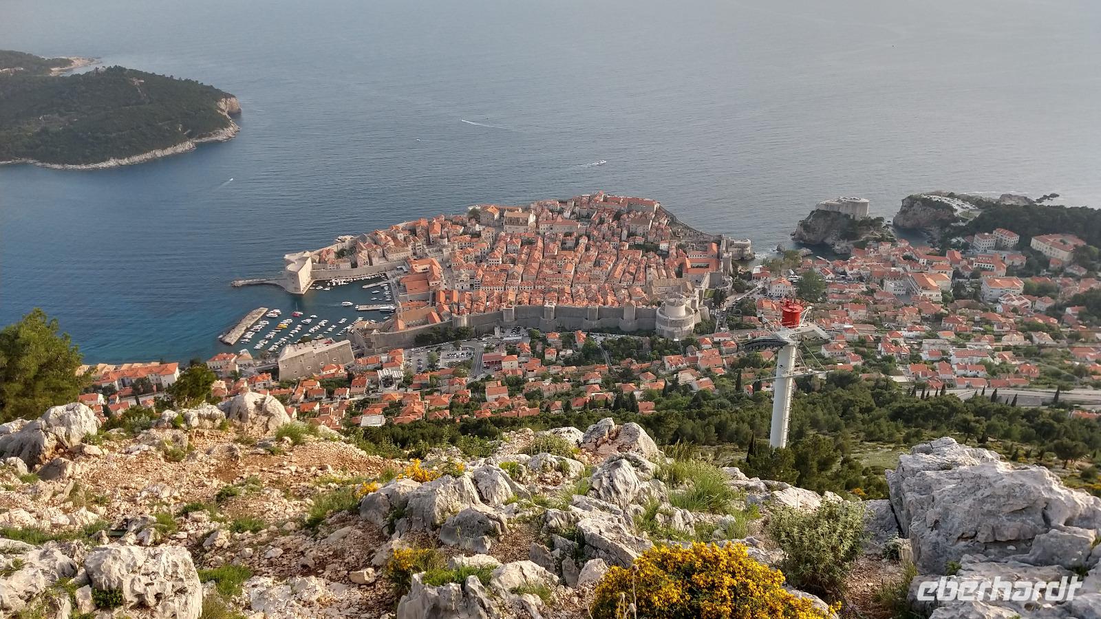 14:15 Uhr erfolgt die Abholung durch den Transferbus. Von der Küstenstraße sehen wir nochmals die Altstadt, die Insel Lokrum und die Landschaft von Kornavle.