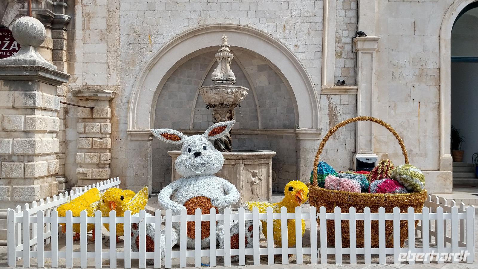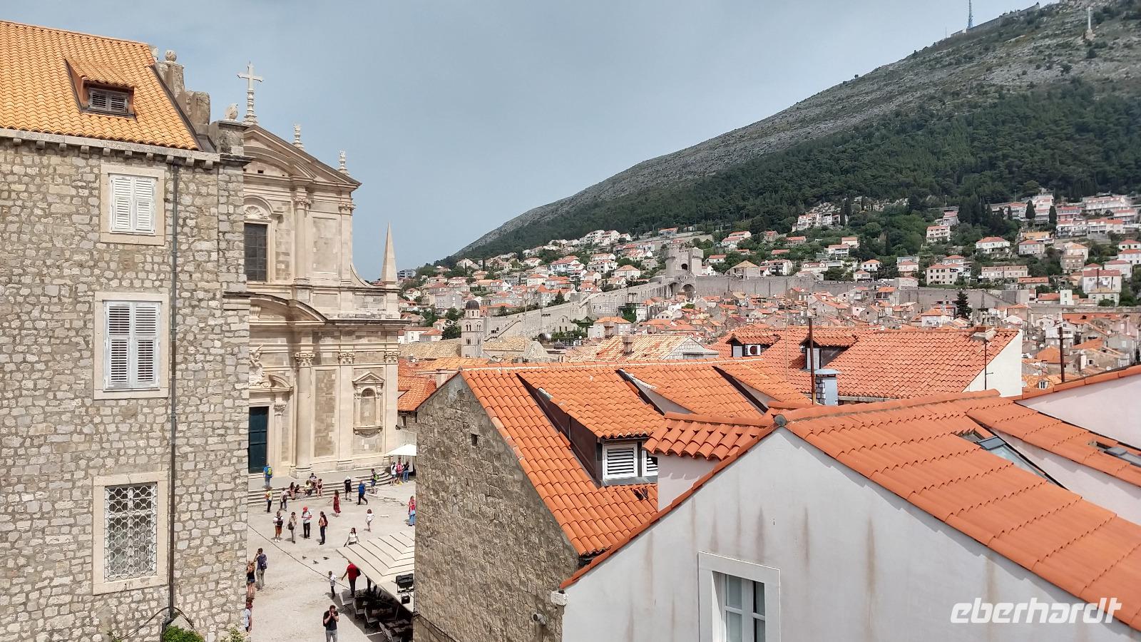 Wir erwachen bei sehr schönem, angenehm warmen Wetter, auch wenn es etwas diesig ist. Nach dem guten Frühstücksbuffet treffen wir uns gemeinsam in der Hotel-Lobby und spazieren über die Uferpromenade an der Lapad-Bucht entlang zur nahen Bushaltestelle. Mit dem Linienbus sind wir schnell am Pileplatz vor der Altstadt.