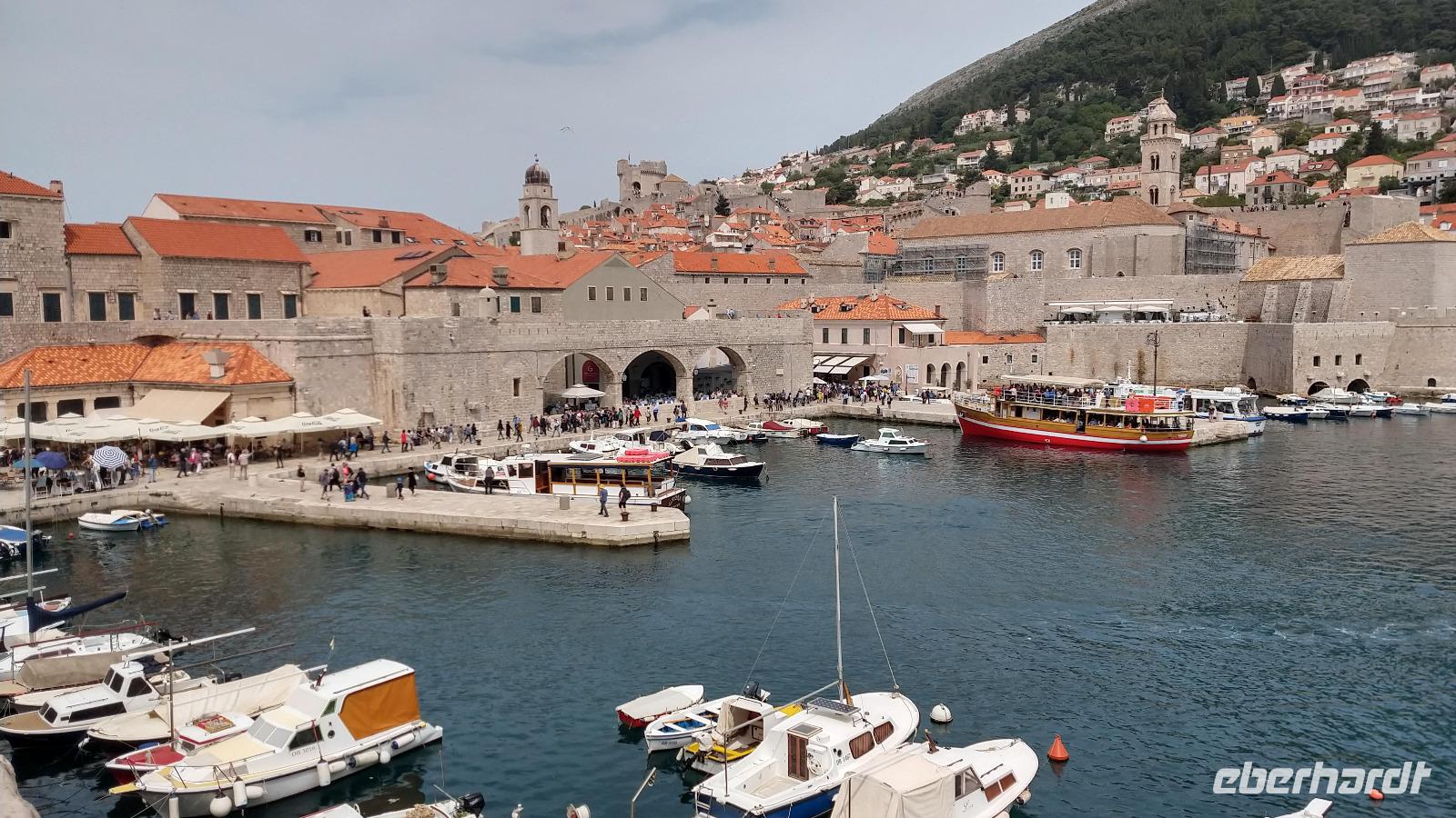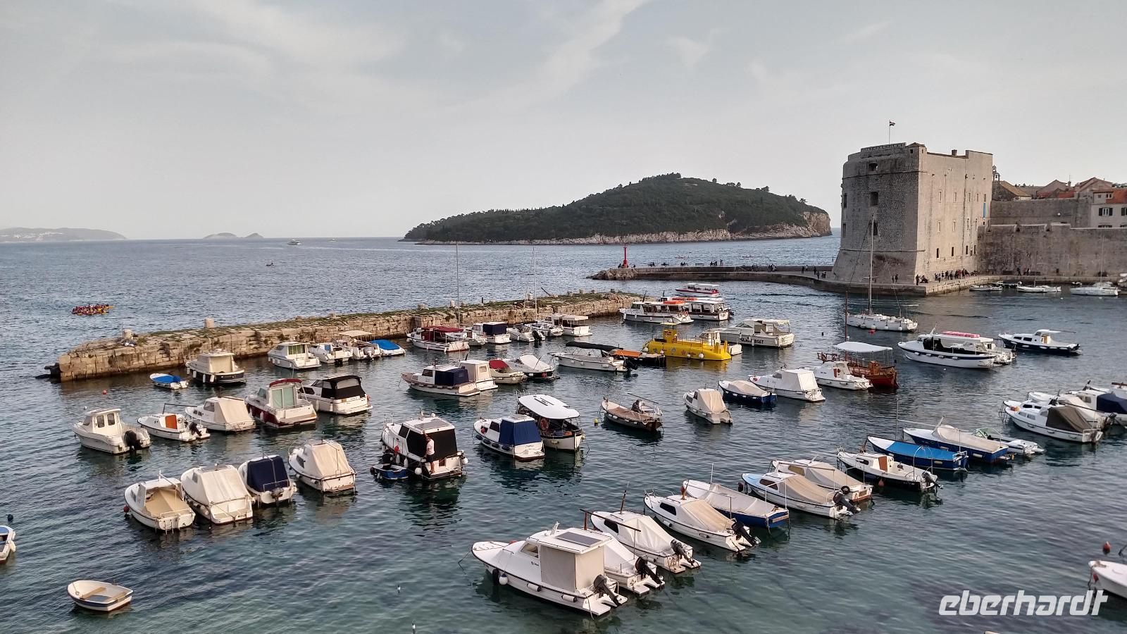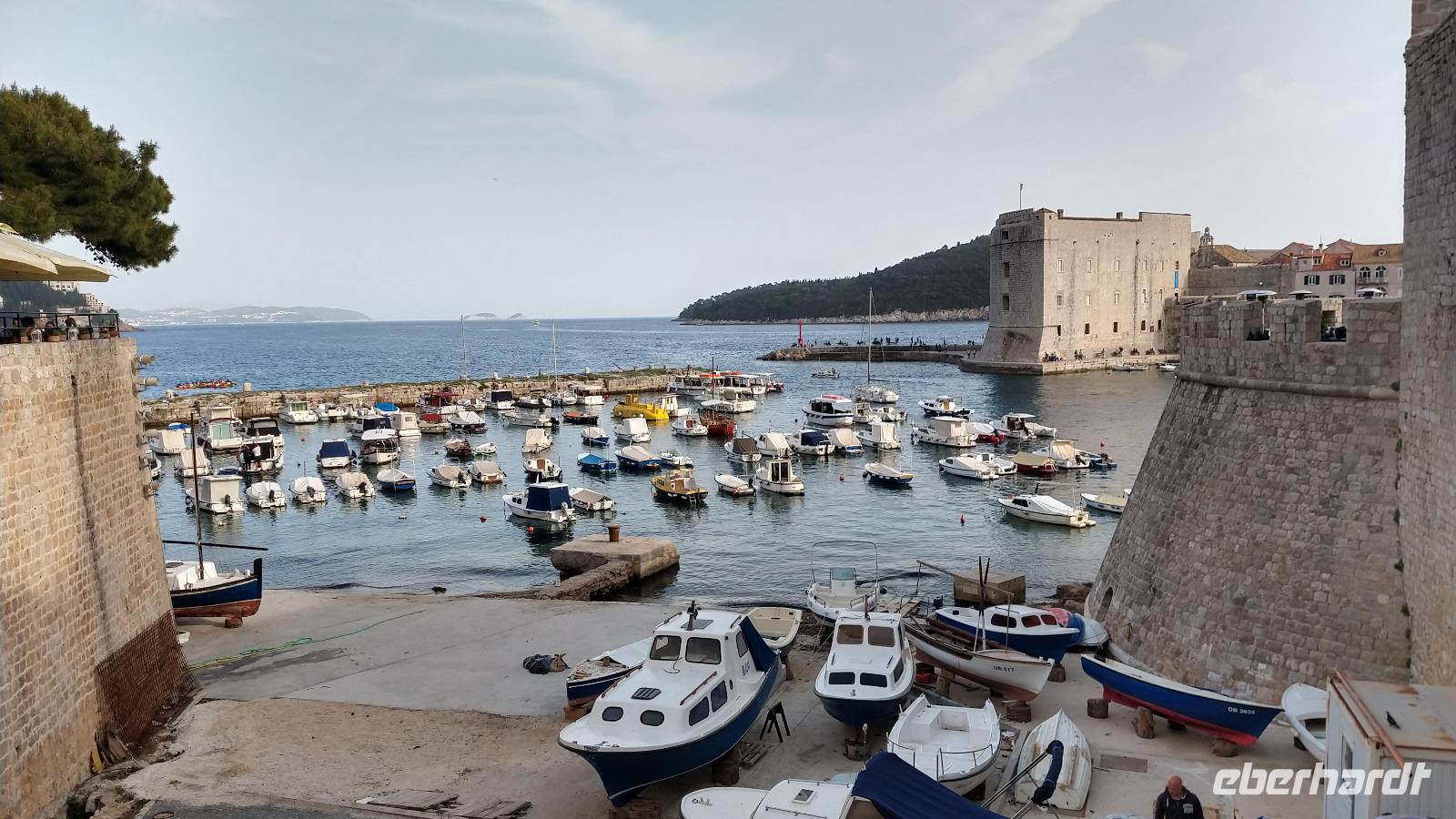 Nach gutem Frühstück treffen wir uns ausgeruht in der Hotel-Lobby und spazieren gemeinsamer zur Uferpromenade und über die Fußgängerzone in Lapad zur Haltestelle des Stadtbusses. Wenig später betreten wir wieder die Altstadt von Dubrovnik durch das Piletor. Heute ist Stadtmarathon für Schülergruppen aus aller Welt auf dem Stradun. Wir laufen deshalb durch die Nebengassen Stradun zum Altstadthafen.