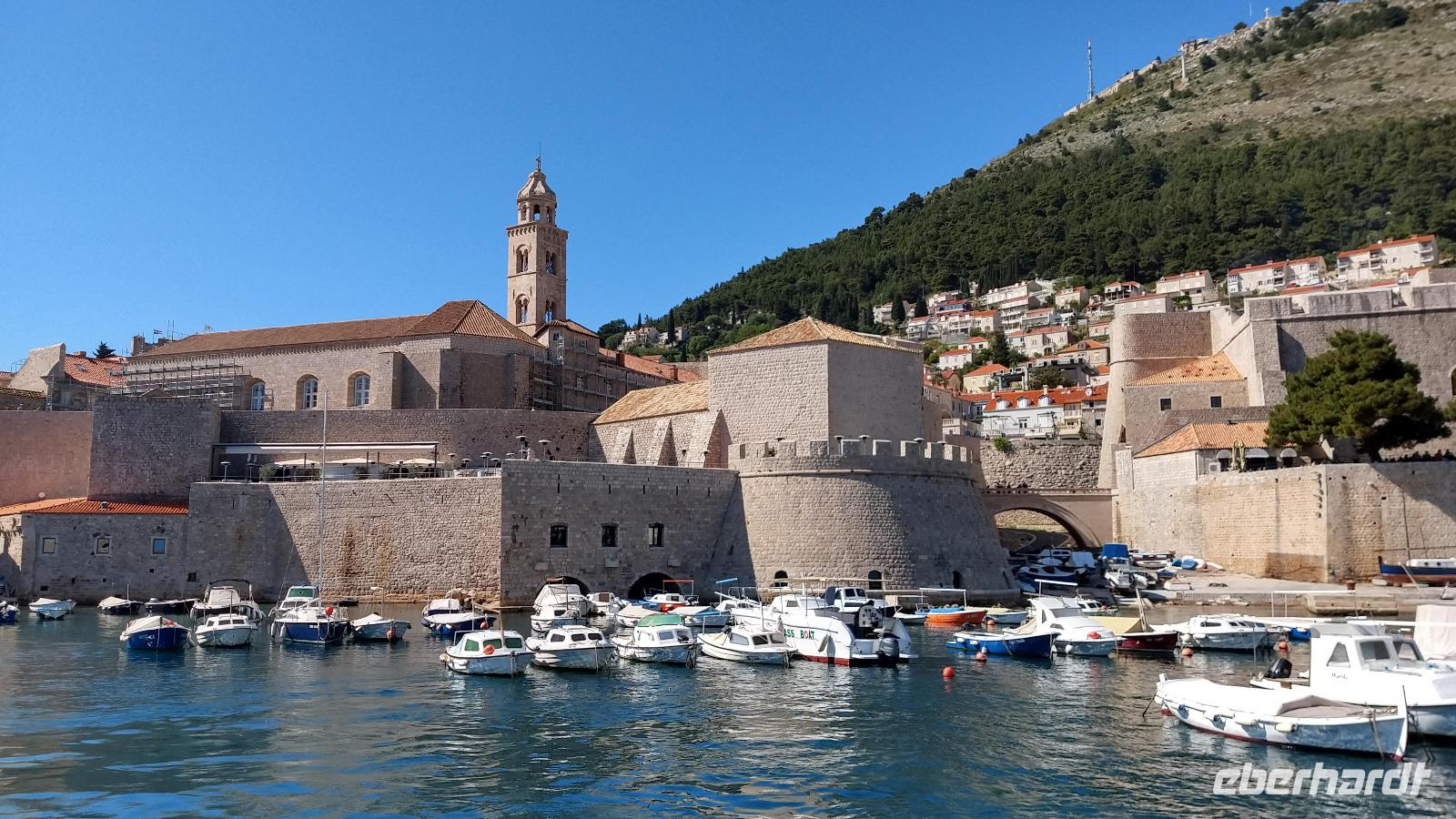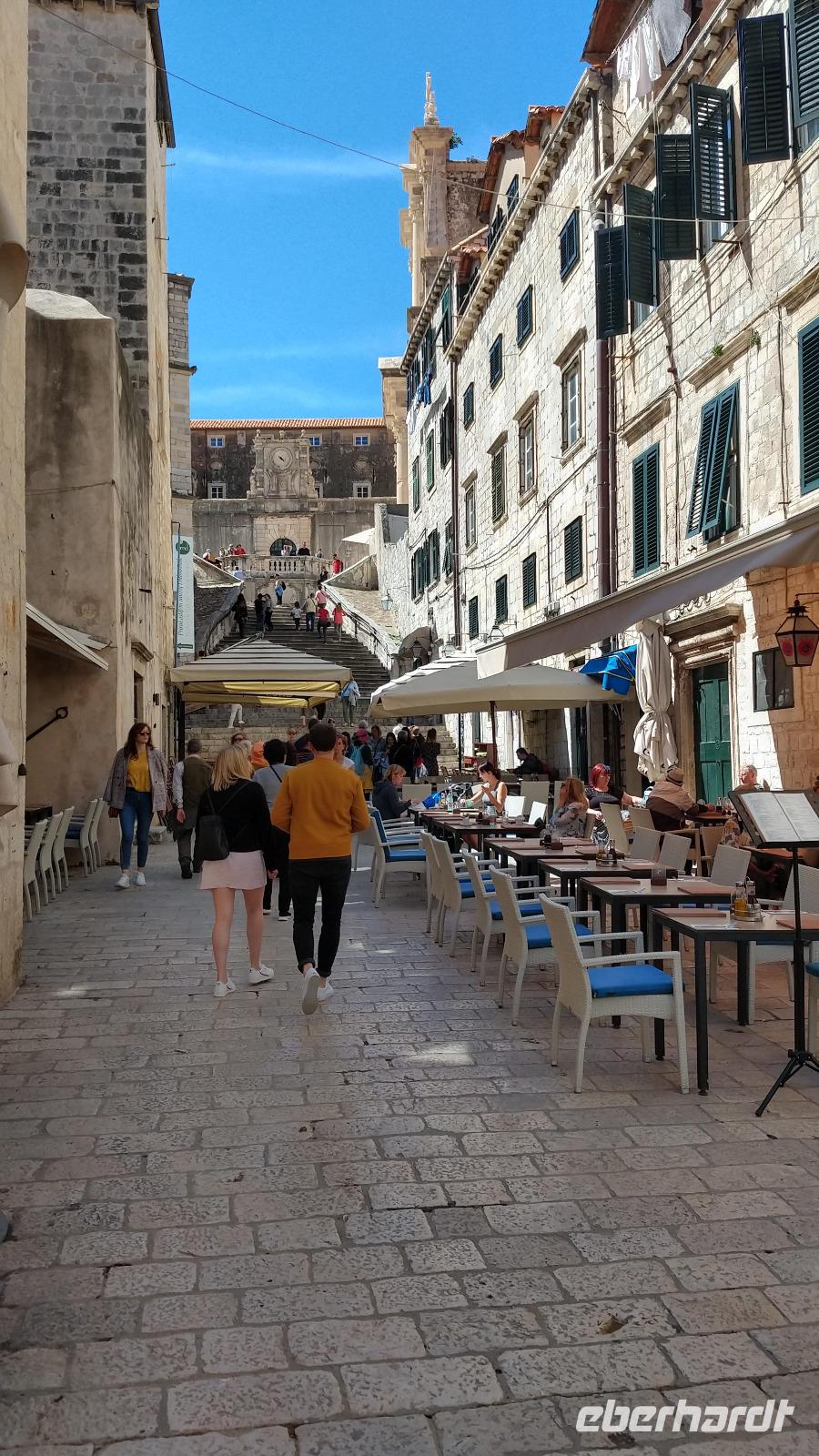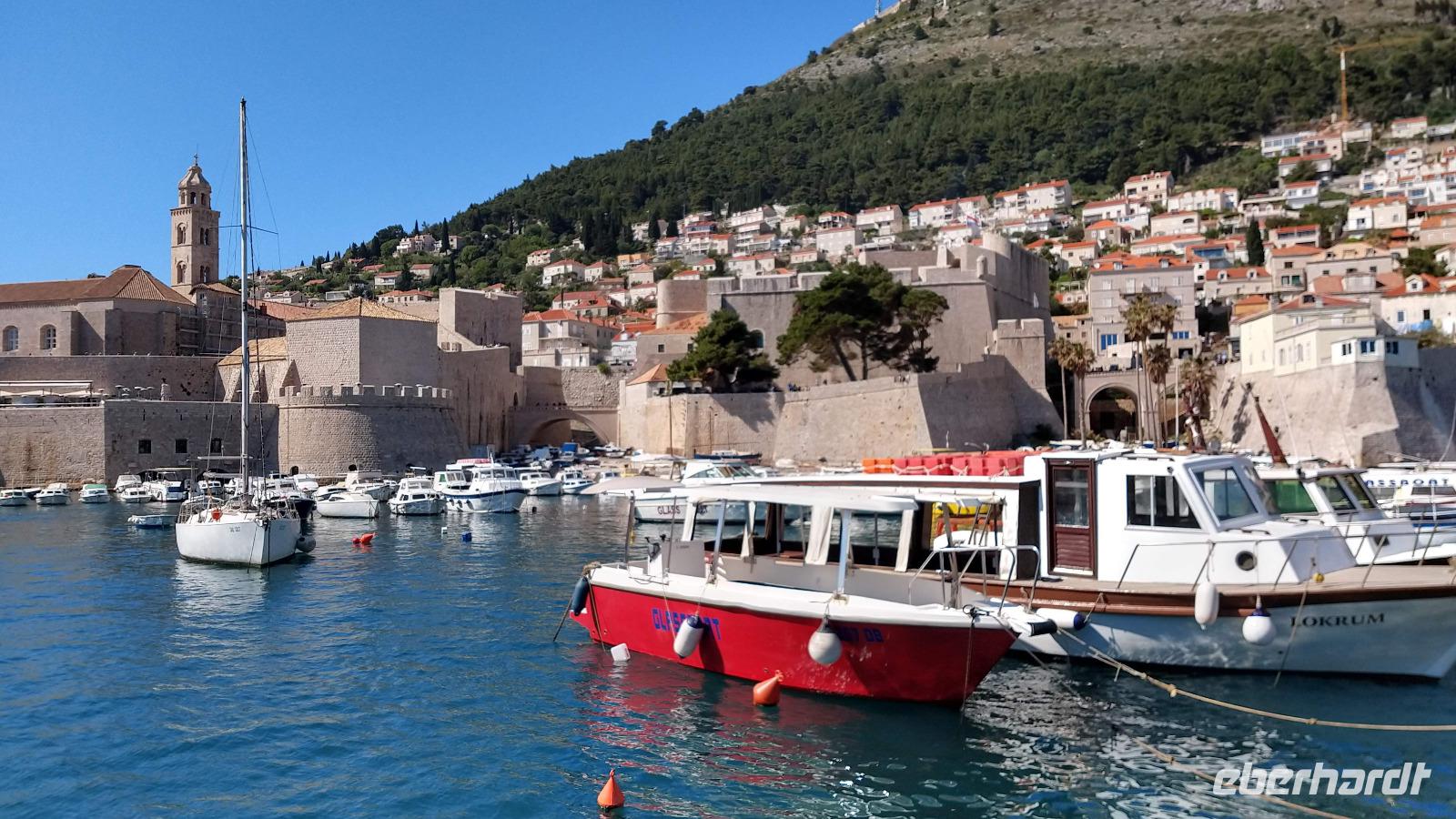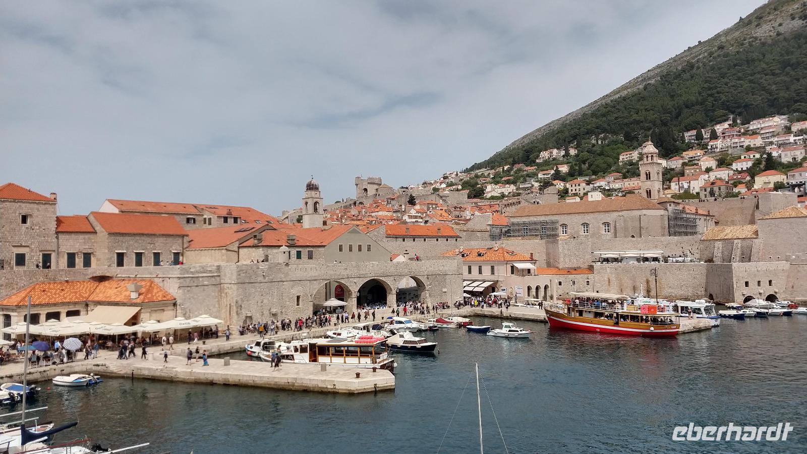 Nach gutem Frühstück treffen wir uns ausgeruht in der Hotel-Lobby und spazieren gemeinsamer zur Uferpromenade und über die Fußgängerzone in Lapad zur Haltestelle des Stadtbusses. Wenig später betreten wir wieder die Altstadt von Dubrovnik durch das Piletor. Heute ist Stadtmarathon für Schülergruppen aus aller Welt auf dem Stradun. Wir laufen deshalb durch die Nebengassen Stradun zum Altstadthafen.