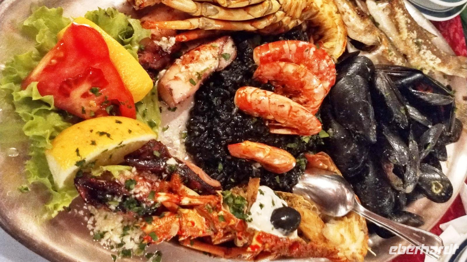 Hier erwartet uns ein sehr gutes Abendessen - eine gemischte Fischplatte mit Hummer, Shrimps, Muscheln, Oktopus und Barschfilet - vorher noch eine Fischsuppe und zum Abschluss ein Karamell-Pudding. Satt und zufrieden