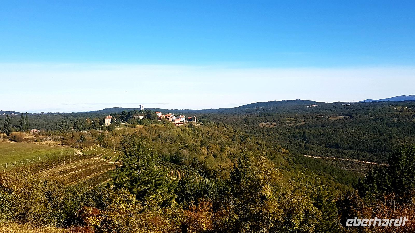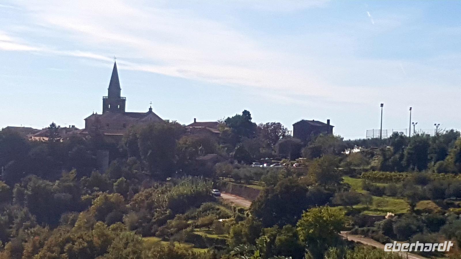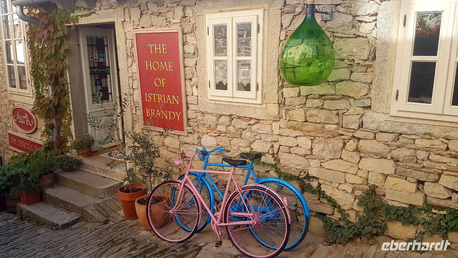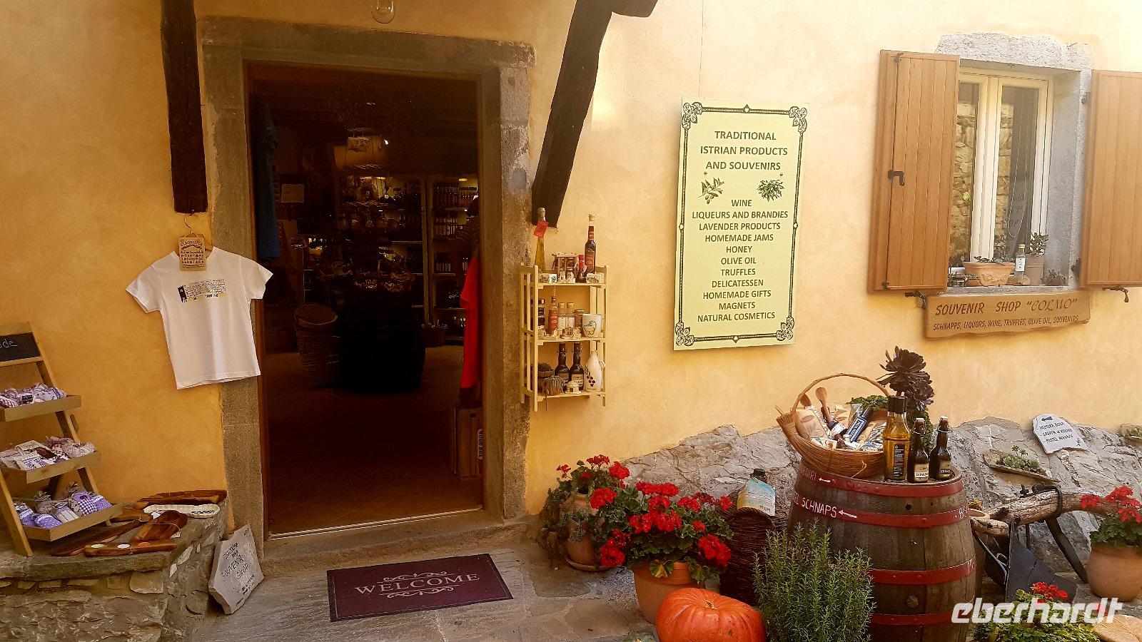 Weiter geht es in Richtung Hum, der kleinsten „Stadt" mit 30 Einwohnern. Dort angekommen wartet schon unser Busfahrer Rino mit einem Mistel Schnaps auf uns. Den haben wir uns redlich nach 12 km Wanderung verdient. Im Ort schauen wir uns um und kaufen gleich die ersten Mitbringsel für die Daheimgebliebenen. Trüffelpaste und verschiedene Schnaps- und Weinsorten sind dabei. Beschaulich geht es hier zu.