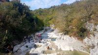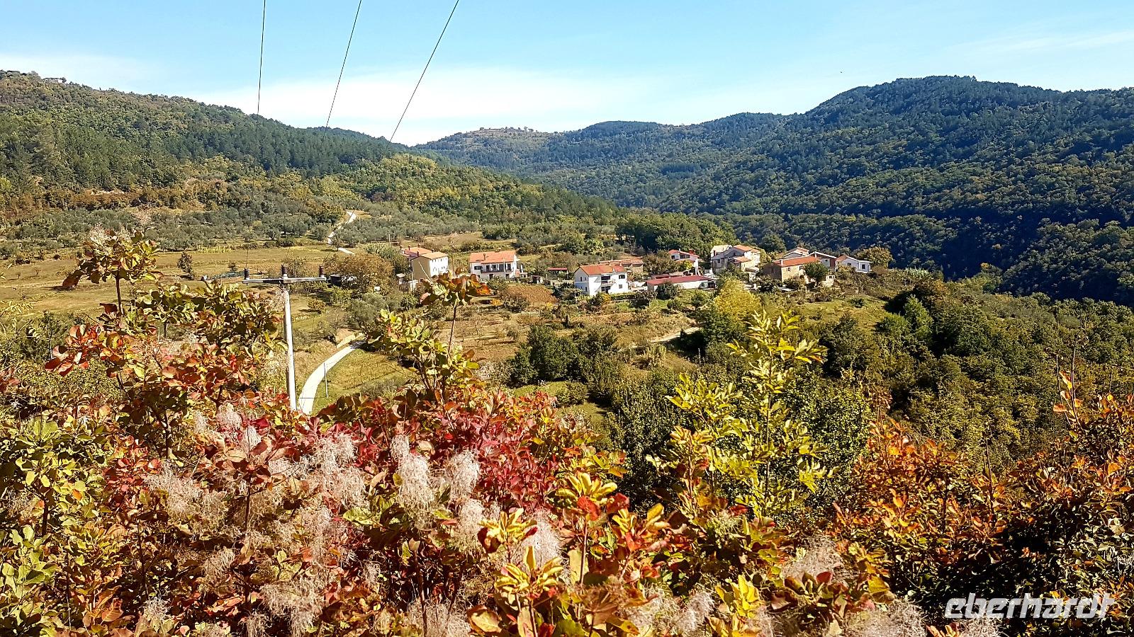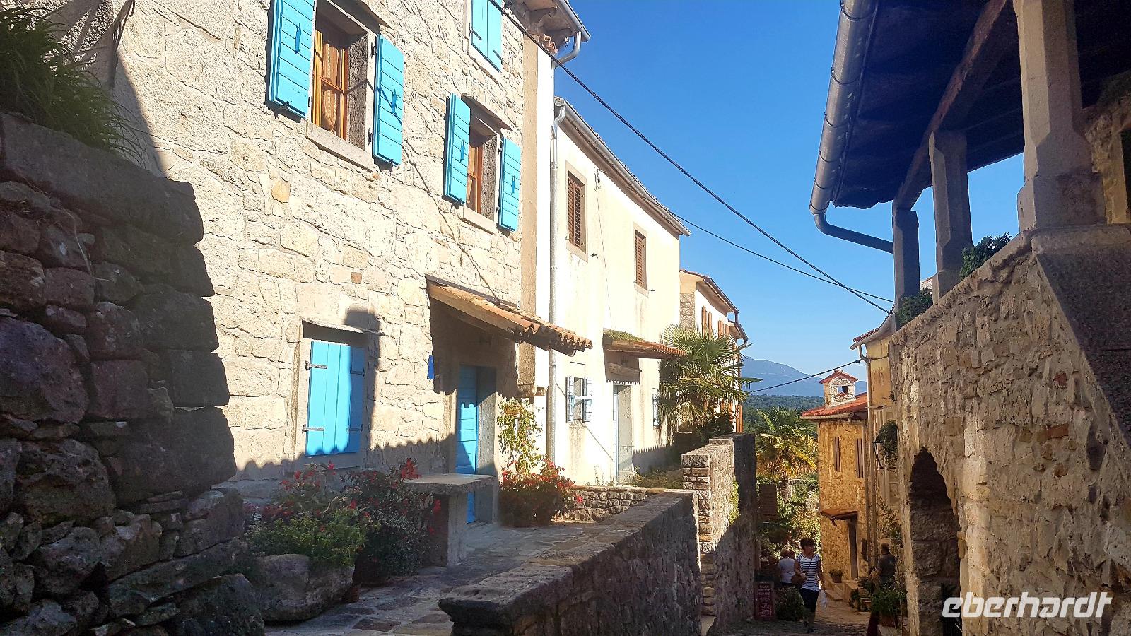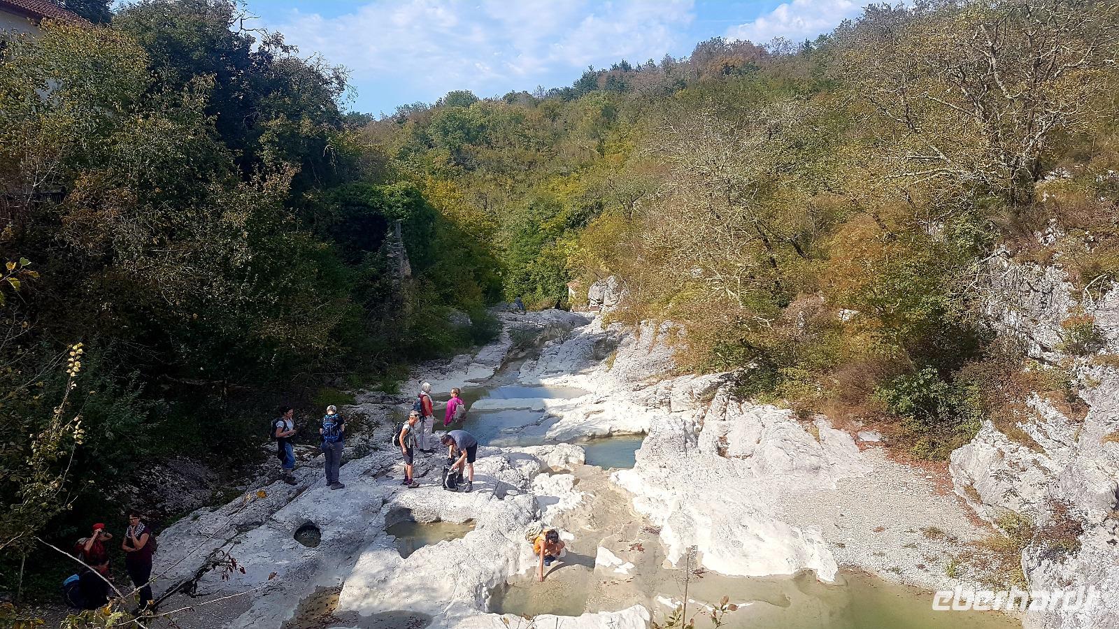 Dann geht es an dem Flüsschen Mirna, im gleichnamigen Tal entlang. Er führt zur Zeit wenig Wasser und so können wir auch trockenen Fußes das Flußbett ohne Probleme mehrmals überqueren und beobachten, wo das Wasser den Kalkstein ausgewaschen hat. Links, sind Bergsteiger dabei, die Felsen zu erklimmen. Für uns geht es auch ein Stück bergauf, bevor wir den kleinen Ort Kotli erreichen.
