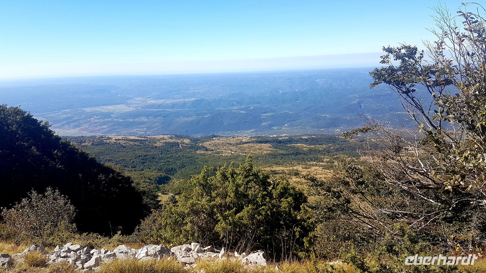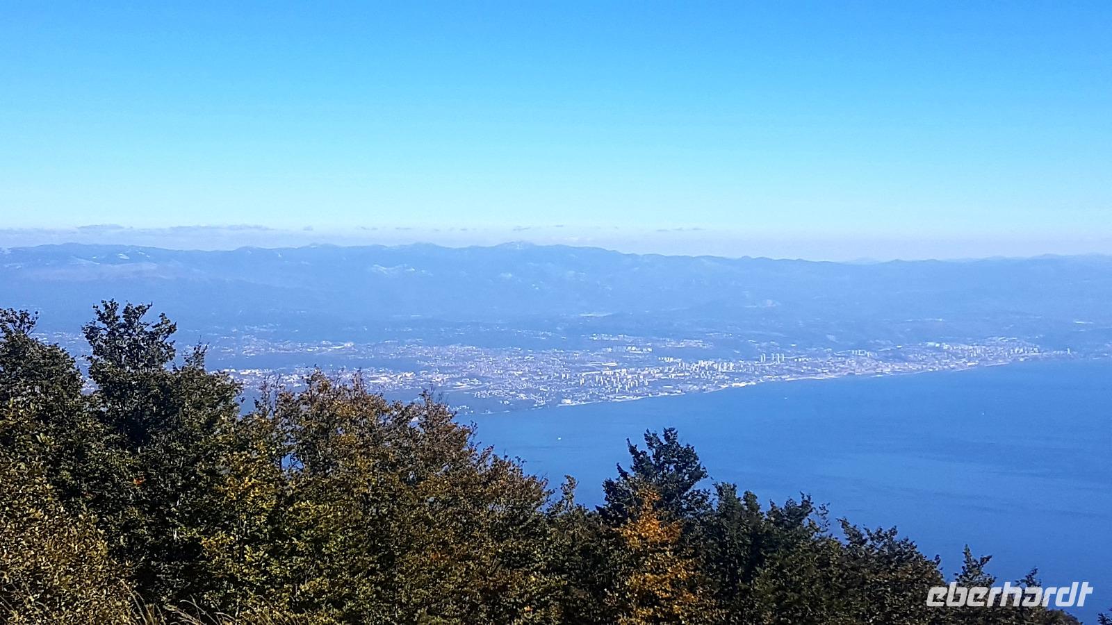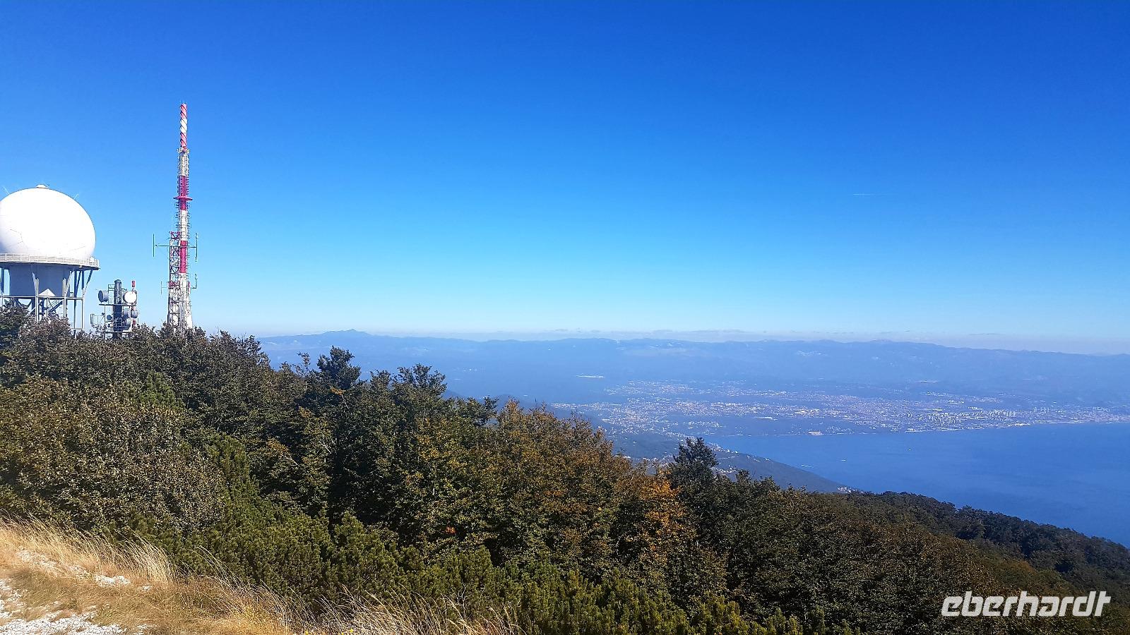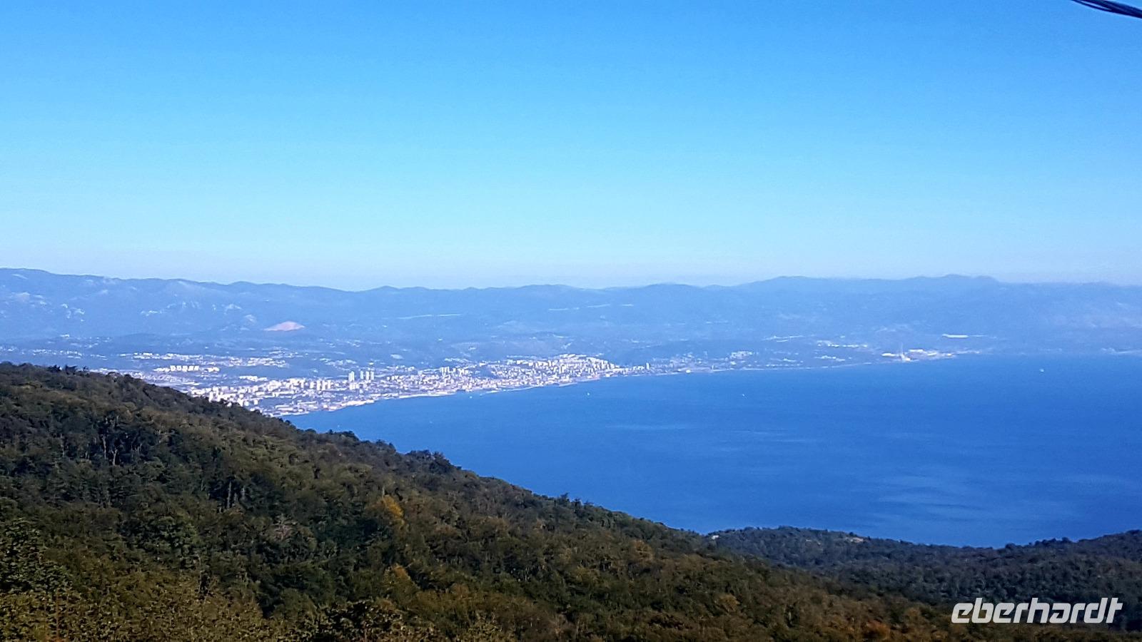Es geht durch den dichten Wald immer hinauf. Auf einer Lichtung, mit Blick weit ins Landesinnere machen wir eine kurze Trink - und Fotopause. Der letzte Aufstieg geht dem Gipfel in Serpentinen entgegen. Jeder geht sein Tempo, damit es für alle entspannt ist. Oben auf dem Gipfel auf 1.401 m angekommen, haben wir einen fantastischen Rundumblick. Ein Jäckchen schützt uns vor dem Wind, der aufgekommenen ist. Wir genießen unser Picknick und wollen uns gar nicht von dem Anblick der Kvarner Bucht und Rijeka trennen. Aber einmal muss man wieder vom Gipfel hinab. Langsam beginnen wir den Abstieg Richtung Lovran. In dem Gasthaus „Ucka" kehren wir ein. Jetzt schmeckt ein Bier. Alles haben die schwerste Wanderung der Reise geschafft und sind happy...die Stimmung ist gut.....ich finde eine ganz tolle Truppe sind wir. Einer hilft dem anderen, wenn es mal im Gelände schwierig wird und alle haben ganz viele Gesprächsthemen. Es kommt keine Langeweile auf.