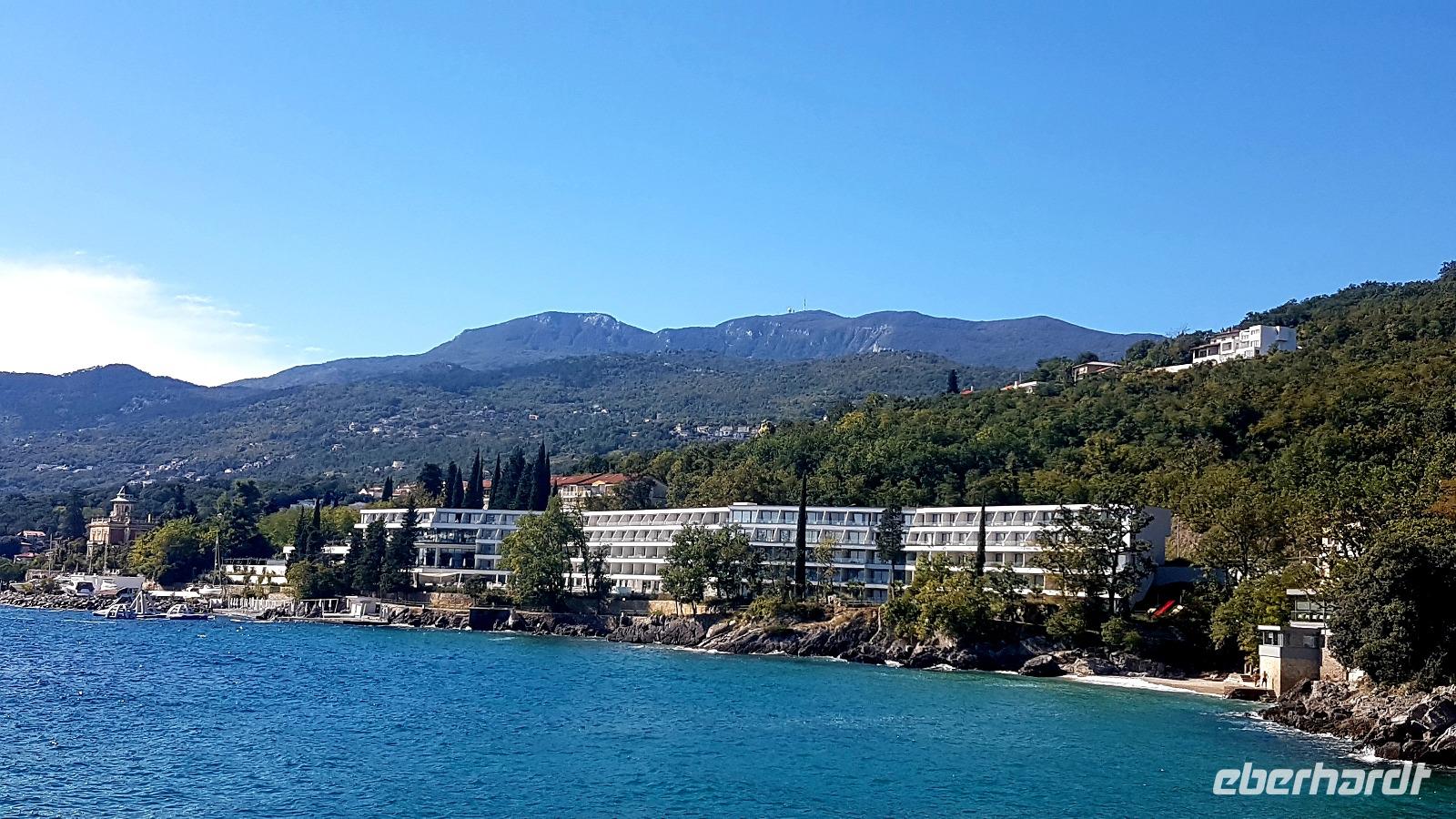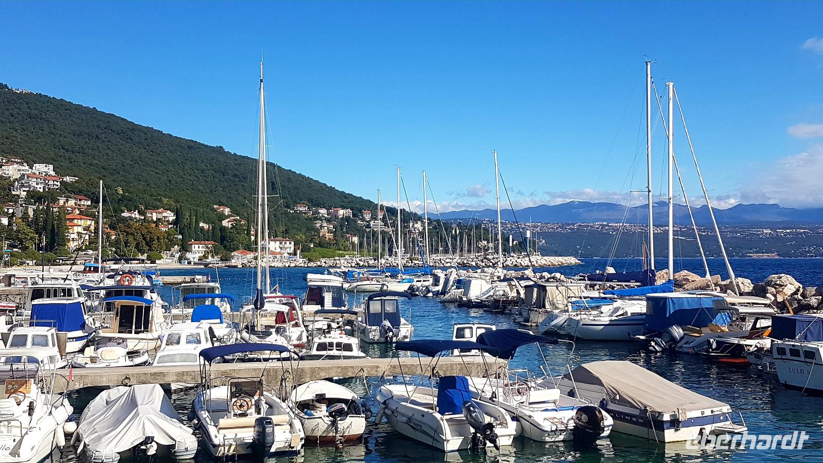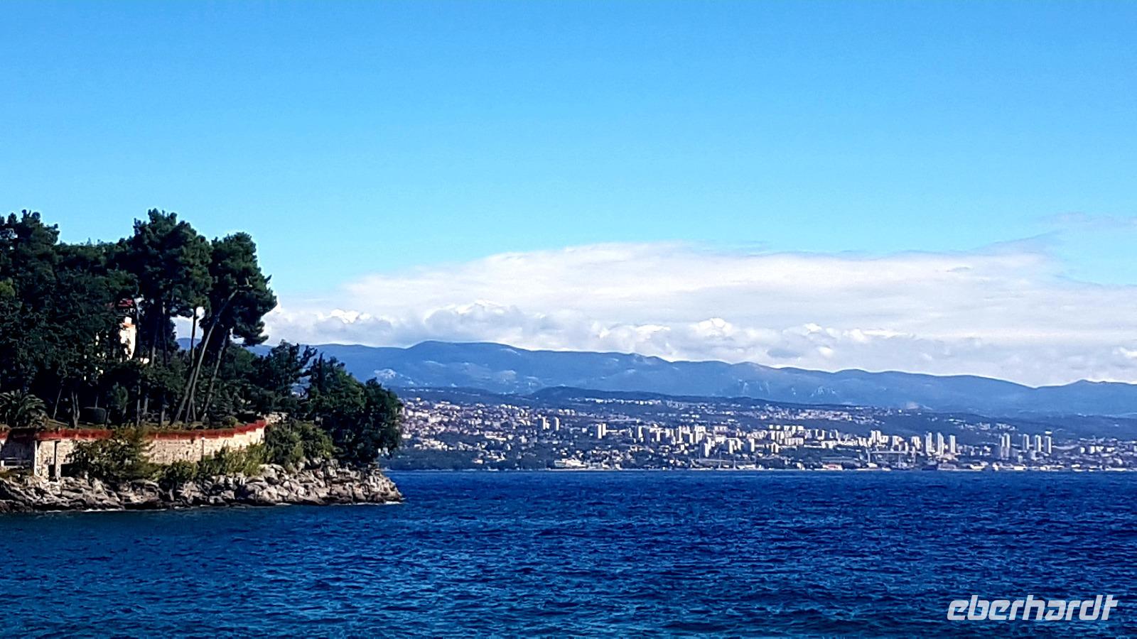 Heute haben wir die leichten Sportschuhe oder Wandersandalen angezogen, um die schöne Promenade am Meer entlang von Lovran nach Opatija entlang zu spazieren. Diese Weg, die Lungomare wurde bereits Anfang des 19. Jahrhunderts angelegt, als Opatija von den wohlhabenden Österreichern der K&K Monarchie als Badeort für den Sommer und angenehmen Aufenthalt auch bei moderaten Temperaturen für den Winter entdeckt wurde. Viele Villen und Hotels sind Zeitzeugen in Opatija. Wir beginnen unseren Spaziergang in Lovran bei windigen Wetter. Die Bora-Winde von der anderen Seite der Kvarner Bucht bringen den Wind bis hierher. Später ist es wieder windstill. Wir kommen vorbei an großen Jachten, die im Hafen liegen und können bis Rijeka schauen.