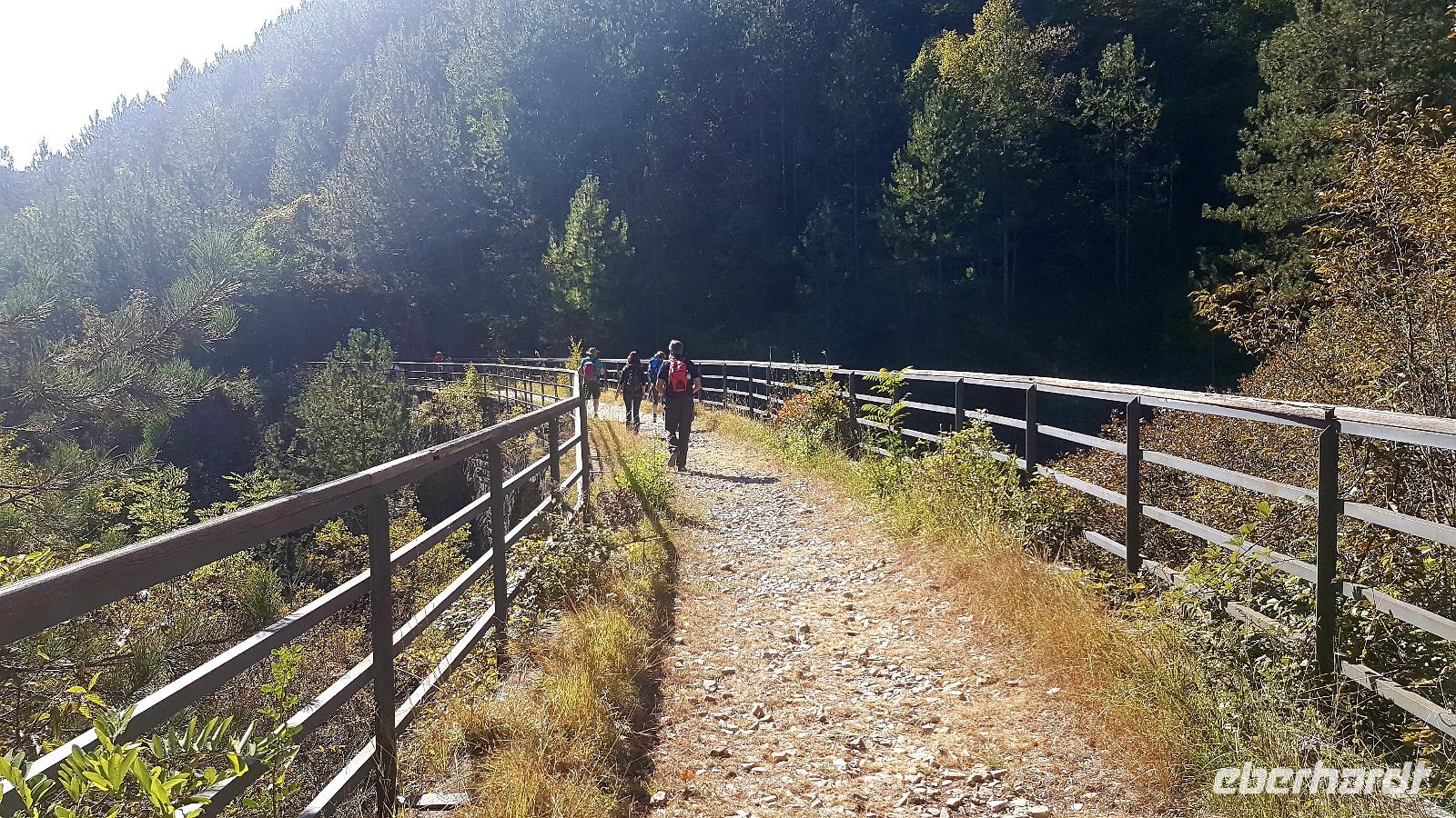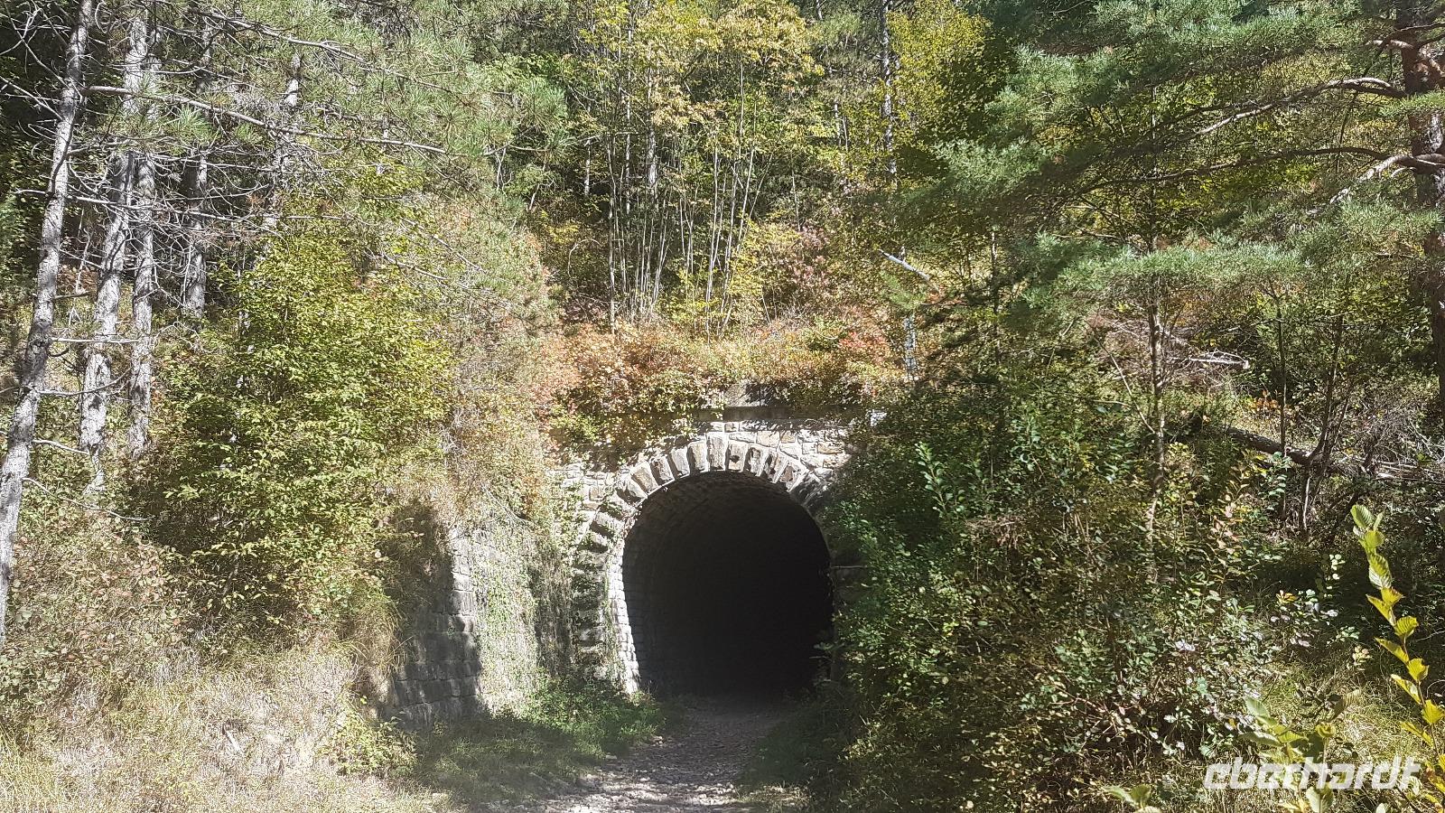 Wir haben wieder tolles Sonnenwetter und kurze Hose und T-Shirt sind die richtige Wanderbekleidung. Es geht über Viadukte, aber auch durch Tunnel. Zur Mittagszeit machen wir unsere Rast und suchen uns dafür ein schattiges Plätzchen. Wieder ein schöner Wandertag. Kurz vorm Ziel erwartet uns schon unser Busfahrer Rino mit einem Grappa. Da gehen die Füße die letzten Schritte fast alleine.