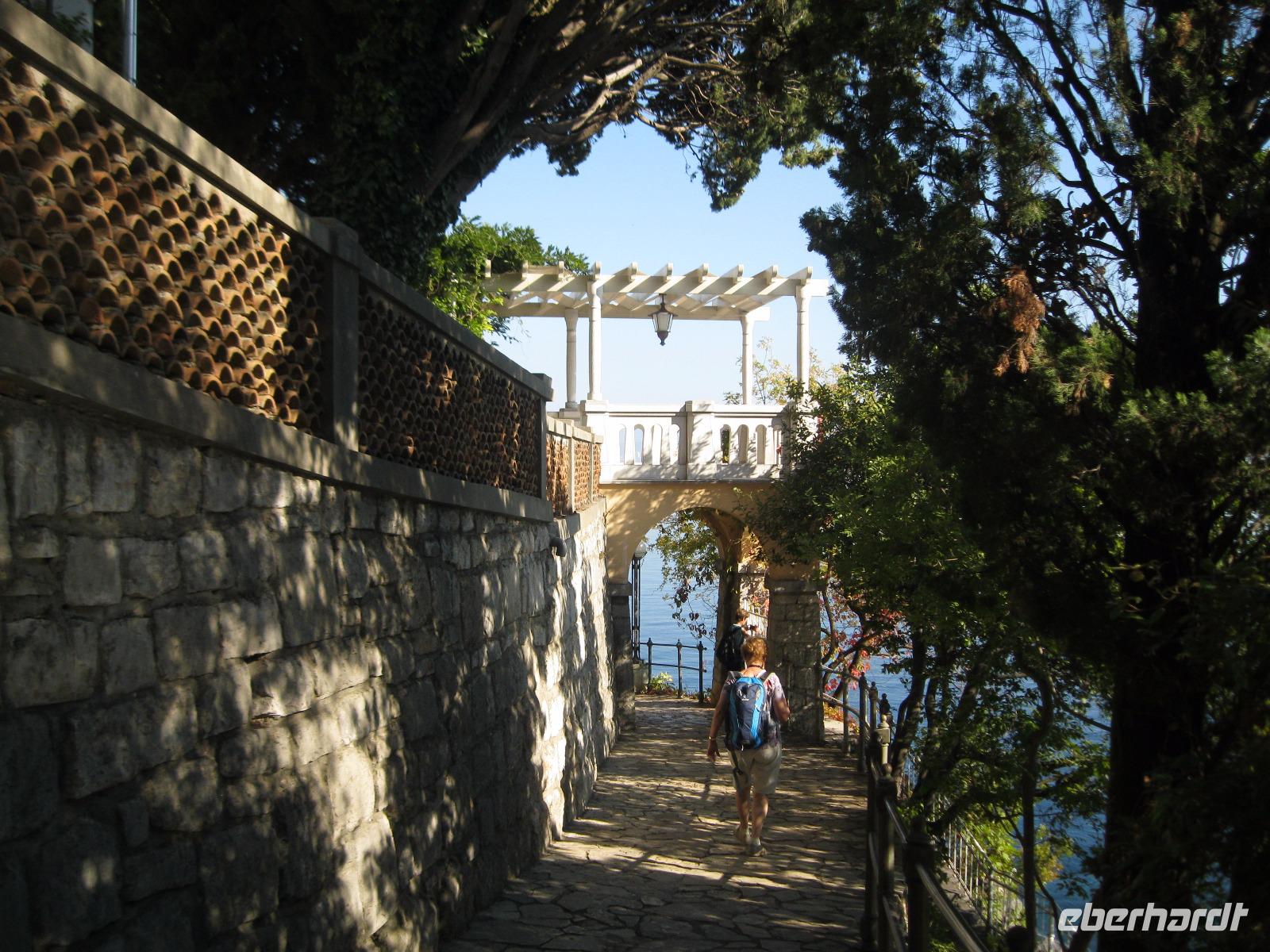 Wanderungen können nach der Witterung ausgerichtet sein und müssen den Gegebenheiten angepasst werden.Genau dies machten wir während unserer Reise.Wir stellten die heutige Tour"auf dem Pfad des heiligen Simon"(wegen schlechter Begehbarkeit)einfach um.Unser örtlicher Wanderleiter ,Vele,schlug uns die Tour oberhalb von Lovran zu laufen und die Küstenpromenade „Franz Josef I",oder im Volksmund -Lungo Mare-genannt,bis Opatija zu gehen.Zuerst sahen wir das Meer von der Hügelkette Lovrans aus.Am Hotel „Lovran ,einer ehemaligen Ku.K Residenz, erwartete uns Rino mit Bus und Vele kredenzte uns selbstgemachten Salbei Likör mit getrockneten Feigen.Im Städtchen ließen wir uns Kaffee und Eis,am Hafen, schmecken .Bis ins nostalgisch,mondäne Seebad Opatija verlief die Promenade in sanften Kurven, immer knapp über dem Meer. Vorbei an gepflegten Hotelgärten und duftenden Gewächsen kamen wir im Park- Angiolina an.Hier begann 1844 der Tourismus an der Kvarner Bucht.Noch heute zeugen die grandiosen Bauten an die Zeit der Belle Epoque und man kann in Erinnerung schwelgen, als Opatija Modebad wurde.Auf der Heimfahrt unterhielt uns Vele mit Klapa-Musik.
