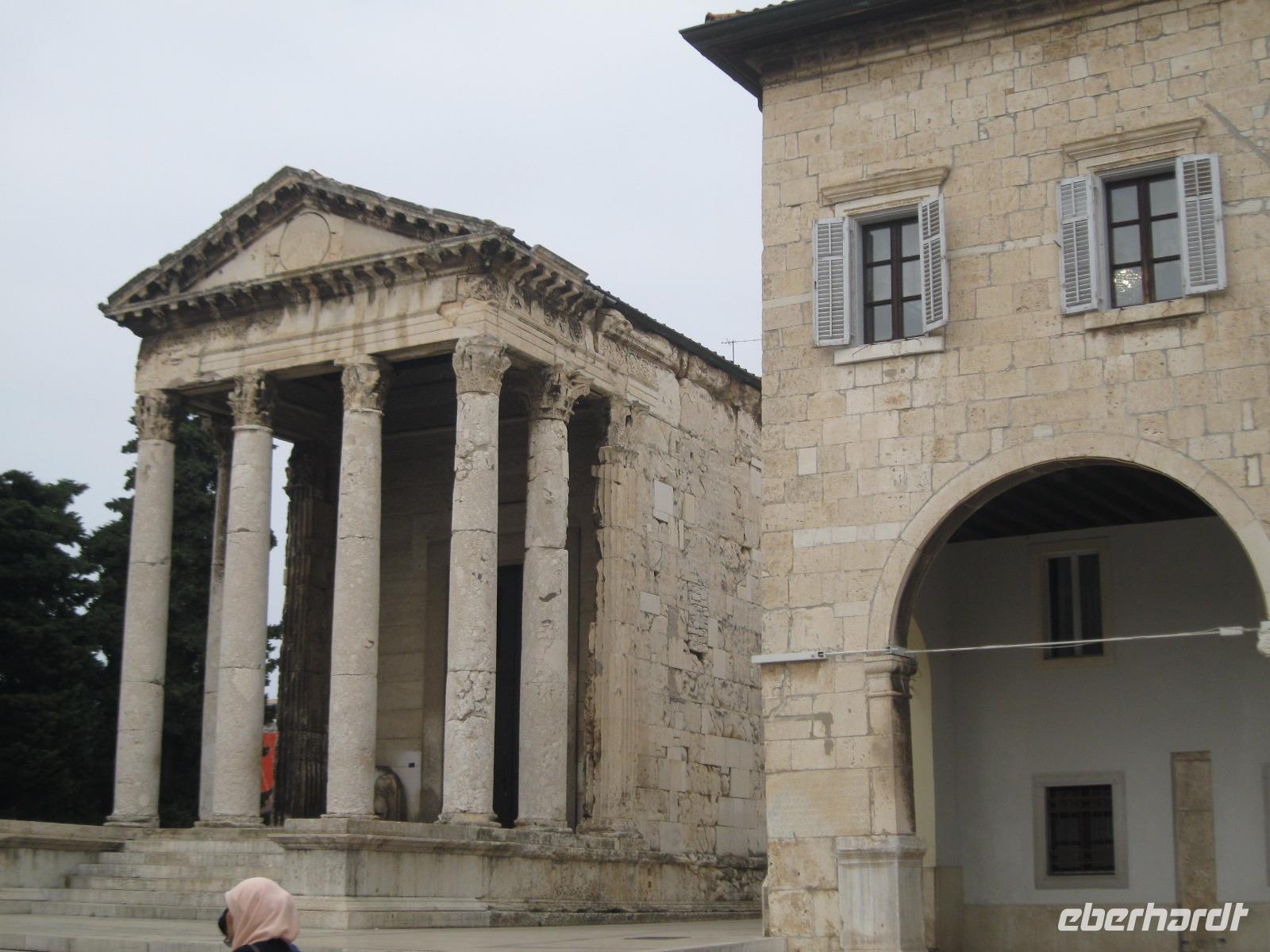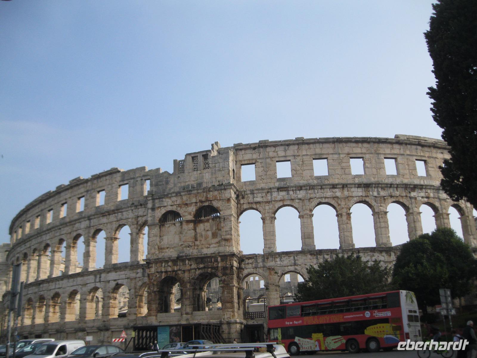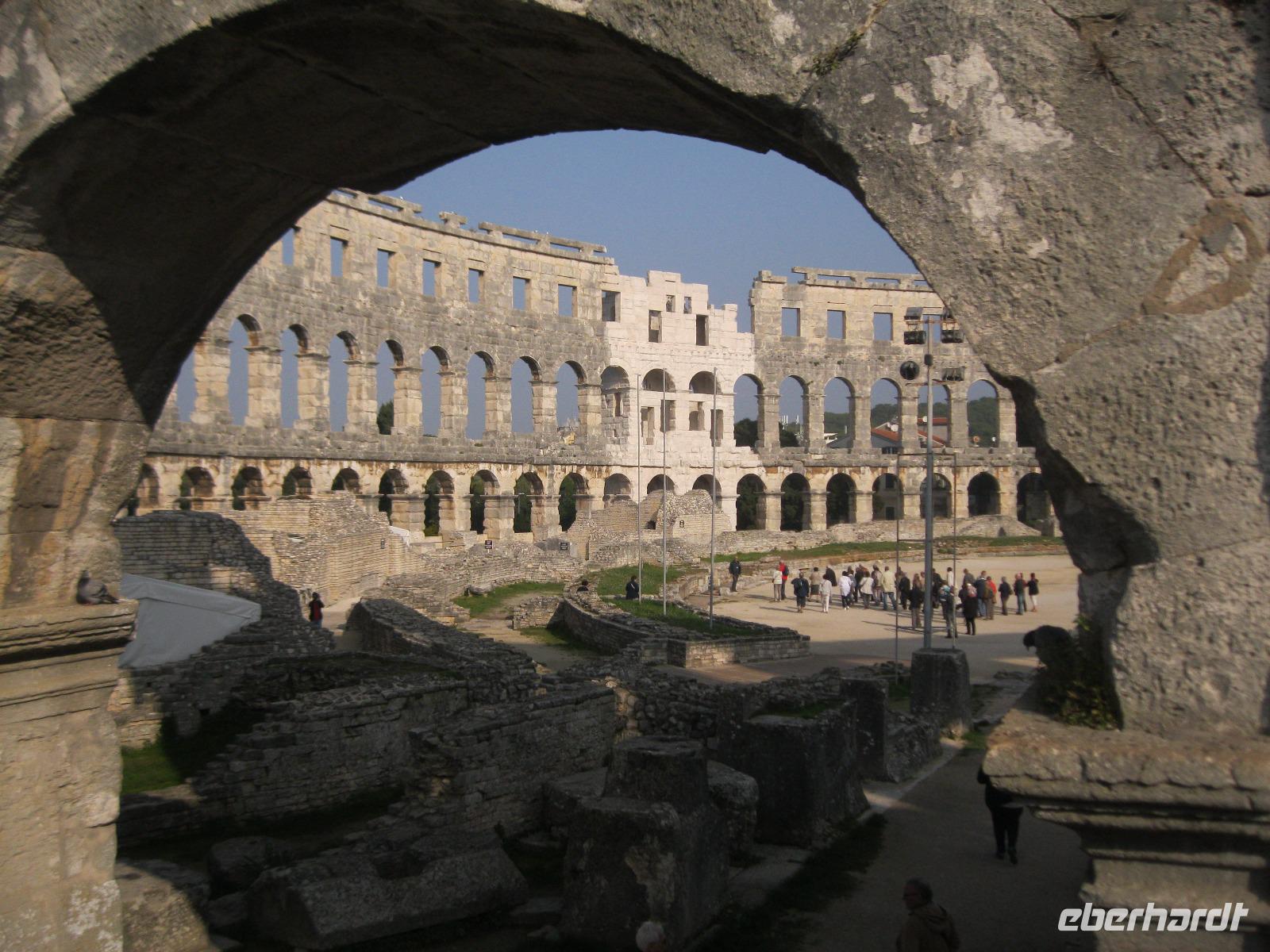 Pula,heute moderne Großstadt mit Industriehafen.Von hier aus starteten wir unseren Rundgang durch das einstige „Rom Istriens".Wir begannen am monumentalen Amphitheater,die sechs größte Arena der Welt,spazierten am Augustus - Tempel vorbei und erreichten schließlich die,im Jugendstil errichtete,Markthalle mit, täglich stattfindenden ,Wochenmarkt.Hier kosteten wir Honig und deckten uns mit frischen Obst ,für die Wanderung,ein.Im Anschluß ging es hinaus in die Natur. Der südlichste Ort Istriens -Premantura- ist das Tor zum Naturpark „Kap Kamenjak".Über holprige ,staubige Straßen gelangten wir zu einsamen Badebuchten mit kristallklarem Wasser.Wir versuchten unser Glück im Steine sammeln und fanden sogar Pilze.(das Abendbrot für Rino)Zerklüftet und rau war die Steil- Küste und gab einen schönen Blick ,auf das Felsriff Porat mit dem 35 m hohen Leuchtturm ,frei.Unsere Nasen wurden von wundervollen Düften der Mittelmeer Macchia verwöhnt.Am Bus angekommen belohnten wir uns mit einem Kirsch Likör.Leider war dies unser letzter Ausflug,aber dafür wunderschön.Im Hotel hieß es dann - Koffer packen