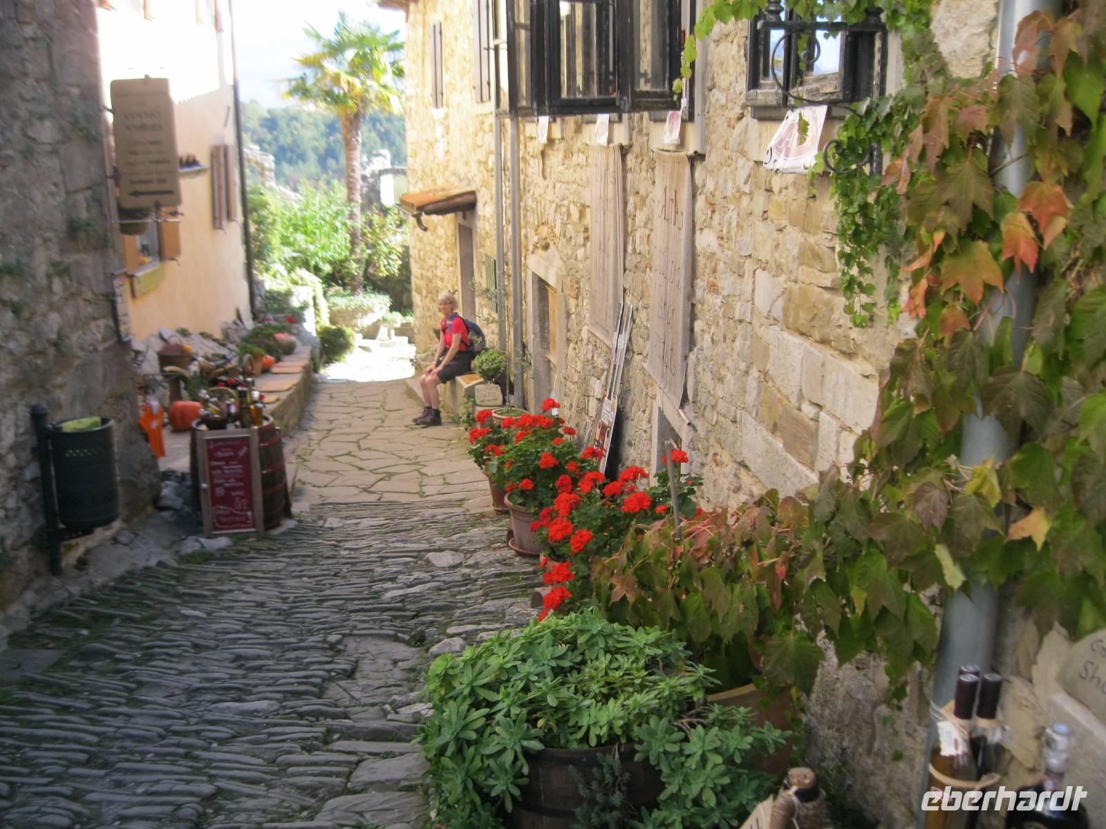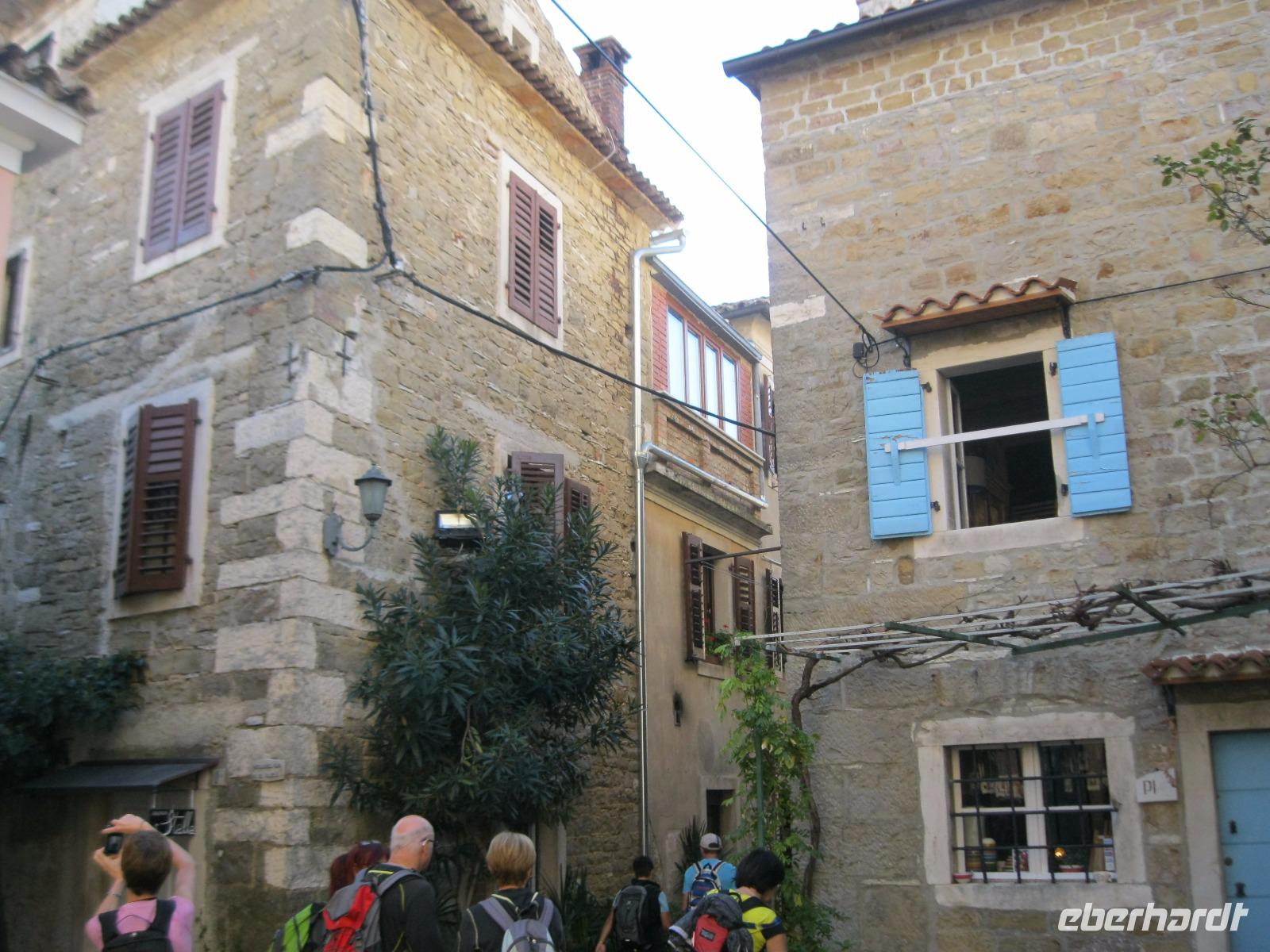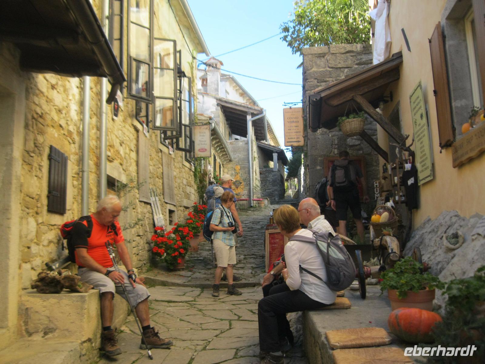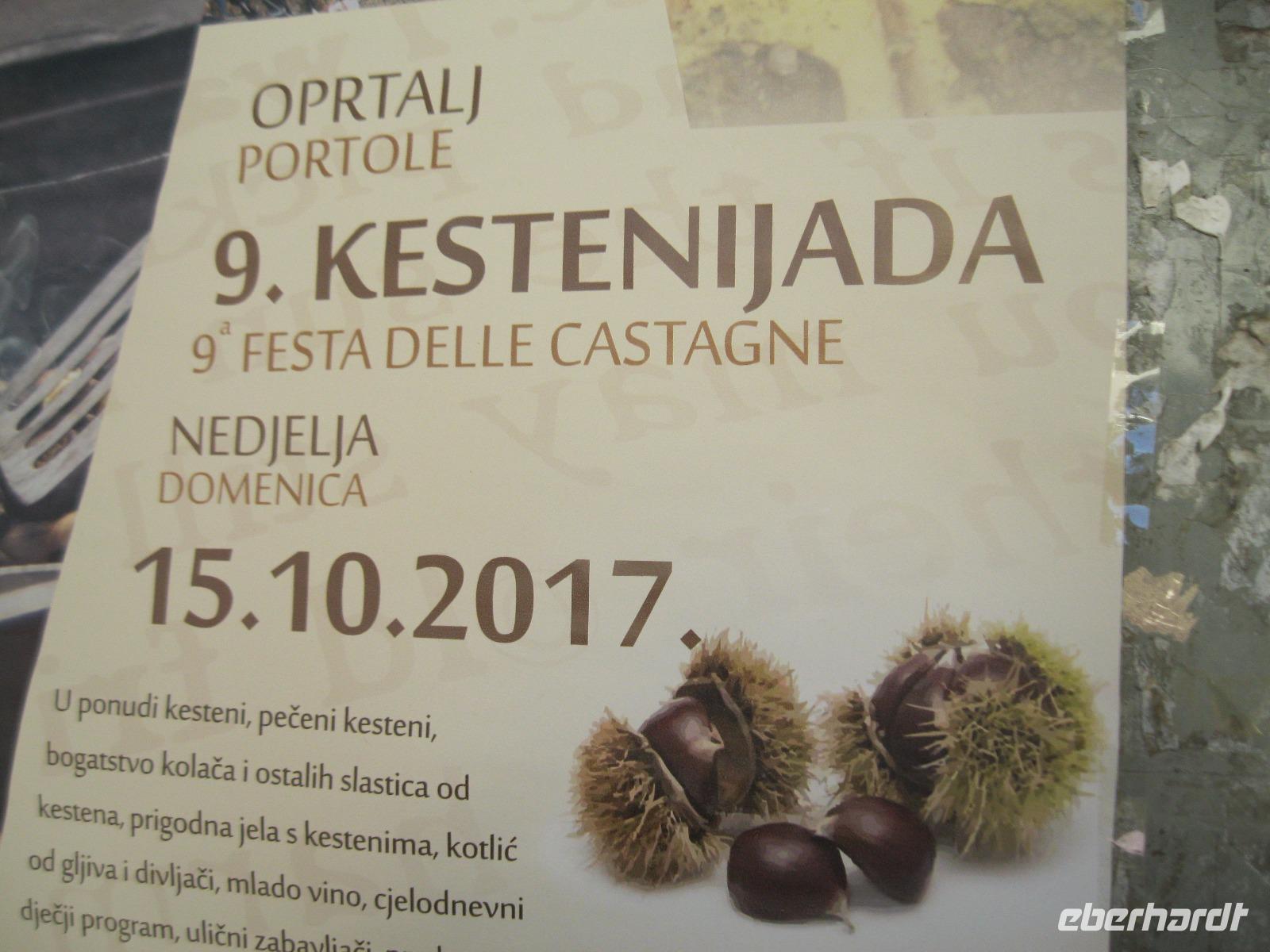 In der Region werden an diesem Wochenende die Kastanien- Feste gefeiert. Für uns ein Grund ,die Wanderungen so zu tauschen, damit wir mitfeiern können.An der Wein-Stadt Buje (bekannt für den Rotwein Teran)vorbei ,erreichten wir ,auf einem Hügel gelegen,das Bergstädtchen Groznjan. Wir spazierten durch ein Labyrinth von kleinen ,versteckten Gassen und entdeckten an jeder Ecke ein neues Fotomotiv.Vom Aussichtspunkt hatten wir schon einen Blick auf unsere heutige Wanderroute, entlang der ehemaligen Bahntrasse - Parenzana - von Triest nach Porec. Wir schlugen uns tapfer durch einen zugewachsenen Weg und kamen in dem fast verlassenen kleinen Ort Zavrsje an.Dort erwartete uns der Bus, der uns zum Kastanien-Fest nach Sveti Lucia brachte.Überall roch es nach gerösteten Kastanien ,Schinken und erstem Wein.Jung und Alt saßen gemütlich beieinander ,ließen es sich schmecken und lauschten den Straßenmusikern.Leider gab es auch Chaos, auf der viel zu kleinen Zufahrtsstraße ,das aber souverän von „Vele"gelöst wurde.Im Hotel angelangt,hatten wir noch Zeit das Meerwasser zu testen.