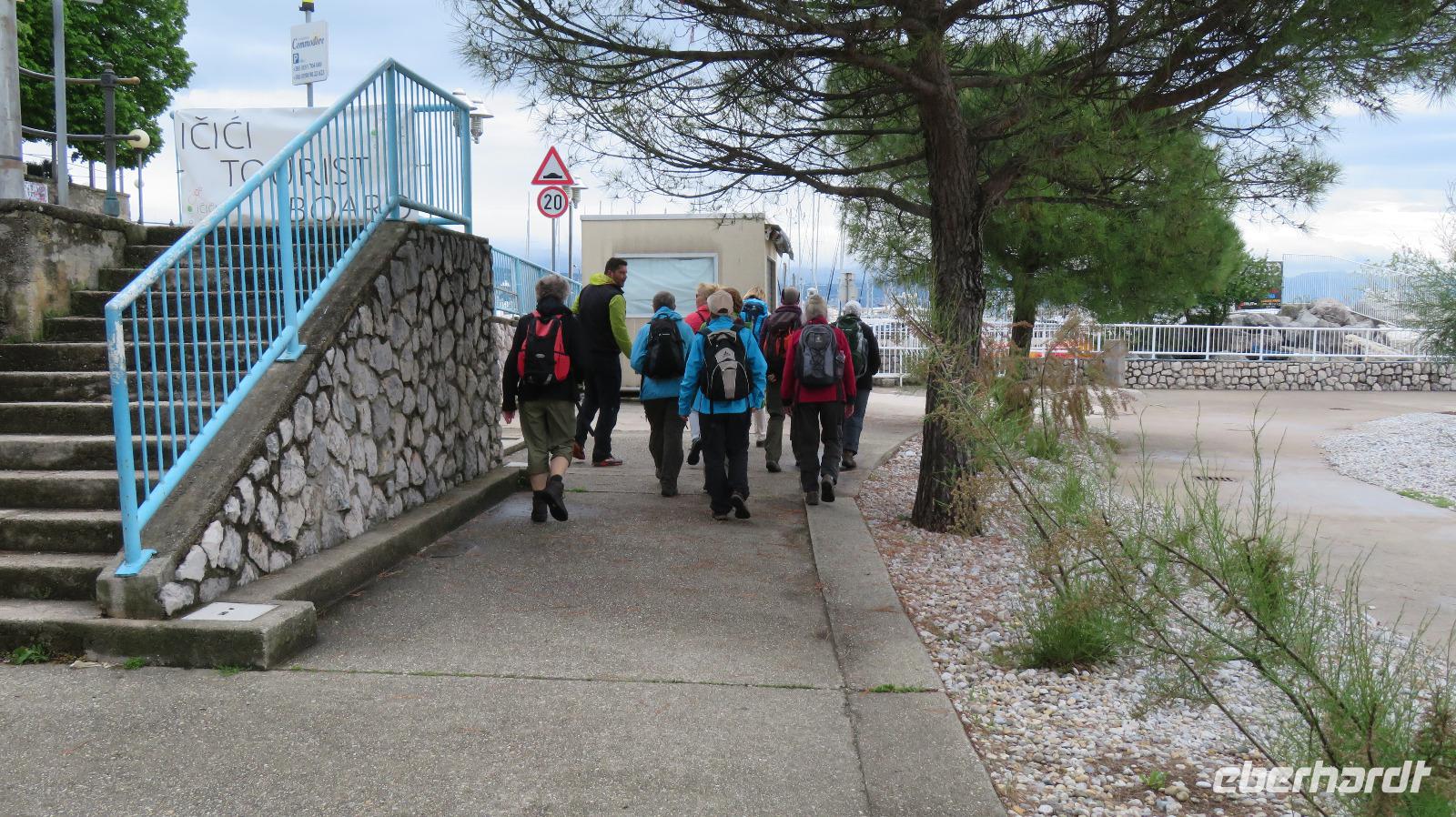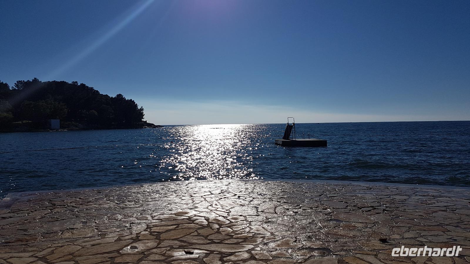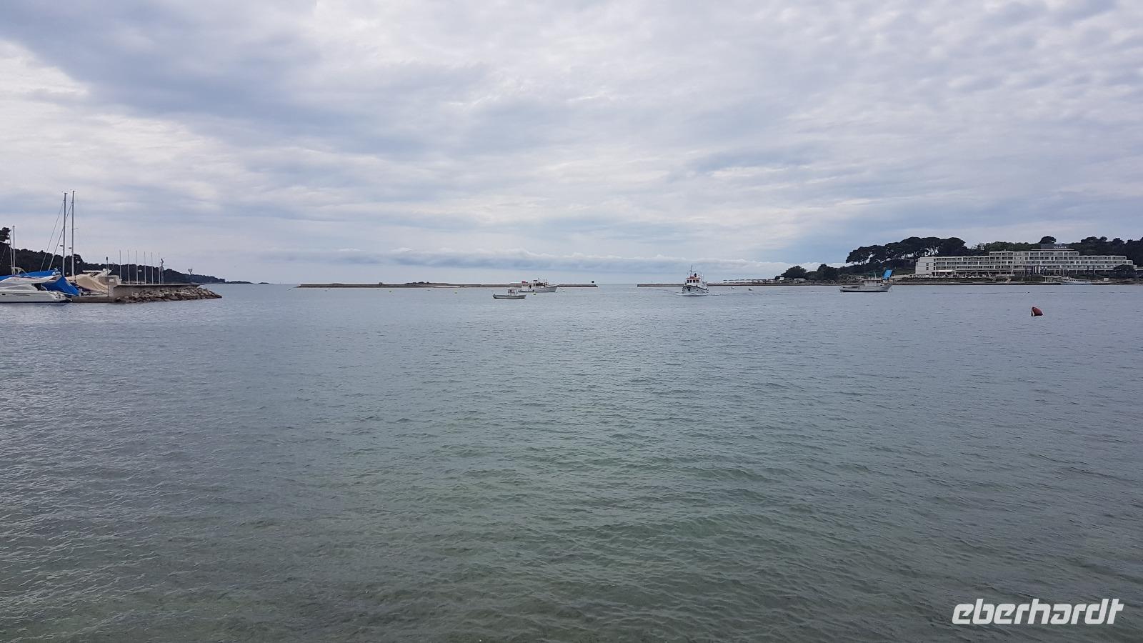 Am zeitigen Samstagmorgen traf ich auf die ersten Gäste am Dresdner Flughafen und gemeinsam meisterten wir den Check-In am Automaten, bevor wir unser Gepäck aufgaben. Die Sicherheitskontrolle war schnell erledigt und so warteten wir noch am Gate, bis das Boarding begann. Nach einem kurzen Flug nach München trafen wir auf eine weitere Mitreisende, die von Hannover nach München geflogen war. Zusammen ging es dann im Flieger nach Pula, wo uns unser Reiseleiter Velle in Empfang nahm und begrüßte. Unser Busfahrer Rajko packte das Gepäck in den Bus und schon startete die 50-minütige Fahrt zum Hotel. Velle erklärte uns kurz die anstehenden Wanderungen während der Fahrt und dass er diese umplanen musste, da die Wetteraussichten sich nicht mit den Wanderungen ergänzten. Daher stand für den ersten Tag die Küstenwanderung von Lovren nach Opatija an. Wir verabredeten uns für den nächsten Morgen um 8:30 Uhr. Da die Zimmer noch nicht bezugsfertig waren, ließen wir unser Gepäck im Hotel, spazierten nach Porec und aßen in einem Lokal am Hafen zu Mittag. Der Kellner spendierte uns am Ende noch einen Schnaps oder Espresso und so waren wir bester Laune, als wir wieder zurück zum Hotel gingen. Am Nachmittag bezogen wir dann unsere Zimmer, ruhten uns aus und trafen uns am Abend um 19:00 Uhr zum ersten gemeinsamen Abendessen im Speisesaal. Das Servicepersonal reservierte uns für die gesamte Woche einen Tisch, so hatten wir immer einen festen Treffpunkt. Da zwei Gäste später aus Düsseldorf und Frankfurt direkt nach Pula geflogen sind, wartete ich noch in der Lobby auf die beiden. Sie wurden pünktlich von Velle zum Hotel gebracht und konnten noch in Ruhe das Buffet genießen. Nach dem Abendessen checkten die beiden dann ein und konnten schließlich auch ihr Zimmer beziehen.