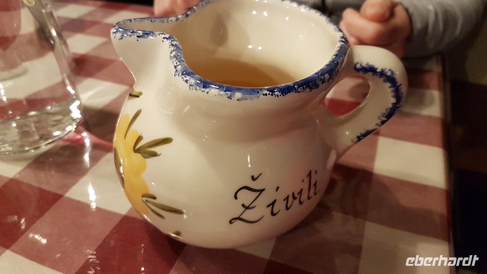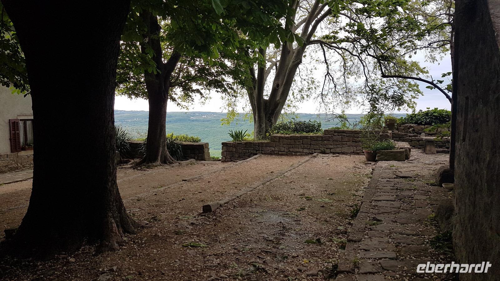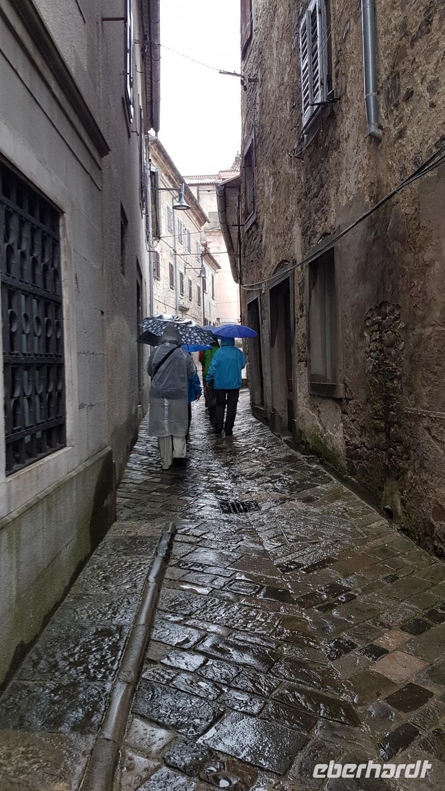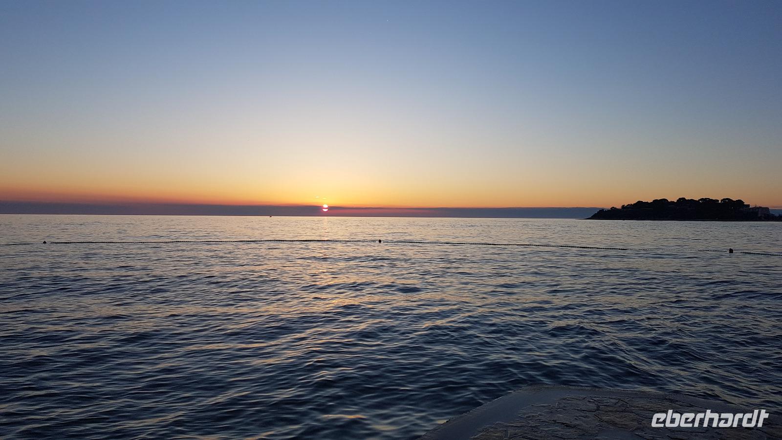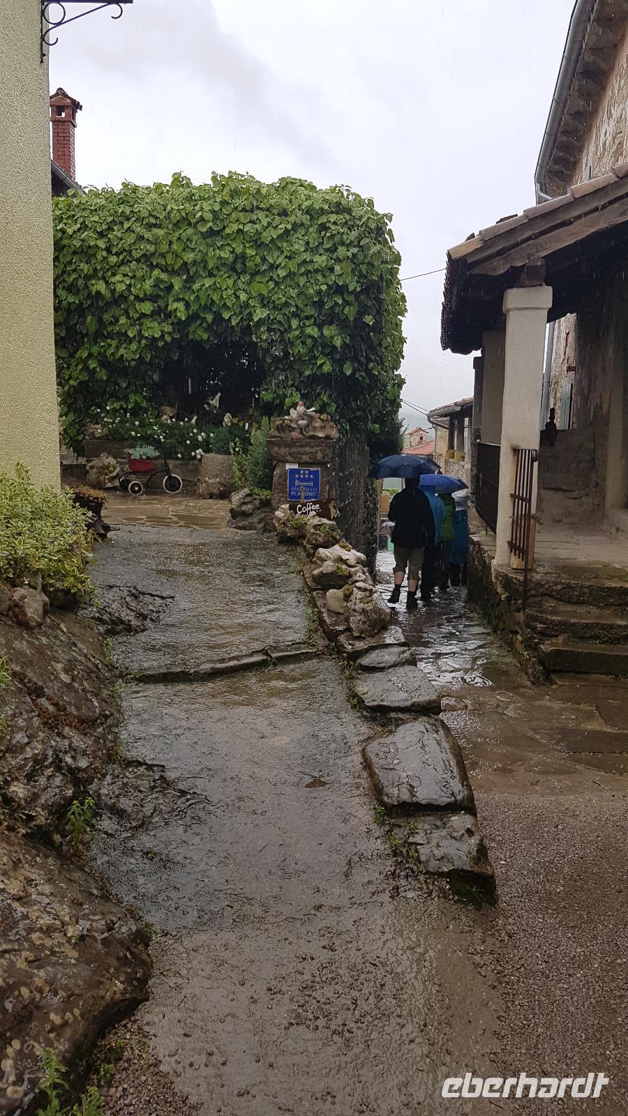 Unsere Wanderung sollte uns ins Mirnatal führen, aber es regnete bereits am Morgen in Strömen, sodass die Wanderung ausfallen musste. Anstelle derer schlug Velle vor, dass wir die Orte Buzet und Hum mit dem Bus anfahren und jeweils einen Spaziergang in den Orten machen könnten. Alle waren einverstanden und so fuhr uns Rajko zuerst nah Buzet. In dem kleinen Örtchen spazierten wir bei immer noch strömenden Regen durch die Gassen. Danach hielten wir kurz am Fluss Mirna und beobachteten die immense Strömung des eigentlich schmalen Flusses. In der kleinsten Stadt der Welt, Hum, angekommen, besichtigten wir zuerst einen schönen Laden, in dem der eine oder andere noch ein schönes Souvenir mitnahm oder einen lokalen Schnaps probierte. Da Hum wirklich sehr klein ist, waren wir schnell wieder am Ausgangspunkt angelangt und tranken in der örtlichen Konoba, einem kleinen Restaurant, noch einen Kaffee an der innenliegenden Feuerstelle. Danach gab es noch eine Überraschung für alle Gäste. Wir fuhren zu einer kroatischen Familie, die uns in ihrem Keller allerlei Köstlichkeiten servierte, die von ihnen selbst oder den Nachbarn hergestellt wurden. So konnten wir es uns bei Schnaps, Wein, Speck, Salami, Käse, Brot und Olivenöl gut gehen lassen. Zum Abschluss gab es sogar noch Kuchen. Wir ließen uns gern verwöhnen und genossen die Zeit bei der Familie. Wer mochte, konnte sogar etwas kaufen für den Genuss nach der Reise mit den Liebsten zu Hause. Nach rund einer Stunde verabschiedeten wir uns und wurden von Rajko zurück zum Hotel gefahren. Auf der Fahrt kam die Sonne raus und wir hatten noch einen schönen Nachmittag am Meer, im Schwimmbad oder der Sauna. Nach dem gemeinsamen Abendessen gingen ein paar von uns noch zum Strand um den Sonnenuntergang zu beobachten.