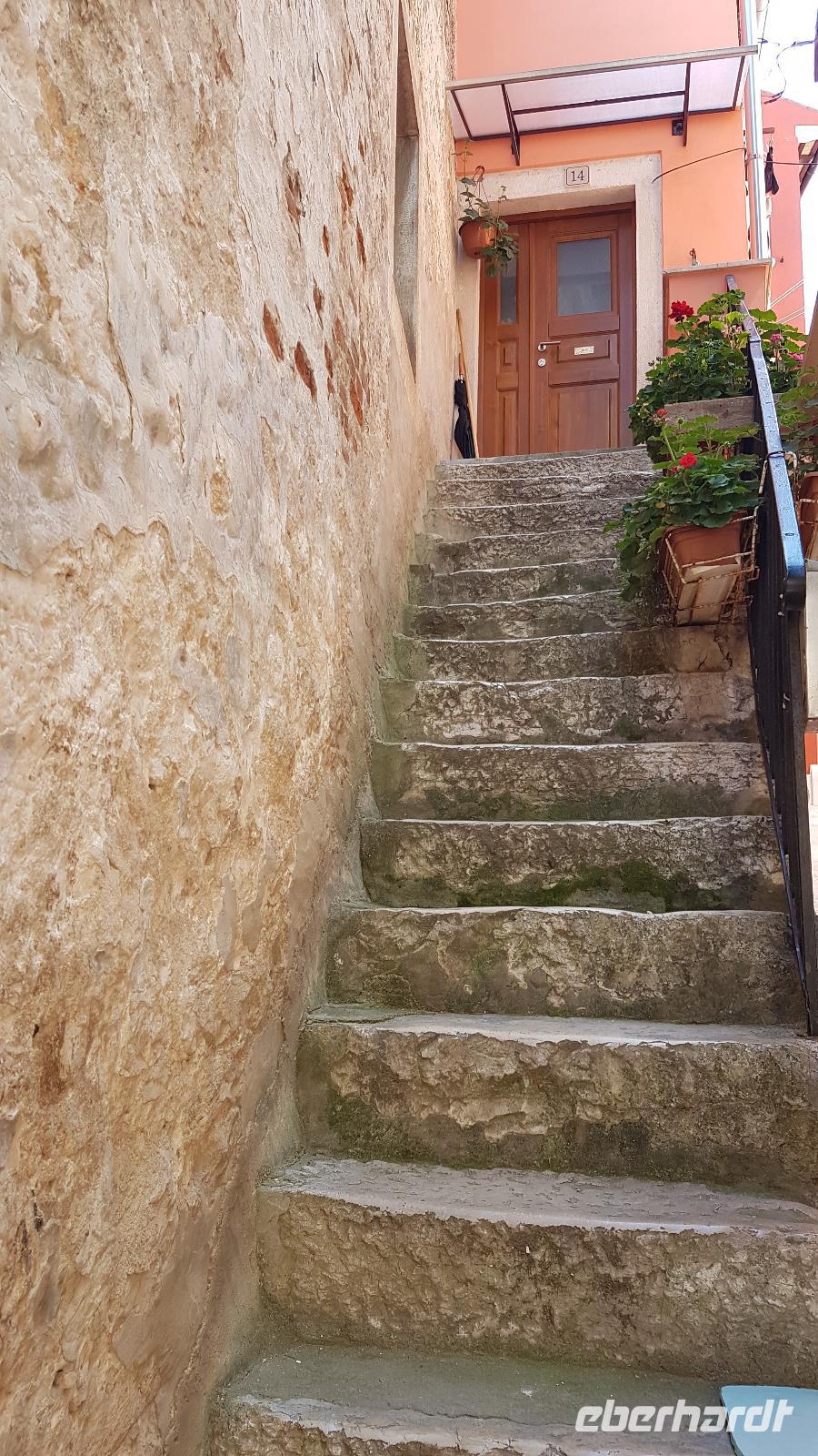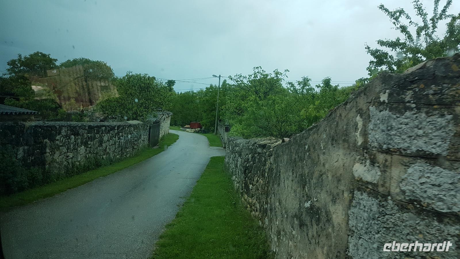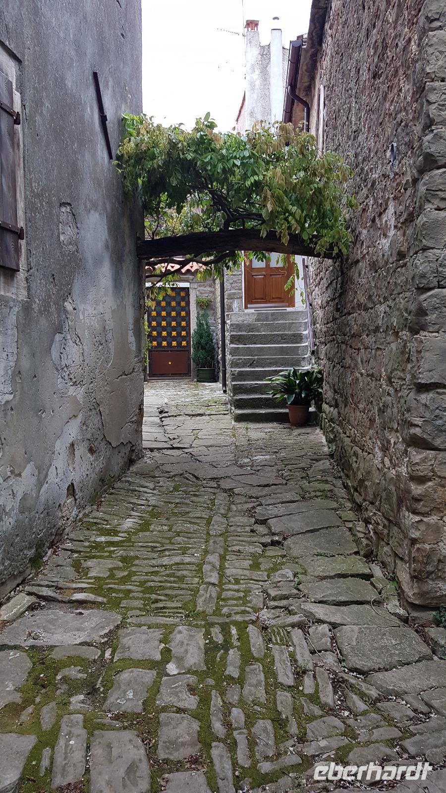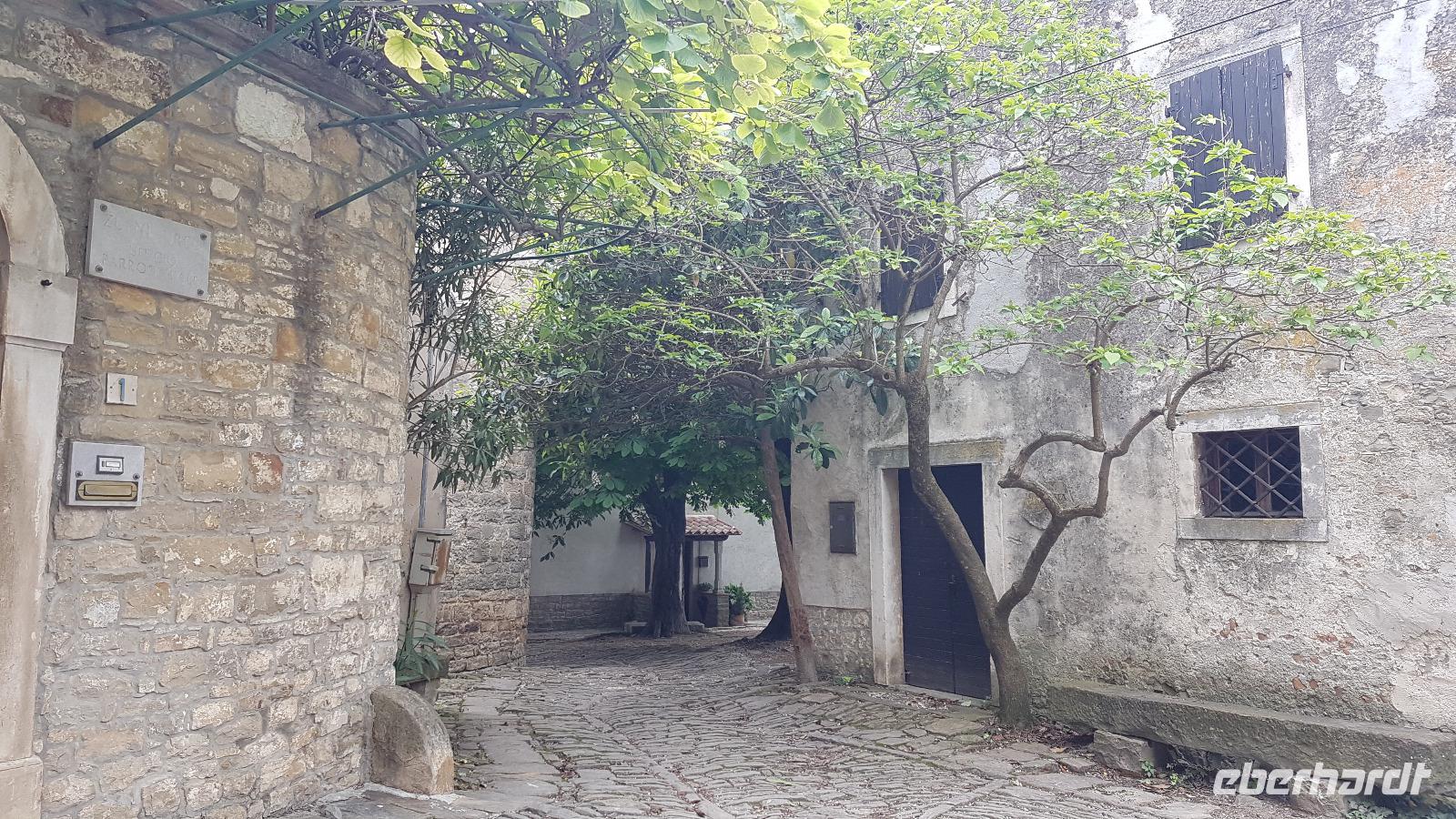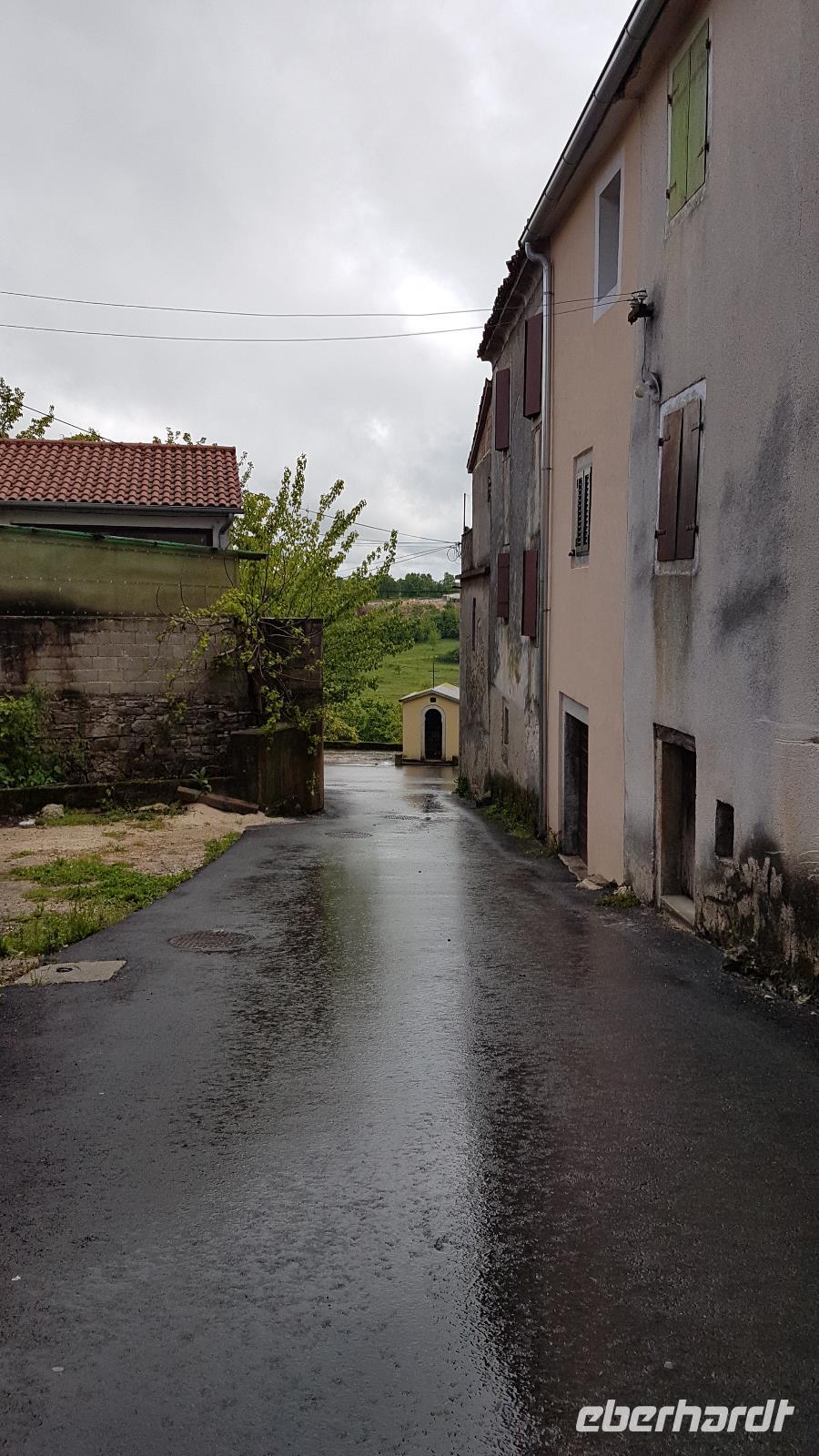 Unsere Wanderung sollte uns ins Mirnatal führen, aber es regnete bereits am Morgen in Strömen, sodass die Wanderung ausfallen musste. Anstelle derer schlug Velle vor, dass wir die Orte Buzet und Hum mit dem Bus anfahren und jeweils einen Spaziergang in den Orten machen könnten. Alle waren einverstanden und so fuhr uns Rajko zuerst nah Buzet. In dem kleinen Örtchen spazierten wir bei immer noch strömenden Regen durch die Gassen. Danach hielten wir kurz am Fluss Mirna und beobachteten die immense Strömung des eigentlich schmalen Flusses. In der kleinsten Stadt der Welt, Hum, angekommen, besichtigten wir zuerst einen schönen Laden, in dem der eine oder andere noch ein schönes Souvenir mitnahm oder einen lokalen Schnaps probierte. Da Hum wirklich sehr klein ist, waren wir schnell wieder am Ausgangspunkt angelangt und tranken in der örtlichen Konoba, einem kleinen Restaurant, noch einen Kaffee an der innenliegenden Feuerstelle. Danach gab es noch eine Überraschung für alle Gäste. Wir fuhren zu einer kroatischen Familie, die uns in ihrem Keller allerlei Köstlichkeiten servierte, die von ihnen selbst oder den Nachbarn hergestellt wurden. So konnten wir es uns bei Schnaps, Wein, Speck, Salami, Käse, Brot und Olivenöl gut gehen lassen. Zum Abschluss gab es sogar noch Kuchen. Wir ließen uns gern verwöhnen und genossen die Zeit bei der Familie. Wer mochte, konnte sogar etwas kaufen für den Genuss nach der Reise mit den Liebsten zu Hause. Nach rund einer Stunde verabschiedeten wir uns und wurden von Rajko zurück zum Hotel gefahren. Auf der Fahrt kam die Sonne raus und wir hatten noch einen schönen Nachmittag am Meer, im Schwimmbad oder der Sauna. Nach dem gemeinsamen Abendessen gingen ein paar von uns noch zum Strand um den Sonnenuntergang zu beobachten.