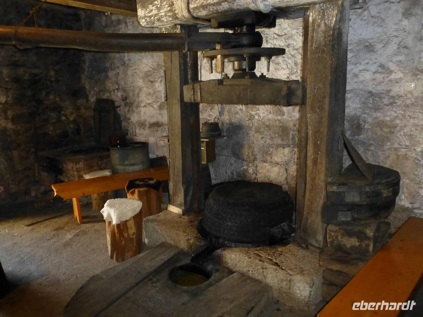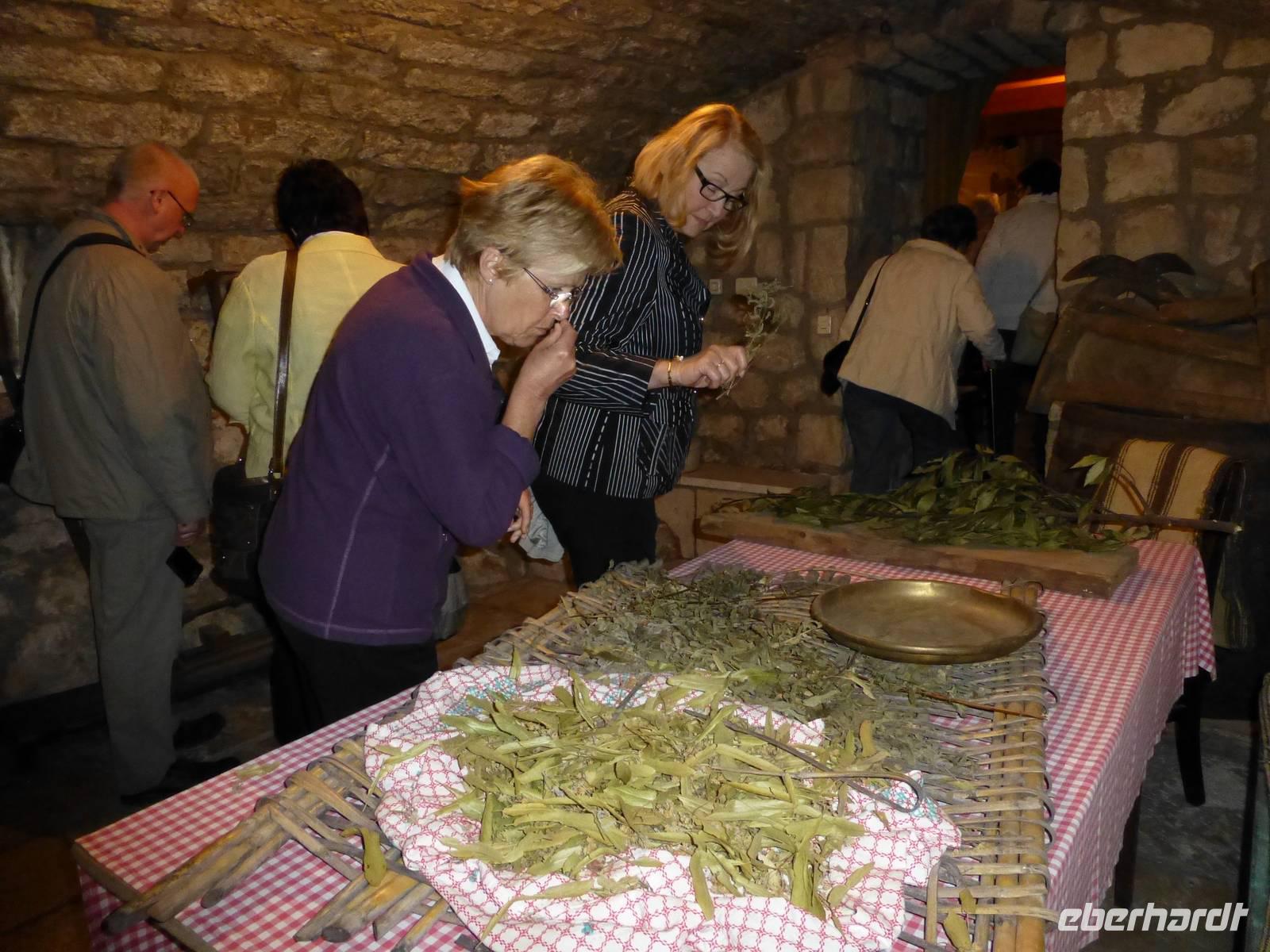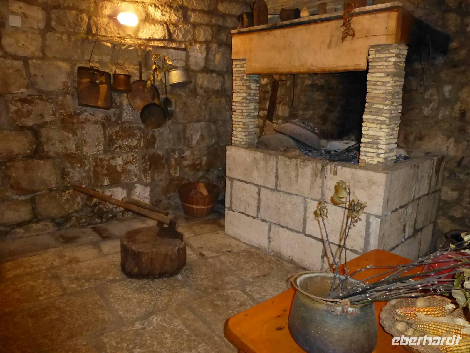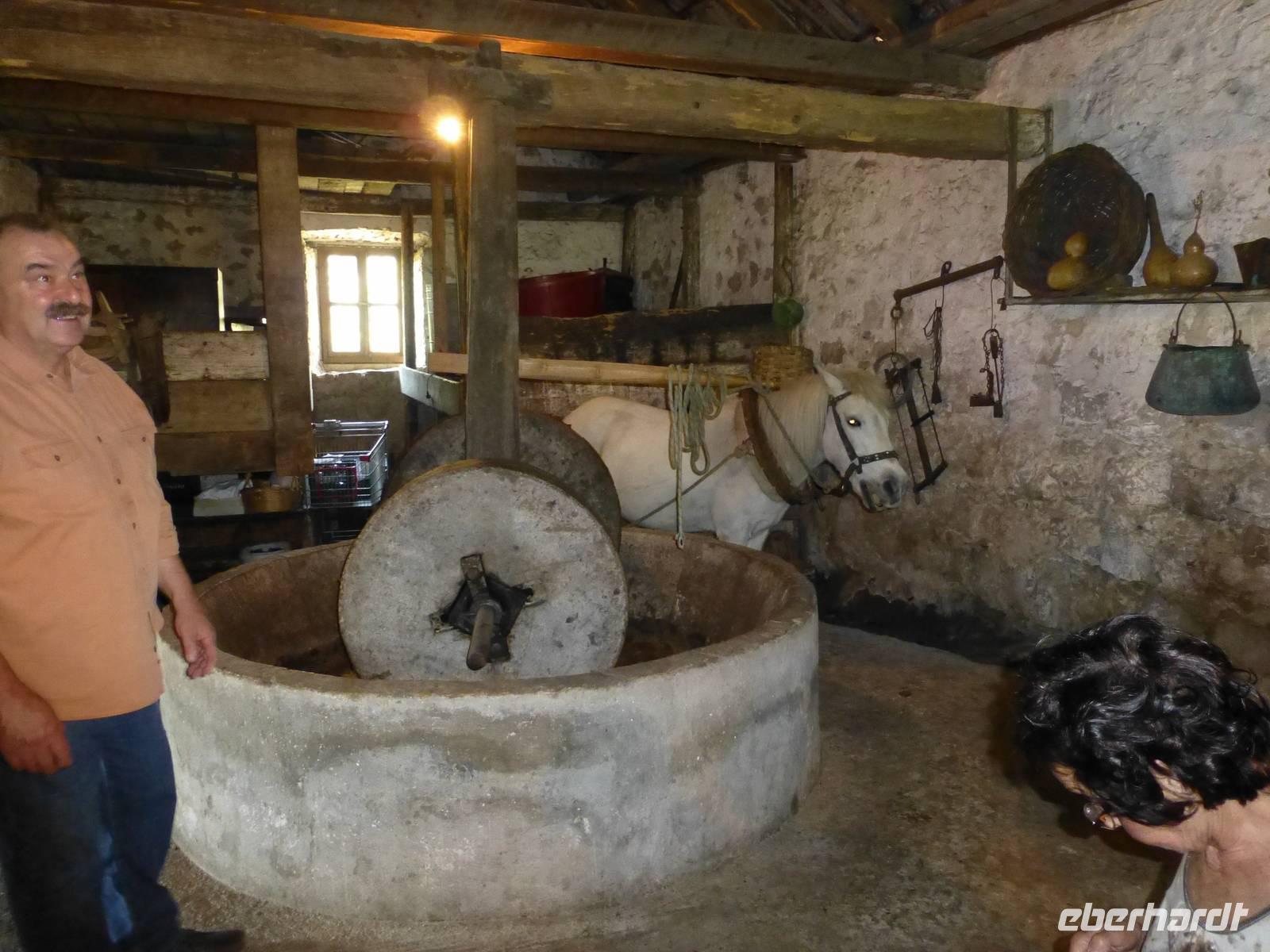 Nach einem späten Frühstück fahren wir in die südlichste kroatische Region, Konavle. Die Straße führt uns dabei, mit wunderschönen Ausblicken, immer am Meer entlang. Den zentralen Teil von Konavle bildet das Konavler Feld, ein fruchtbarer Landstrich, welcher von mehreren Flüssen durchzogen wird. Beim Dorf Ljuta besuchen wir zwei mit Wasserkraft angetriebene Mühlen. Der heutige Besitzer hat diese in den letzten Jahren restauriert und freut sich über interessierte Besucher. Begrüßt werden wir mit selbst hergestelltem Likör, getrockneten Feigen, kandierten Orangenschalen und kandierten Mandel. Alles schmeckt hervorragend und wir genießen es. Die erste Mühle diente als Getreidemühle. Niko erklärt uns wie der Mühlstein hier funktioniert und wie er angetrieben wird. Und natürlich sehen wir auch wie die Mühle, in unserem Falle Mais, zu Mehl malt. Einige Schritte entfernt befindet sich eine weitere Mühle, die wir eigentlich so nur vom Namen kennen. Es ist eine Walkmühle. Mit ihr wurden handgewebte grobe Stoffe gewalkt, das heißt sie wurden mit zwei durch Wasserkraft angetriebene Holzhämmer "weichgeklopft". Natürlich können wir auch sehen wie das funktioniert. Die Mühlen sind sehr Idyllisch gelegen, unter Bäumen neben einem rauschenden Bach und einigen Wasserkanälen.