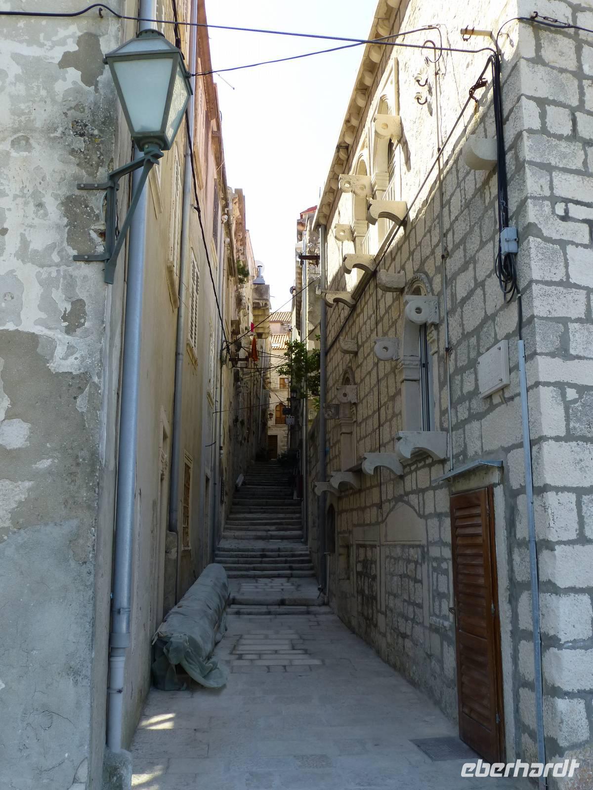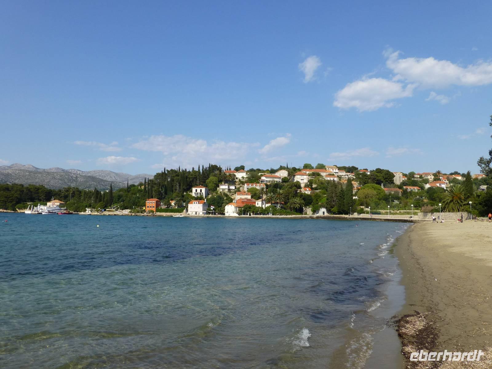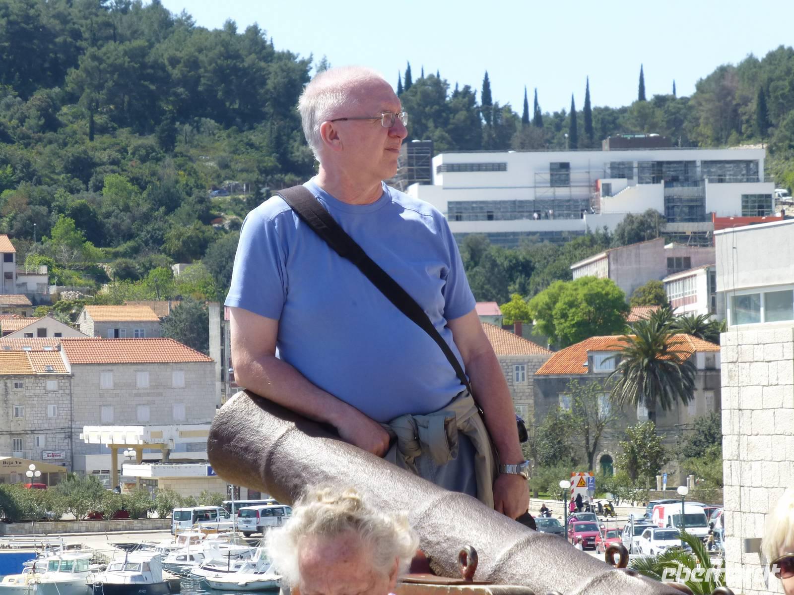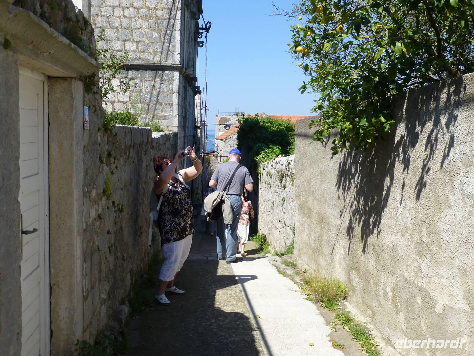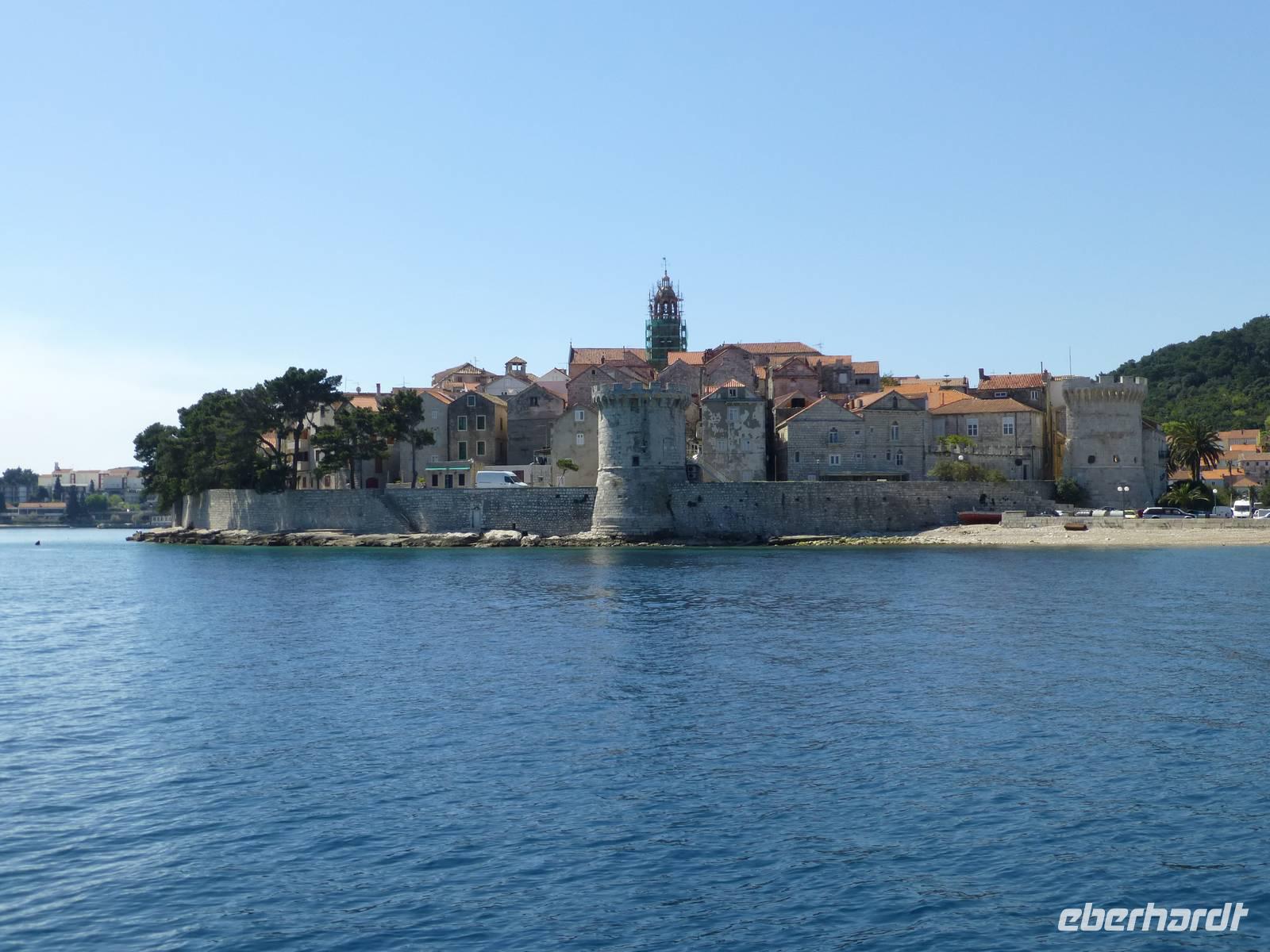 Heute heit es schon zeitiger losfahren. Bereits um 8 Uhr sitzen wir im Bus. Für's erste haben wir gut 120 km bis zur Fähre nach Orebic zurück zu legen. Eine kurze Pause machen wir unterwegs in Ston. Hier beeindruckt von weitem vorallem die gewaltige Stadtmauer. Sie sieht ein bisschen aus wie die Große Chinesische Mauer. Ston liegt schon auf der Halbinsel Pelješac. Die weitere Strecke bios Orebic ist landschaftlich abwechnslungsreich. Wir fahren entlang des Meeres, überwinden mehrmals Pässe um dann wieder entlang des Meeres zu fahren. Gleich bei Ston sehen wir eine noch heute arbeitende Saline, die Republik Dubrovnik hatte in früherer Zeit ein Privileg zum Salzhandel. Wir fahren durch Olivenhaine und vorallem auch entlang an zahlreichen Weingütern. Die Reben stehen, charakteristisch für hier, sher niedrig, damit die Blätter im Sommer den Boden vor dem austrocknen schützen. Teilweise wurde auch Terassen angelegt um Wein anzubauen. Bei erreichen des Badeortes Orebic sehen wir schon die Insel Korcula. Mit einem kleinen Schiff setzen wir über zur Stadt Korcula, die Fahrt dauert nur etwa 20 Minuten. Schon von weitem grüßt die kleine Stadt mit ihren mächtigen Wehrtürmen. Zuerst gehen wir einmal um die Stadt herum um dann durch das eigentliche Eingangstor, früher von einer Zugbrücke gesichert, in die Stadt zu gehen. Über dem Stadttor prangt der "Venezianische Löwe" als Zeichen der Herrschaft der Venezianer. Von Niko erfahren wir viel wissenswertes u.a. auch die Legende, das der mittelalterliche Weltreisende Marko Polo (der Vorname wird hier mit k geschrieben), ein Kind Korcula sein soll. Anderswo ist das natürlich heftig umstritten. Es bleibt uns noch Zeit für eigene Besichtigungen und auch für ein kleines Mittagessen. Nach der Rückfahrt mit dem Schiff nach Orebic nehmen wir den seleben Weg wieder zurück nach Dubrovnik, einen anderen gibt es nicht. Am späten Nachmittag sind wir zurück im Hotel.