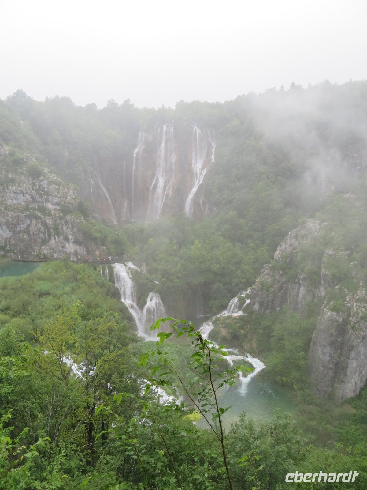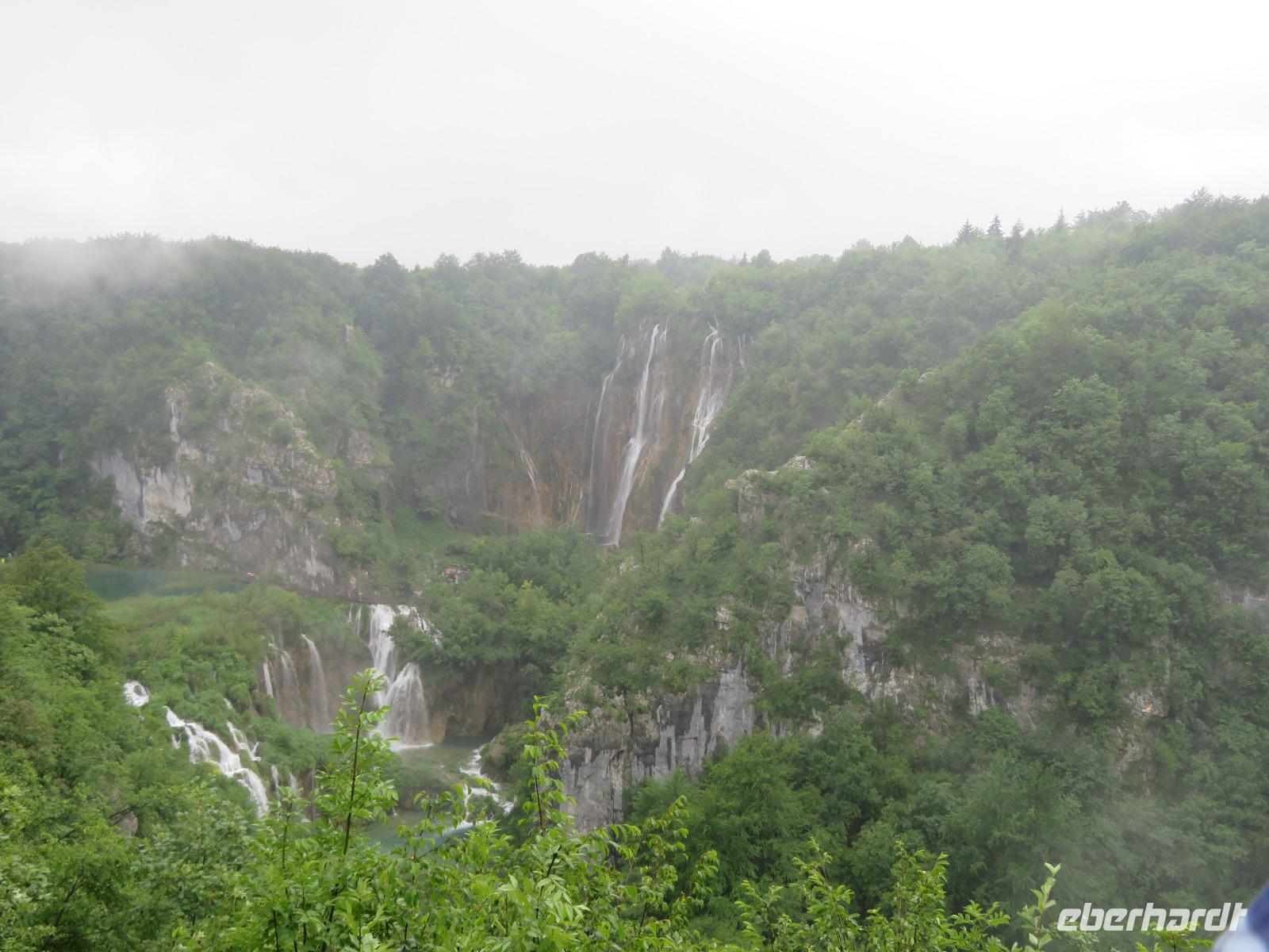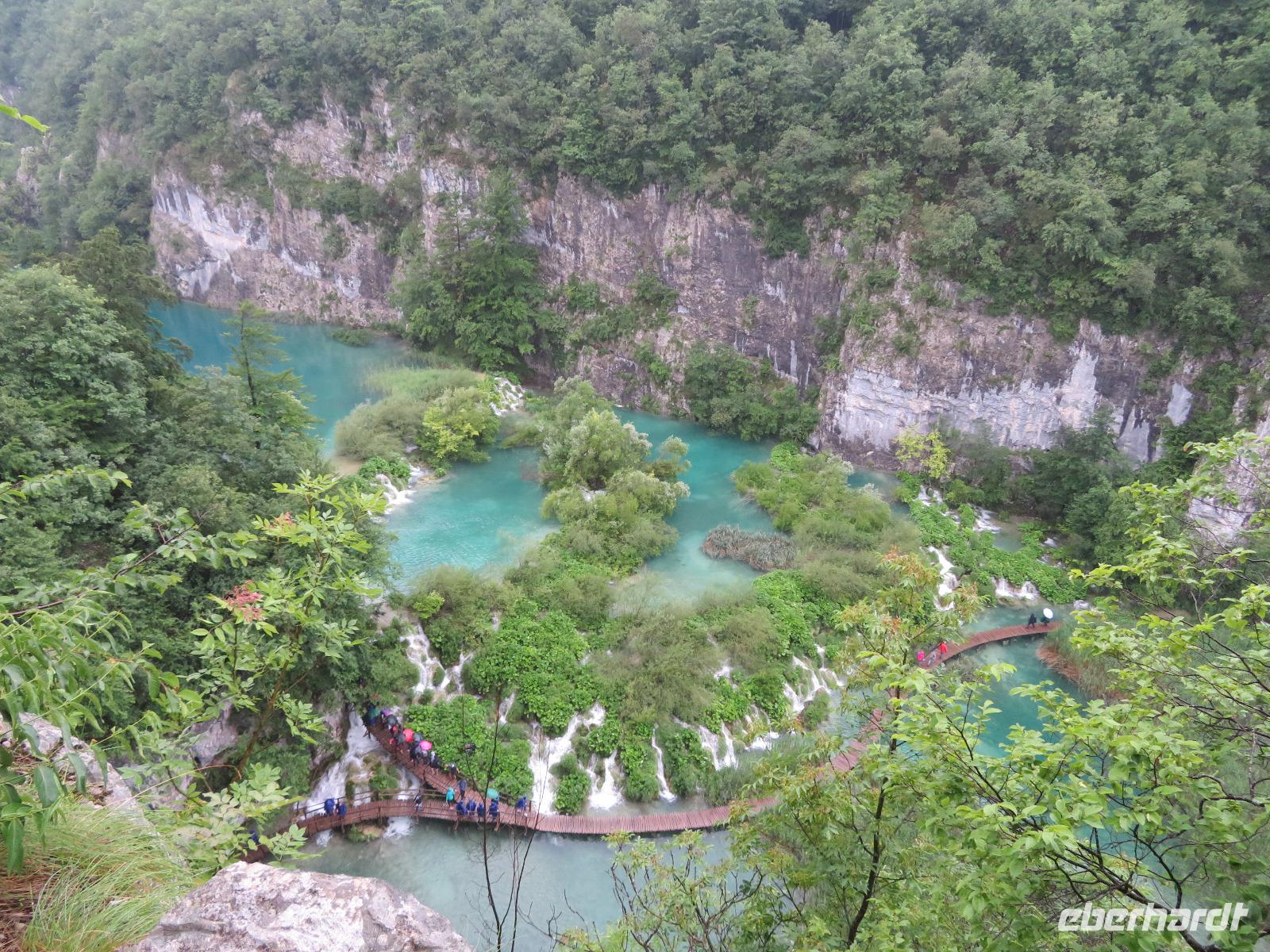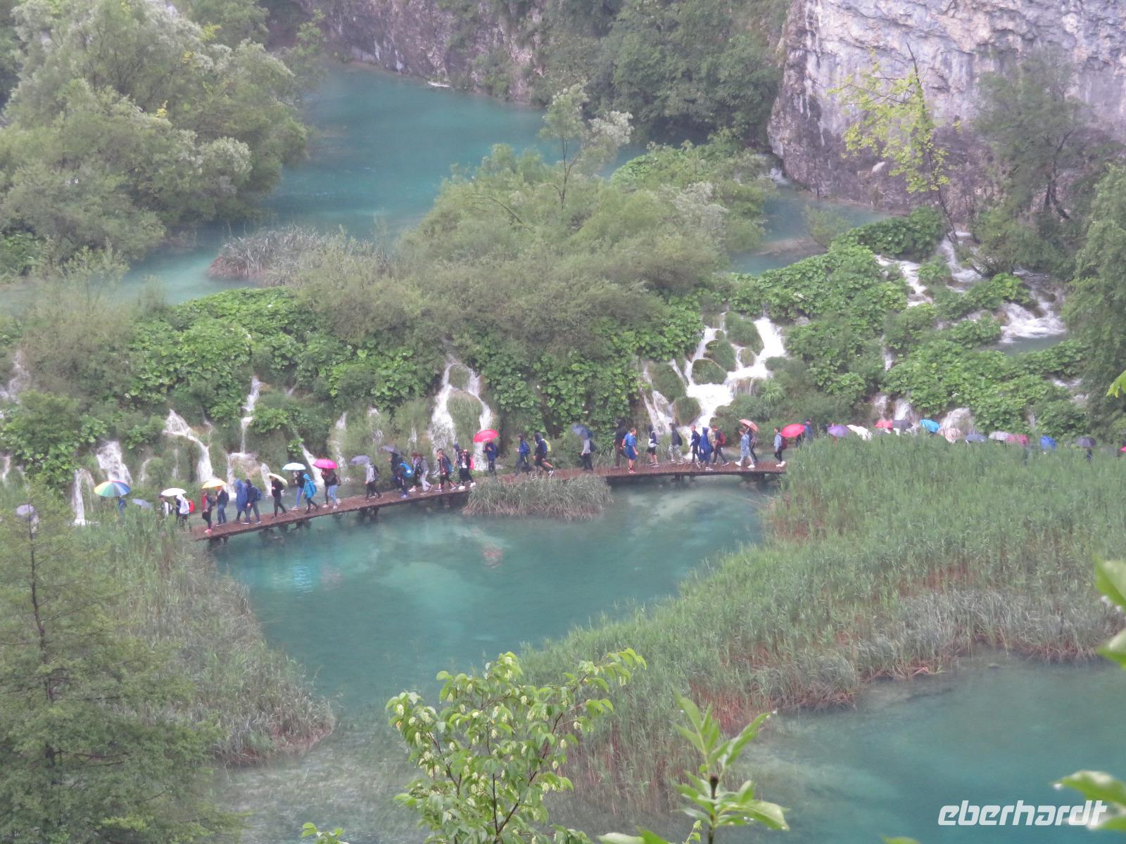 Der heutige Ausflug war fakultativ, daher fuhr nur ein Teil der Single-Reisegruppe mit auf das Festland. Früh am Morgen ging es los, schließlich hatten wir eine 3-stündige Fahrt vor uns. Wir bemerkten auch gleich, dass es heute windiger war, als die Tage zuvor. Es war zwar eine schwache Version des bekannten Bora-Windes, doch der Bus wurde trotzdem ordentlich geschüttelt. Auch hatten wir Glück, denn die Bogenbrücke auf das Festland wird bei starkem Wind gesperrt. Zu groß ist dann die Unfallgefahr. Kurz bevor es über zahlreiche Serpentinen über das Velebit-Gebirge ging, legten wir noch eine kleine Pause in Senj ein und konnten dort die starken Winde über dem Wasser und den Wolken über den Bergen beobachten. Ein wirklich faszinierendes Schauspiel. Als wir über dem Gebirgskamm fuhren, verschlechterte sich leider das Wetter für den gesamten Tag. Veljko erzählte uns über Landwirtschaft, wilde Tiere in den Wäldern und auch über den Krieg. Wir fuhren durch einen Ort, an dem man immer noch zahlreiche Zerstörungen an den Häuserfronten erkennen konnte. Auch dieser Teil der Geschichte gehört zu Kroatien, doch waren wir alle etwas sprachlos und schauten die vorbeiziehenden Landschaften an. Bei regnerischem Wetter erreichten wir den Nationalpark der Plitwitzer Seen. Er ist mit seinen 300 Quadratkilometern der größte von insgesamt acht Nationalparks. Wir kauften uns Regenponchos und stapften los. Schon der erste Blick über die grüne dampfende Waldlandschaft mit einem riesigen Wasserfall in der Mitte, versetzte uns ins Staunen. Immer wieder entdeckten wir neue, noch schönere Aussichten zu den türkisblauen Seen mit kleinen Wasserfällen, durchzogen von zahlreichen Holzstegen. Kennzeichnend für den Nationalpark sind die zahlreichen Kaskaden und die erwähnten Wasserfälle, die die einzelnen Seen miteinander verbinden. Um ein wenig abzukürzen fuhren wir ein Stück mit der Parkbahn und mit Booten. Dann ging es zu Weilen recht abenteuerlich über Wege mit Holzplanken. Natürlich ohne Geländer. Trotz des recht ungünstigen Wetters waren viele Besucher in dem Park unterwegs. Nach einer gut dreistündigen interessanten Besichtigungstour traten wir den Rückweg an und hielten unterwegs in einem Dorf, wo wir verschiedene Liköre, Käsesorten und Honig kosten und auch kaufen konnten.