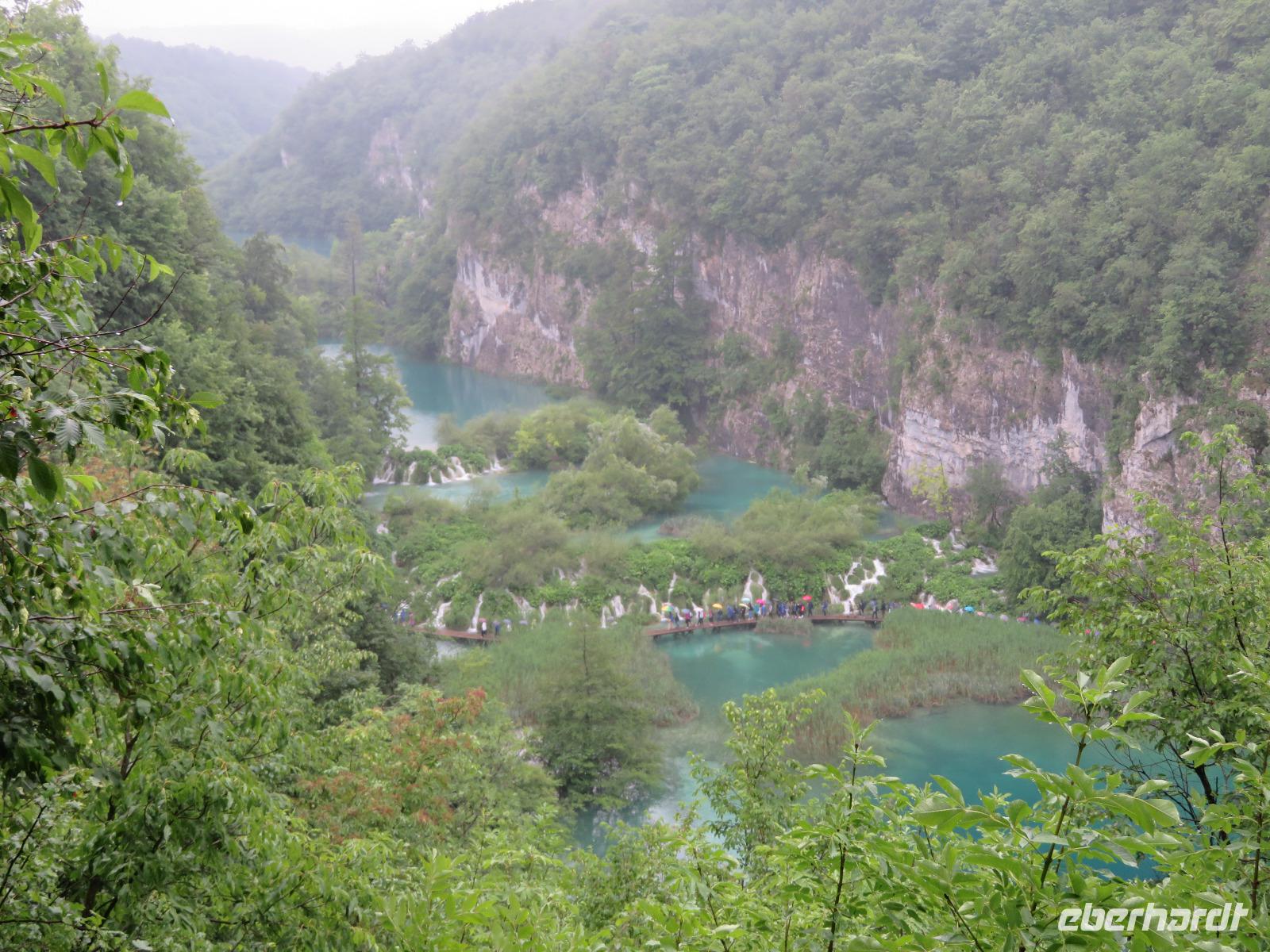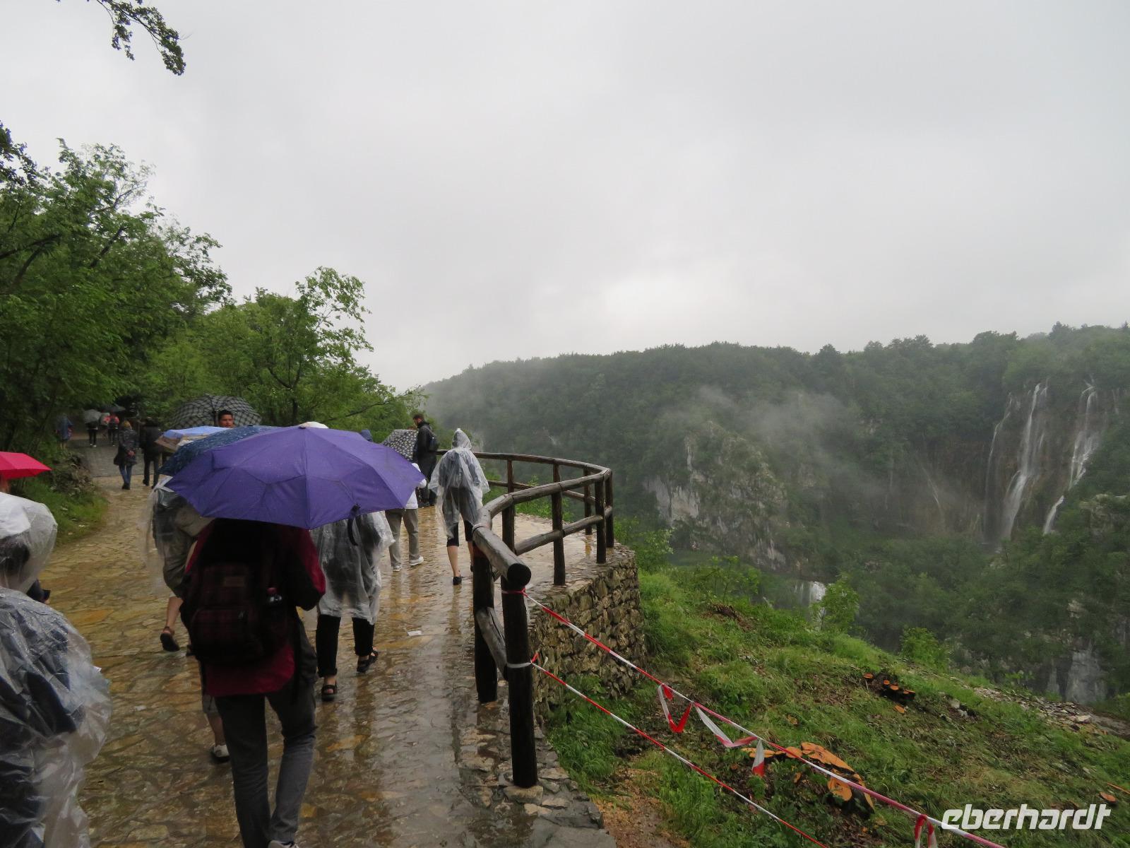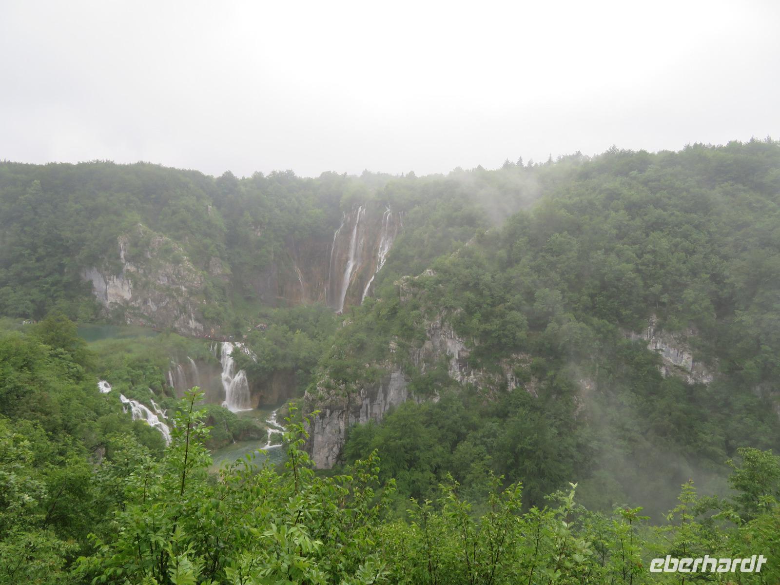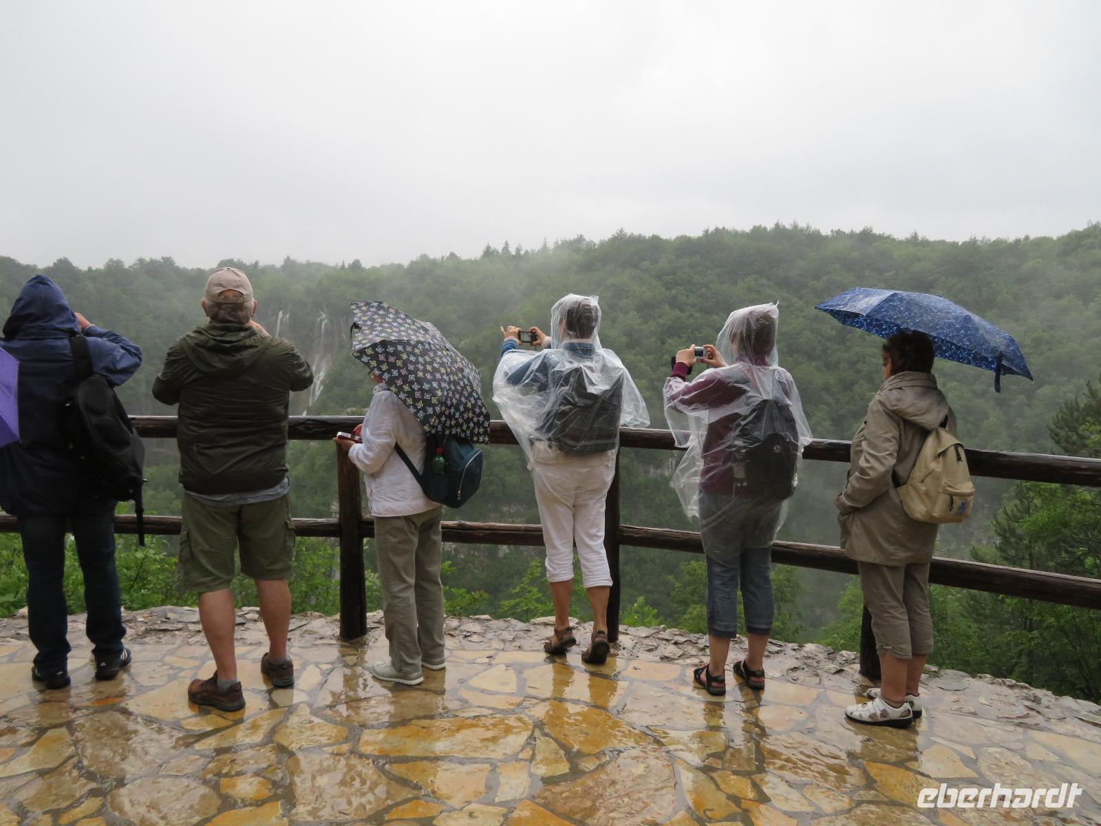 Der heutige Ausflug war fakultativ, daher fuhr nur ein Teil der Single-Reisegruppe mit auf das Festland. Früh am Morgen ging es los, schließlich hatten wir eine 3-stündige Fahrt vor uns. Wir bemerkten auch gleich, dass es heute windiger war, als die Tage zuvor. Es war zwar eine schwache Version des bekannten Bora-Windes, doch der Bus wurde trotzdem ordentlich geschüttelt. Auch hatten wir Glück, denn die Bogenbrücke auf das Festland wird bei starkem Wind gesperrt. Zu groß ist dann die Unfallgefahr. Kurz bevor es über zahlreiche Serpentinen über das Velebit-Gebirge ging, legten wir noch eine kleine Pause in Senj ein und konnten dort die starken Winde über dem Wasser und den Wolken über den Bergen beobachten. Ein wirklich faszinierendes Schauspiel. Als wir über dem Gebirgskamm fuhren, verschlechterte sich leider das Wetter für den gesamten Tag. Veljko erzählte uns über Landwirtschaft, wilde Tiere in den Wäldern und auch über den Krieg. Wir fuhren durch einen Ort, an dem man immer noch zahlreiche Zerstörungen an den Häuserfronten erkennen konnte. Auch dieser Teil der Geschichte gehört zu Kroatien, doch waren wir alle etwas sprachlos und schauten die vorbeiziehenden Landschaften an. Bei regnerischem Wetter erreichten wir den Nationalpark der Plitwitzer Seen. Er ist mit seinen 300 Quadratkilometern der größte von insgesamt acht Nationalparks. Wir kauften uns Regenponchos und stapften los. Schon der erste Blick über die grüne dampfende Waldlandschaft mit einem riesigen Wasserfall in der Mitte, versetzte uns ins Staunen. Immer wieder entdeckten wir neue, noch schönere Aussichten zu den türkisblauen Seen mit kleinen Wasserfällen, durchzogen von zahlreichen Holzstegen. Kennzeichnend für den Nationalpark sind die zahlreichen Kaskaden und die erwähnten Wasserfälle, die die einzelnen Seen miteinander verbinden. Um ein wenig abzukürzen fuhren wir ein Stück mit der Parkbahn und mit Booten. Dann ging es zu Weilen recht abenteuerlich über Wege mit Holzplanken. Natürlich ohne Geländer. Trotz des recht ungünstigen Wetters waren viele Besucher in dem Park unterwegs. Nach einer gut dreistündigen interessanten Besichtigungstour traten wir den Rückweg an und hielten unterwegs in einem Dorf, wo wir verschiedene Liköre, Käsesorten und Honig kosten und auch kaufen konnten.