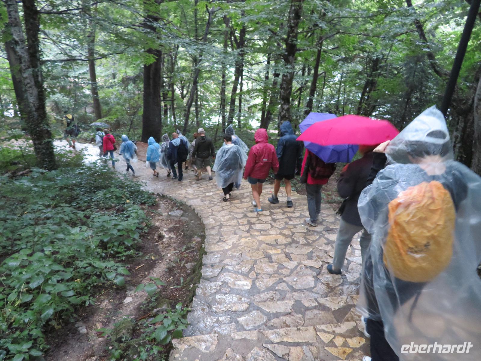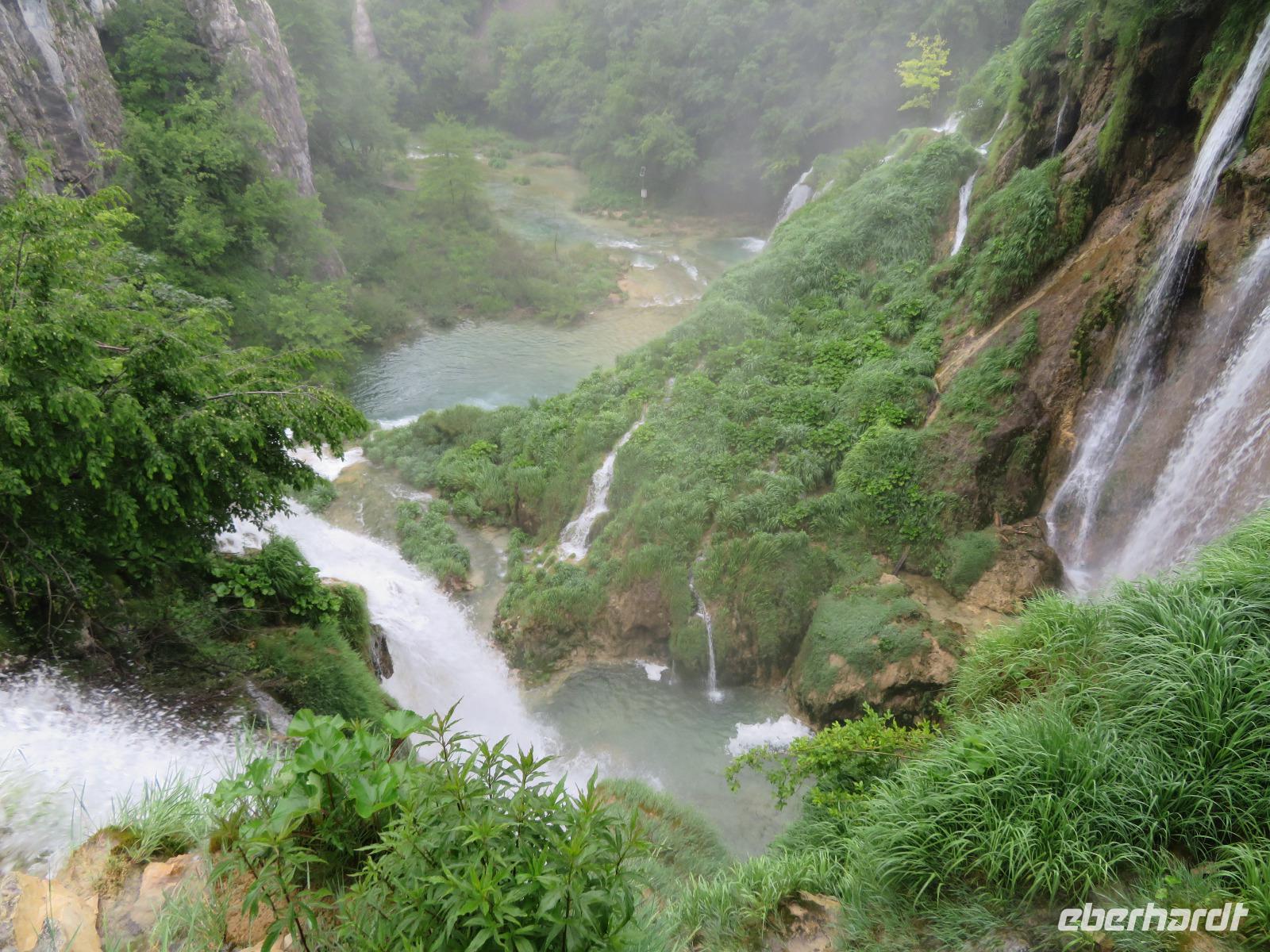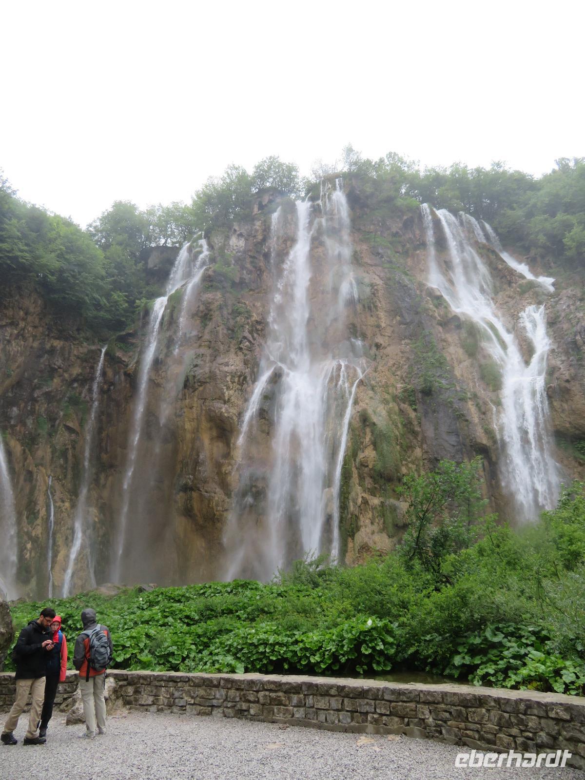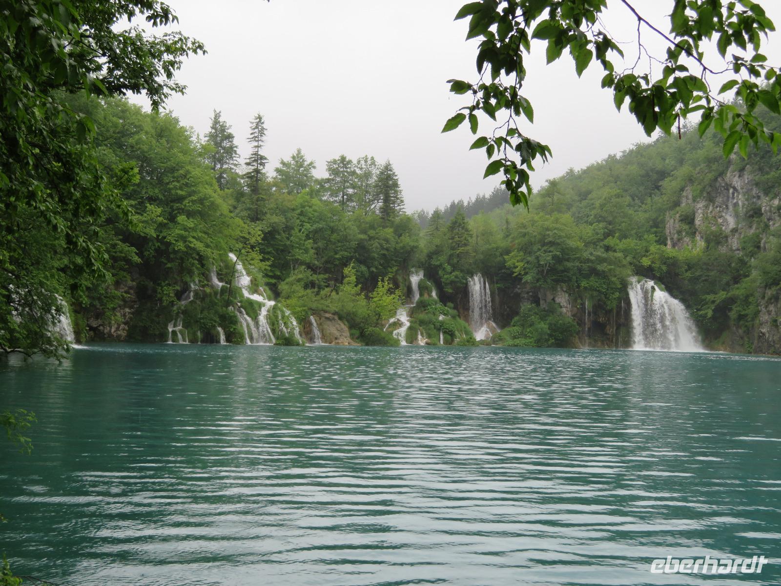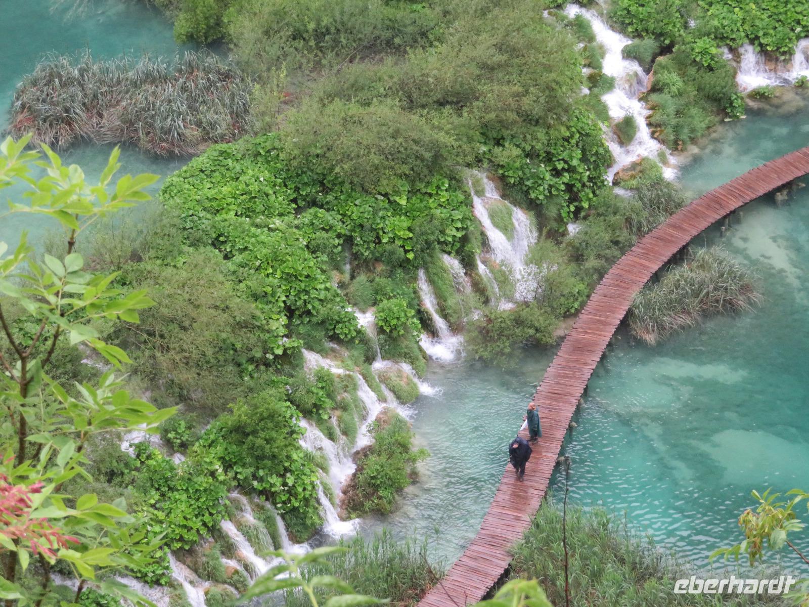 Der heutige Ausflug war fakultativ, daher fuhr nur ein Teil der Single-Reisegruppe mit auf das Festland. Früh am Morgen ging es los, schließlich hatten wir eine 3-stündige Fahrt vor uns. Wir bemerkten auch gleich, dass es heute windiger war, als die Tage zuvor. Es war zwar eine schwache Version des bekannten Bora-Windes, doch der Bus wurde trotzdem ordentlich geschüttelt. Auch hatten wir Glück, denn die Bogenbrücke auf das Festland wird bei starkem Wind gesperrt. Zu groß ist dann die Unfallgefahr. Kurz bevor es über zahlreiche Serpentinen über das Velebit-Gebirge ging, legten wir noch eine kleine Pause in Senj ein und konnten dort die starken Winde über dem Wasser und den Wolken über den Bergen beobachten. Ein wirklich faszinierendes Schauspiel. Als wir über dem Gebirgskamm fuhren, verschlechterte sich leider das Wetter für den gesamten Tag. Veljko erzählte uns über Landwirtschaft, wilde Tiere in den Wäldern und auch über den Krieg. Wir fuhren durch einen Ort, an dem man immer noch zahlreiche Zerstörungen an den Häuserfronten erkennen konnte. Auch dieser Teil der Geschichte gehört zu Kroatien, doch waren wir alle etwas sprachlos und schauten die vorbeiziehenden Landschaften an. Bei regnerischem Wetter erreichten wir den Nationalpark der Plitwitzer Seen. Er ist mit seinen 300 Quadratkilometern der größte von insgesamt acht Nationalparks. Wir kauften uns Regenponchos und stapften los. Schon der erste Blick über die grüne dampfende Waldlandschaft mit einem riesigen Wasserfall in der Mitte, versetzte uns ins Staunen. Immer wieder entdeckten wir neue, noch schönere Aussichten zu den türkisblauen Seen mit kleinen Wasserfällen, durchzogen von zahlreichen Holzstegen. Kennzeichnend für den Nationalpark sind die zahlreichen Kaskaden und die erwähnten Wasserfälle, die die einzelnen Seen miteinander verbinden. Um ein wenig abzukürzen fuhren wir ein Stück mit der Parkbahn und mit Booten. Dann ging es zu Weilen recht abenteuerlich über Wege mit Holzplanken. Natürlich ohne Geländer. Trotz des recht ungünstigen Wetters waren viele Besucher in dem Park unterwegs. Nach einer gut dreistündigen interessanten Besichtigungstour traten wir den Rückweg an und hielten unterwegs in einem Dorf, wo wir verschiedene Liköre, Käsesorten und Honig kosten und auch kaufen konnten.