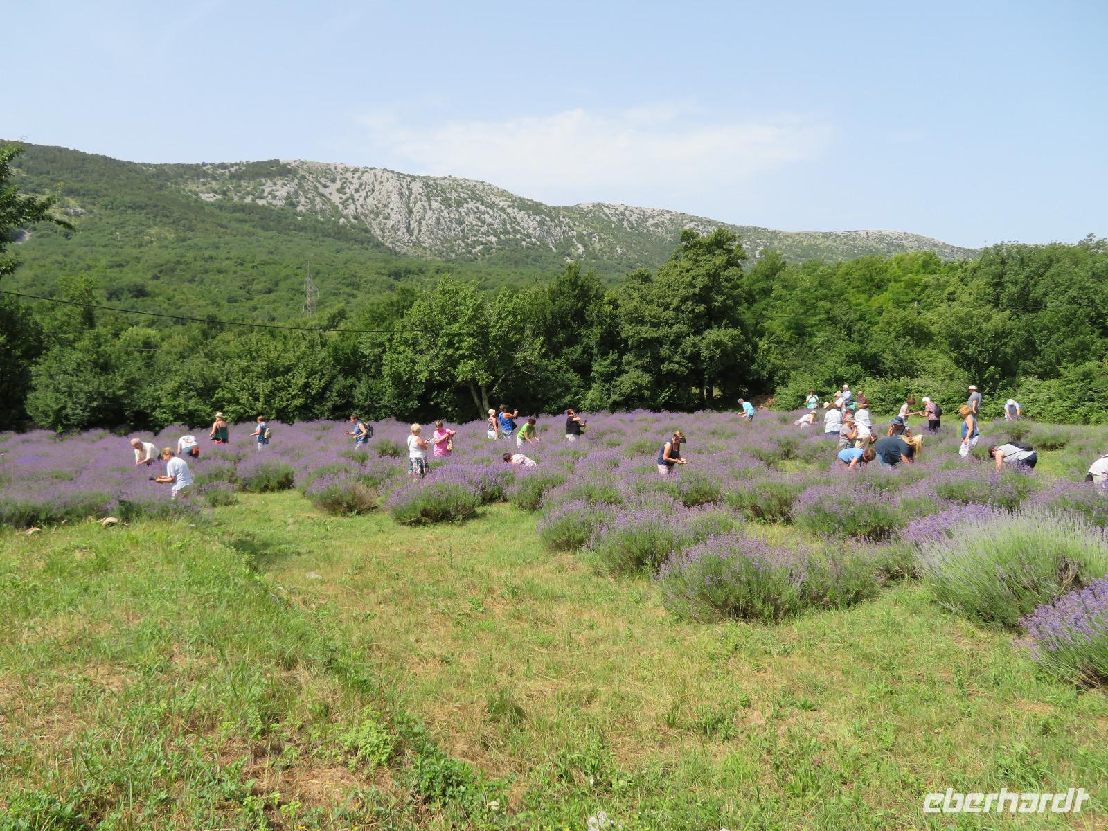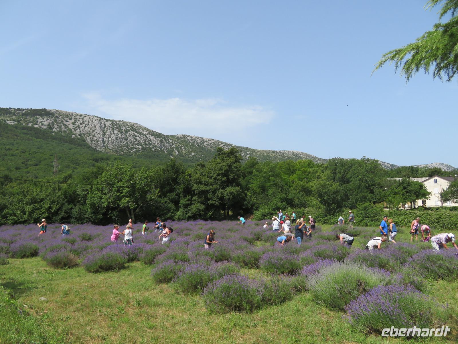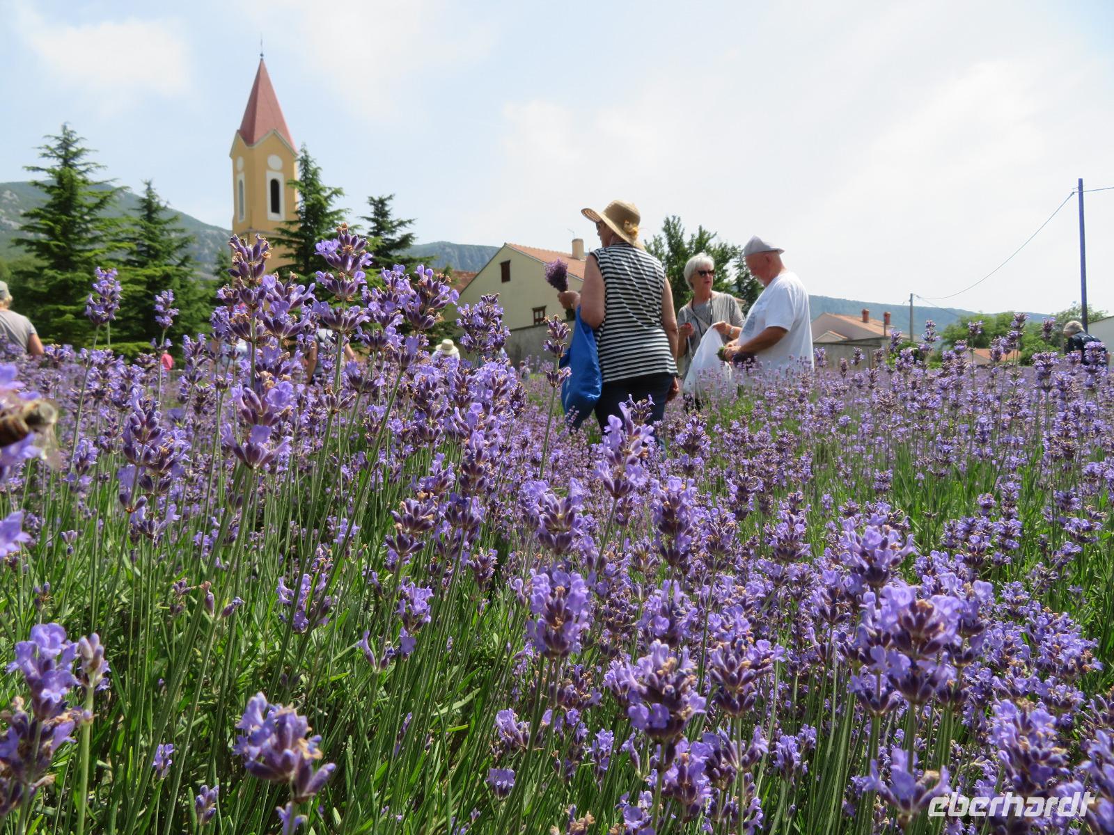 Nach einem guten Frühstück startete unser Ausflug in das Weintal Vinodol. Wir fuhren wieder von der Insel auf das Festland und Veljko erzählte über die Besonderheit des Lavendels und der kroatischen Weine. Wir fuhren ein Stück entlang der adriatischen Magistrale und kamen im kleinen Dorf Tribalj an. Dort trafen wir unter anderem auf seinen Bruder, der ebenfalls mit Gästen unterwegs zur Lavendelernte war. Tatjana, die Besitzerin des Lavendelfeldes, begrüßte uns herzlich ... natürlich mit einem kleinen Salbeischnaps. Wir nahmen Platz und lauschten gespannt den Ausführungen von Tatkjana und Veljkos Bruder, die uns viele Informationen zum Anbau und Nutzen des vielfältig einsetzbaren Lavendels gaben. Nach einer kleinen Erfrischungspause konnten wir nun an die Arbeite gehen. Endlich konnten wir unser eigenes Lavendelsträußchen für zu Hause abschneiden. Und wer wollte, auch zwei oder drei. Und wie jeder fleißige Feldarbeiter, brauchten auch wir anschließend eine kleine Stärkung. Wir fuhren nach Crikvenica und genossen ein leckeres 3-Gang-Menü auf einer Restaurant-Terrasse mit einem schönen Blick auf das adriatische Meer. Wer baden oder shoppen gehen wollte, konnte dies in der anschließenden Freizeit machen. Wieder zurück in Malinska, verabschiedeten wir unseren Busfahrer Christian und trafen uns abends auf der Hotelterrasse zur Besprechung des nächsten Tages.