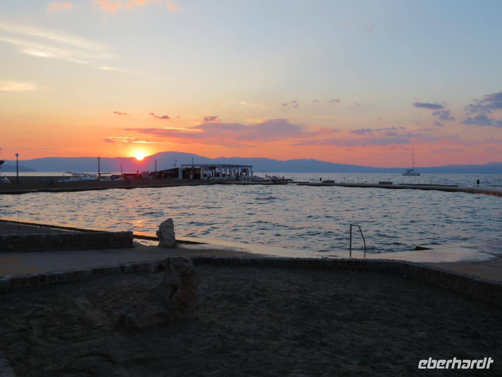 Der frühe Vogel fängt den Wurm - allerdings waren wir am heutigen Tag so zeitig unterwegs, dass alle Vögel wahrscheinlich noch schliefen. 4:30 Uhr legte unser Katamaran vom Vortag ab und schipperte mit uns auf das Meer hinaus. Nach dem ersten Kaffee mit Schokocroissant wurden wir munter und warteten gespannt auf die ersten Sonnenstrahlen. Durch ein paar Wolken über dem Velebit-Gebirge gestaltete sich der Aufgang etwas spannend aber dann endlich war sie da. Wir stießen auf den neuen Tag mit einer Runde Sekt an und genossen die warmen Sonnenstrahlen im Gesicht. Pünktlich zum Frühstück waren wir wieder im Hotel. Gestärkt treffen sich einige Gäste, um erneut eine Fahrt nach Rijeka zu unternehmen, andere fuhren zum Städtchen Krk, gingen spazieren oder genossen den letzten Tag am Meer. Am frühen Abend trafen wir uns alle wieder auf der Hotelterrasse, stießen gemeinsam auf die vergangenen Tage an und bedankten uns bei unserem netten Reiseleiter Viljko. Den Abschluss bildete ein vorzügliches Abendessen im hoteleigenen Strandrestaurant mit einem wundervollen Blick auf das Meer. Am Ende schauten wir noch gemeinsam das WM-Spiel Kroatien gegen Nigeria.