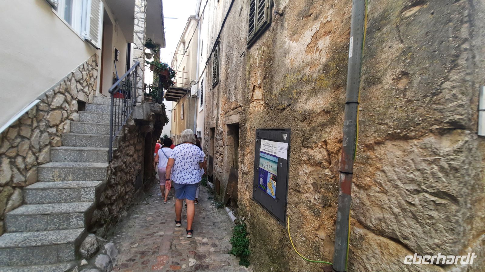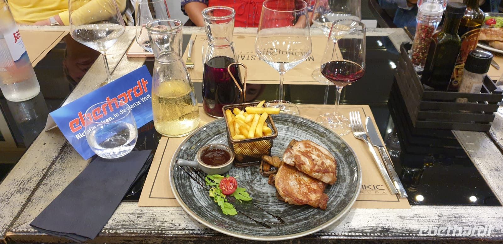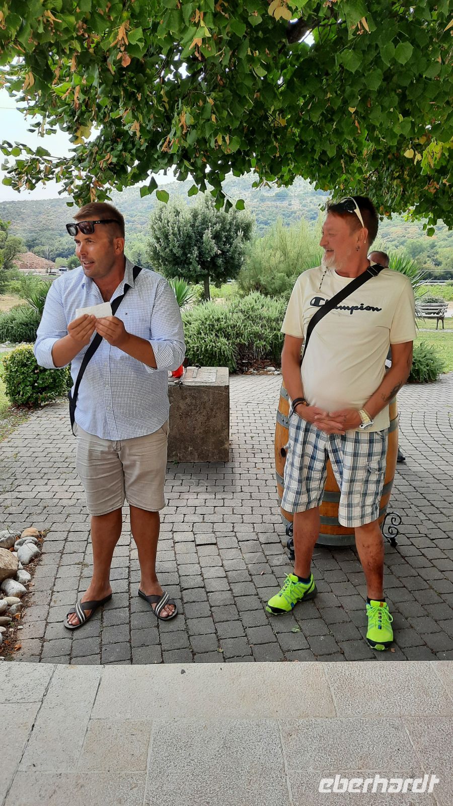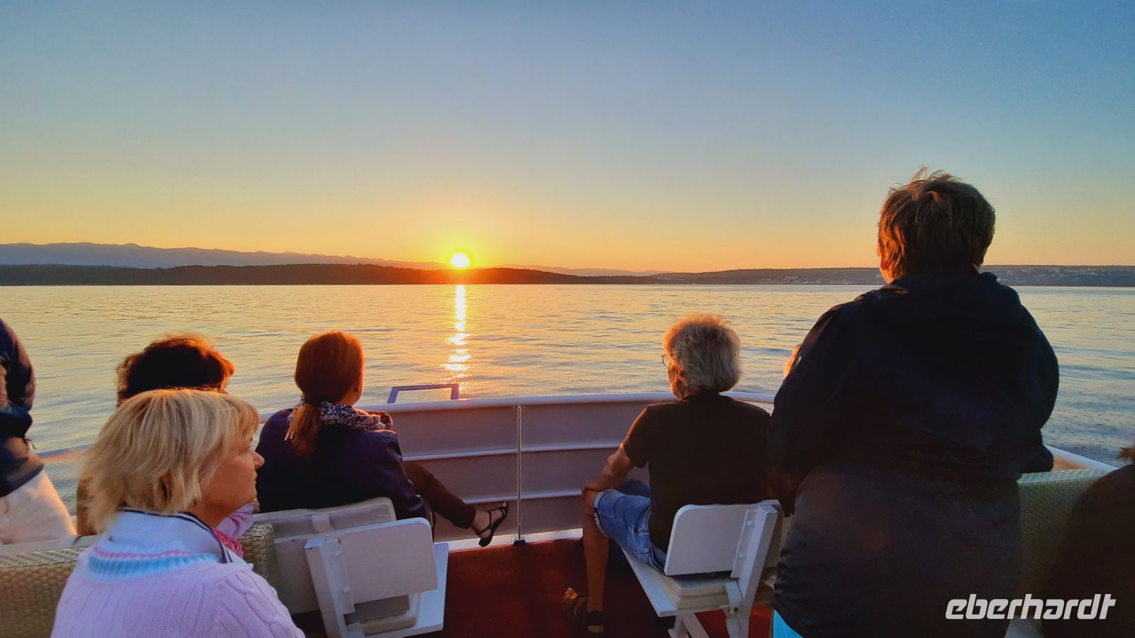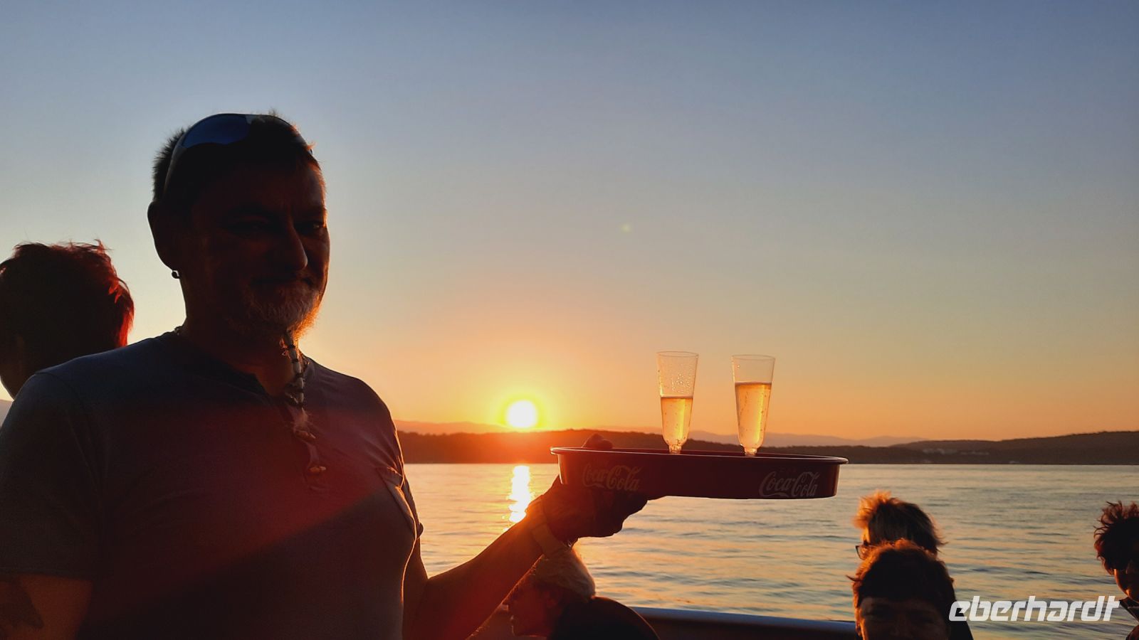 Der frühe Vogel fängt den Wurm - allerdings waren wir am heutigen Tag so zeitig unterwegs, dass alle Vögel wahrscheinlich noch schliefen. 6 Uhr legte unser Katamaran am Hotel ab und schipperte mit uns auf das Meer hinaus. Nach dem ersten Kaffee mit Schoko-Croissant wurden wir munterer und warteten gespannt auf die ersten Sonnenstrahlen. Durch ein paar kleine Wolken über dem Velebit-Gebirge gestaltete sich der Aufgang etwas spannend aber dann endlich war sie da. Wir stießen auf den neuen Tag mit einer Runde Sekt an und genossen die warmen Sonnenstrahlen im Gesicht. Pünktlich zum Frühstück waren wir wieder im Hotel. Anschließend trafen wir uns mit Tomy und Branko vor dem Hotel und fuhren nach Krk-Stadt. Auf dem Weg nach Krk erklärte uns Tomy die Inseln und Geschichte, wie die Kroaten entstanden sind. Insgesamt gibt es 1.242 Inseln, Eiland und Klippen und davon sind nur ganze 67 Inseln bewohnt. Wir schlenderten entlang des Hafens in die Altstadt und stoppten einige Male, um den Ausführungen unseres lieben Reiseleiters zu folgen. So entdeckten wir eine alte Waschstelle, eine Olivenölpresse, die 24-stündige Uhr am Rathaus, kleine urige Gassen, einen tollen Eisladen und das Kastell mit seinen mächtigen Mauern und dem Frakopaner-Turm. Als unsere Besichtigungsrunde beendet war, konnten wir bei ein wenig Freizeit die kleinen Gassen auf eigene Faust erkunden und ein paar Souvenirs für die Lieben zu Hause erstehen. Unser Ausflug führte uns anschließend nach Vrbnik. Unterwgs erklärt uns Tomy die Besonderheit der britischen Schafe, die im Meer trinken und über Olivenbäume. Wir sehen den größten privaten Hafen in Punat und eine kleine vorgelagerte Klosterinsel, wo noch immer Franziskanermönche leben. Wir fuhren durch das größte Weingebiet der Insel und erfuhren die Unterschiede der verschiedenen angebauten Weine. In Vrbnik angekommen, bummelten wir gemeinsam durch die Altstadt und konnten herrliche Ausblicke auf die Küste genießen. Tomy ließ es sich auch nicht nehmen, uns auch die schmalste Gasse von ganz Kroatien zu zeigen. Nach diesen Anstrengungen, mussten wir uns wieder stärken. In einem örtlichen Restaurant erlebten wir eine Weinverkostung mit kulinarischen Spezialitäten. Wir ließen uns den getrockneten Schinken und Käse schmecken und probierten die verschiedenen Weine. Anschließend konnte man sagen, dass wir zum Lachen in den Keller gingen...denn da gab es noch so einigen landestypischen Schnaps zum testen. Gut gelaunt mit einigem Wein im Gepäck fuhren wir zurück zum Hotel und ließen die Seele bis zum Abendessen baumeln. Den gemeinsamen Abend verbrachten wir gesellig auf der großen Hotelterrasse.