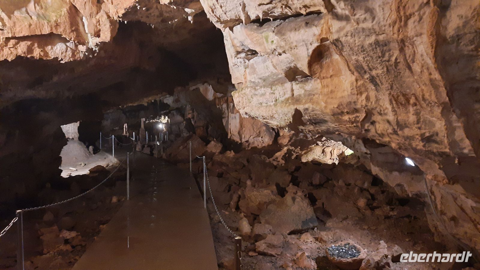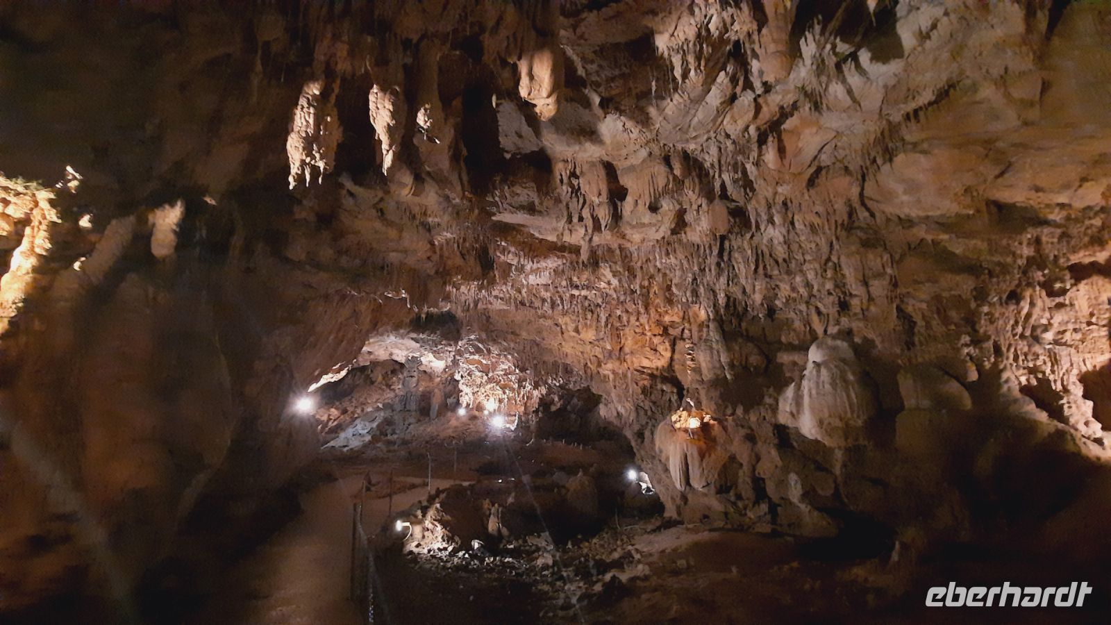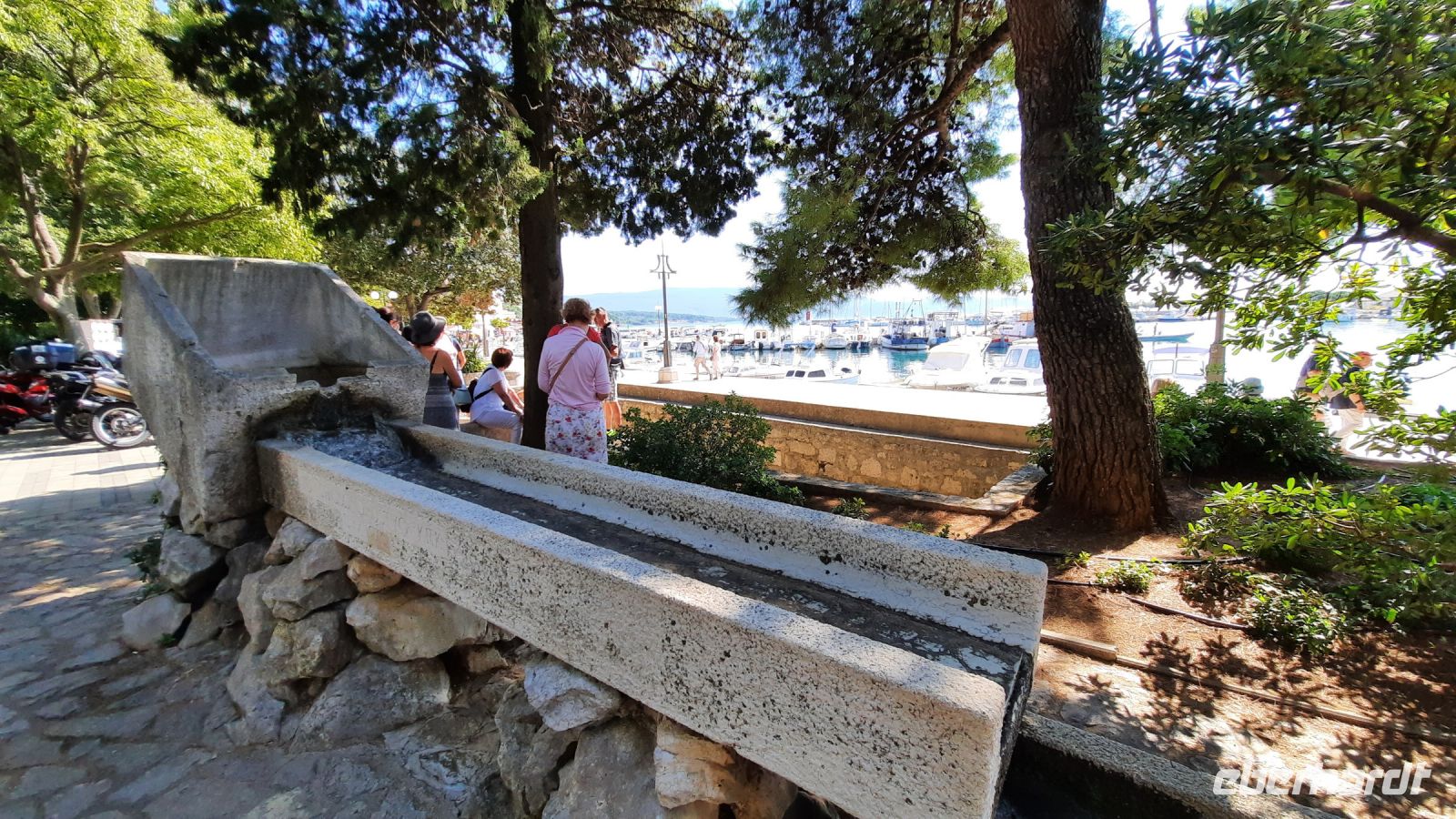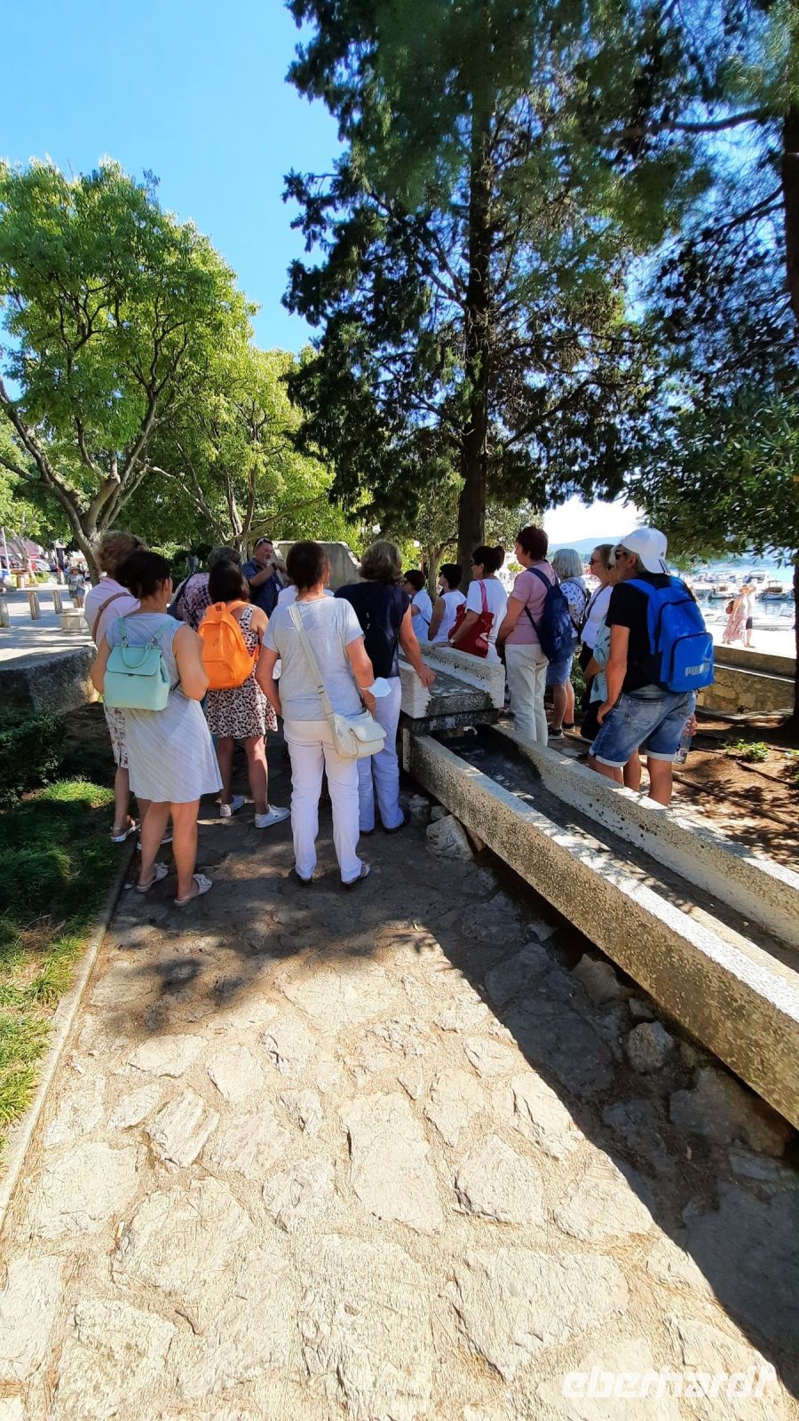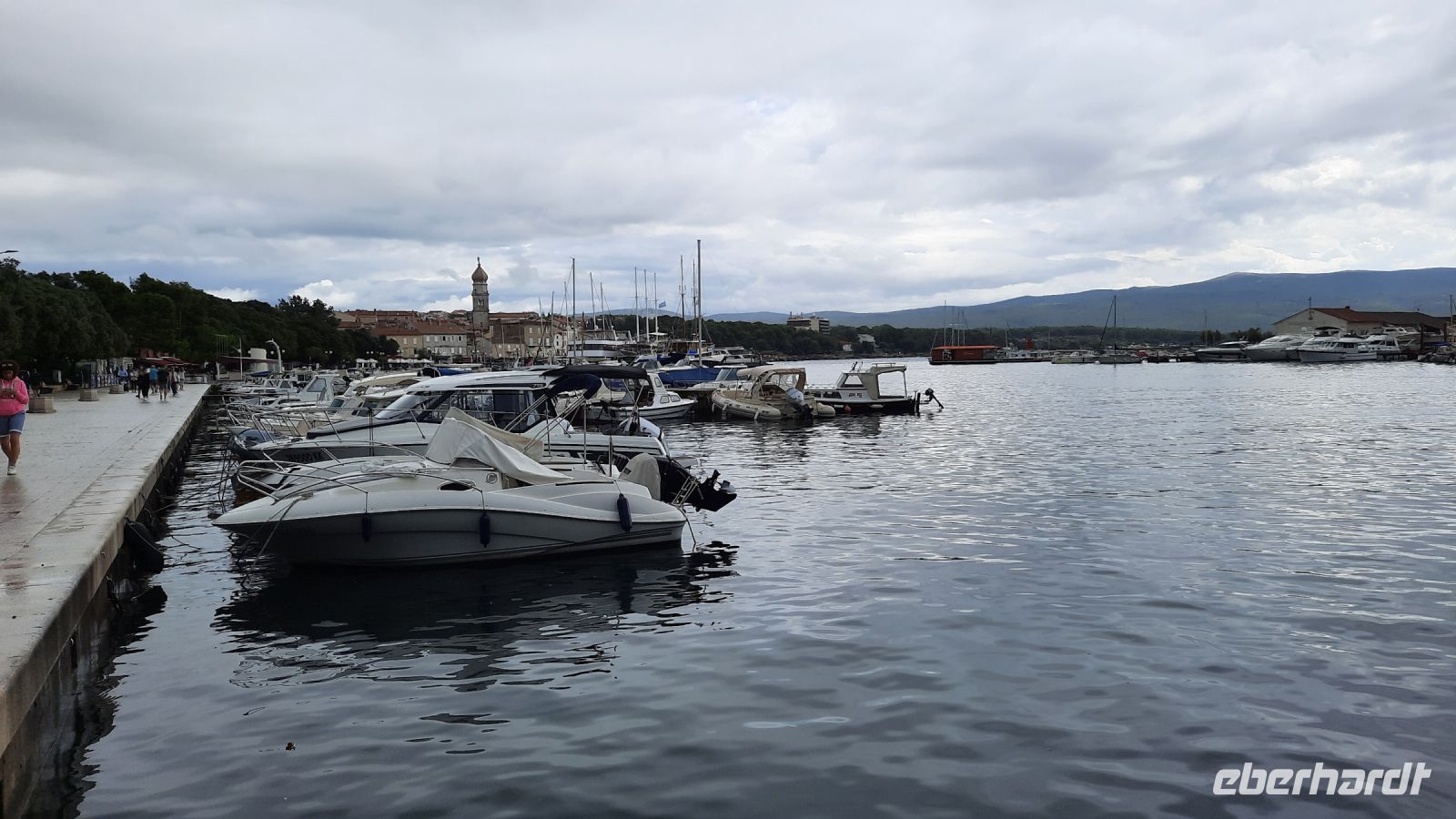 Am Morgen genossen wir das reichhaltige Frühstücksbuffet und trafen uns anschließend mit Reiseleiter Tomy und Busfahrer Branko zum Start in den Ausflug des Tages. Wir verließen die Insel Krk über die große geschwungene Brücke Krki most auf das Festland. Es sollte heute wieder sehr warm werden, doch da wir auf dem Weg in die grüne Lunge Kroatiens waren, konnten wir uns über angenehme Temperaturen freuen. Auf dem Weg nach Fuzine erfuhren wir mehr über Kroatiens Währung, die Bedeutung der Farben der Landesflagge, die zahlreichen Bundesländer, den Export von Gesteinen, kroatischen Marmor und den Karstabbau. Auch erfuhren wir, dass die Kroaten sehr stolz auf ihre Wildtiere, im Besonderen die Bären sind. Über 330 registrierte Braunbären gibt es in Kroatien! Tomy erläuterte ebenso die Besonderheiten der Geologie in Istrien, sodass wir optimal auf den Höhlenbesuch in Fuzine vorbereitet waren. In dem kleinen Bergdorf angekommen, fuhren wir zur Grotte Vreno, die einzige touristische Grotte, durch die Grundwasser fließt. Nicht nur die unterschiedlichen Tropfsteinformen überraschten uns, sondern auch die kühlen Temperatur. Erstaunt erfuhren wir, dass die neueren Verfilmungen der Winnetou-Filme zum Teil in dieser Höhle gedreht wurden. Ein überdimensioniertes Relikt erinnerte die Besucher daran. Gut erfrischt kamen wir wieder aus der Grotte, fuhren zum Örtchen Fuzine und genossen den typischen Waldfrüchte-Strudel bei einem Kaffee. Hmmm, war das lecker. Wer wollte, konnte einen Spaziergang am angrenzenden See unternehmen oder Fuzine selbst unsicher machen. Auf dem Rückweg zum Hotel hielten wir noch kurz in einem Supermarkt und anschließend konnte jeder nach Lust und Laune den Nachmittag am Meer genießen. Abends trafen wir uns wieder zum gemeinsamen Abendessen und anschließend für einen kleinen Spaziergang zum Hafen.