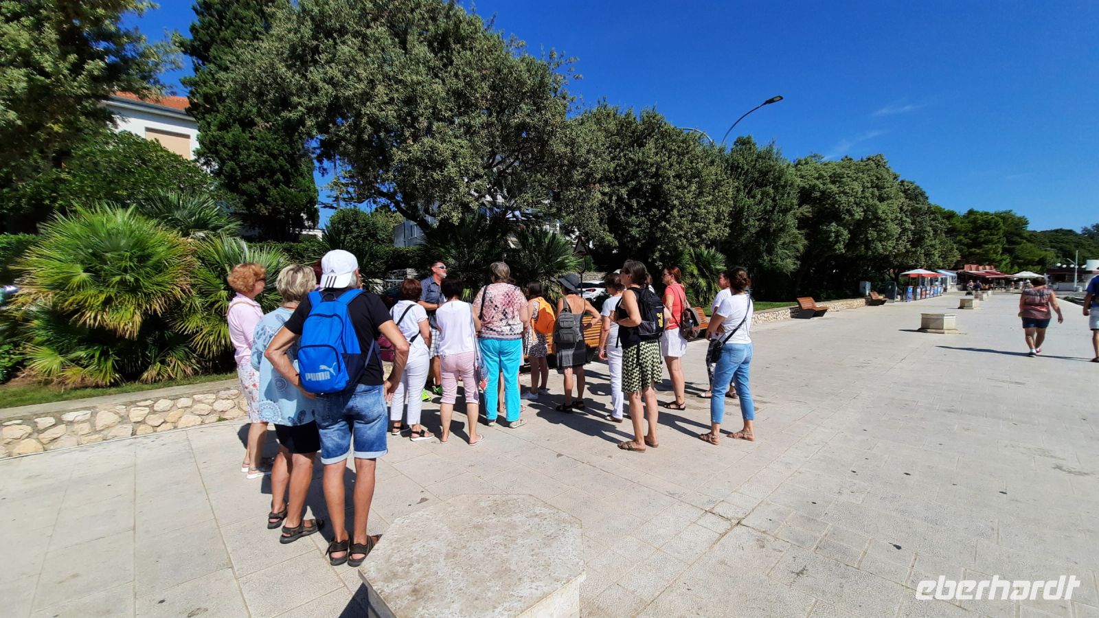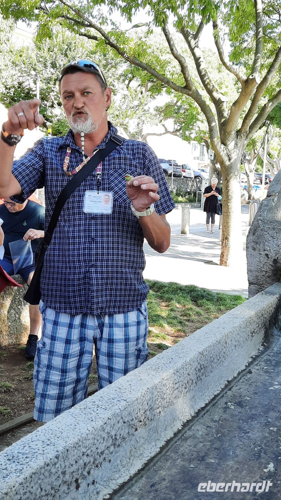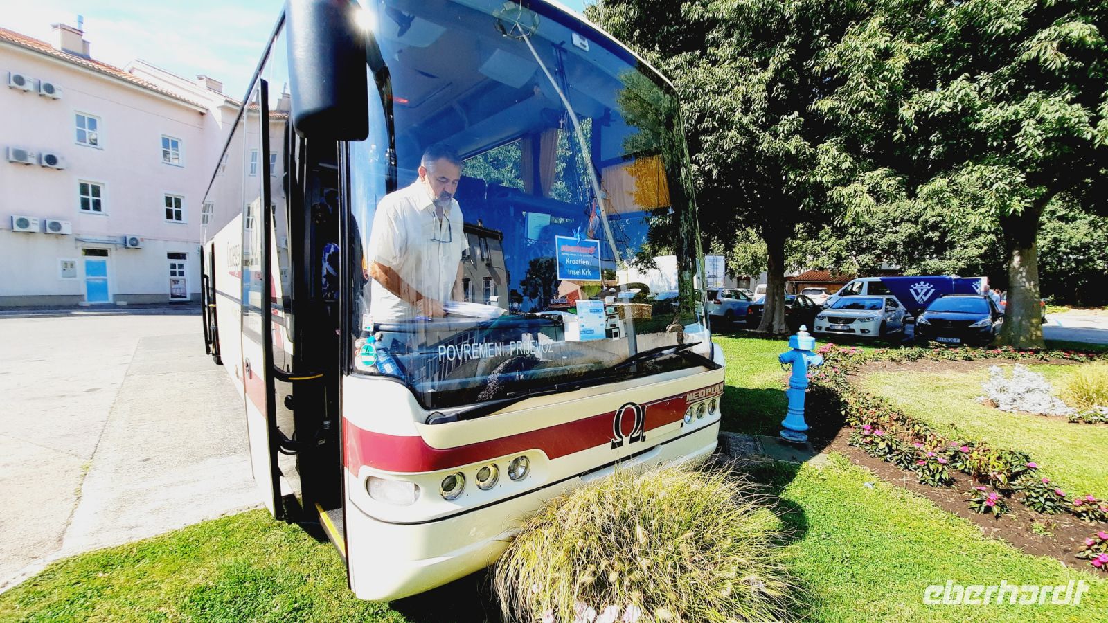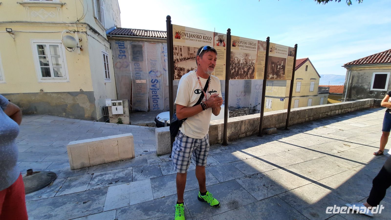 Auf nach Kroatien - zur Urlaubsinsel Krk. Der Tag begann für viele Gäste der Eberhardt-Reisegruppe sehr zeitig, kamen wir doch aus allen Ecken des Landes. Wir trafen uns am neuen Berliner Flughafen, checkten ein und freuten uns auf den Start der Reise. Nach kurzen 1 ½ Stunden Flug erreichten wir Rijeka, den winzigen Flughafen der Mittelmeerinsel. Dort erwartete uns schon unser Reiseleiter Tomy. Anscheinend bekannt, wie ein bunter Hund, brachte er Stimmung in unsere, von der langen Anreise etwas müde Gruppe. Das wird lustig, freuten wir uns. Gemeinsam fuhren wir nach Malinska, ein beschaulicher kleiner Urlaubsort in einer Bucht im Nordwesten der Insel Krk. Wir bezogen unsere Zimmer in unserem 4-Sterne-Hotel Malin und konnten den Rest des Tages bei sommerlichen Temperaturen genießen. Viele Gäste nutzten die Gelegenheit und testeten schon mal das glasklare Wasser der Adria, andere erkundeten die Gegend und tranken einen Kaffee. Bis spät in die Nacht erreichten noch sechs weitere Eberhardt-Gäste das Hotel, sodass wir am nächsten Tag vollzählig waren.