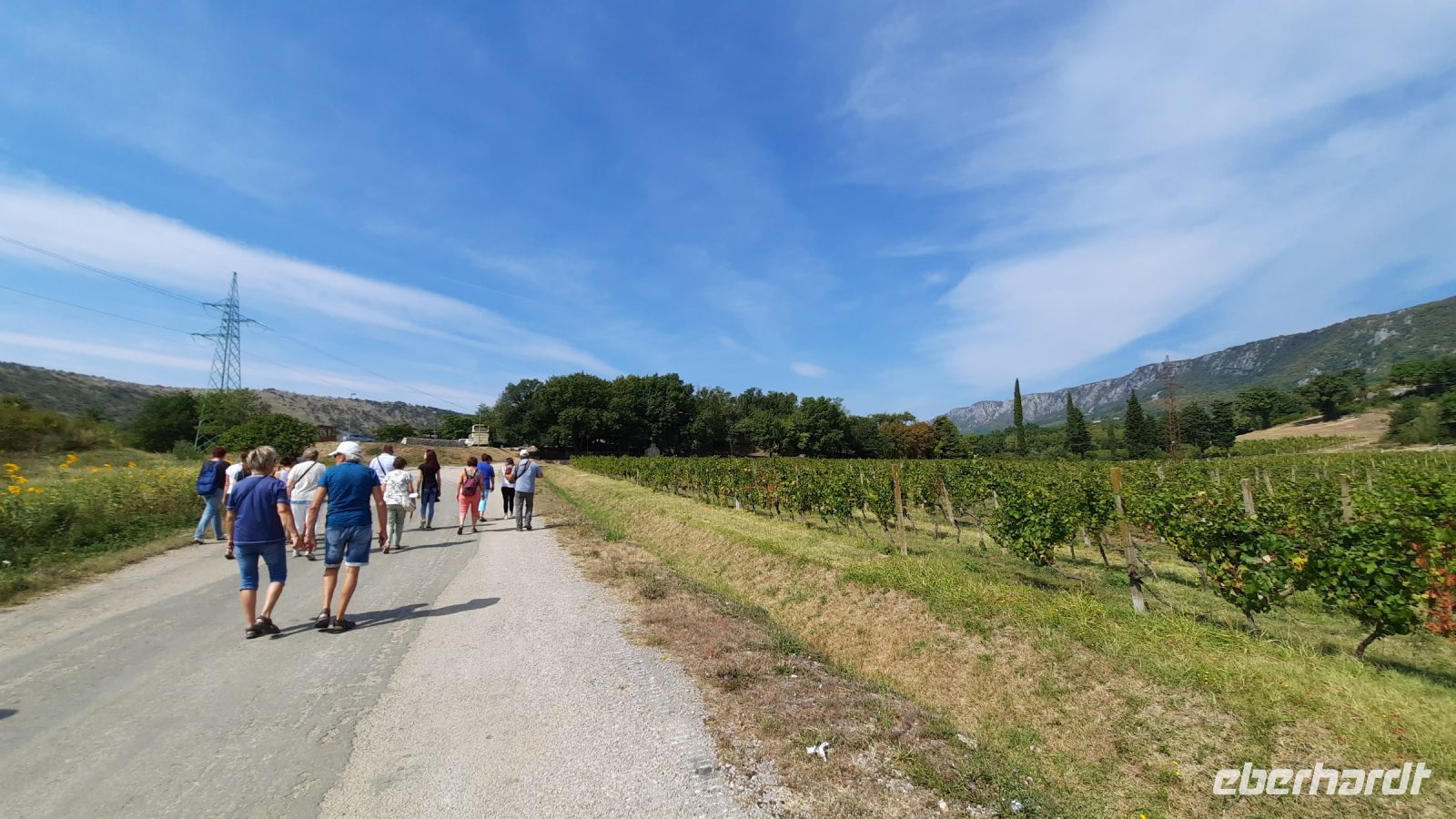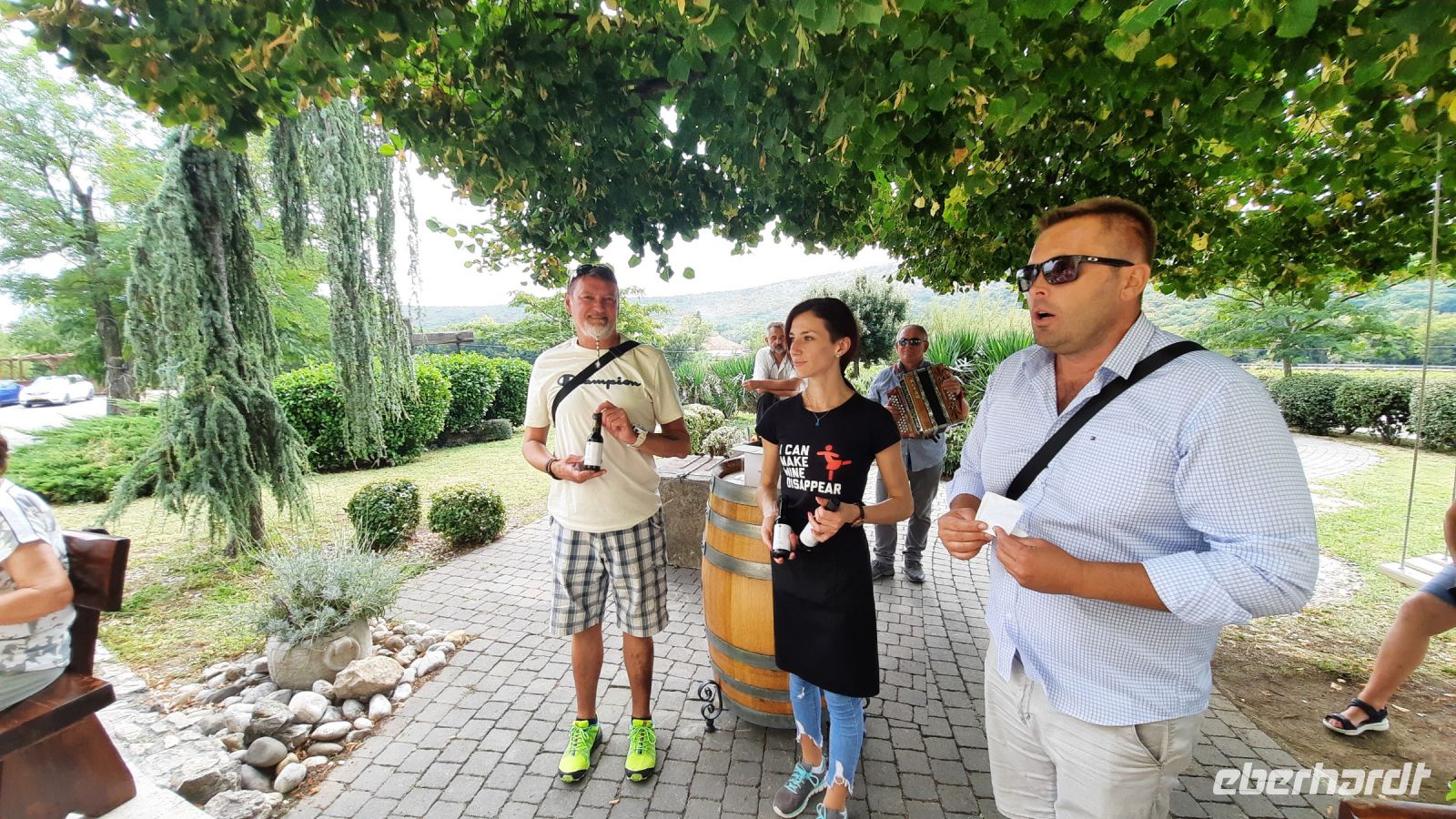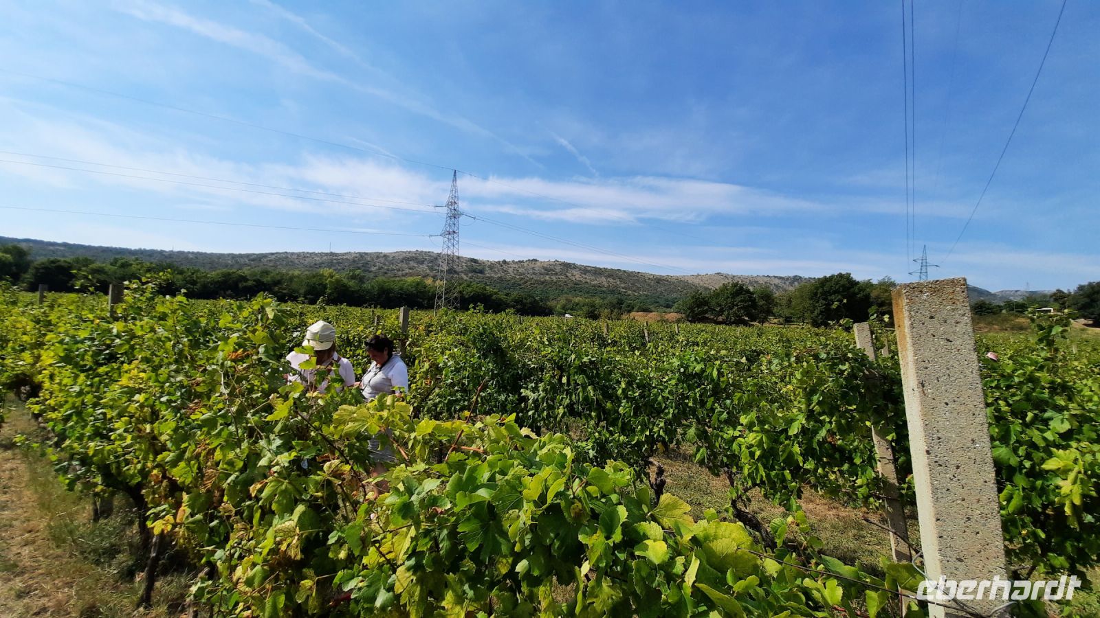 Wir starteten am Vormittag zu unserem Ausflug im Zeichen des Weines. Tomy erklärte wieder auf bekannt charmante Weise den Tag und bereitete die Gäste auf die „körperlich harte Arbeit“ vor, die ihnen bevorstand. Er erzählte außerdem über das Leben, den Verdienst und Versicherungen in Kroatien. Wir fuhren entlang der Küste, immer uns rechts begleitend, die Insel Krk. Wir fuhren vorbei an an Czribniza, wo viele Amphoren gefunden wurden. Von Tomy erfuhren wir auch über männliche und weibliche Amphoren und dass dies natürlich der Form der Form abgeleitet werden kann. Bevor wir zur Weinlese kamen, zeigte uns Tomy seine hübsche kleine Heimatstadt Novi bei einem Rundgang und wir konnten sogar Tomys Hund Alex ein paar Streicheleinheiten geben. Eine kurze Busfahrt später erreichten wir das Weinanbaugebiet, wo wir herzlich von Schatzi Miro und kroatischer Folkloremusik empfangen wurden. Wir genossen unseren Aufenthalt auf dem Weingut sehr. Wir kosteten verschiedene Liköre, erkundeten den Weinkeller mit seinen riesigen Fässern und schnappten uns anschließend die Scheren und lasen im Takt zur Musik den süßen Wein - kistenweise! Wer gut arbeitet muss auch gut essen. Wieder genossen wir den typischen Schinken mit Käse und lobten den Koch für sein leckeres Gulasch. Natürlich wurden auch die Weinleseköniginnen gebührend gekürt und wir verabschiedeten uns von Schatzi Miro und den anderen lieben Mitarbeitern des Weingutes. Vergnügt fuhren wir entlang der Küste zurück nach Malinska und tauschten das Erlebte am Abend aus.