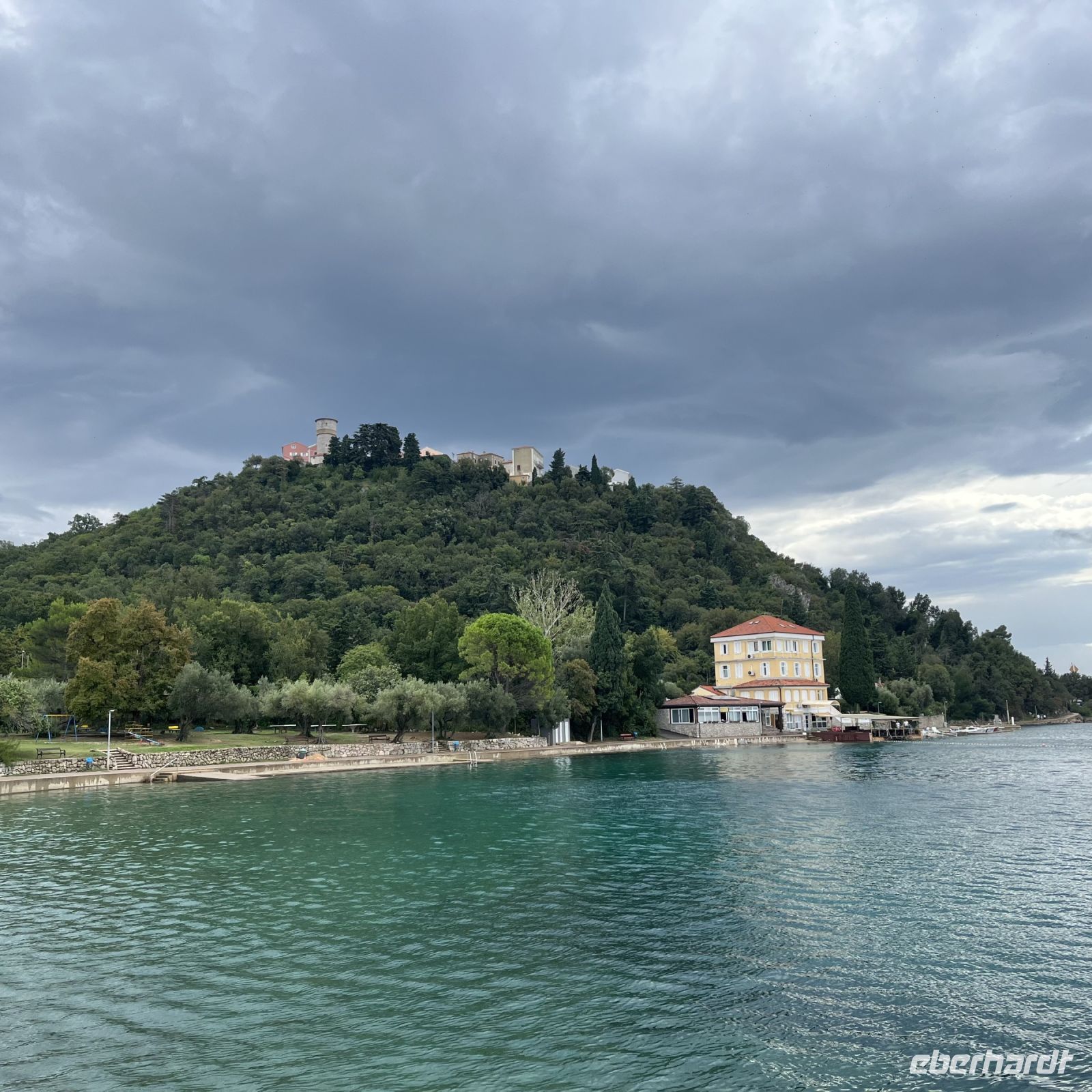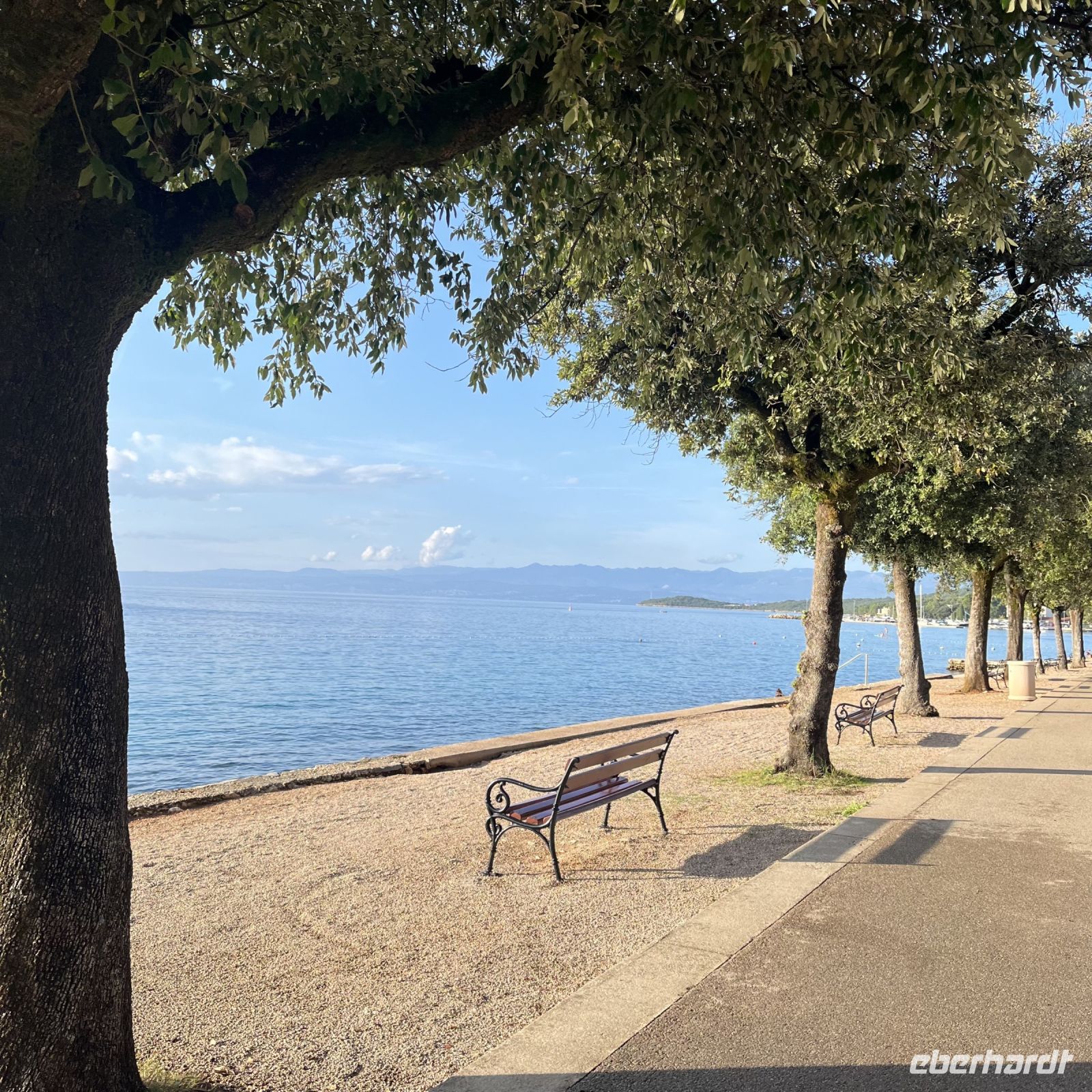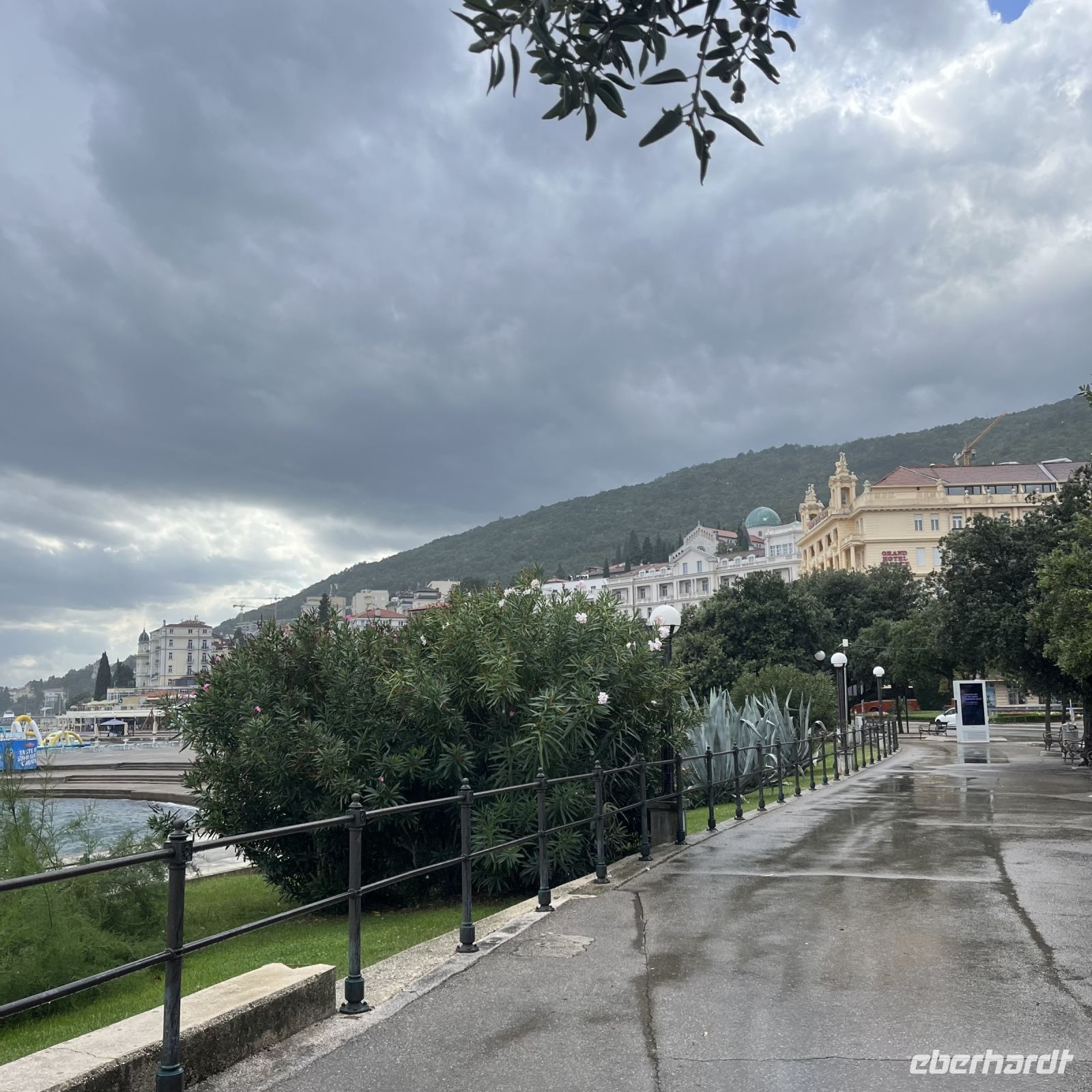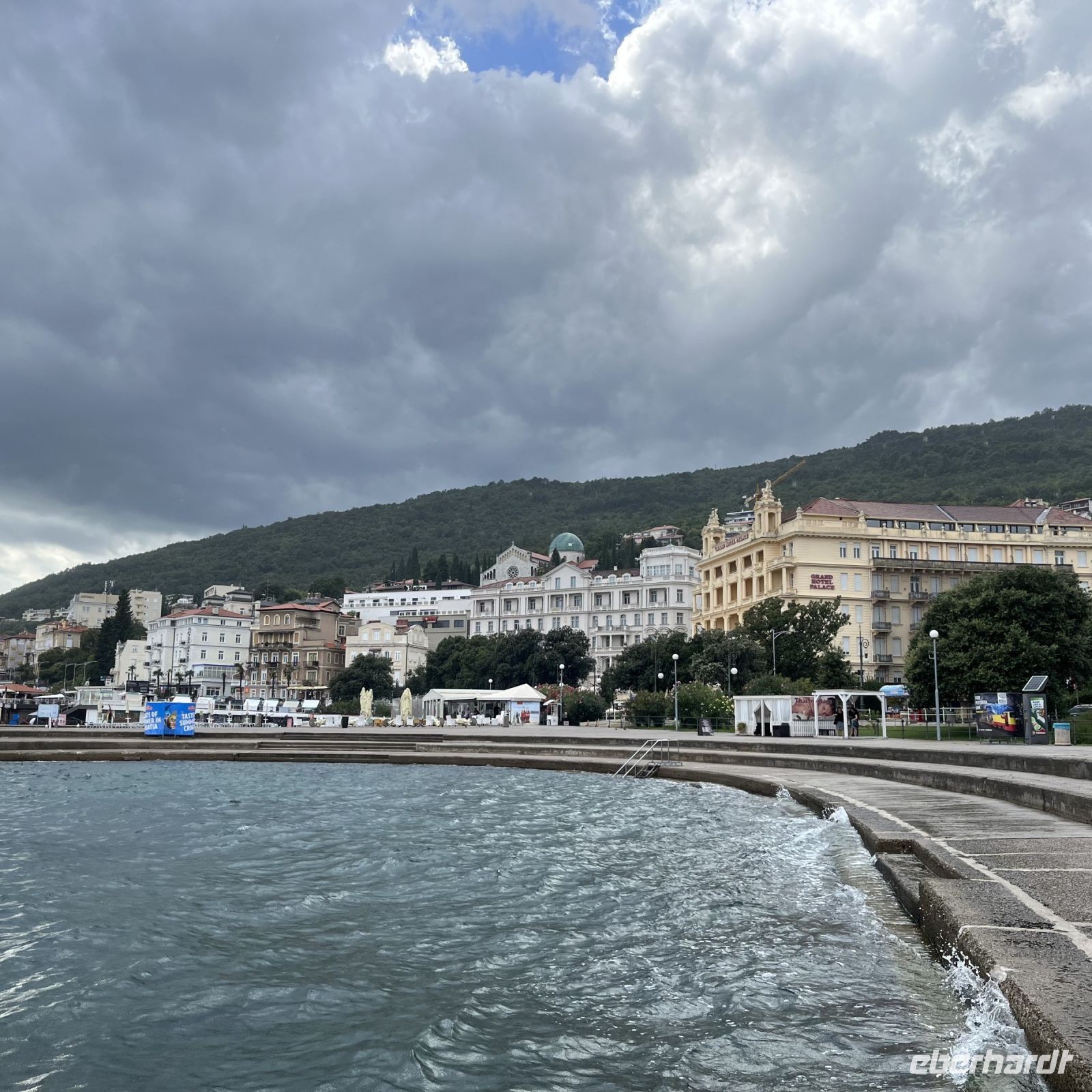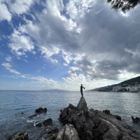 Der heutige Tag stand zur freien Verfügung, aber wir waren uns einig, dass wir an dem fakultativen Ausflug nach Rijeka und Opatija teilnehmen würden. Zwei wunderschöne Städte mit einem besonderen Charme. Rijea hat ein paar Überraschungen für uns parat: Der graue Himmel, der Regen ankündigte, öffnete sich und es regnete heftig. Nicht weit davon entfernt erwartete uns Opatija mit seinem durch das bewölkte Wetter und den zeitweiligen Nieselregen geheimnisvoll gewordenen Charme und lud uns ein, in einem Café Schutz zu suchen und das nun bleifarbene Meer zu bewundern. Die alten Hotels, Parks und Skulpturen von einzigartiger Schönheit gaben uns einen Eindruck von der Pracht der Stadt. Langsam verlassen wir Opatija und näherten uns unserer Insel. Das Wetter wurde immer besser, und als wir dort ankamen, war der Abend so mild und angenehm, dass wir beschlossen, einen Spaziergang am Strand zu machen und vor dem Abendessen in einem Café einen Eiskaffee zu trinken.