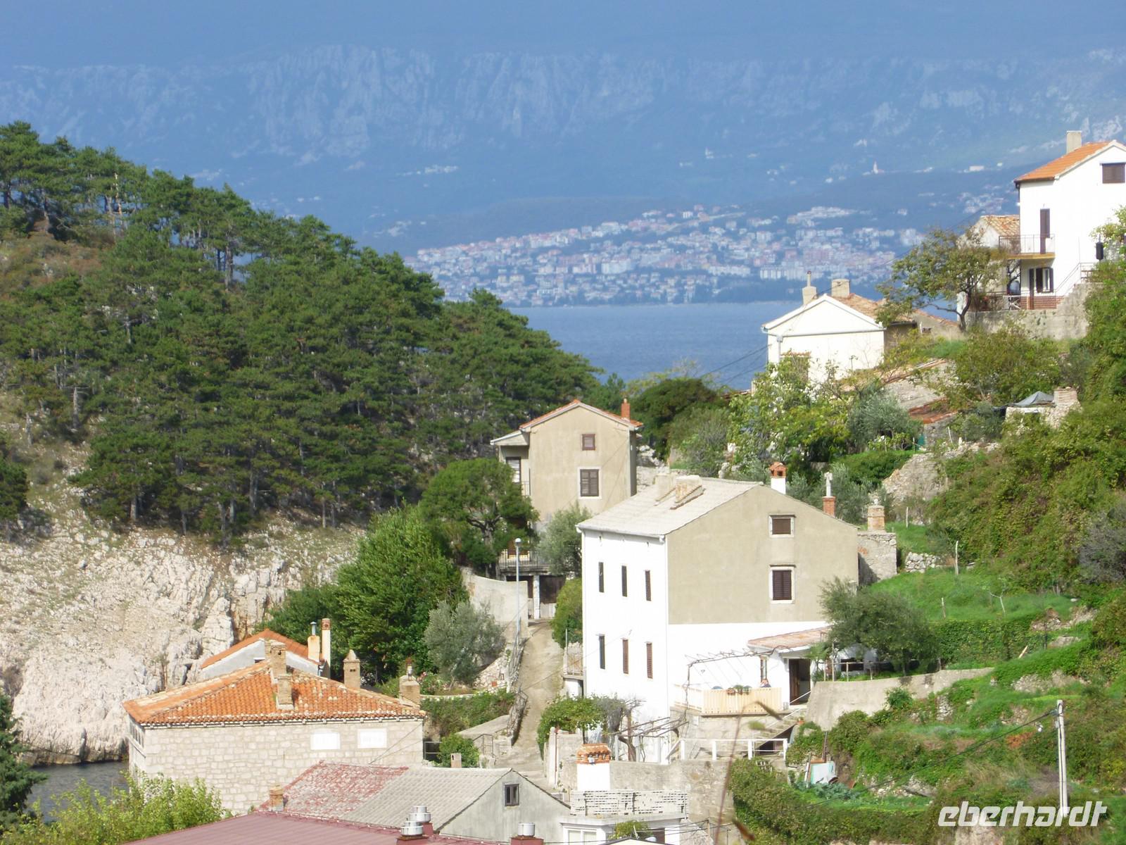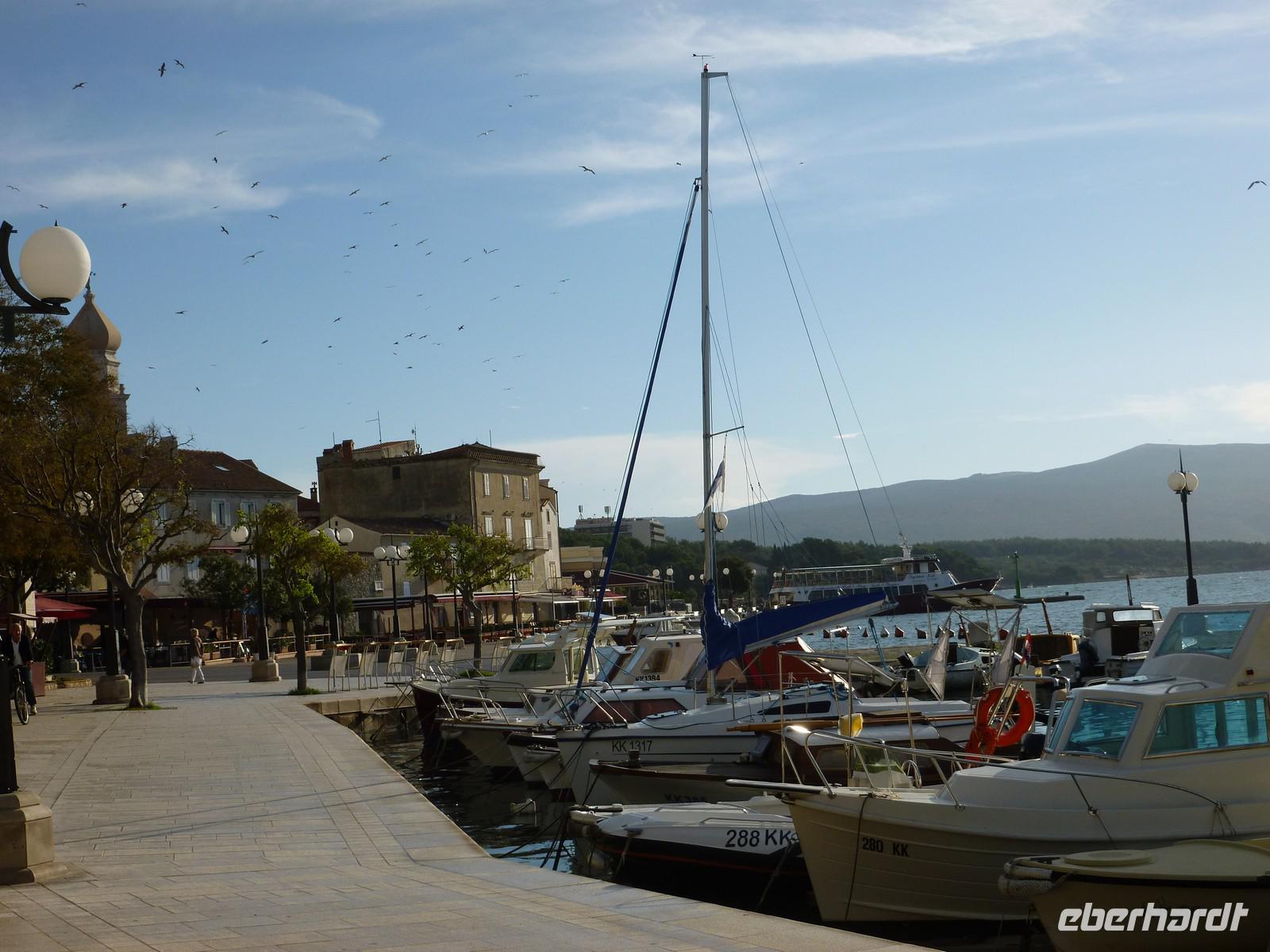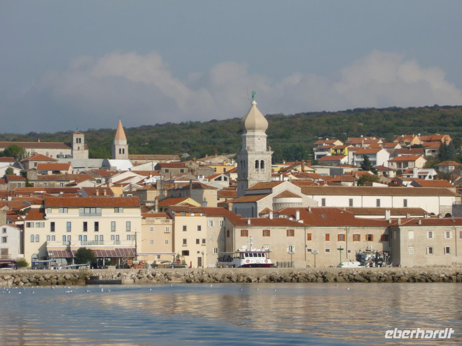 Nach einem Spaziergang entlang der Uferpromenade erreichen wir die Altstadt von Krk. Wir besteigen ein kleines Schiff, was nur für uns gebucht war. Wir hatten großes Glück mit dem Wetter und so konnten wir die Fahrt entlang der Küste bei blauen Himmel und Sonnenschein genießen. Wir sehen die Insel Plavnik und der Kapitän fuhr sehr nah an die Felsen heran. Plavnik ist eine kleine, etwa 9 Quadratkilometer große Insel an der Ostküste von Cres. Die Insel wurde bekannt als Nistplatz der unter Naturschutz stehenden Weißkopfgeier. Auch hier hatten wir Glück und konnten einige dieser seltenen Vögel von der Nähe sehen. Das ist der Hauptgrund dafür, dass Plavnik zu einem zoologisch-botanischen Reservat erklärt werden soll. Für die Schifffahrt schon von weitem zu sehen ist der Leuchtturm, der auf der nordwestlichen Zunge der Insel errichtet wurde. An Bord konnten wir den Wein der Region und einen kleinen Imbiss mit Sardellen und Käse genießen. Wieder zurück in Krk verabschiedenden wir und von ... Der Nachmittag stand uns zur freien Verfügung. Einige nutzten die Zeit einen Bummel durch die Altstadt von Krk, zum verweilen in einem der zahlreichen Cafes oder zu einem letzten Bad in der Adria.
