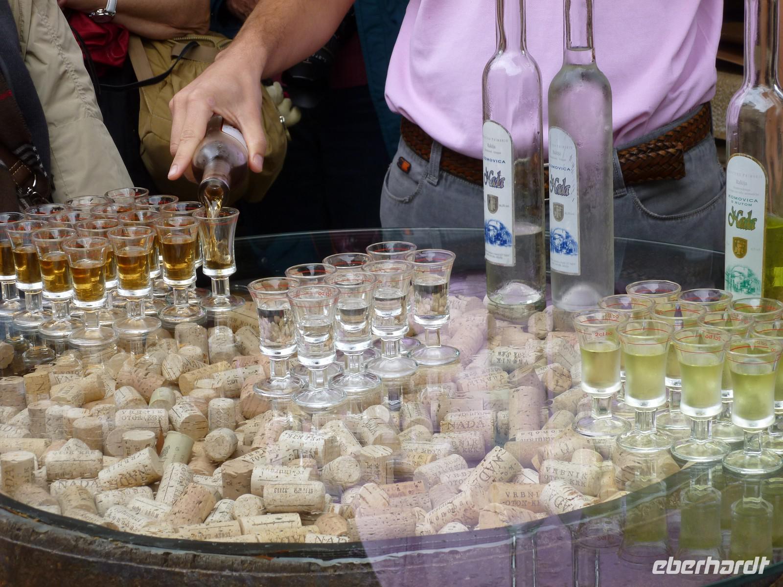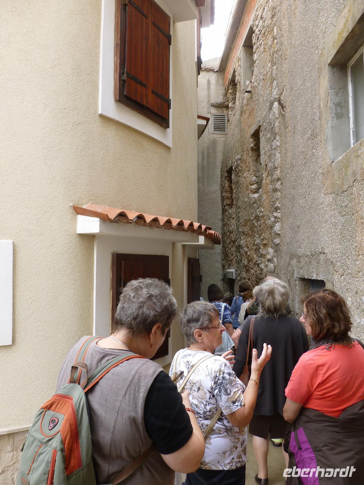 Nach einer ruhigen Nacht und einem ausgiebigen Frühstück spazierten wir entlang der Promenade in die Altstadt von Krk. Anschließend fuhren wir in die Weinregion in das kleine Städtchen Vribnik. Es liegt romantisch auf einem Felsen. Außer uns gab es keine Touristen im Ort. Wir liefen durch die engen Gassen und genossen den Blick hinüber zum Festland. Im Weinrestaurant „Nada" wurden wir bereits mit einem Schnaps erwartet. Jeder konnte wählen zwischen einen Feigenschnaps, einen Grappa oder einen Grappa-Raute - typischen Kräuterschnaps. Im Weinkeller sahen wir einen Film über die Weinbauregion und den traditionellen Weinanbau. Anschließend probieren wir den typisch Luftgetrockneten Schinken, Käse und den hier angebauten Weiswein - Zlathina und den Rotwein Brajdica . Gut gelaunt kehren wir zurück zum Bus und fahren in den Ort Baska. Dies ist der größte Badeort auf der Insel und verfügt über einen Sandstrand. Die richtige Zeit um einen Kaffee zu trinken. Im Hotel hatten wir Zeit für ein Bad im Swimmingpool oder ein Bad in der Sonne. Zum Abendessen fahren wir in die Hafenstadt Punat. In einem typischen Fischrestaurant werden wir mit einem Schnaps und getrockneten Feigen begrüßt und einem leckeren Menü verwöhnt. Für musikalische Unterhaltung, Stimmung und gute Laune sorgte eine Musikgruppe. Es war ein schöner Abend.