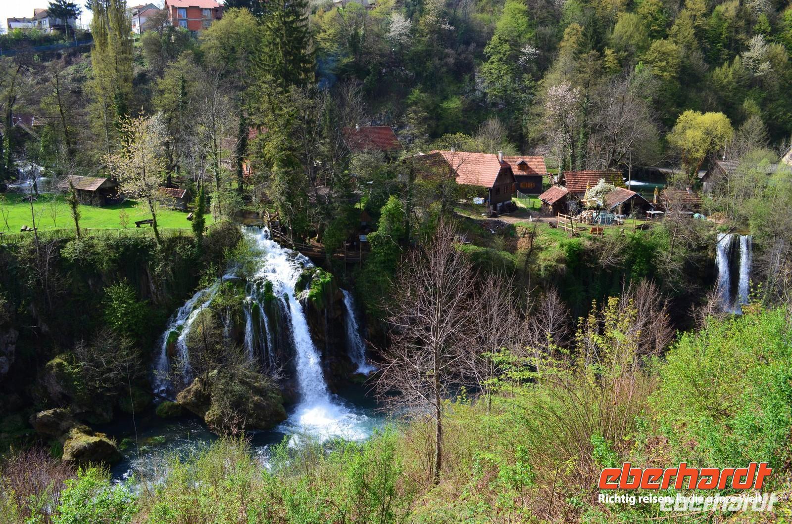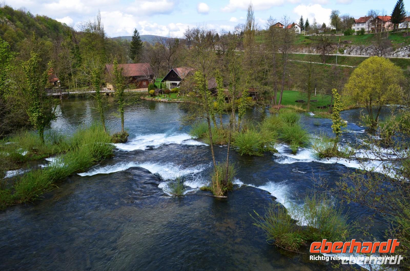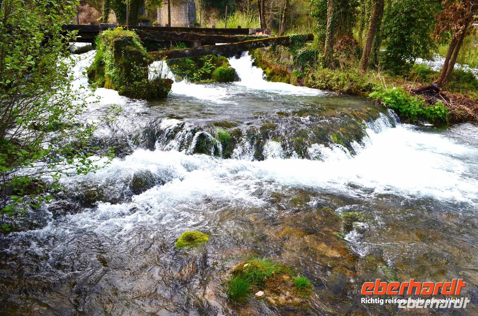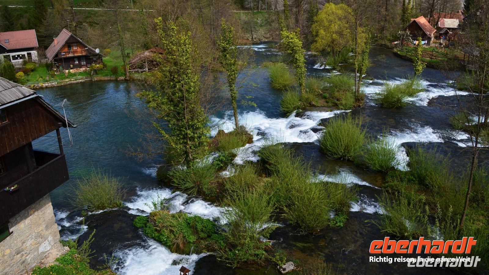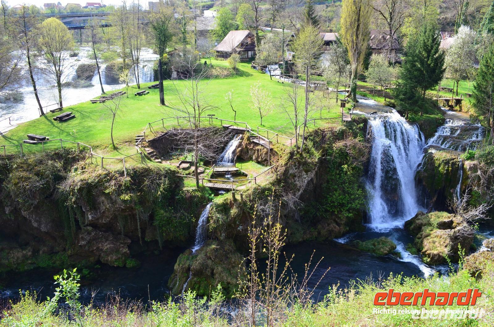 Am dritten Tag die herrliche Fahrt zu den Plitwitzer Seen, vorbei an der alten Festungsstadt Karlovac, entlang blau schimmernder Flüsse ging es stetig hinauf ins Gebirge. An der Wassermühlensiedlung Rastoke machten wir halt. Endlich schien die Sonne und wir spazierten durch das sehenswerte Mühlendorf. Eine Müllerin zeigte uns allen für einen kleinen Obolus die Funktion ihrer Getreidemühle.