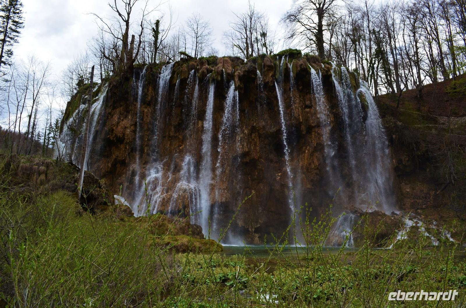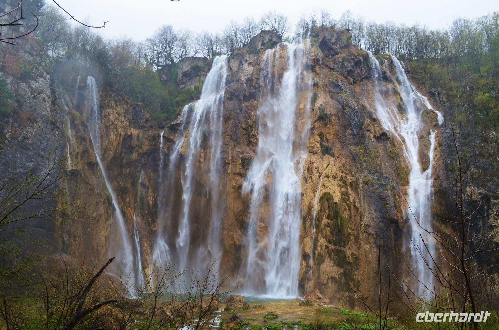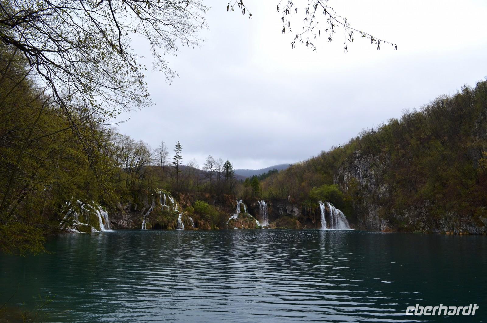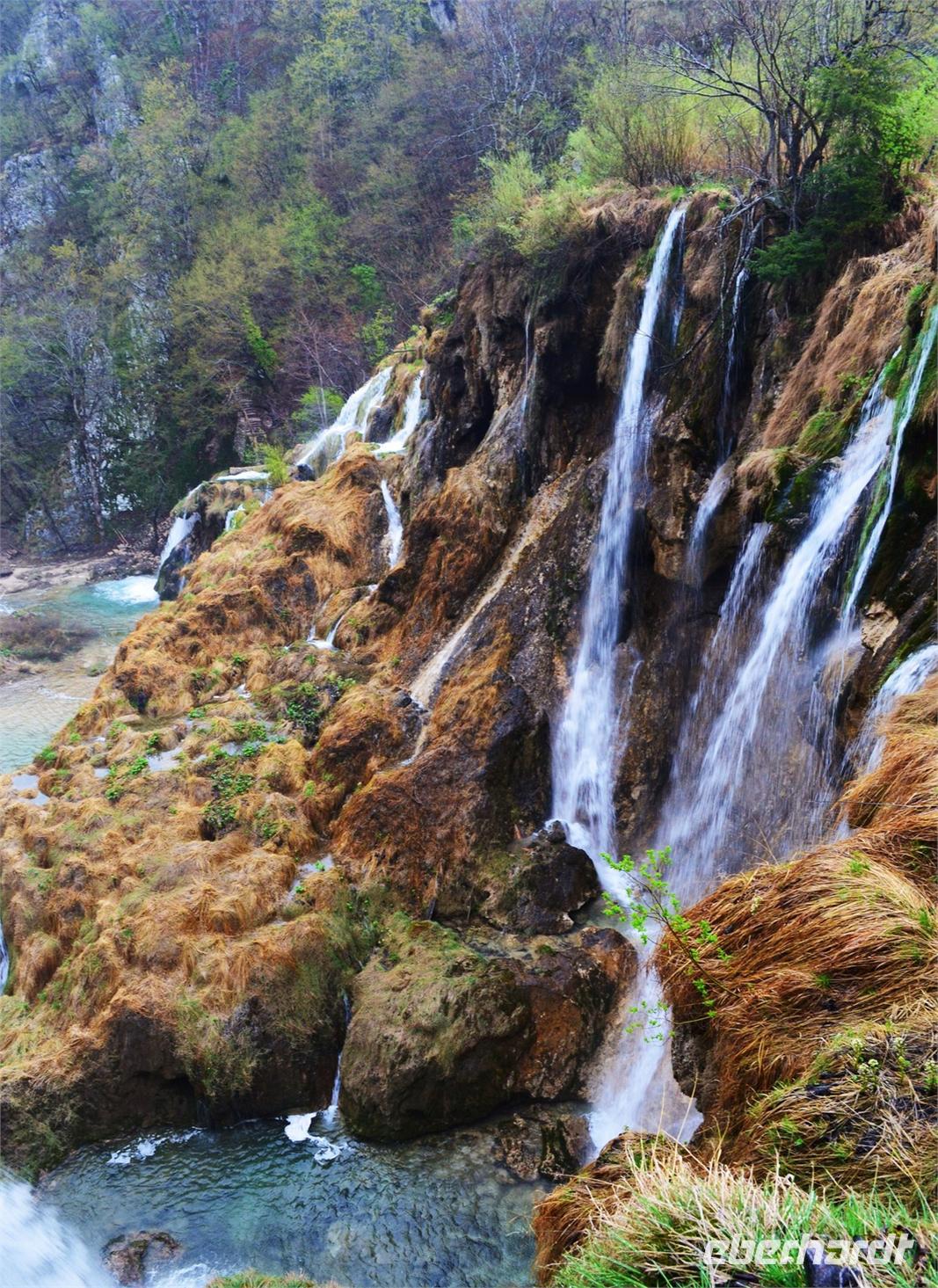 Vom Hotel Jezera aus machten wir uns dann auf den Weg durch die Naturwunder der oberen und unteren Seen und Wasserfälle im Nationalpark Plitwitzer Seen. Im oberen Bereich schien noch die Sonne, doch dann öffnete der Himmel seine Schleusen. Also deckten wir uns im Andenkengeschäft mit Schirmen ein und weiter ging die Wanderung bis zum hohen Wasserfall des Plitwitzbaches und dann die Serpentinen hinauf zum wohlig warmen Bus, der uns zum Hotel zurückbrachte.