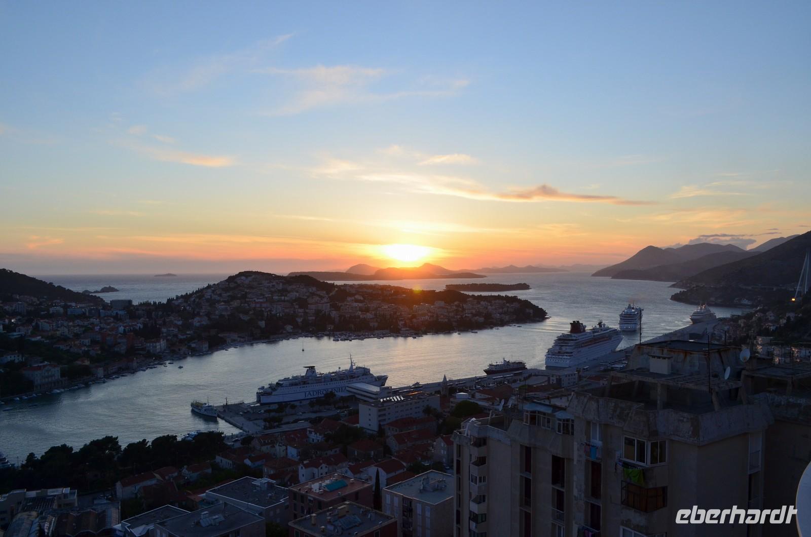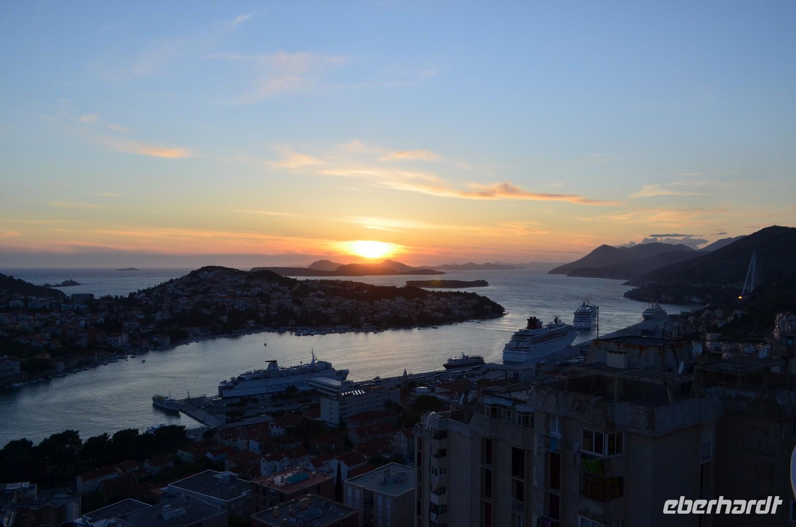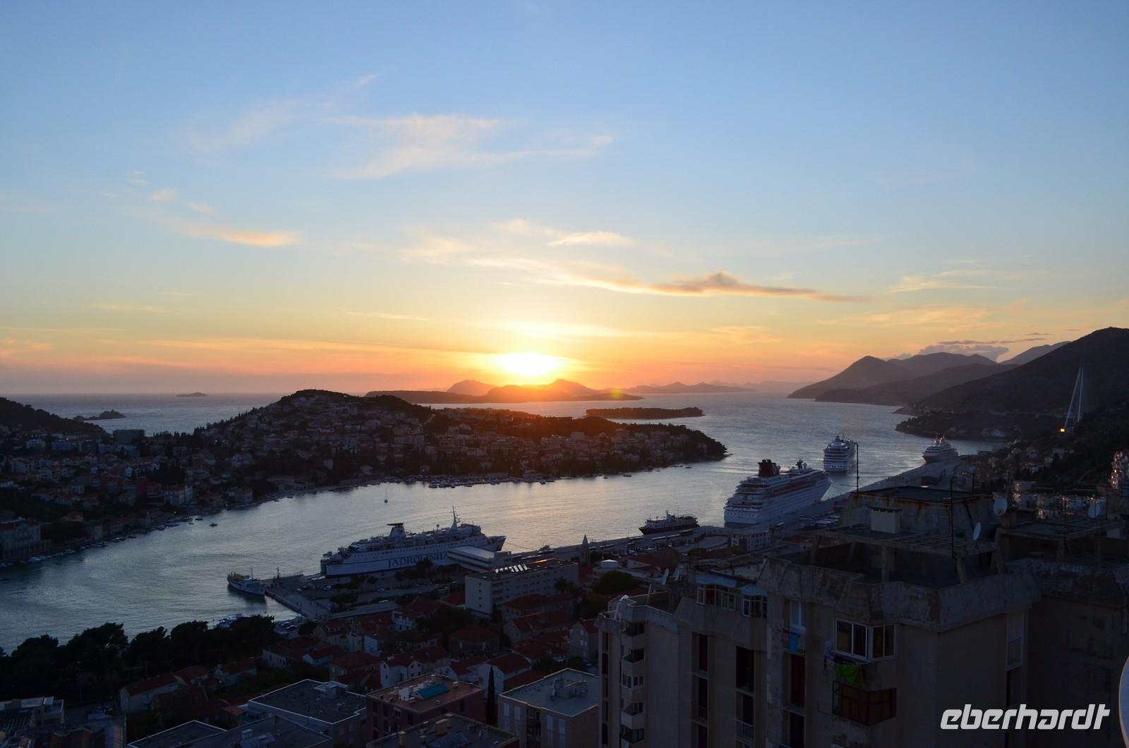 Zurück im Hotel genossen wir am Abend das Einlaufen eines Aida-Kreuzfahrtschiffes und den Sonnenuntergang über den Hirschinseln.
